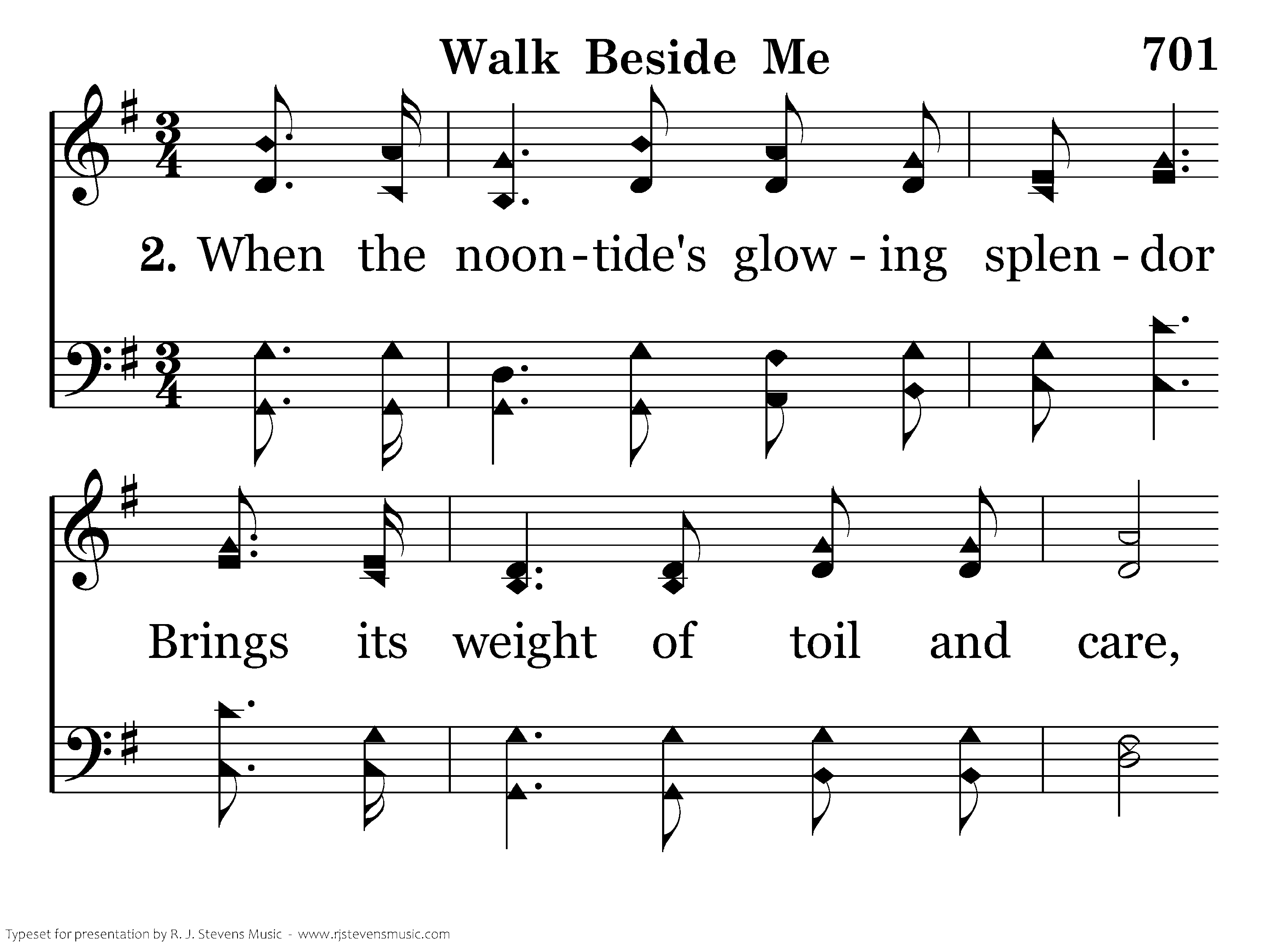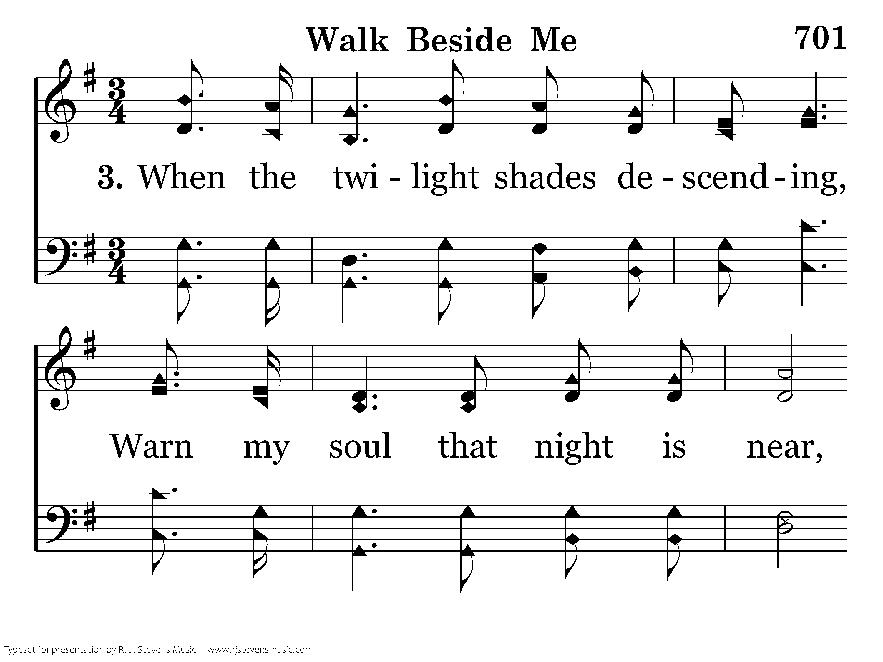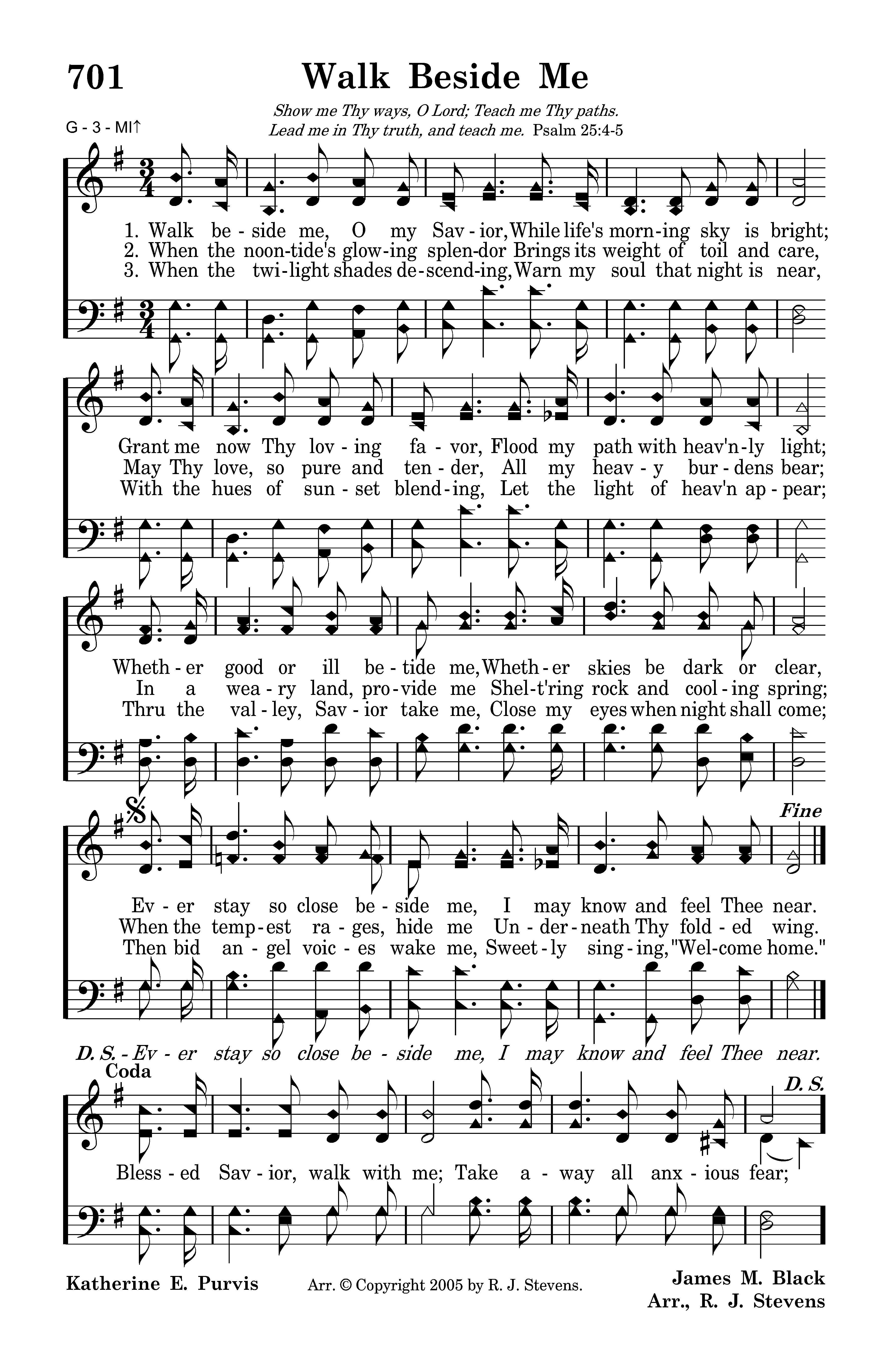 Walk beside me, O my Savior, While life's morning sky is bright; Grant me now Thy loving favor, Flood my path with heav'nly light; Whether good or ill betide me, Whether skies be dark or clear, Ever stay so close beside me, I may know and feel Thee near.