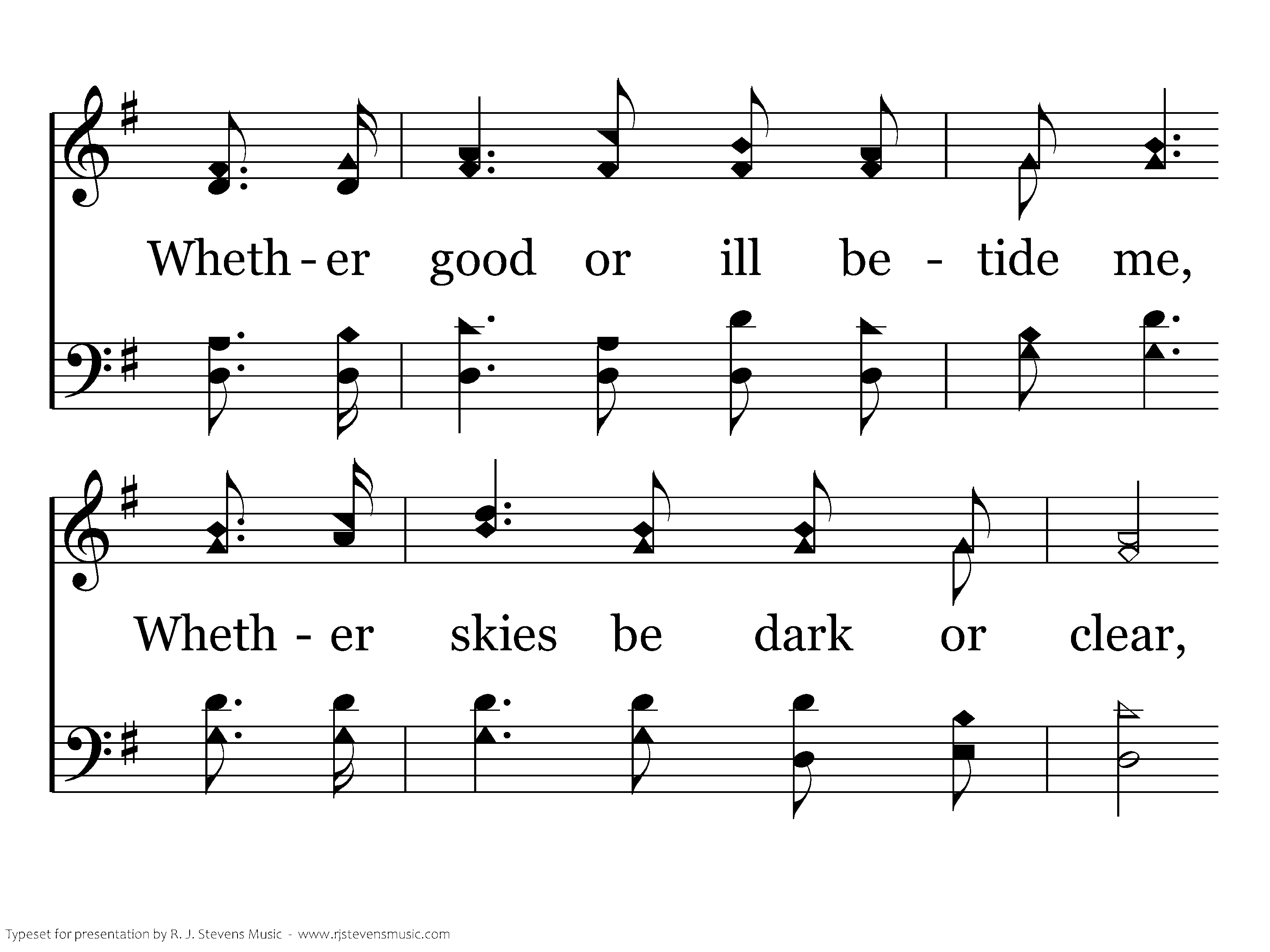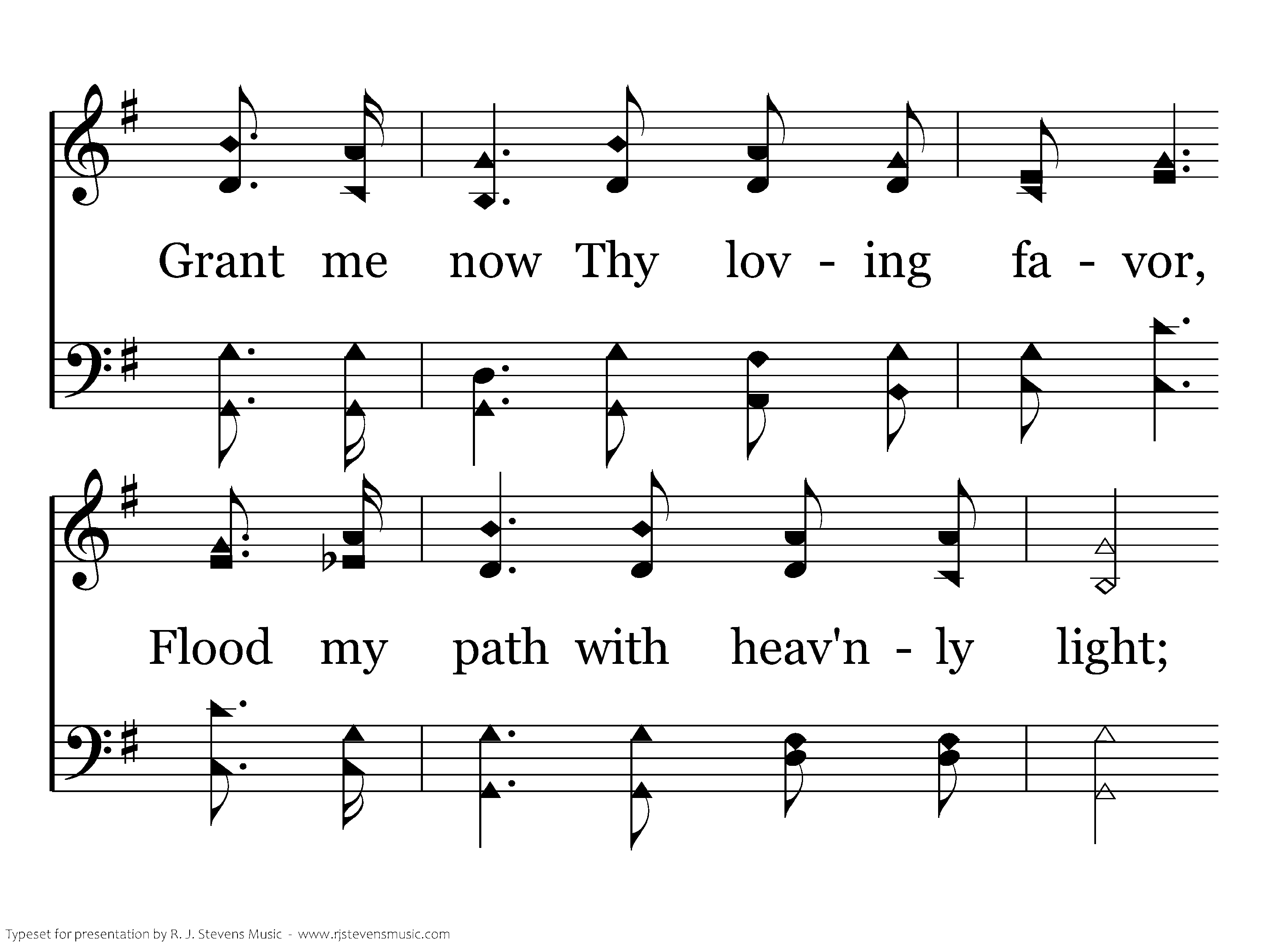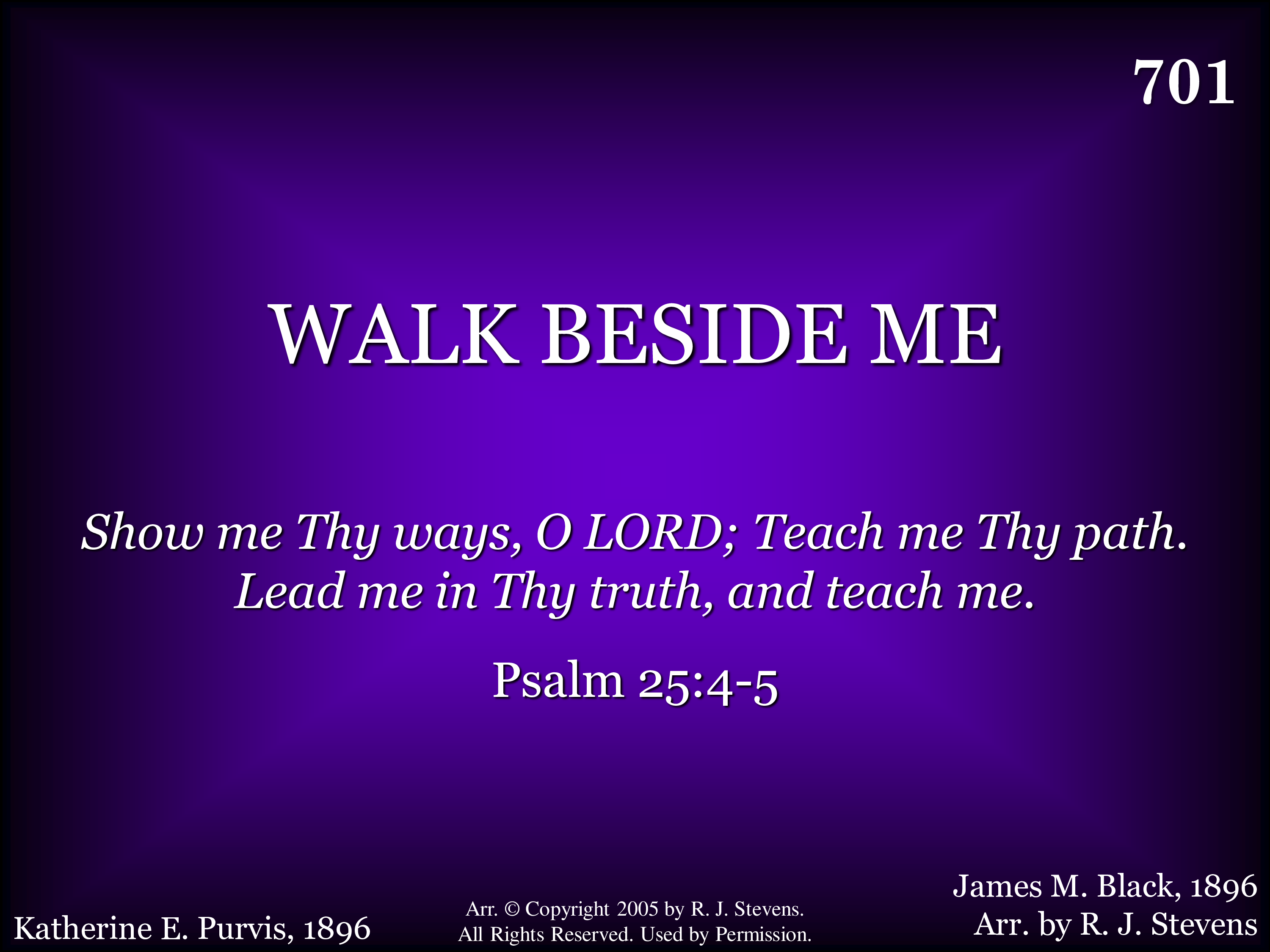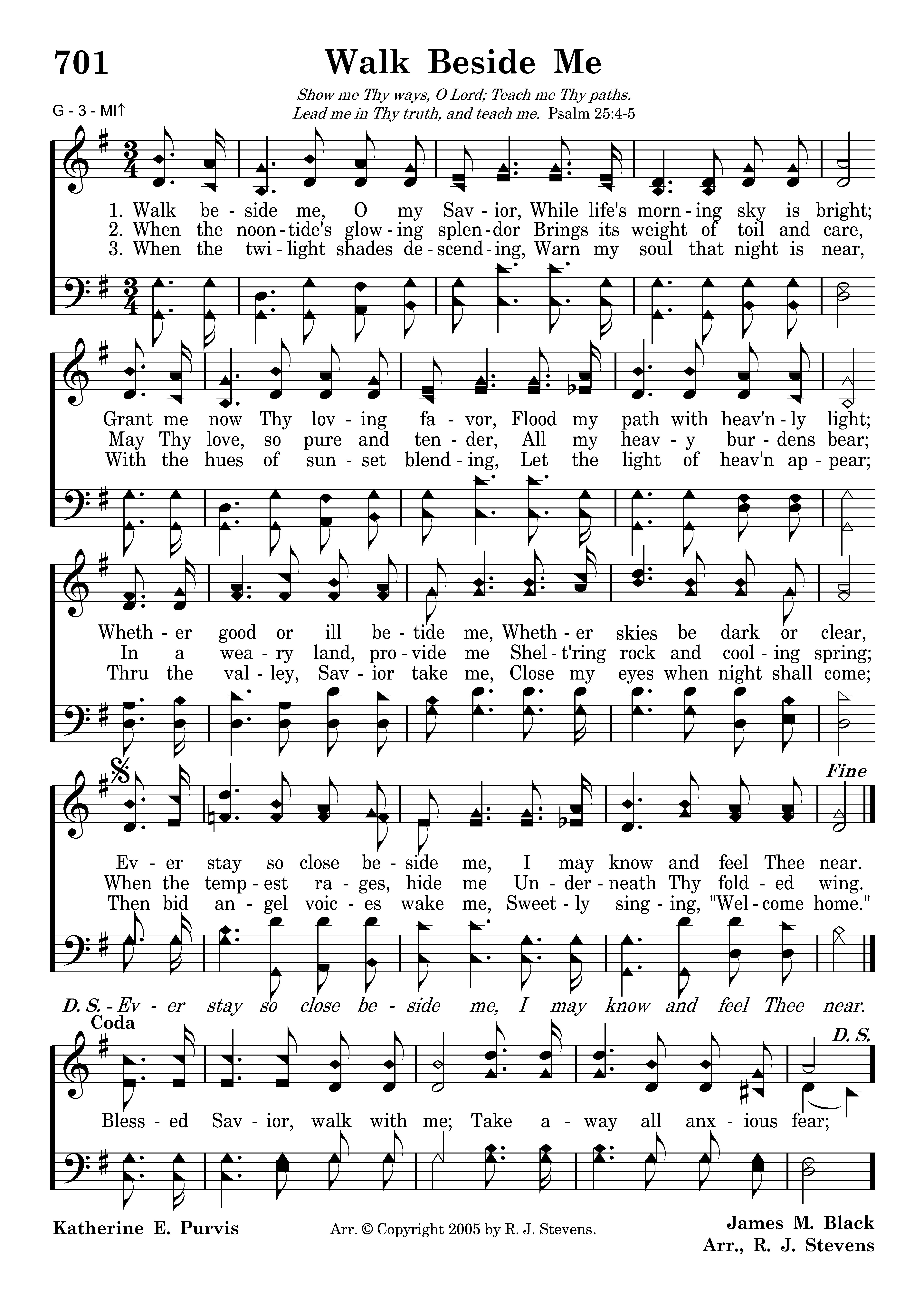 Walk beside me, O my Savior, While life's morning sky is bright; Grant me now Thy loving favor, Flood my path with heav'nly light; Whether good or ill betide me, Whether skies be dark or clear, Ever stay so close beside me, I may know and feel Thee near.