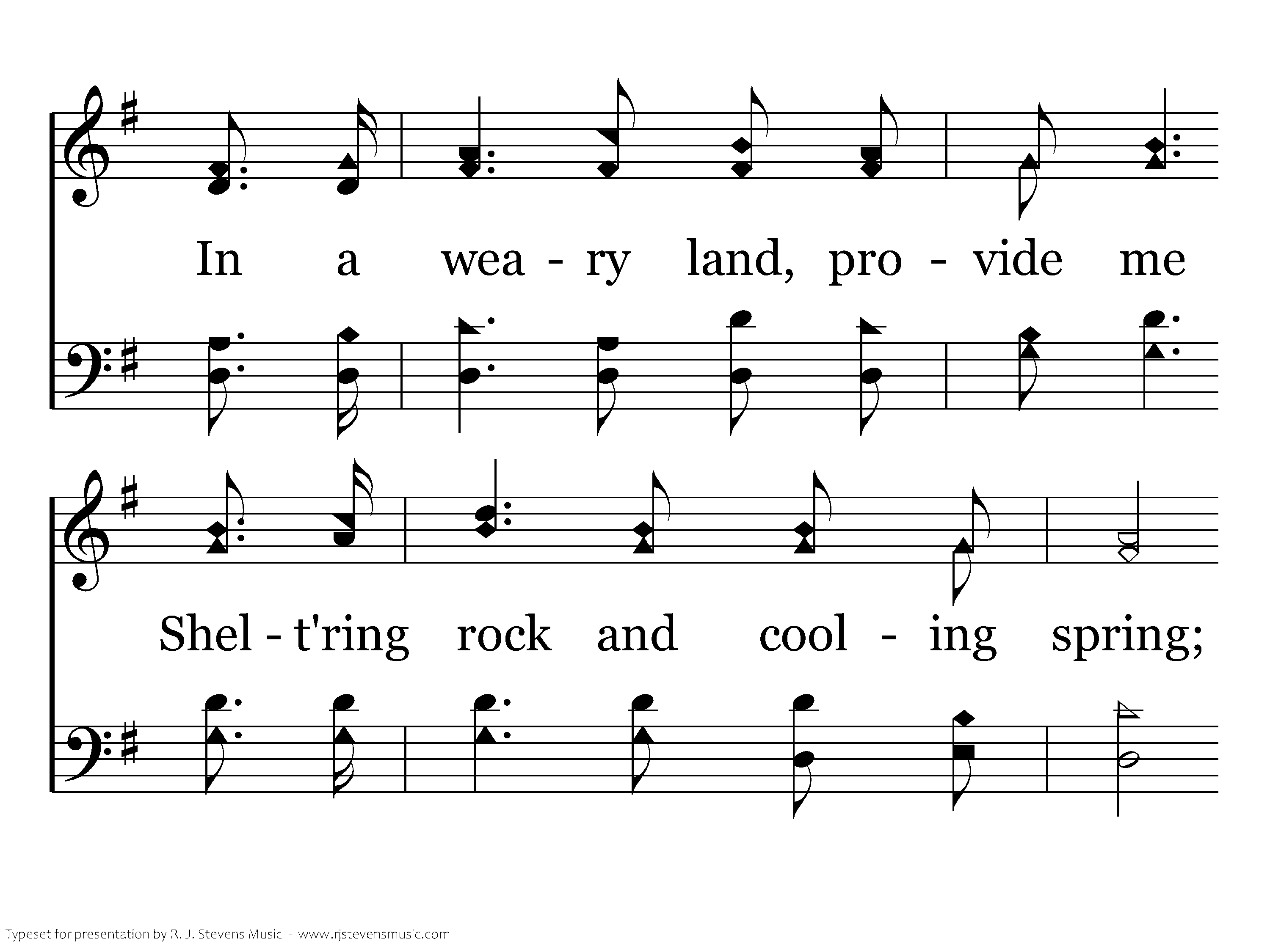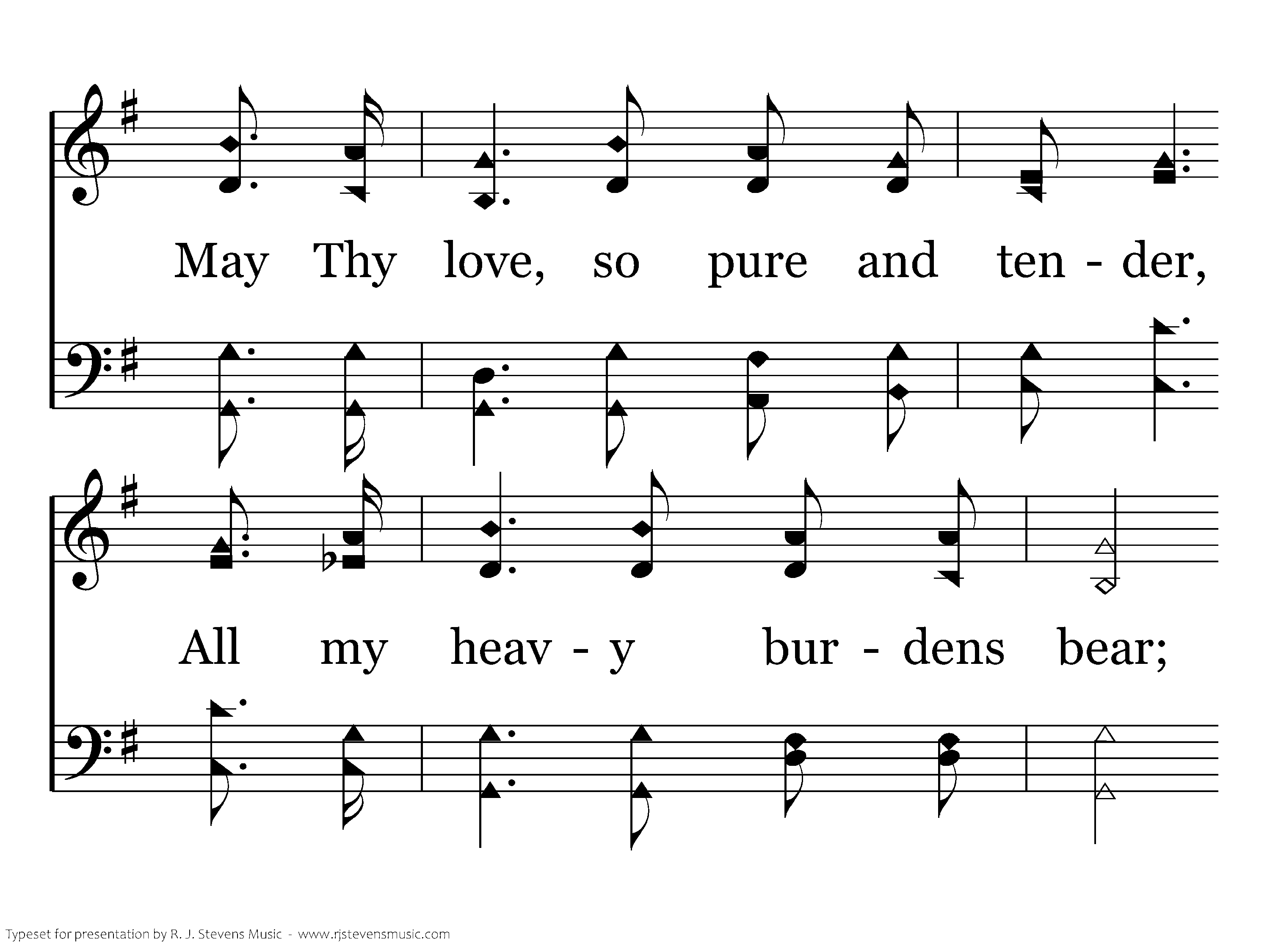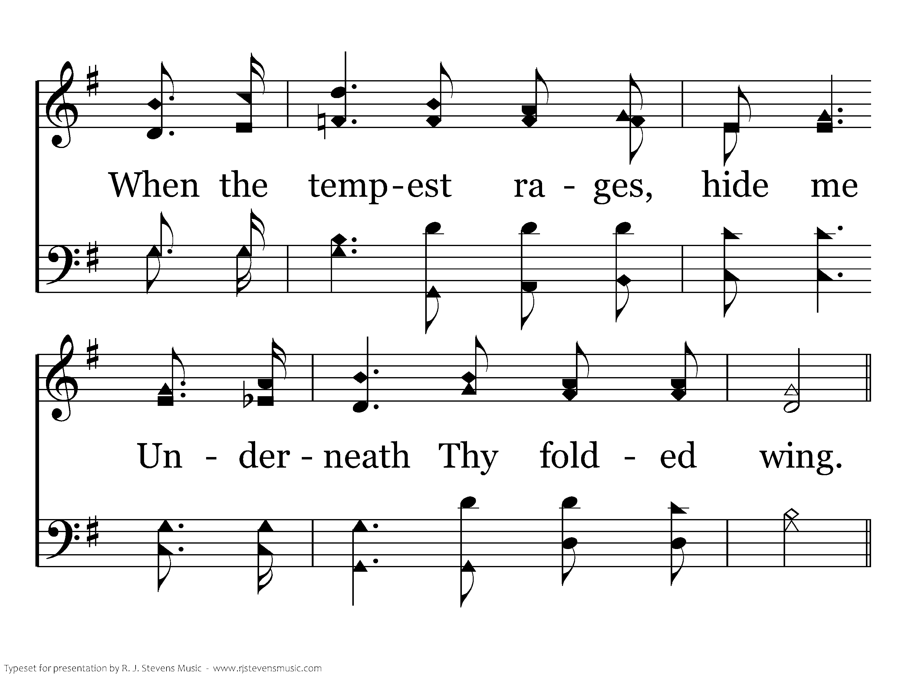 When the noontide's glowing splendor Brings its weight of toil and care, May Thy love, so pure and tender, All my heavy burdens bear; In a weary land, provide me Shelt'ring rock and cooling spring; When the tempest rages, hide me Underneath Thy folded wing.