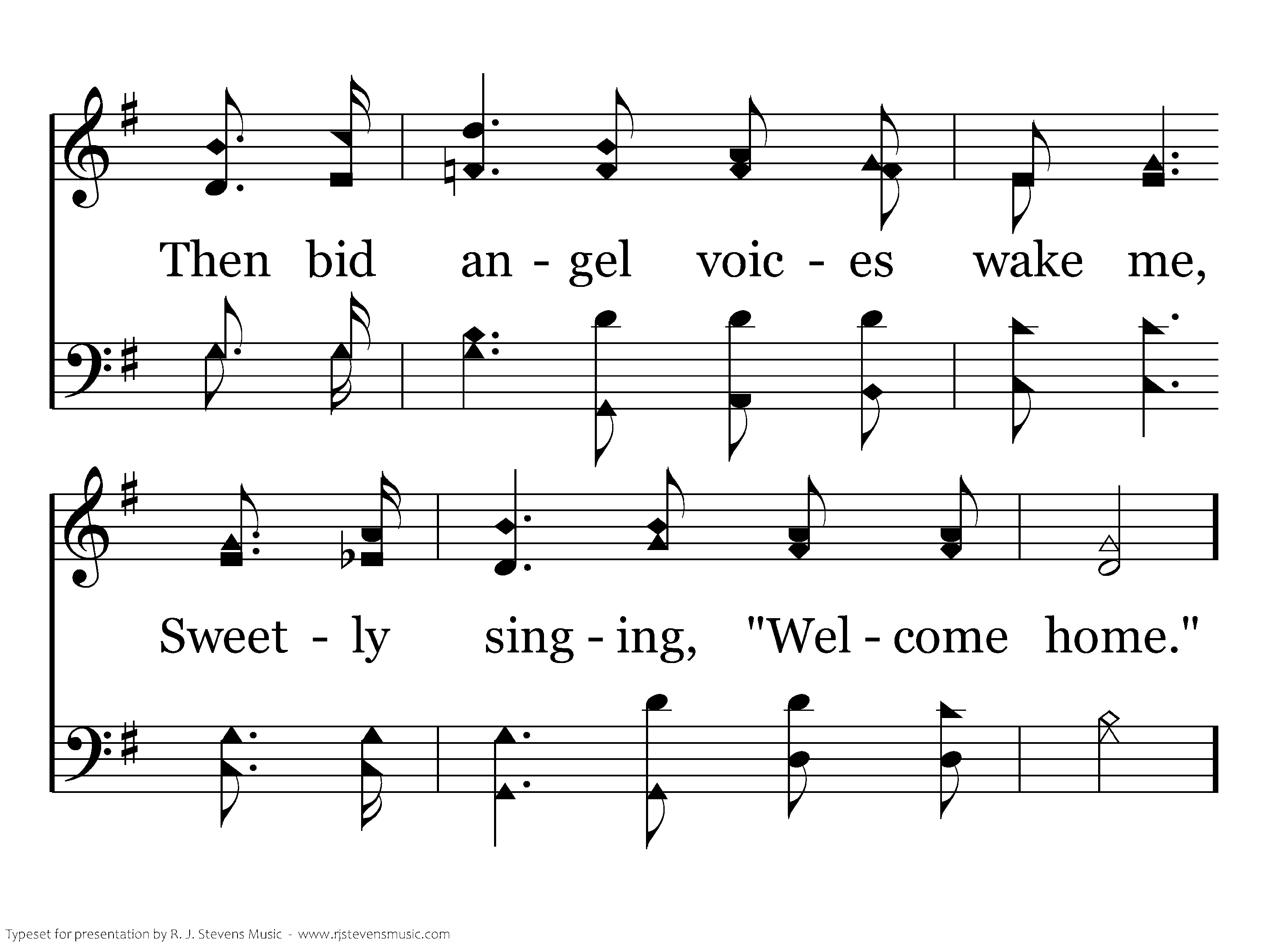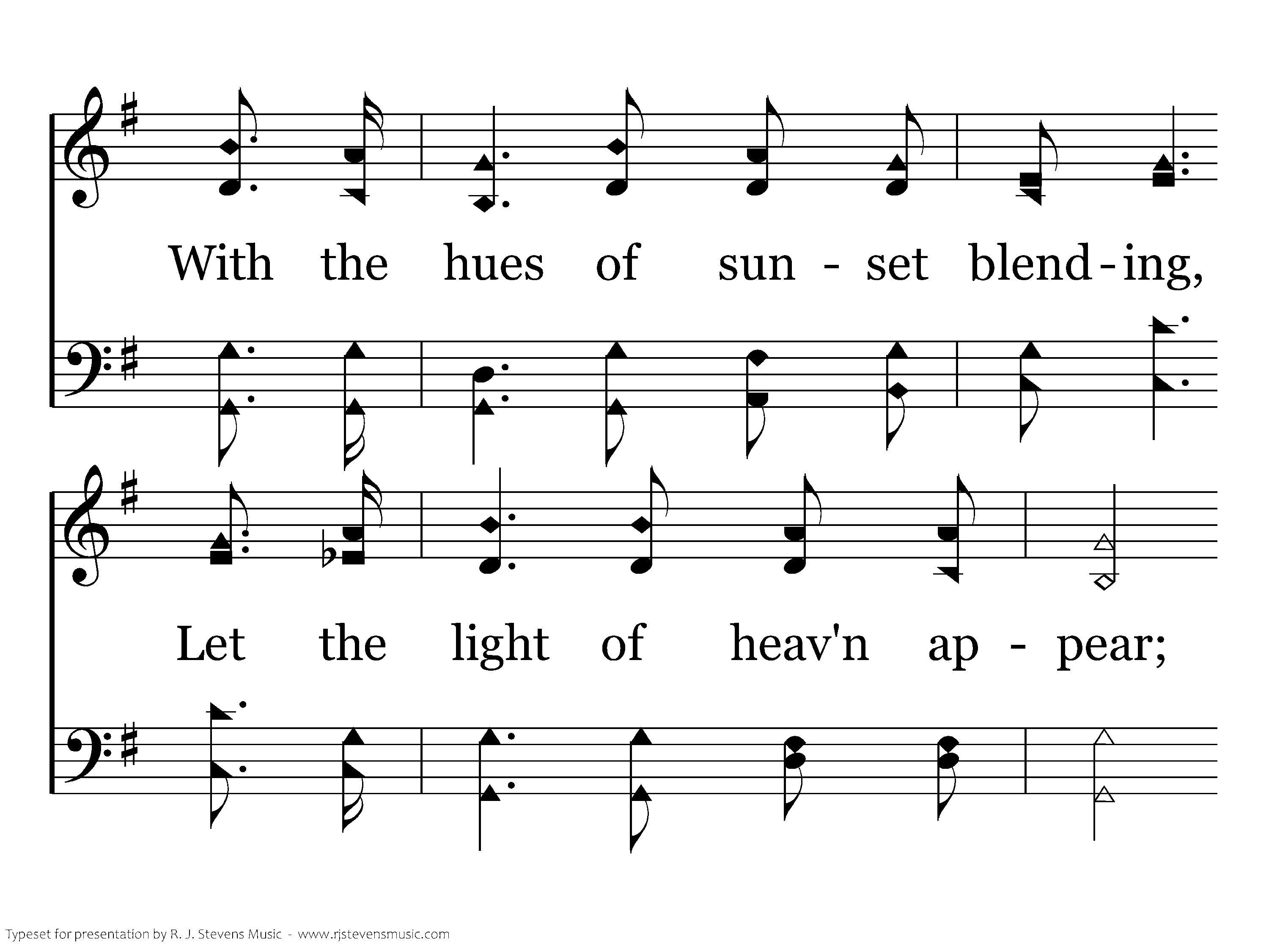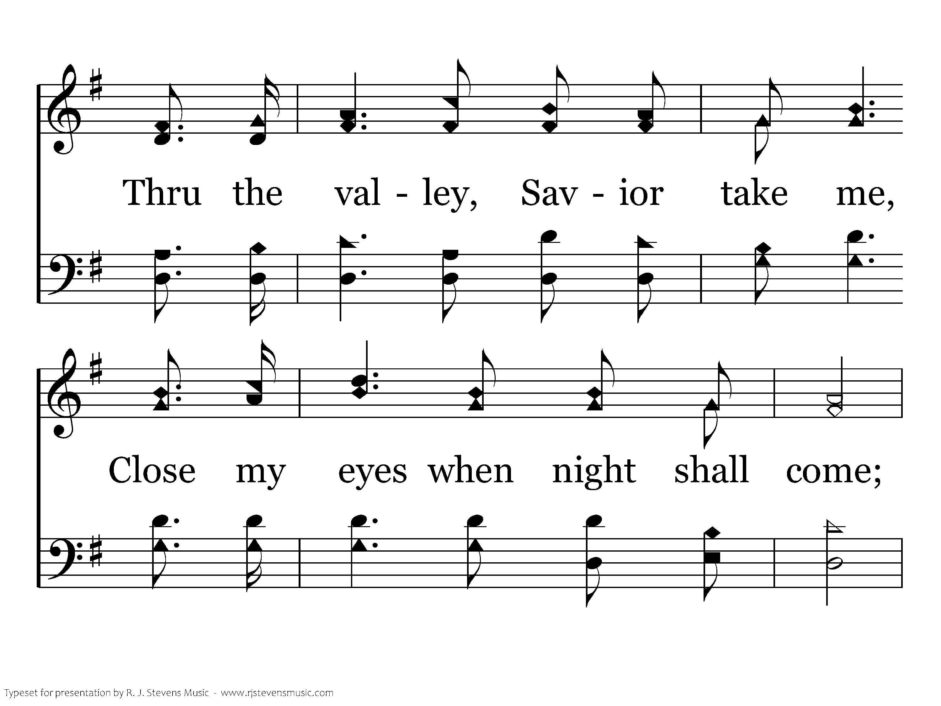 When the twilight shades descending, Warn my soul that night is near, With the hues of sunset blending, Let the light of heav'n appear; Thru the valley, Savior take me, Close my eyes when night shall come; Then bid angel voices wake me, Sweetly singing, "Welcome home."