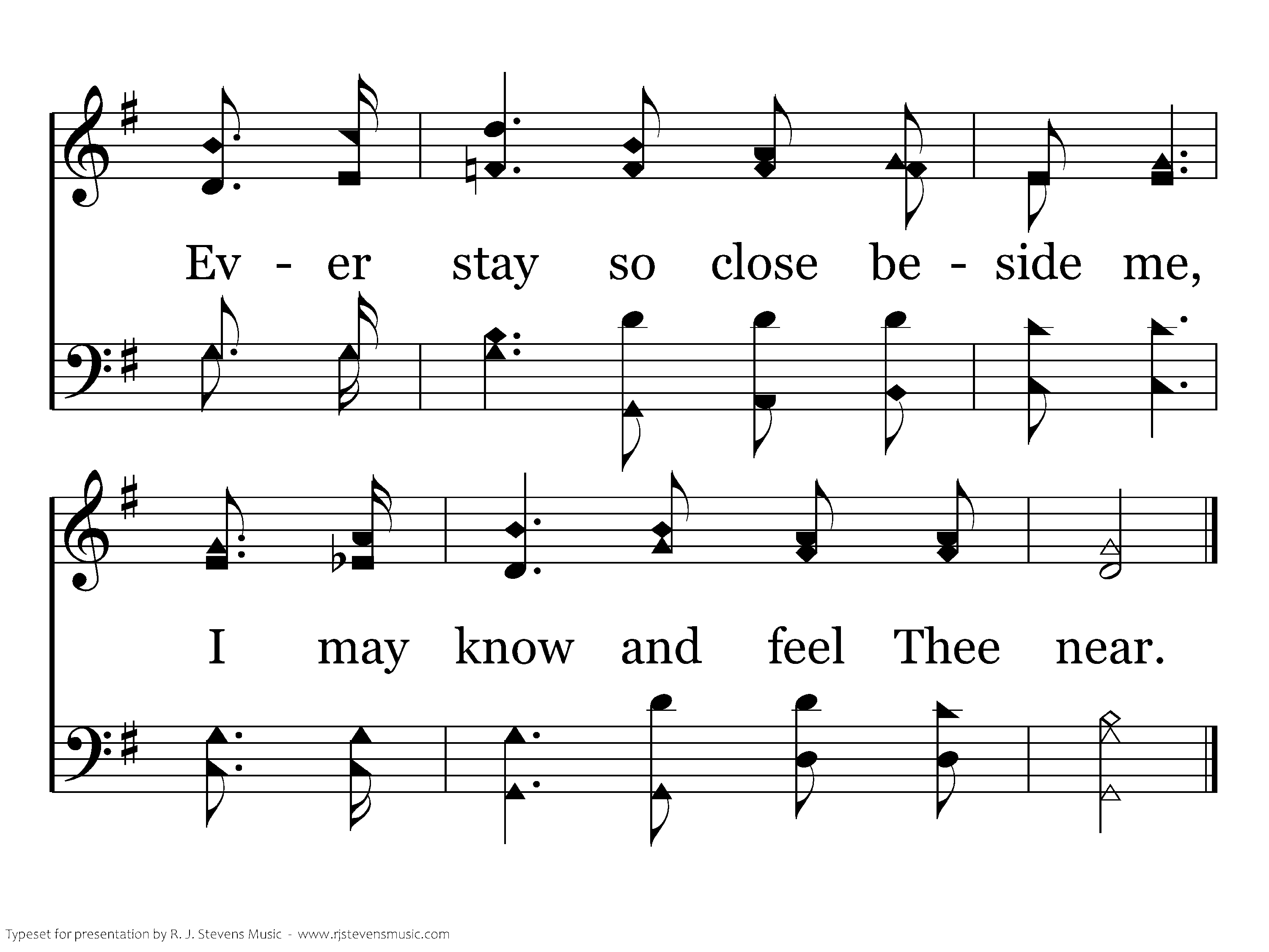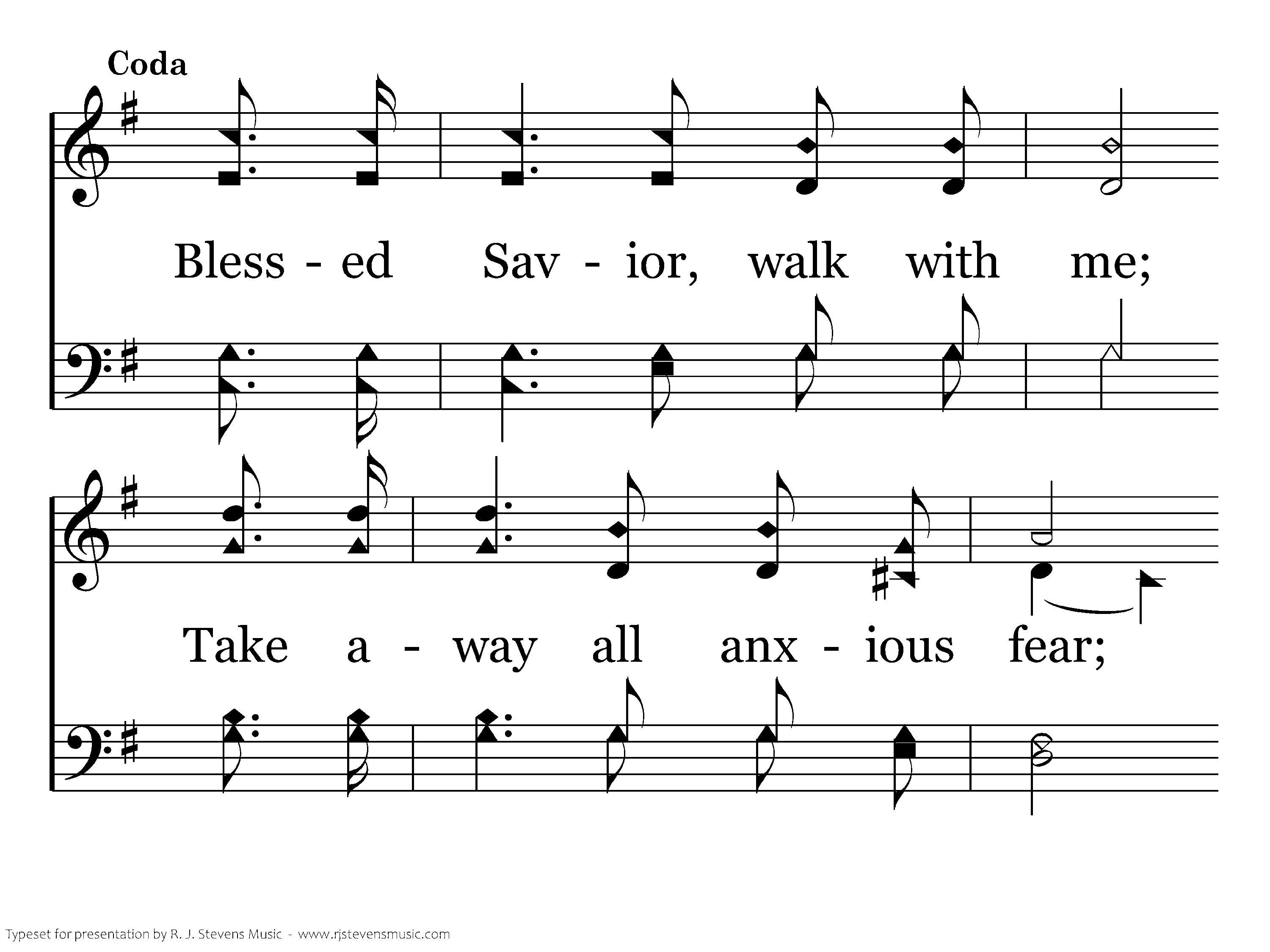 Blessed Savior, walk with me; Take away all anxious fear; Ever stay so close beside me, I may know and feel Thee near.