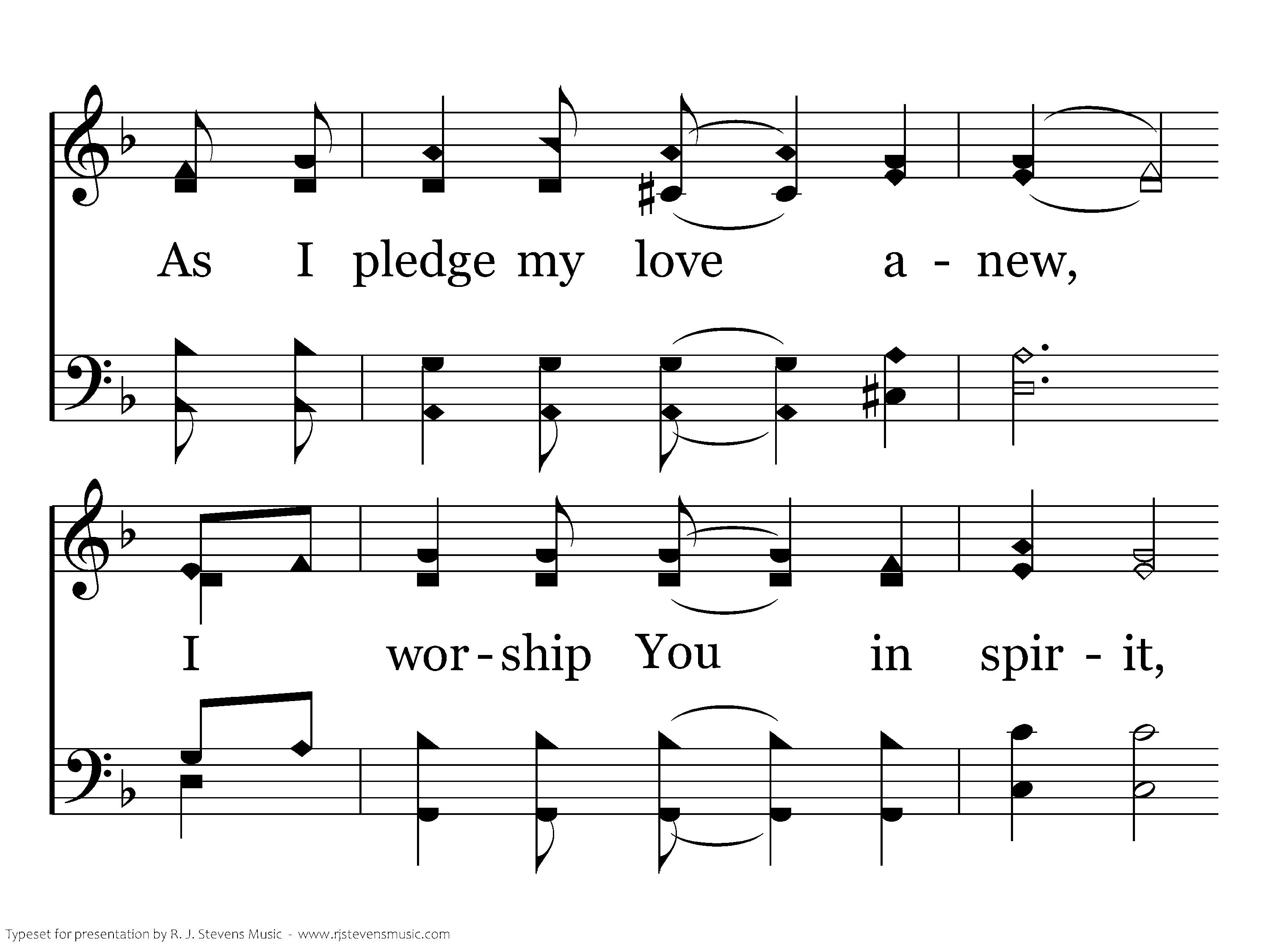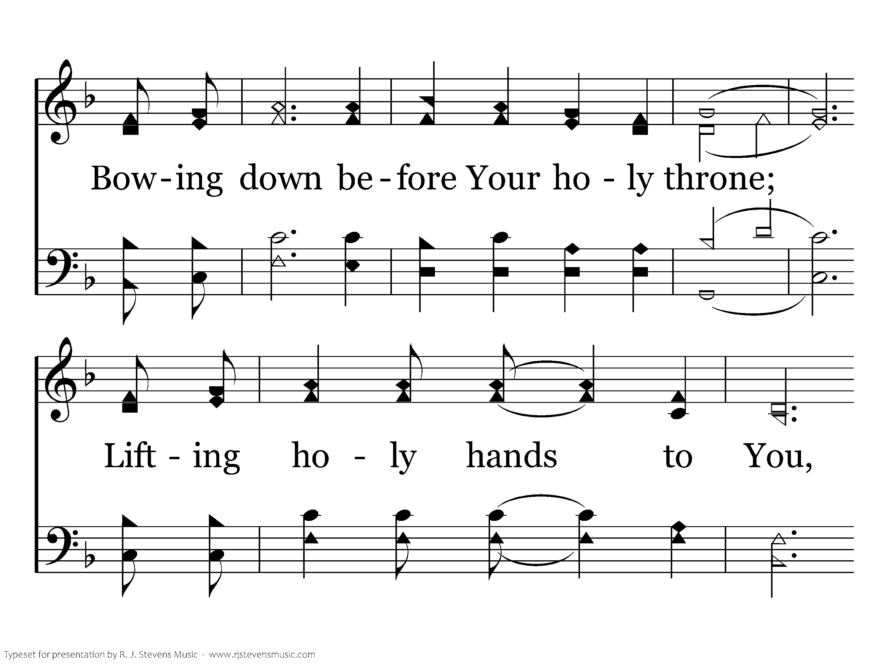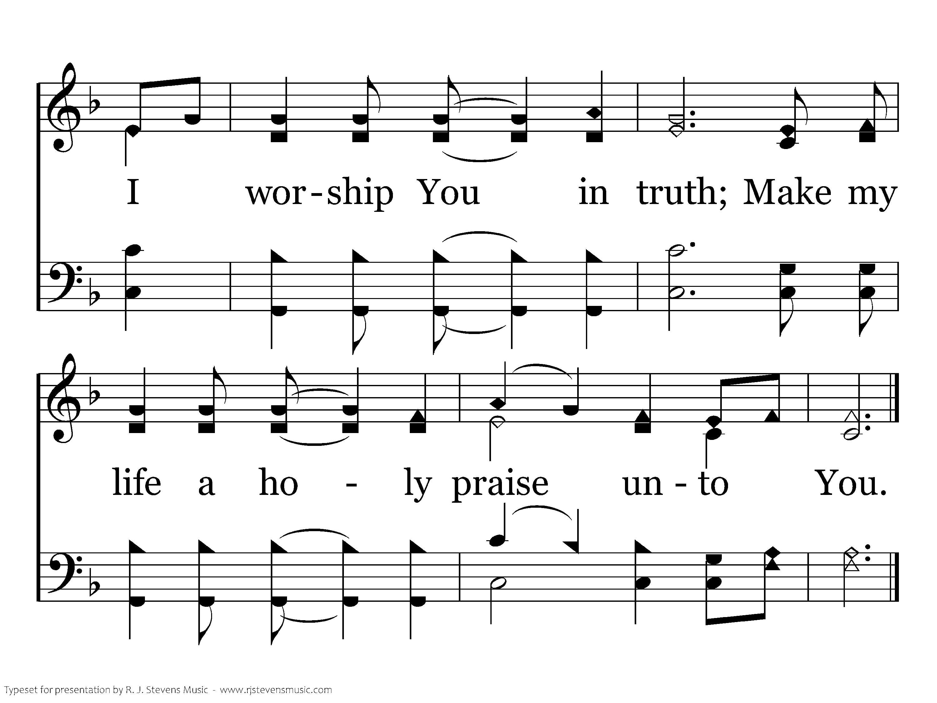 On bended knee I come, With humble heart I come, Bowing down before Your holy throne; Lifting holy hands to You, As I pledge my life anew, I worship You in spirit, I worship You in truth;Make my life a holy praise unto You.