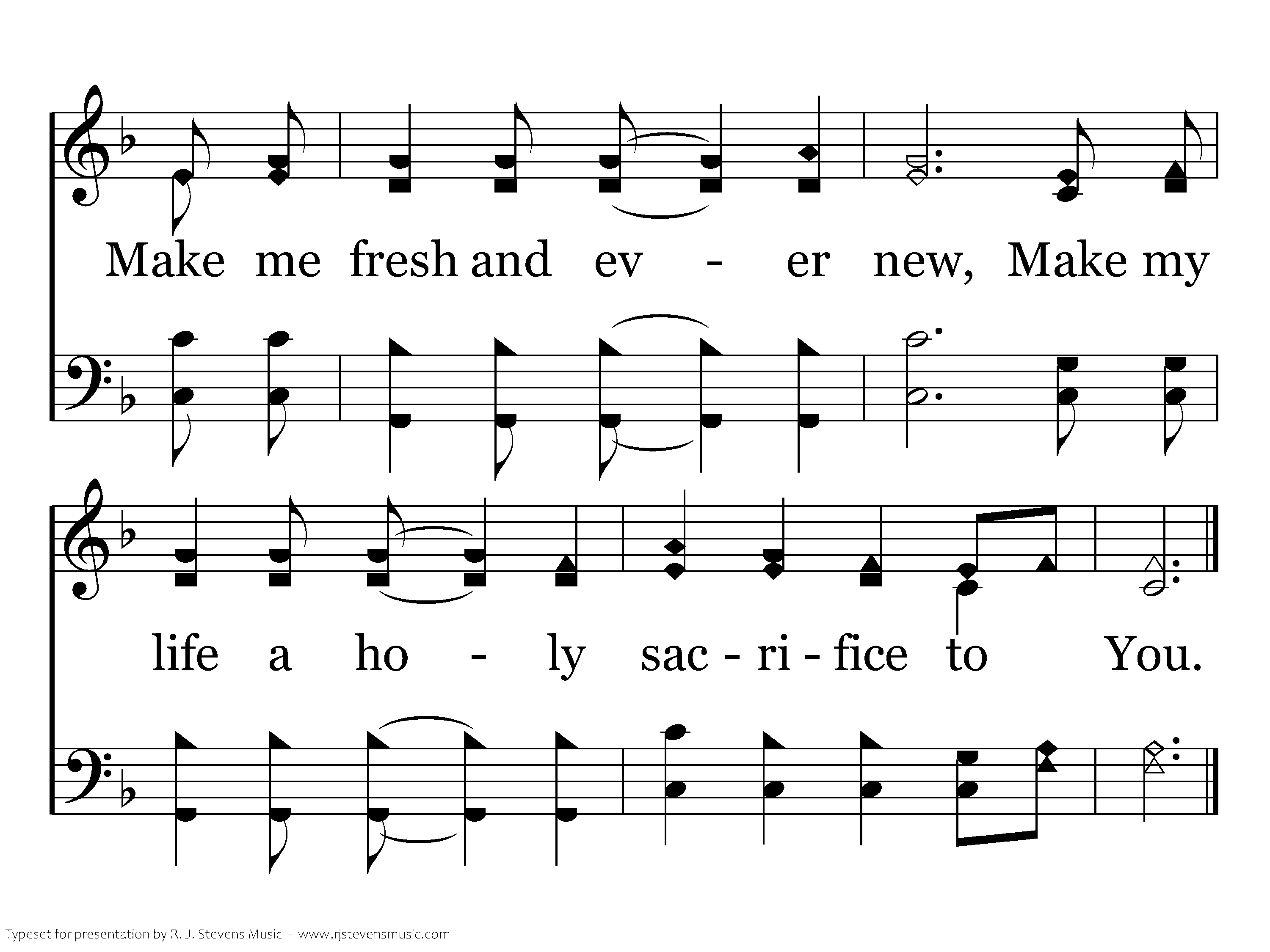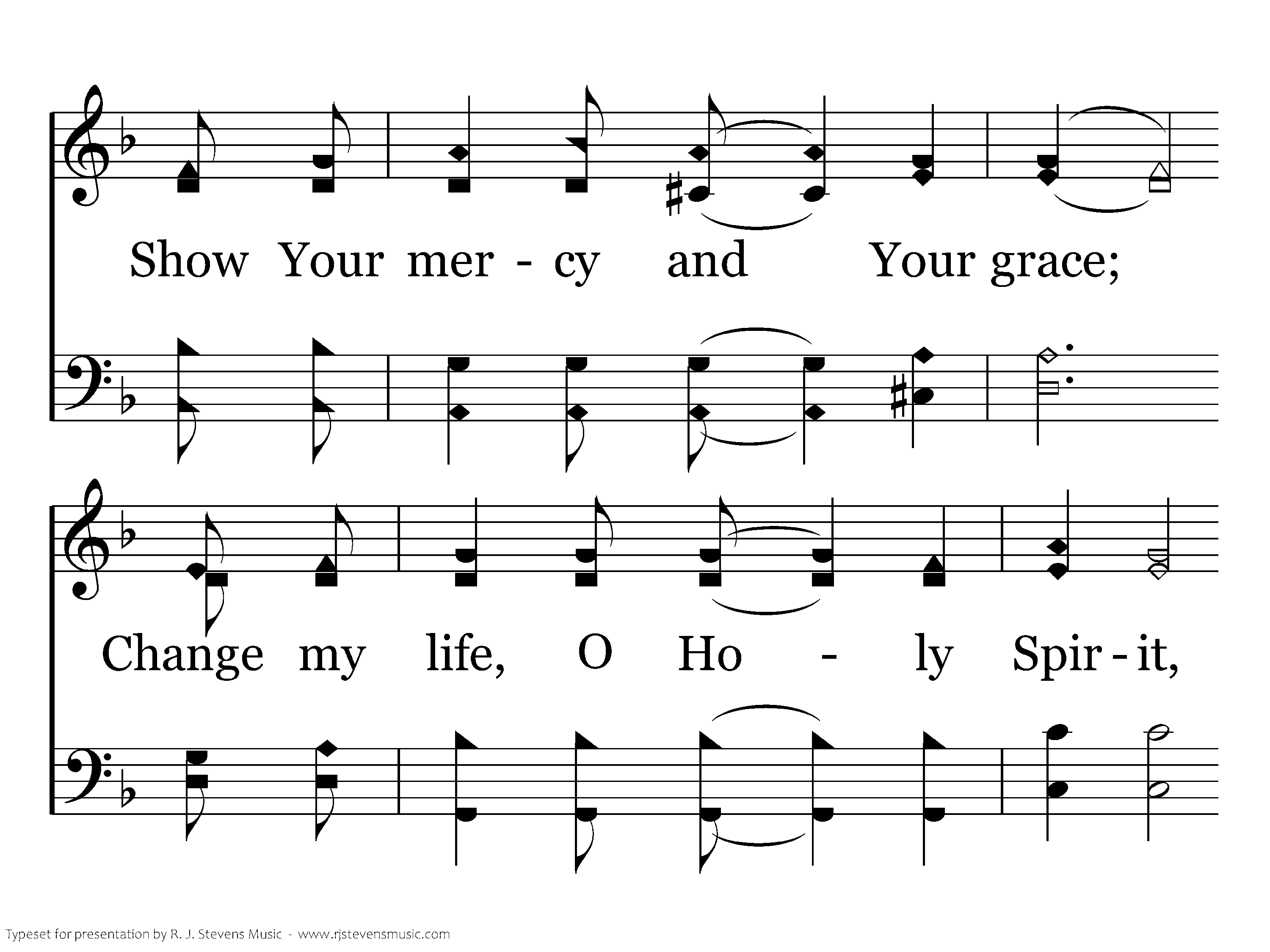 On bended knee I come, With a broken heart I come, Bowing down before Your holy throne; As I look upon your face, Show your mercy and Your grace; Change my life, O Holy Spirit, Make me fresh and ever new, Make my life a holy sacrifice to You.