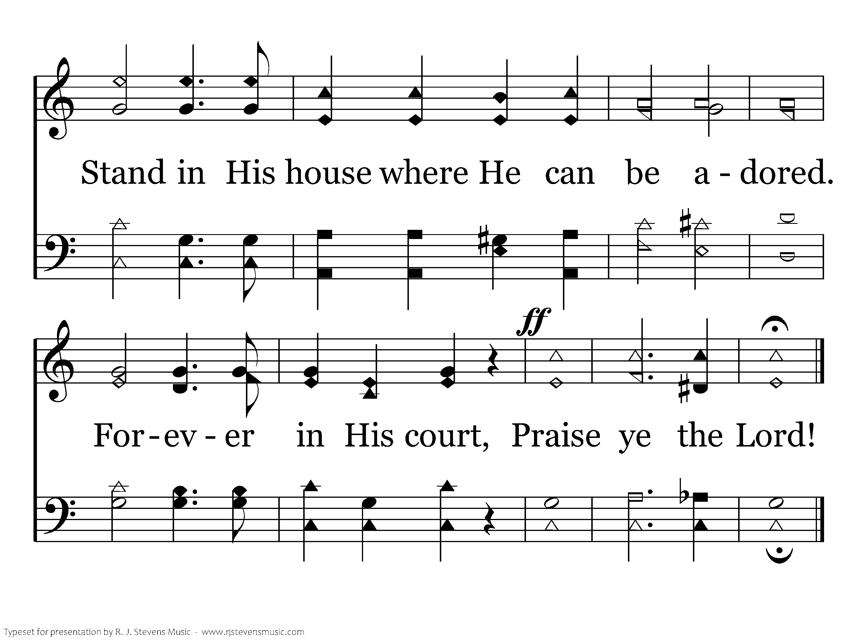 Praise ye the Lord, Jehovah is His name. Ye who are servants sing unto His fame. Stand in His house where He can be adored. Forever in His court, Praise Ye the Lord!