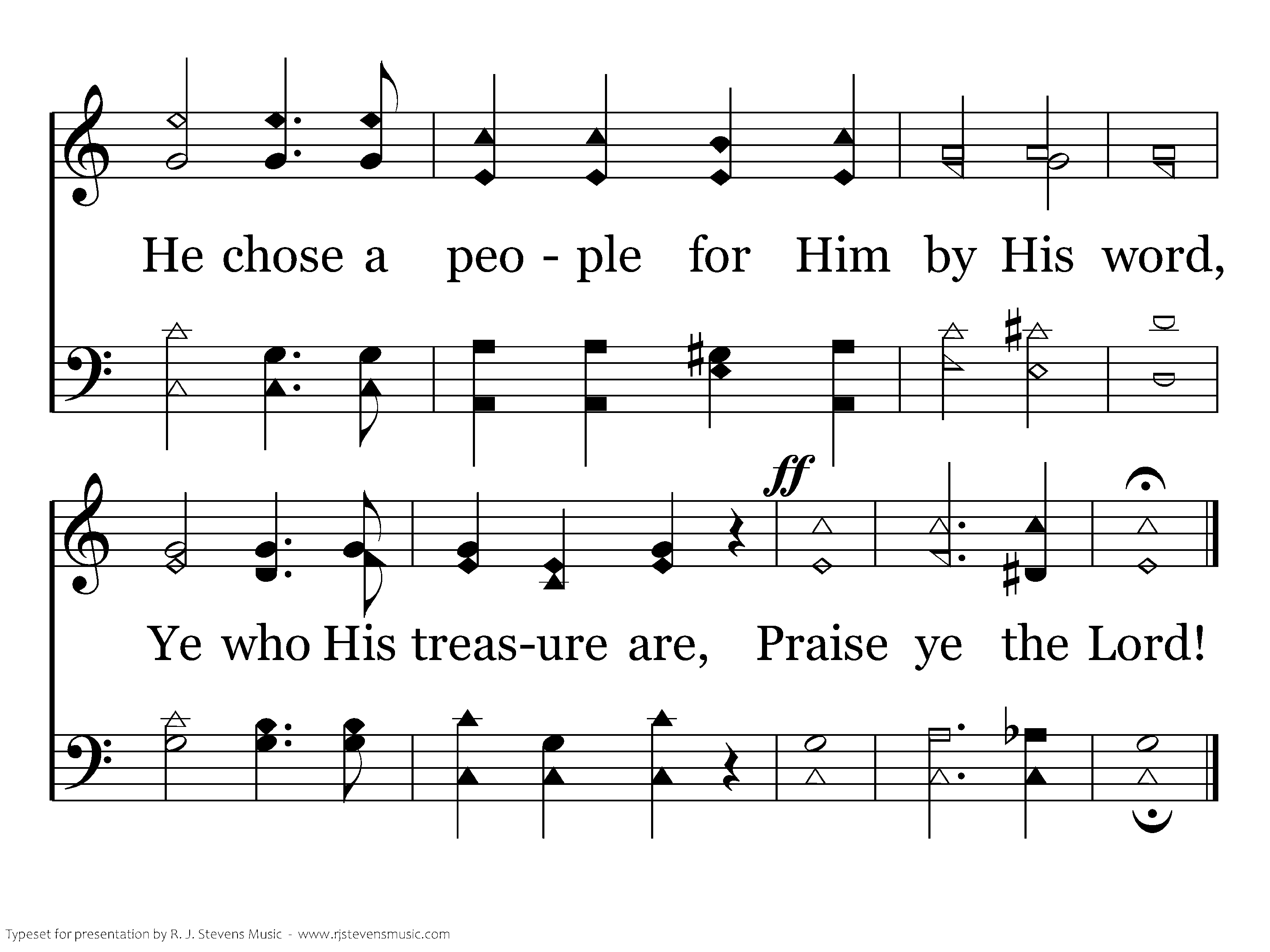 Praise ye the Lord, for He is full of grace. Yes, praise is pleasant here and every place. He chose a people for Him by His word, Ye who His treasure are, Praise ye the Lord!