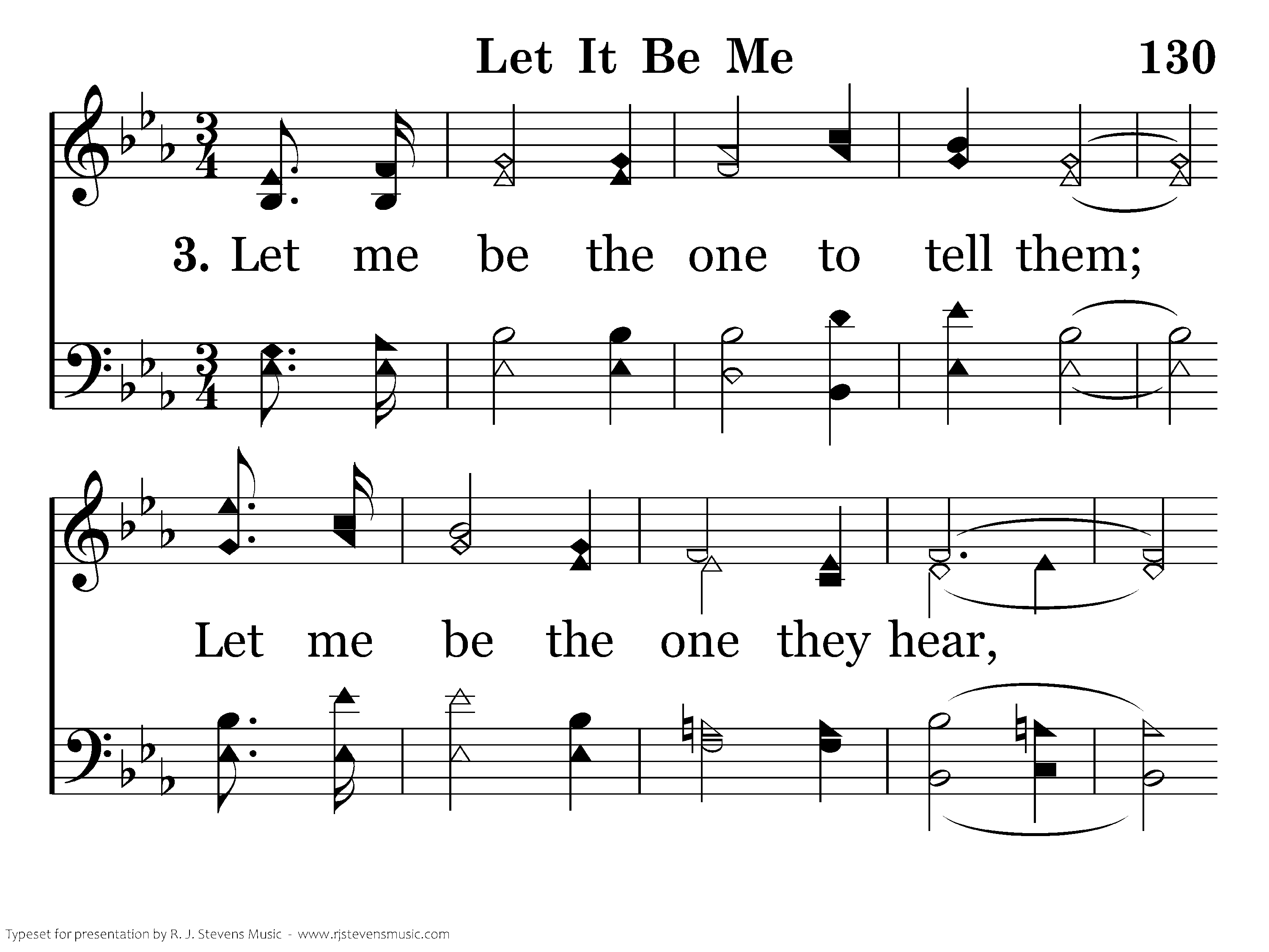 Let me be the one to tell them; Let me be the one they hear, Giving praise to Christ the Savior, Son of God who's always near.