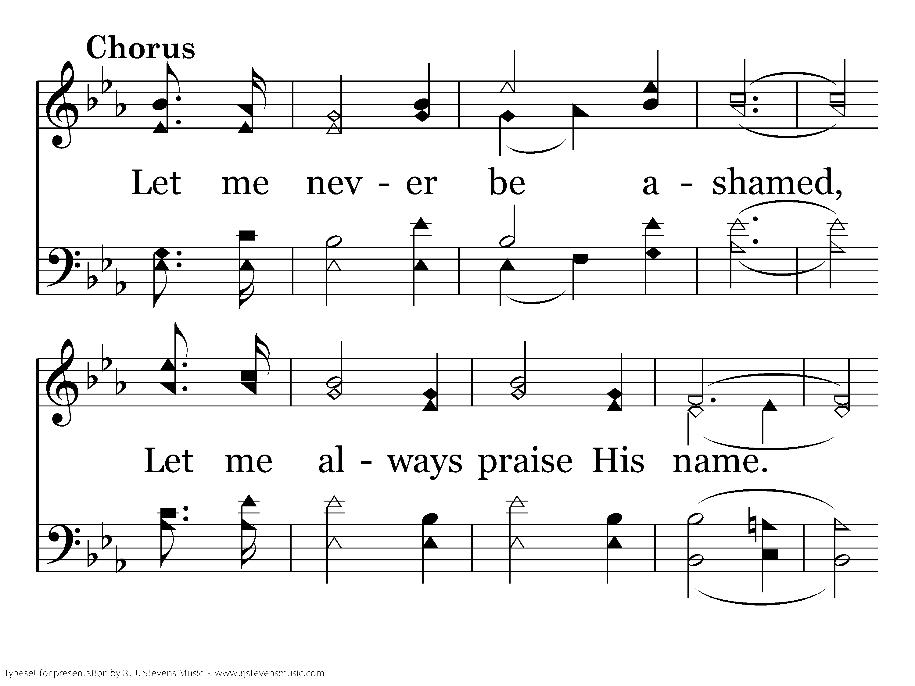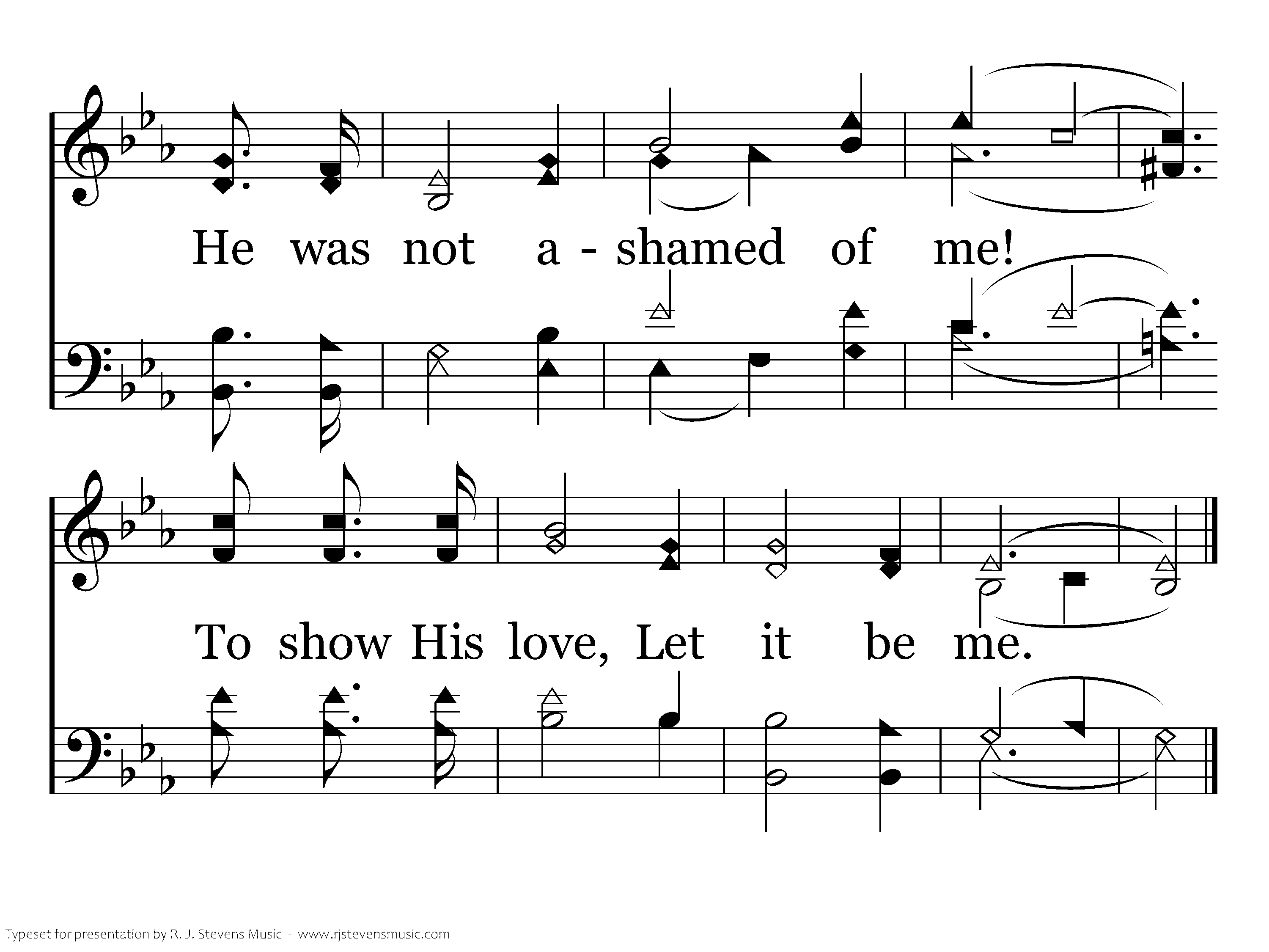 Let me never be ashamed; Let me always praise His name. He was not ashamed of me! To show His love, Let it be me.
