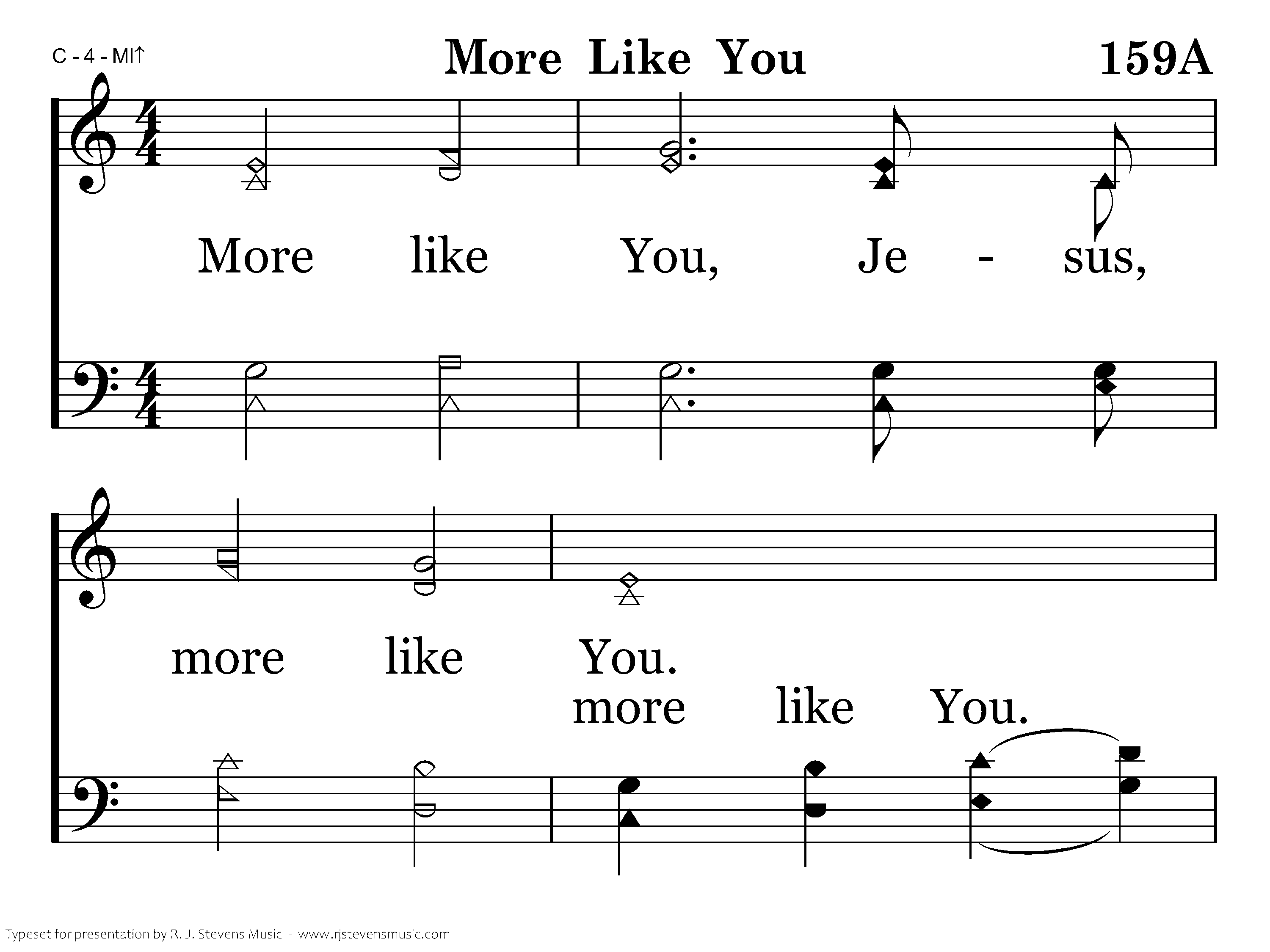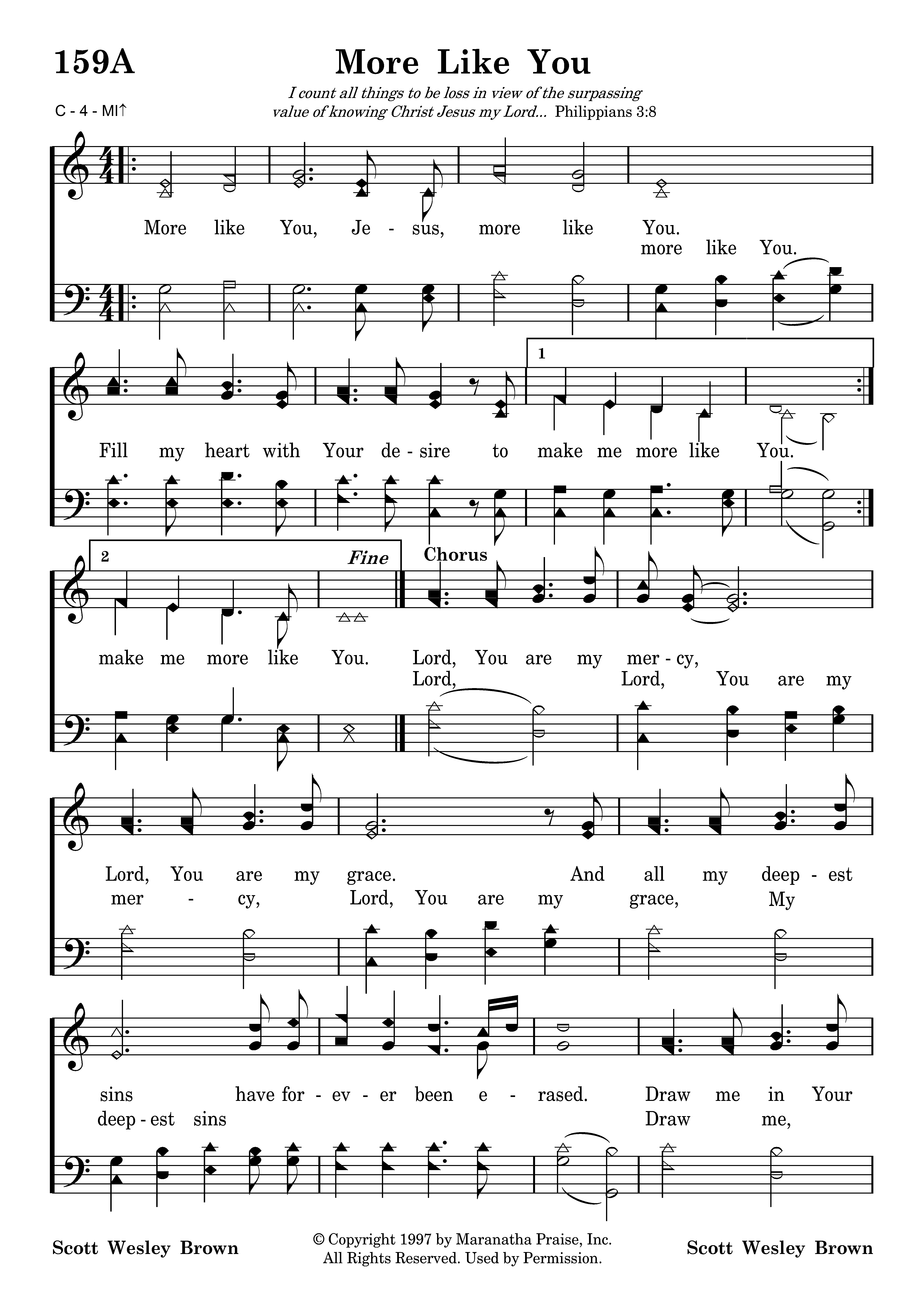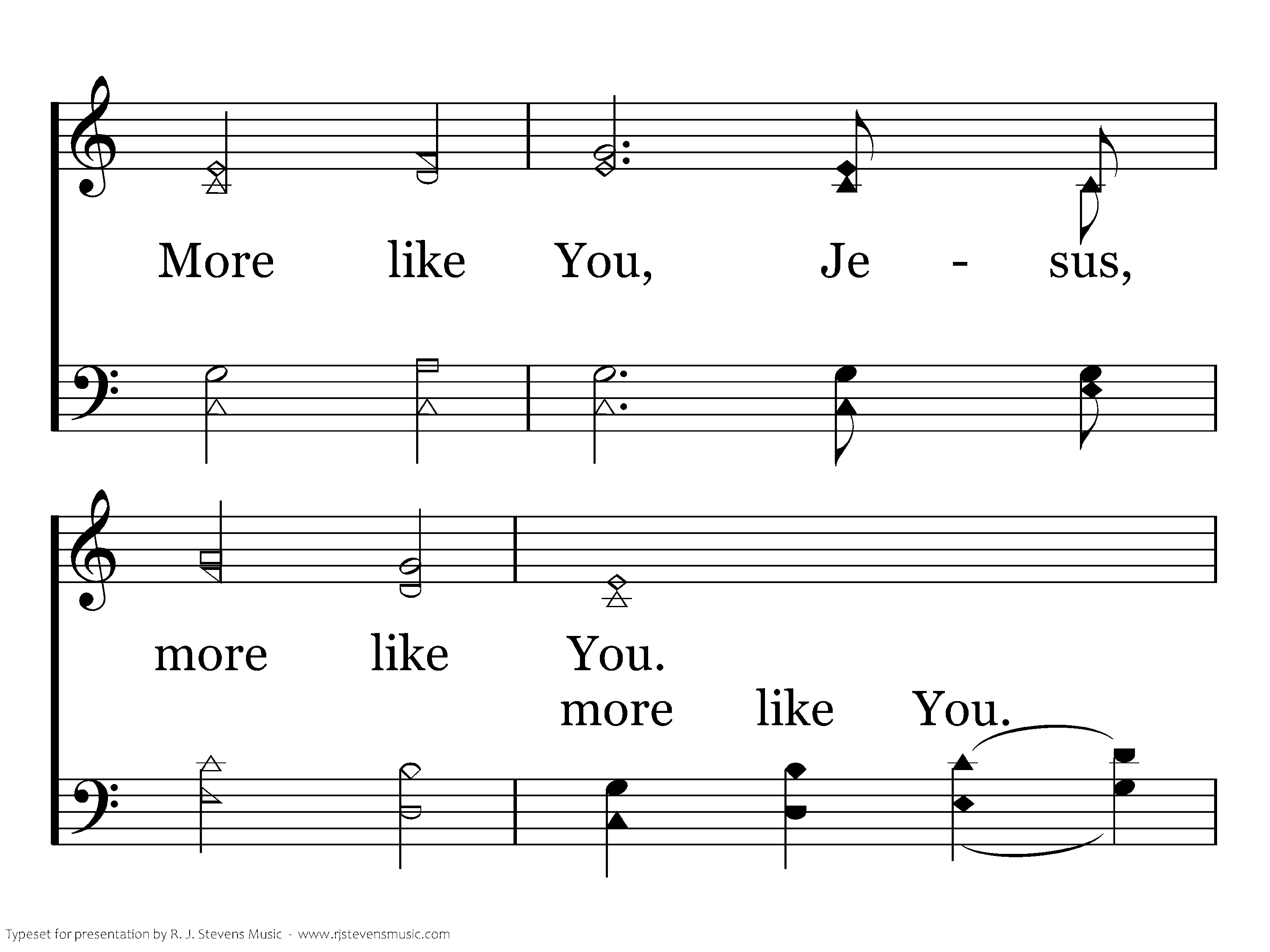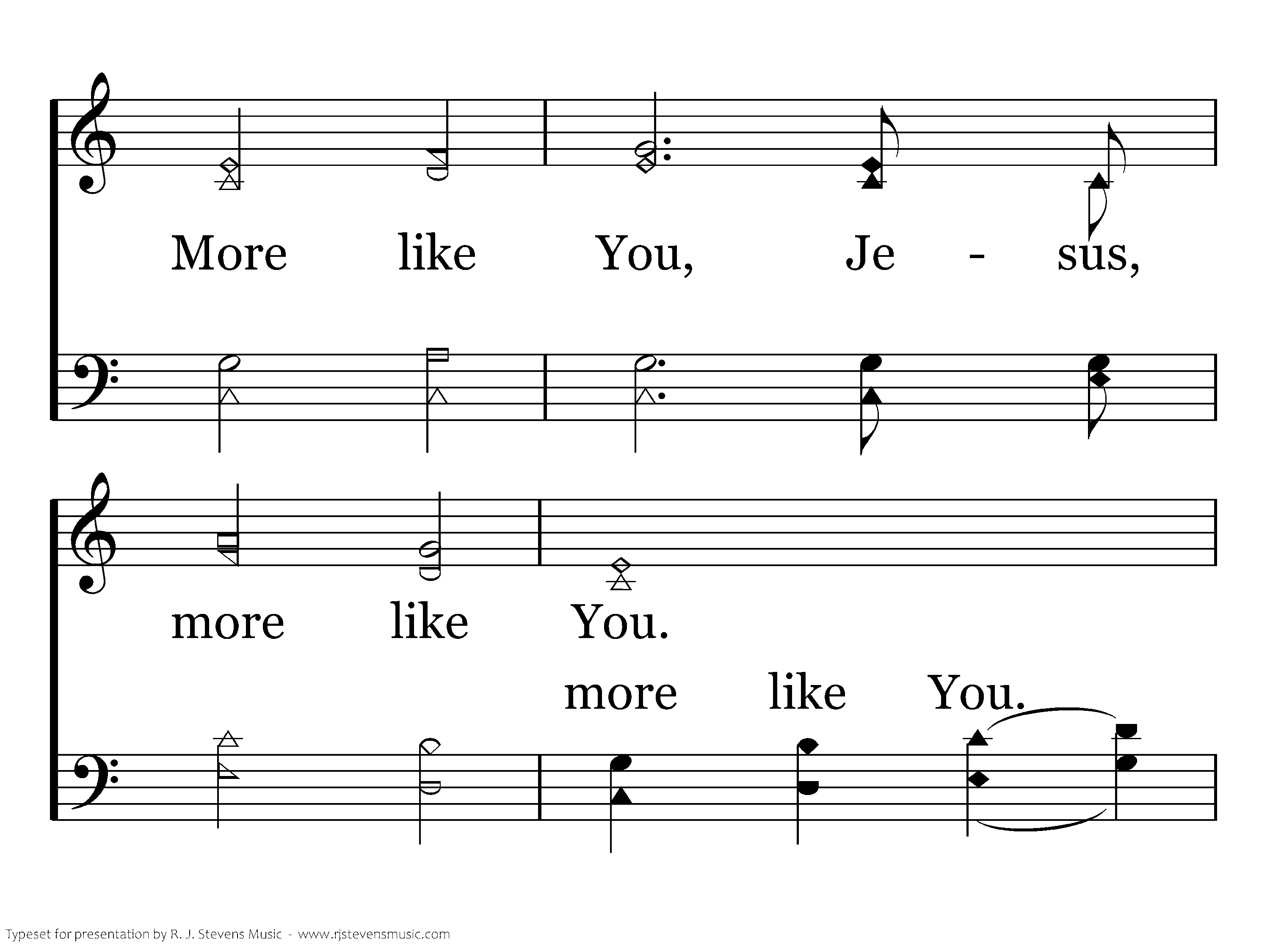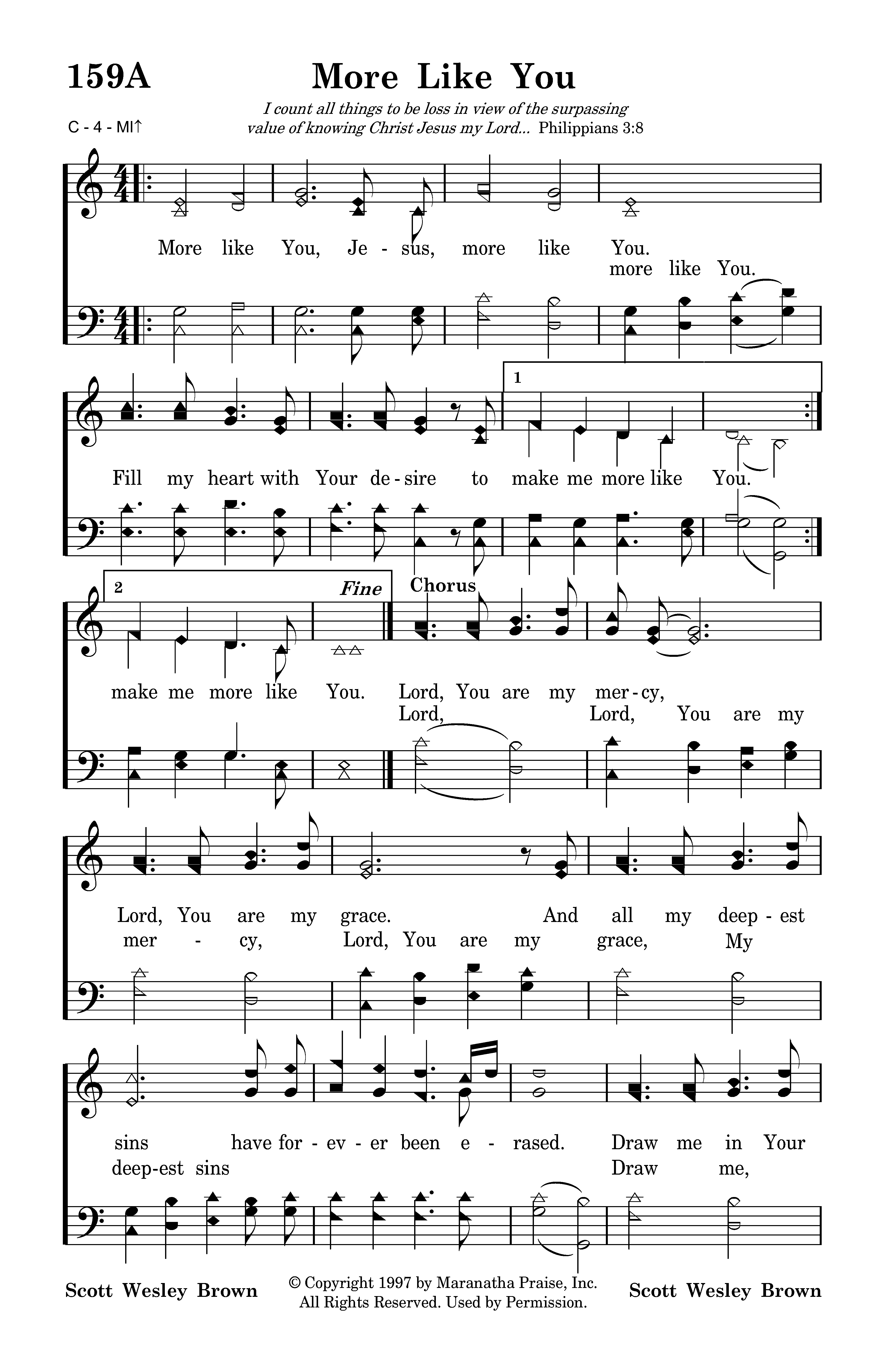 More like You, Jesus, more like You. Fill my heart with Your desire to make me more like You. make me more like You. Draw me in Your presence, lead me in Your ways. I long to bring You glory in righteousness and praise. Lord, Lord, You are my mercy, Lord, You are my grace, deepest sins Draw me, draw me in Your presence, lead me in Your ways, bring to You My more like You.