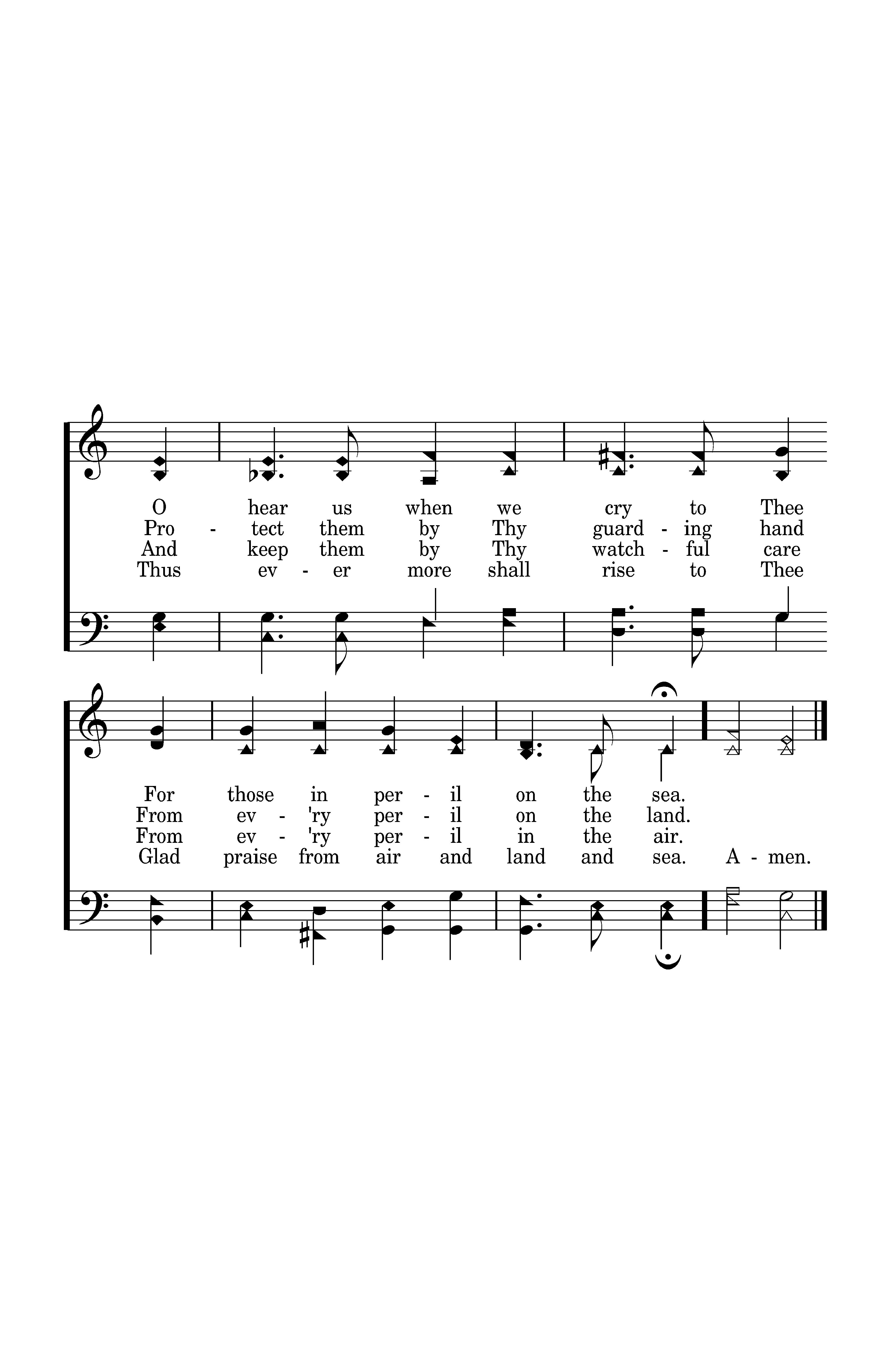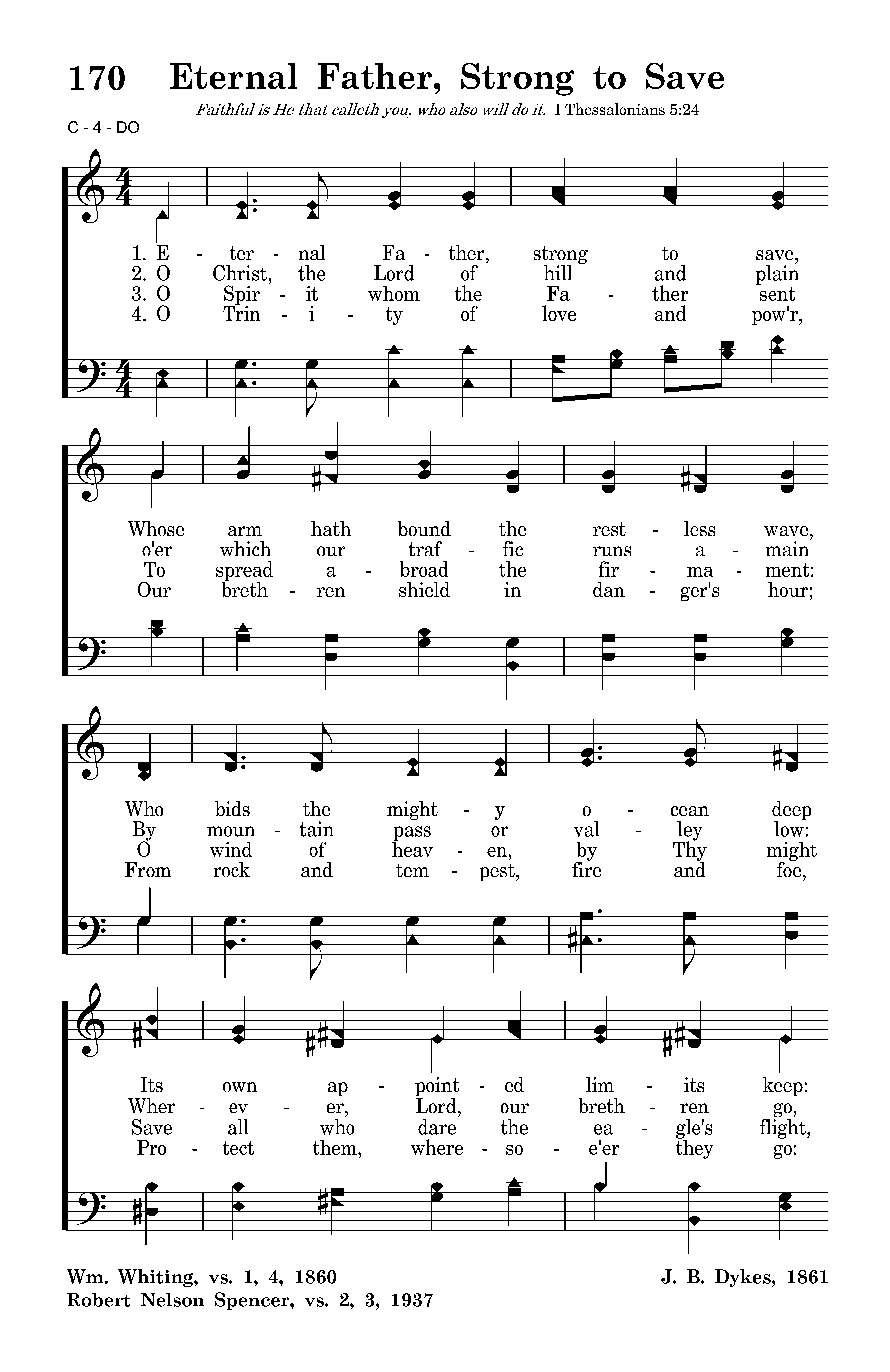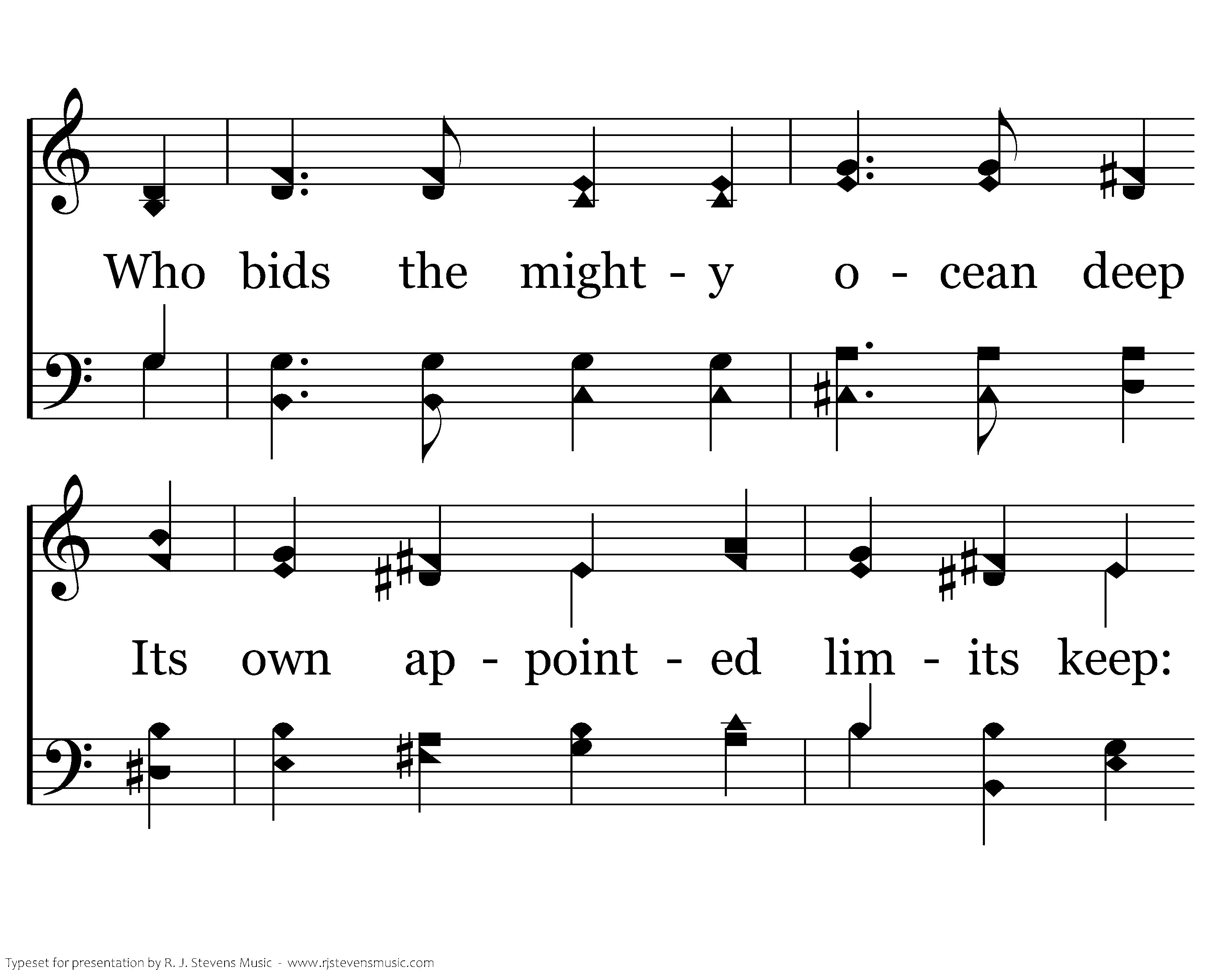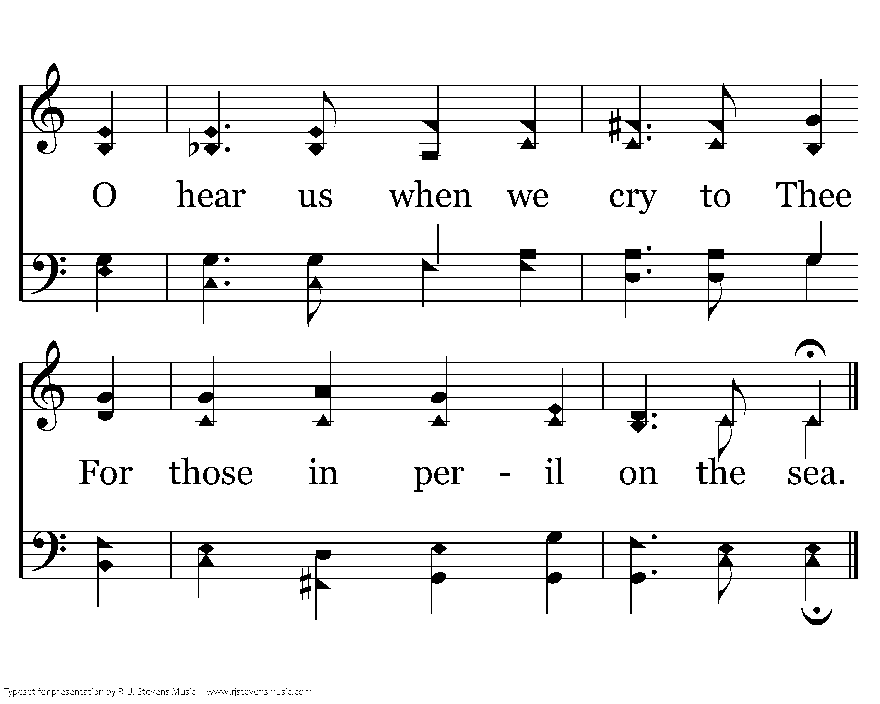 Eternal Father, strong to save, Whose arm hath bound the restless wave, Who bids the mighty ocean deep Its own appointed limits keep: O hear us when we cry to Thee For those in peril on the sea.