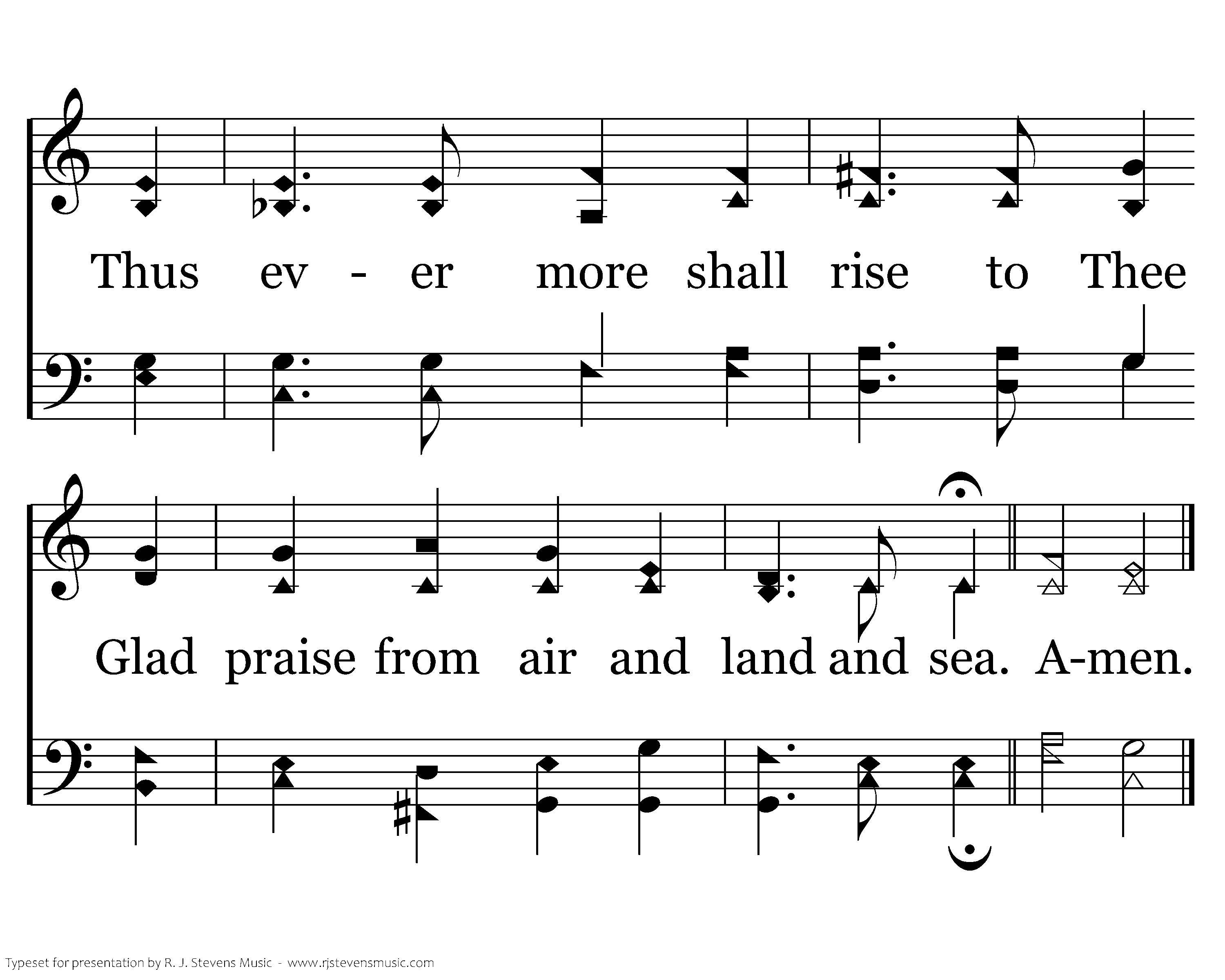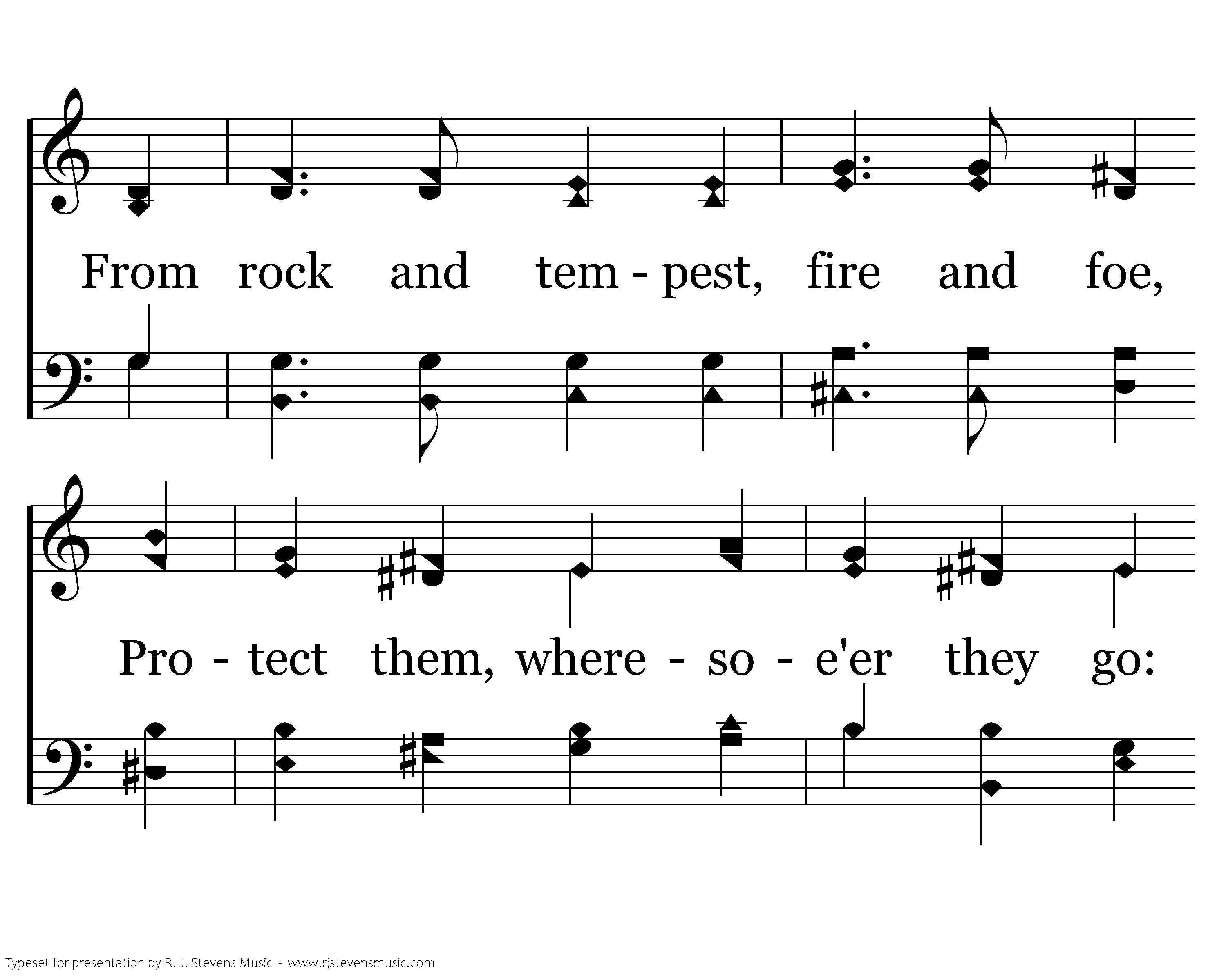O Trinity of love and pow'r, Our brethren shield in danger's hour; From rock and tempest, fire and foe, Protect them, wheresoe'er they go: Thus ever more shall rise to Thee Glad praise from air and land and sea. Amen