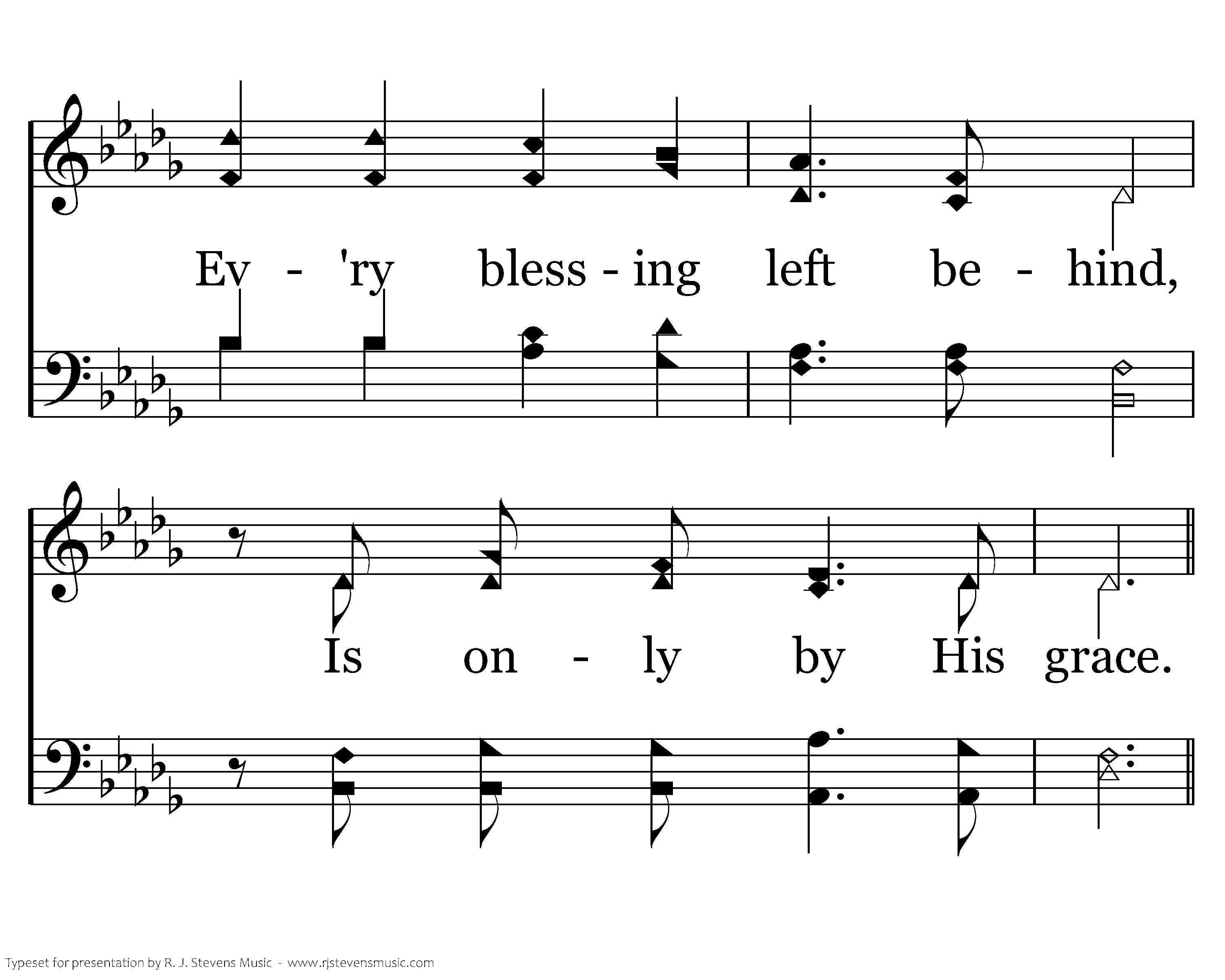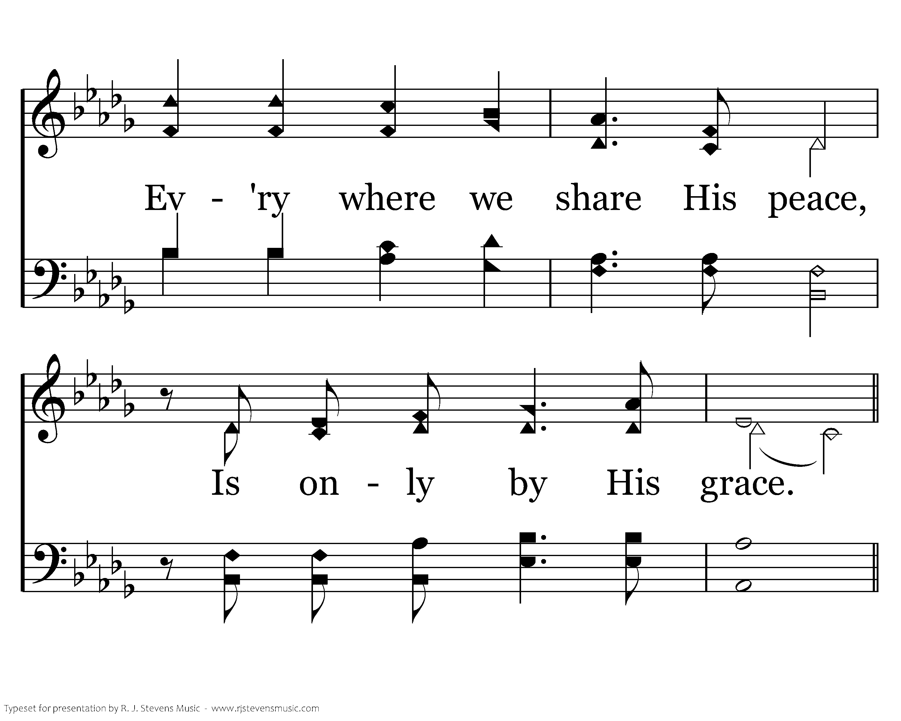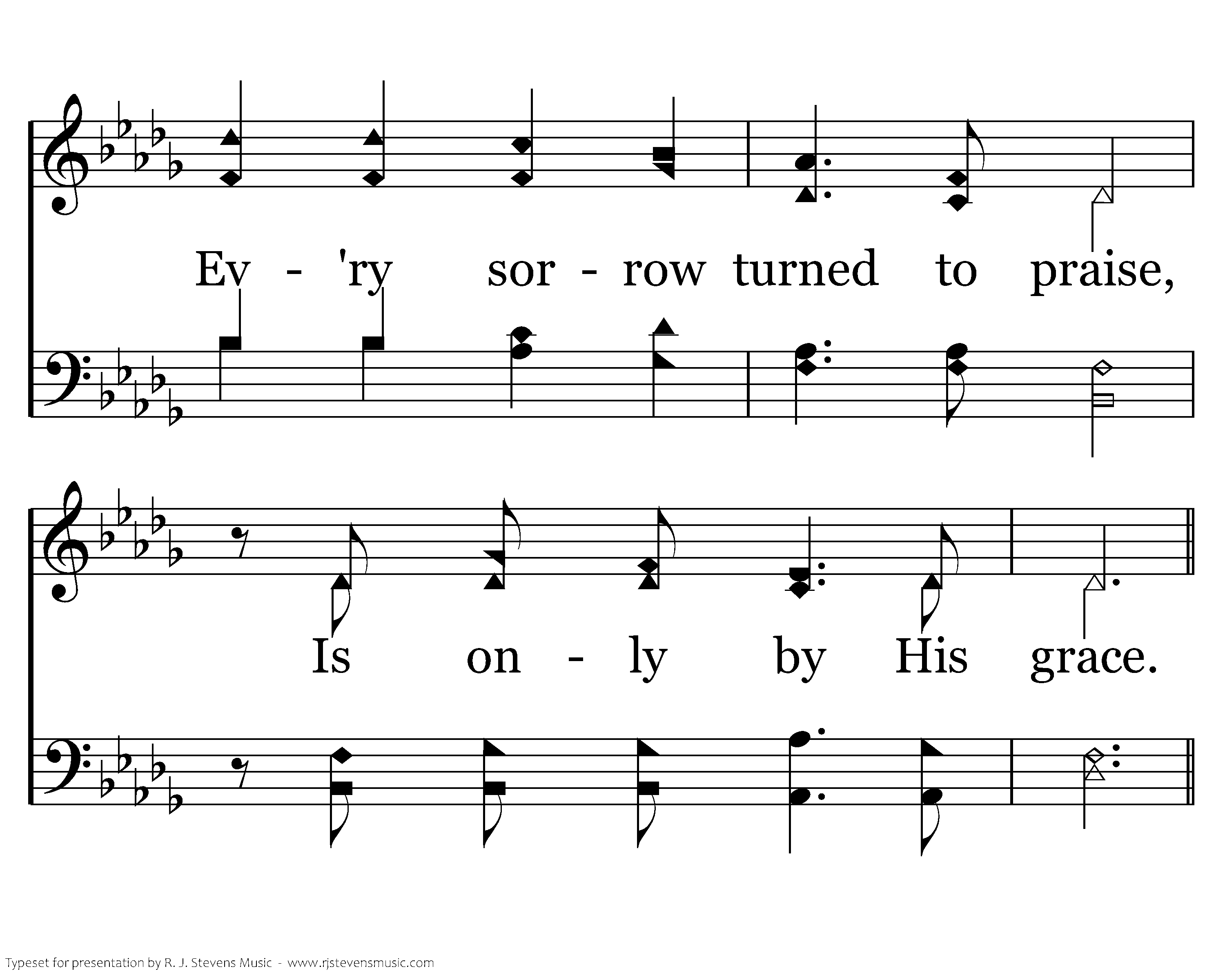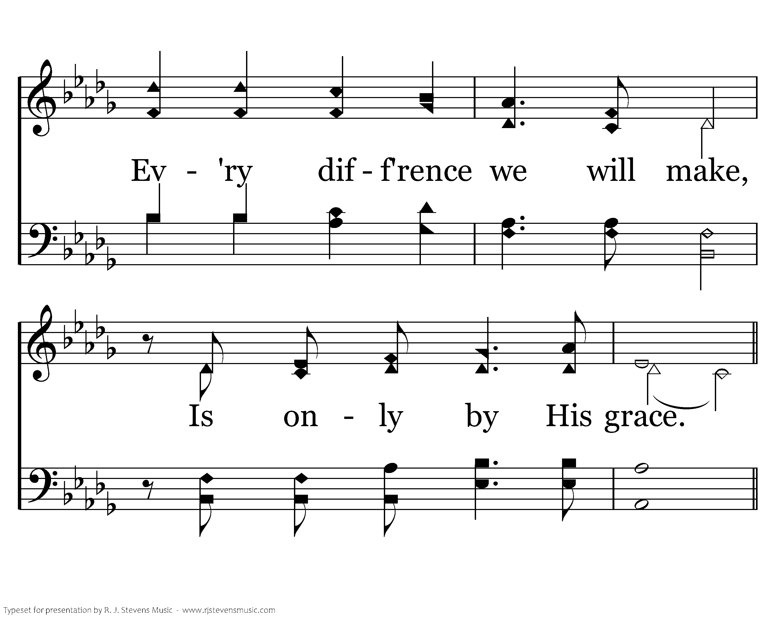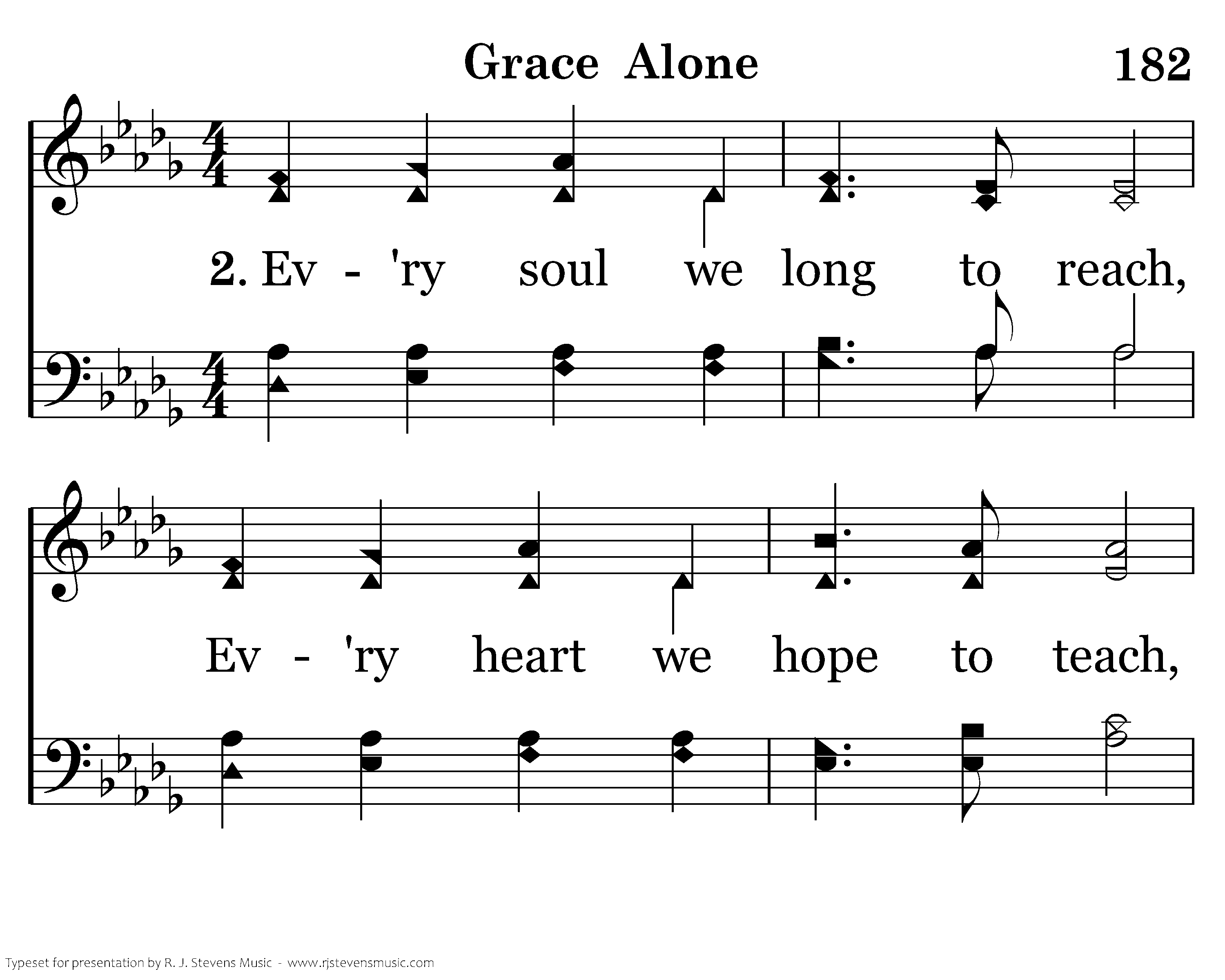 Ev'ry soul we long to reach, Ev'ry heart we hope to teach, Ev'ry where we share His peace, Is only by His grace. Ev'ry loving word we say, Ev'ry tear we wipe away, Ev'ry sorrow turned to praise,Ev'ry tear we wipe away, Ev'ry sorrow turned to praise, Is only by His grace.