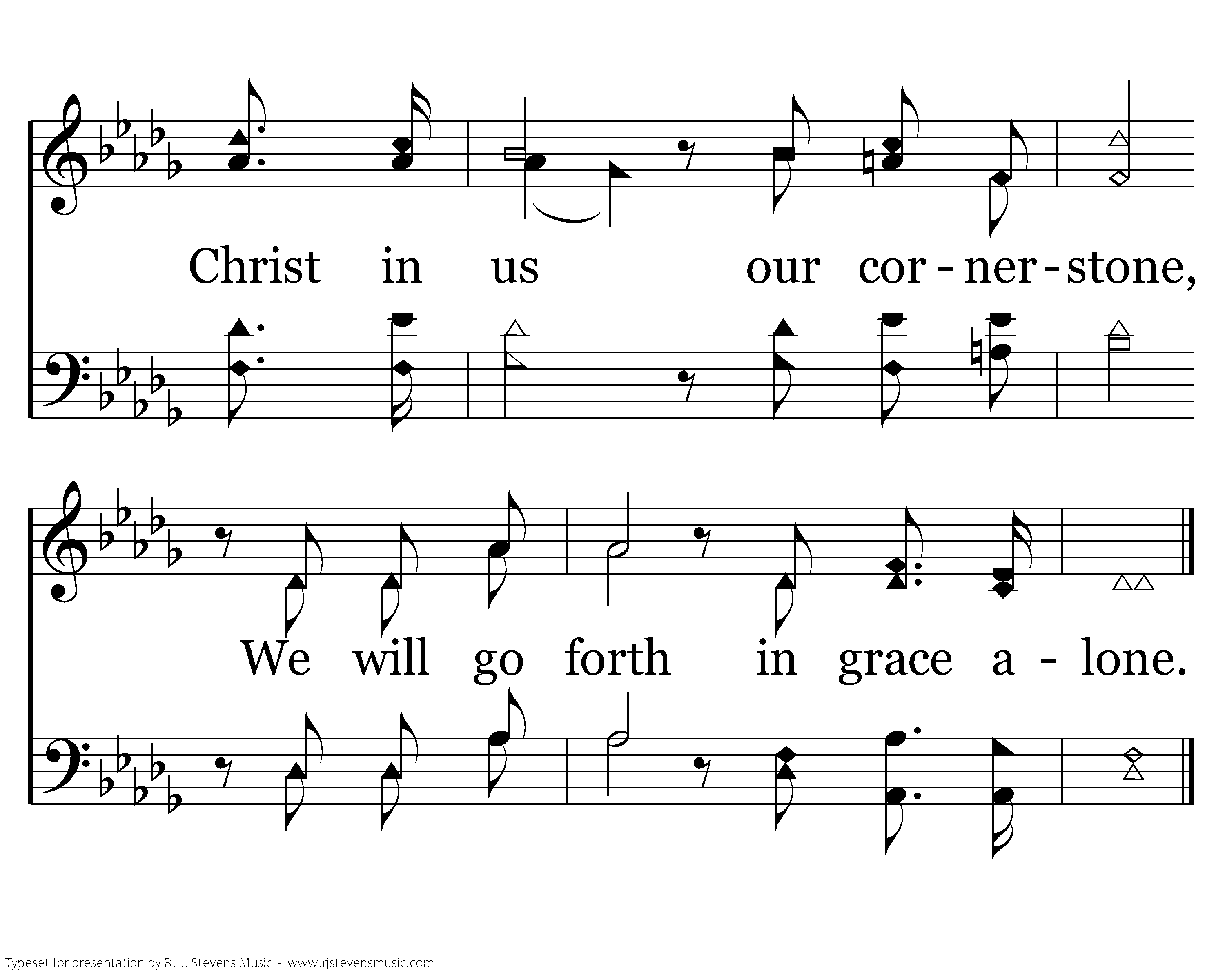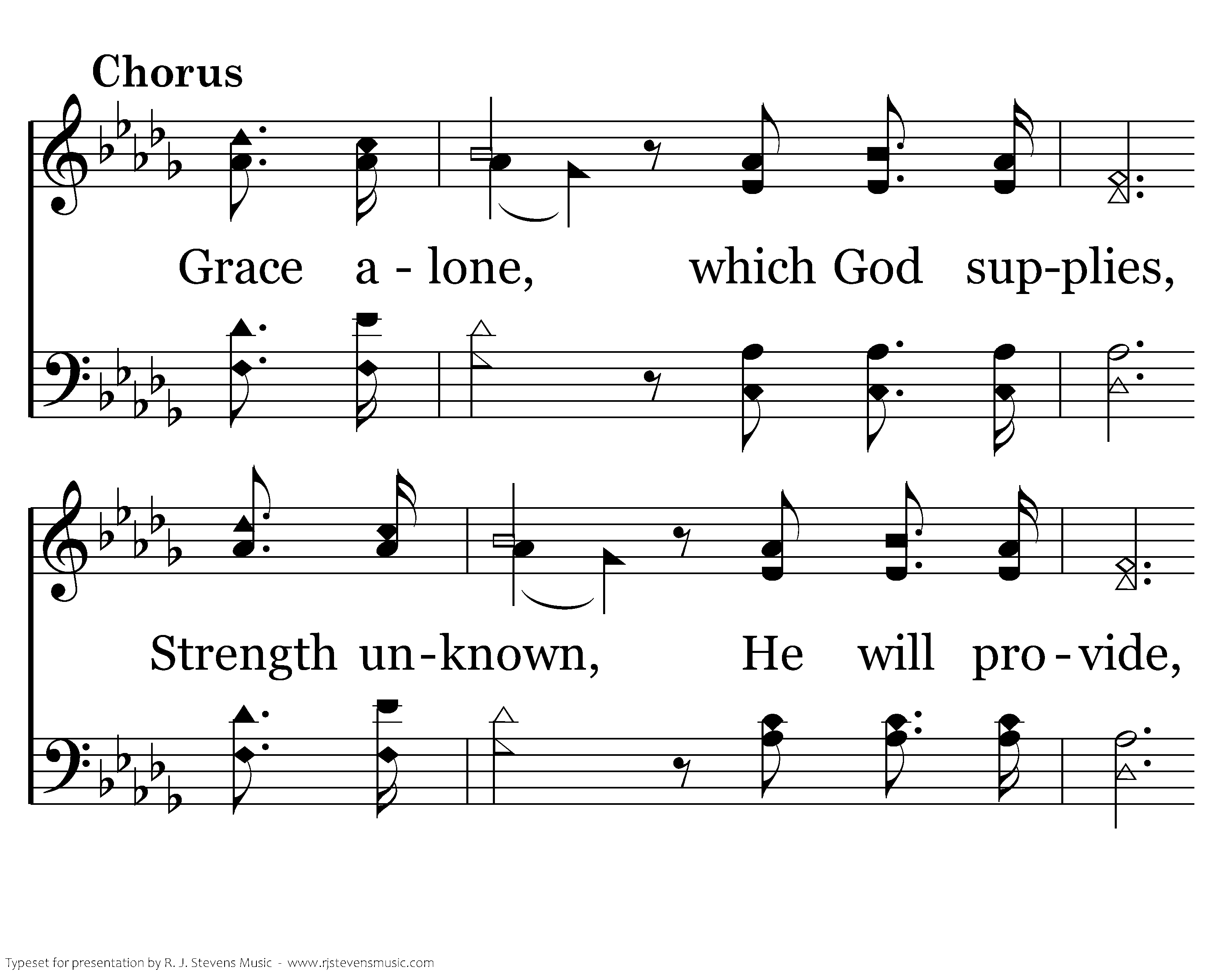 Grace alone, which God supplies, Strength unknown, He will provide, Christ in us our cornerstone, We will go forth in grace alone.