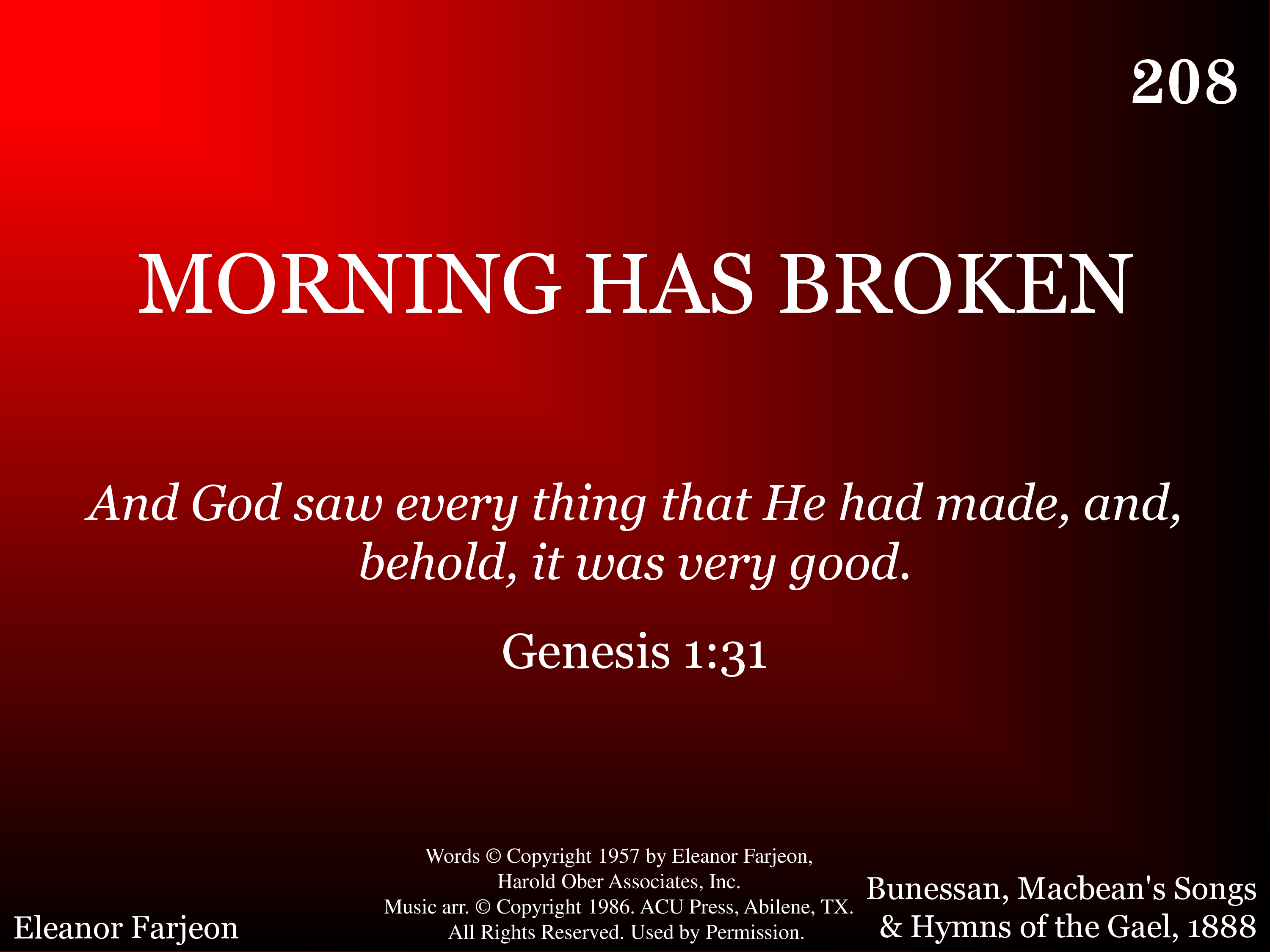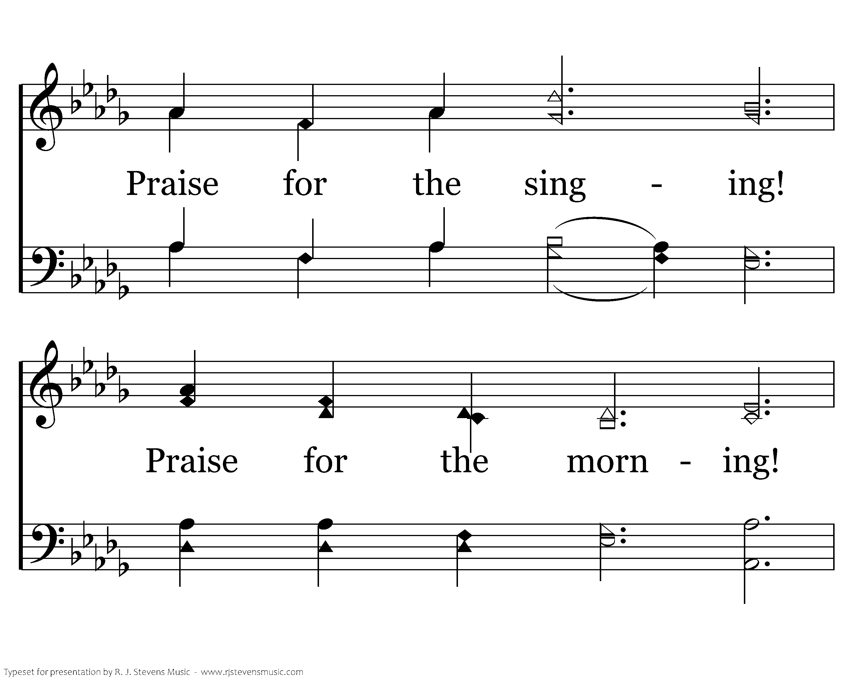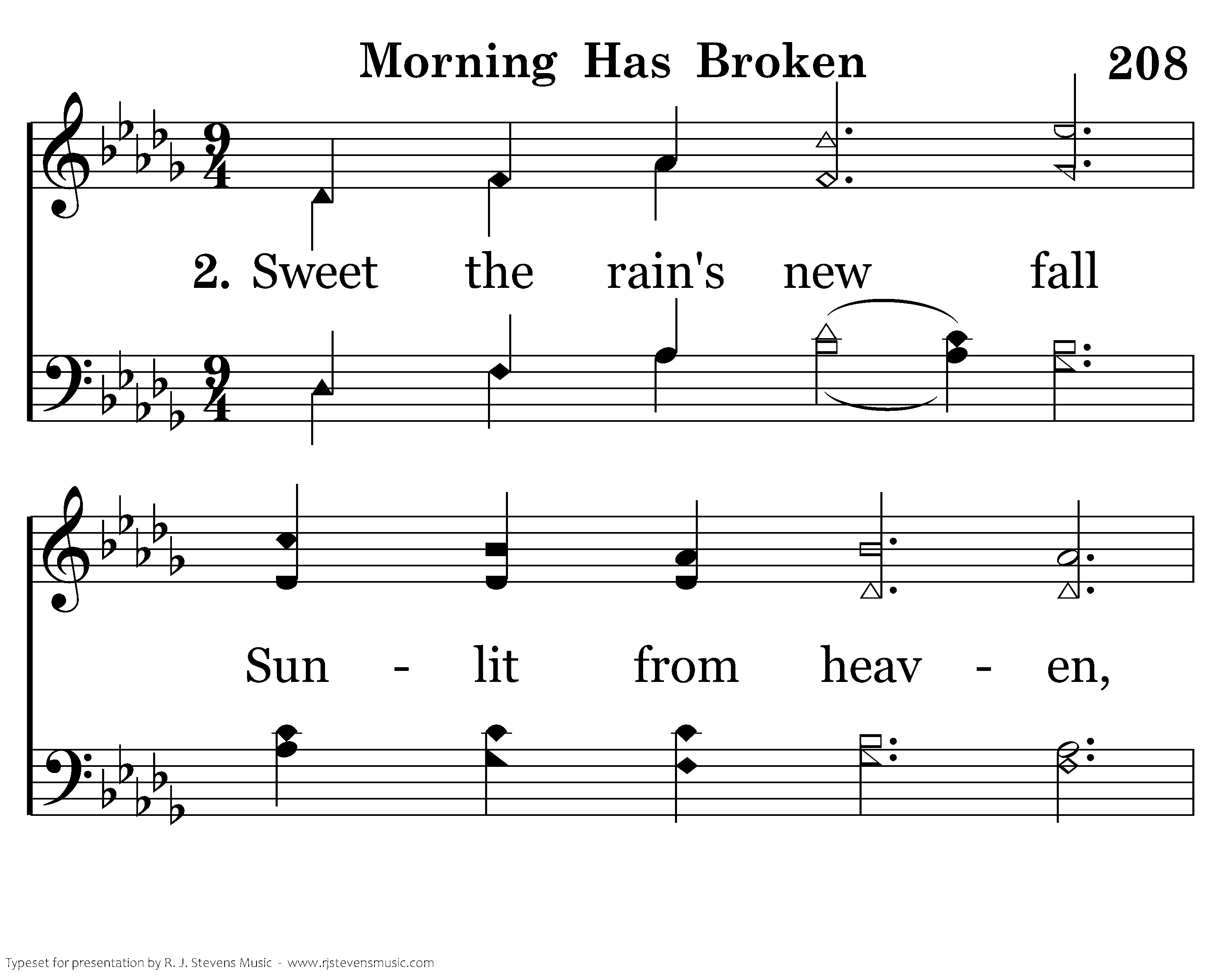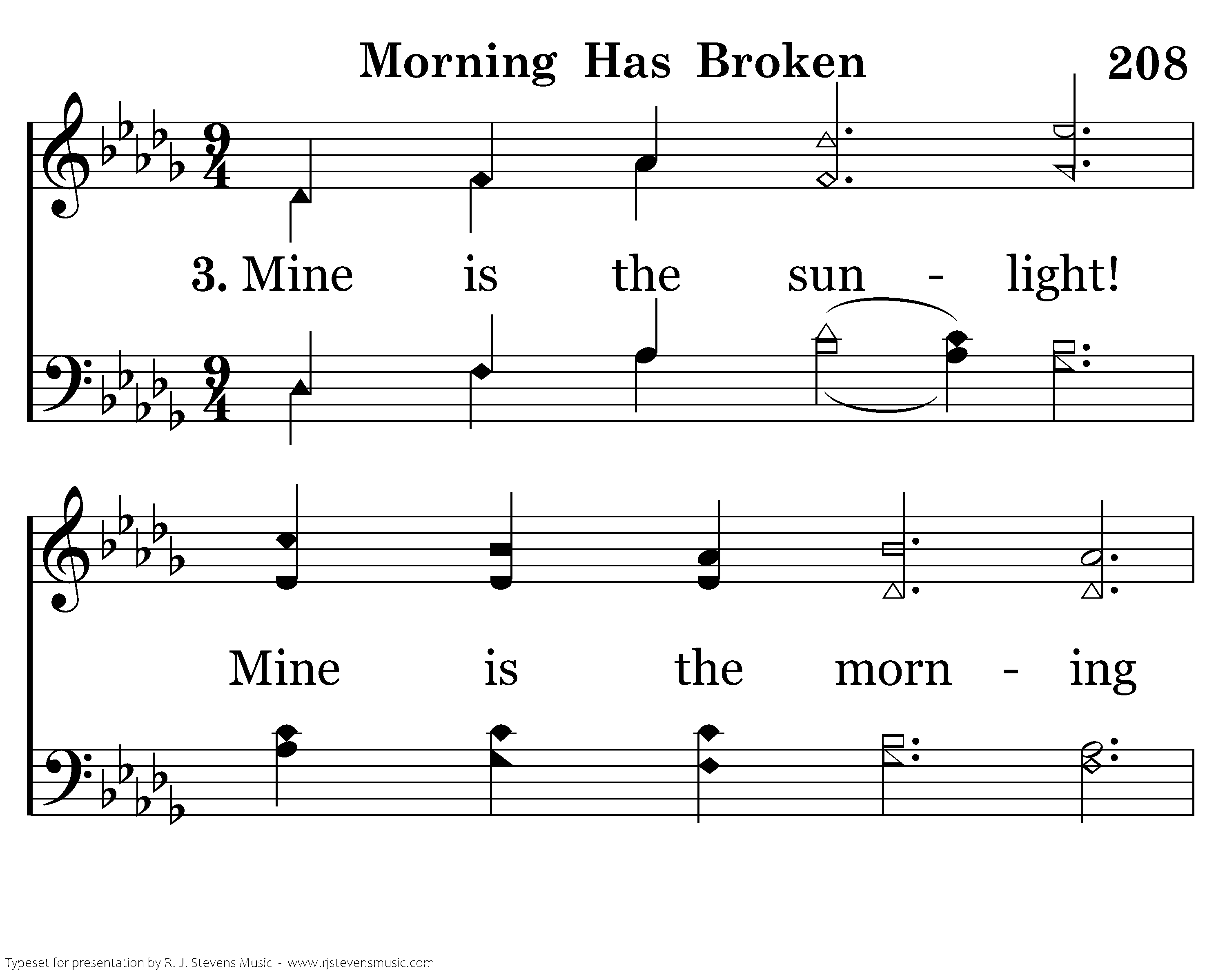 Morn-ing has broken Like the first morning, Blackbird has spoken Like the first bird. Praise for the singing! Praise for the morning! Praise for them, springing Fresh from the Word!