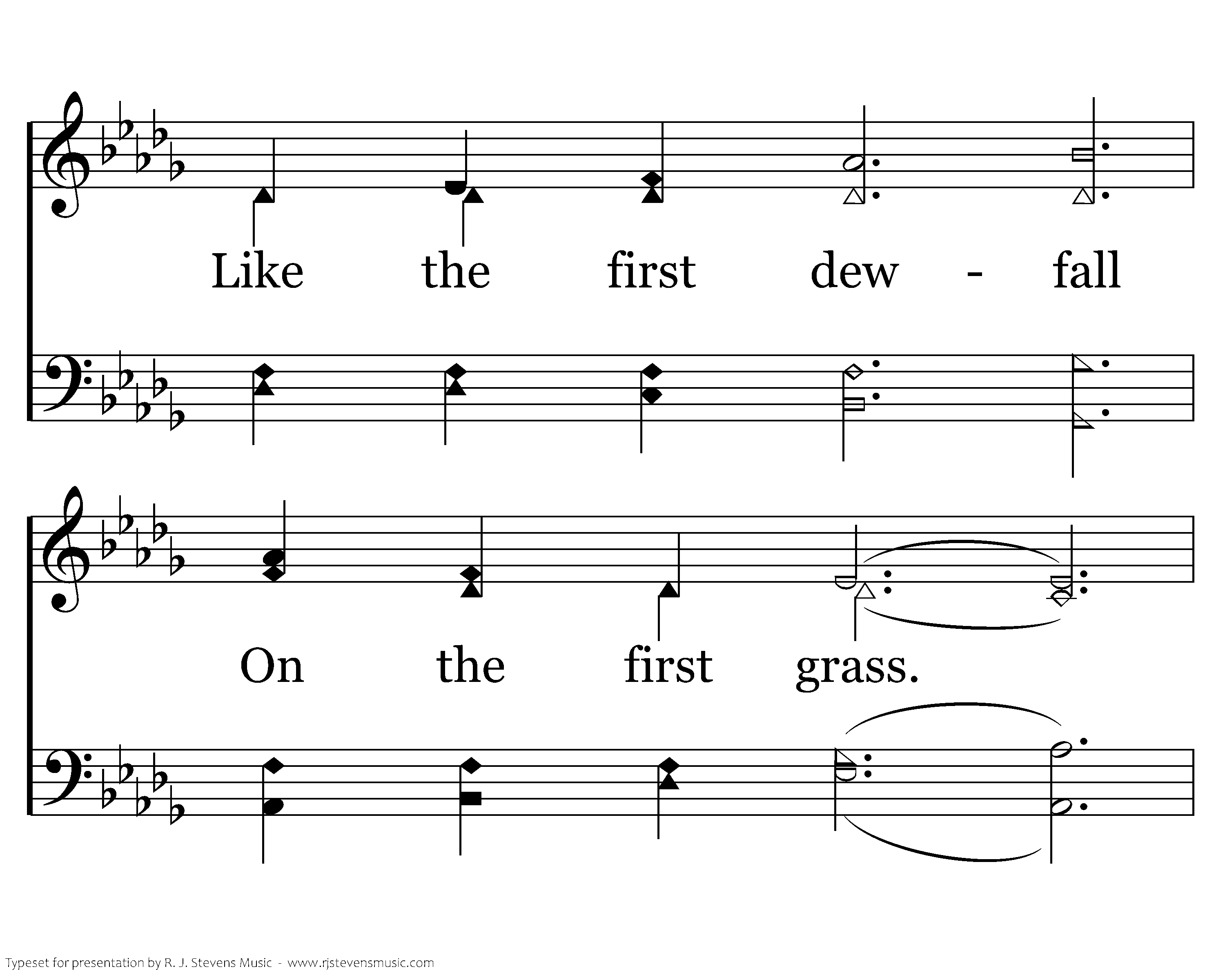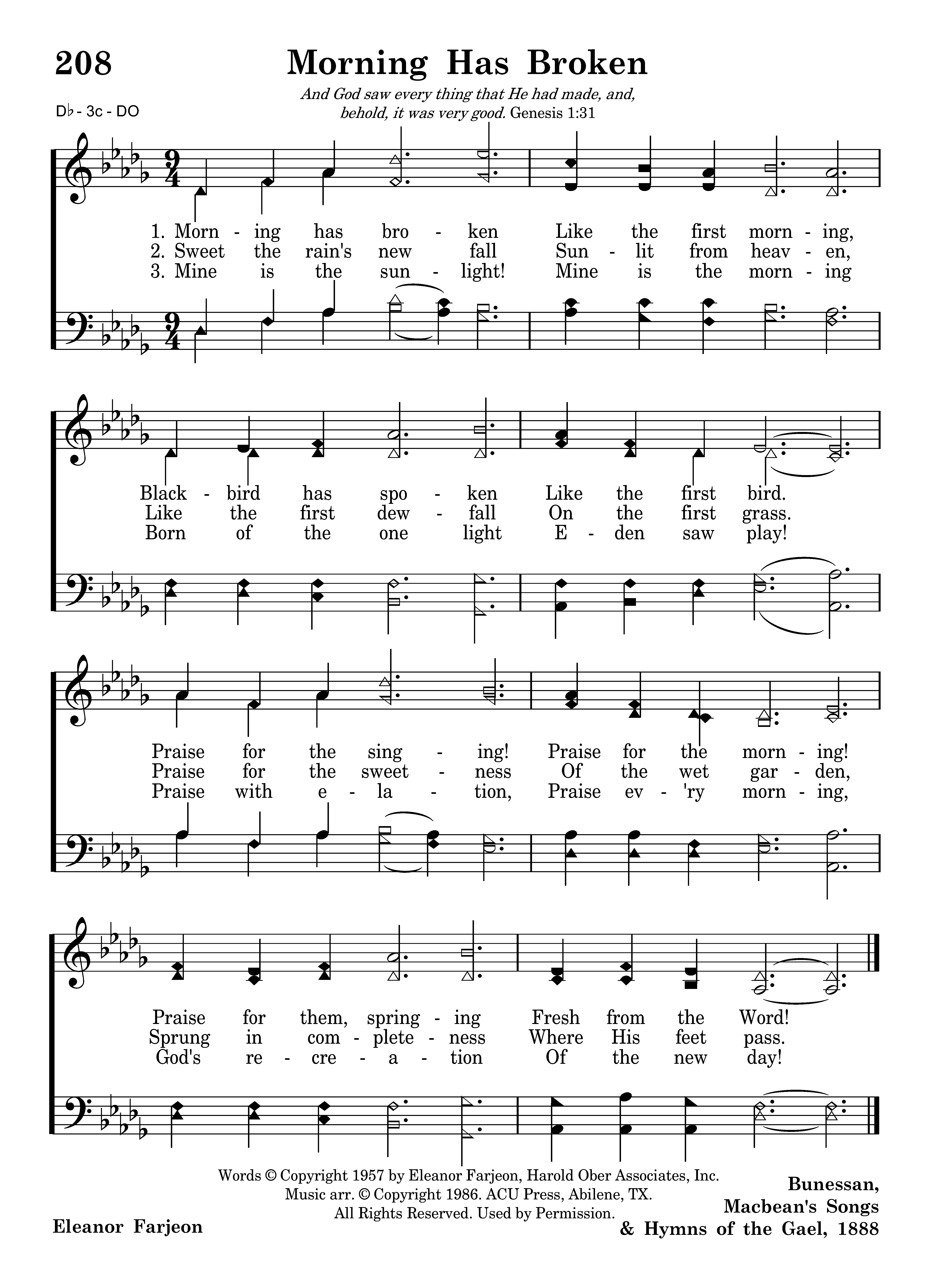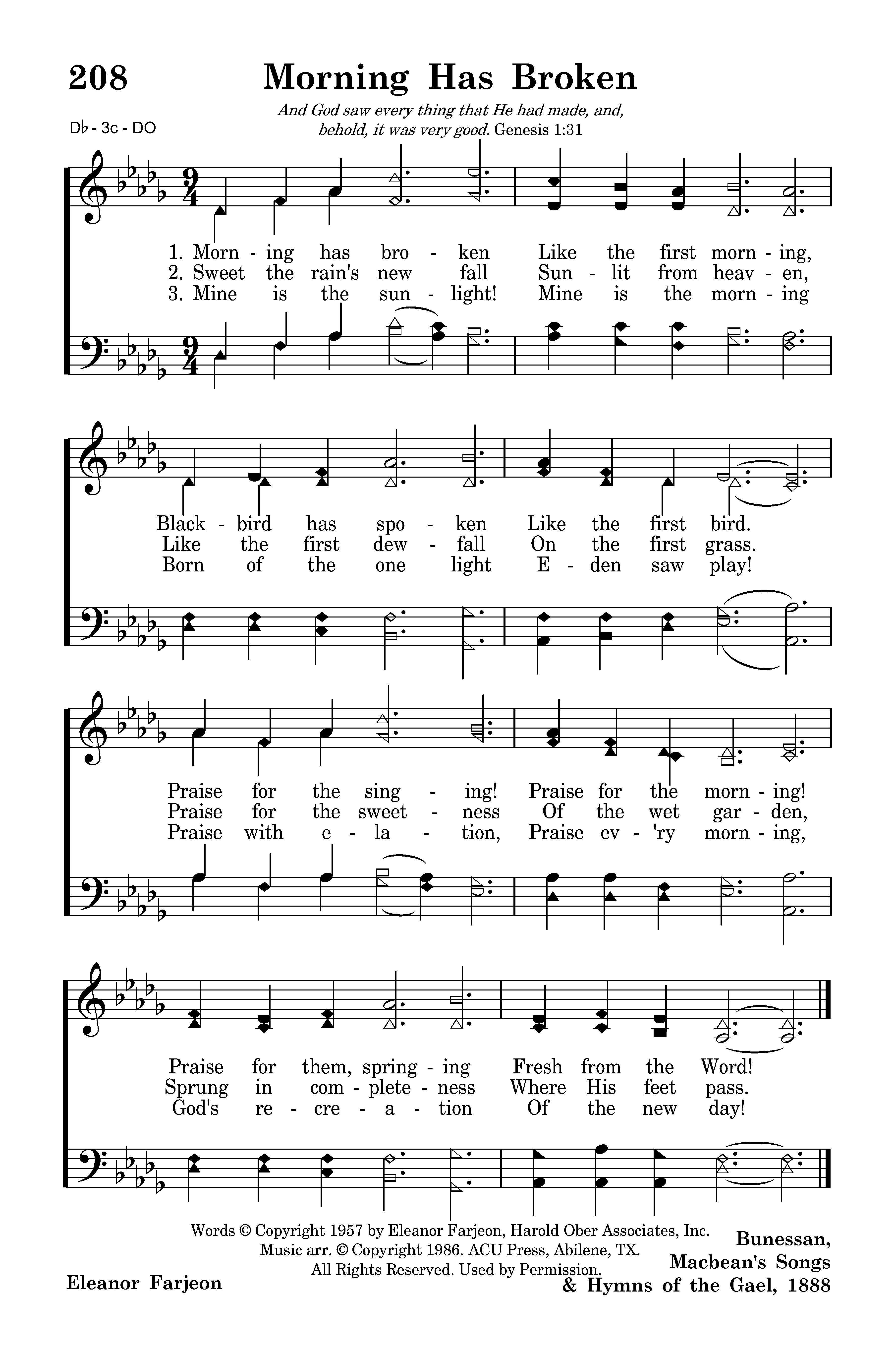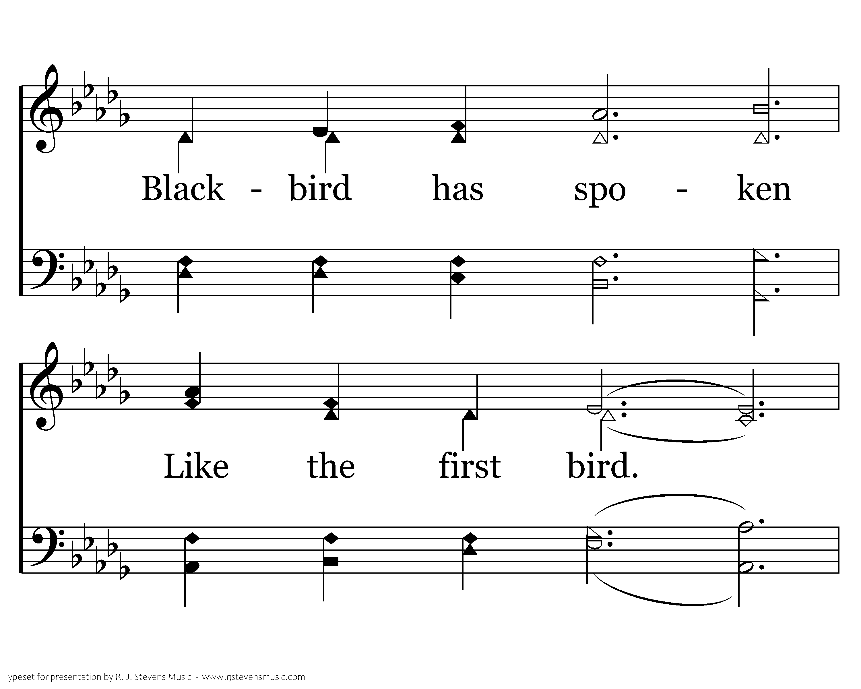 Morn-ing has broken Like the first morning, Blackbird has spoken Like the first bird. Praise for the singing! Praise for the morning! Praise for them, springing Fresh from the Word!