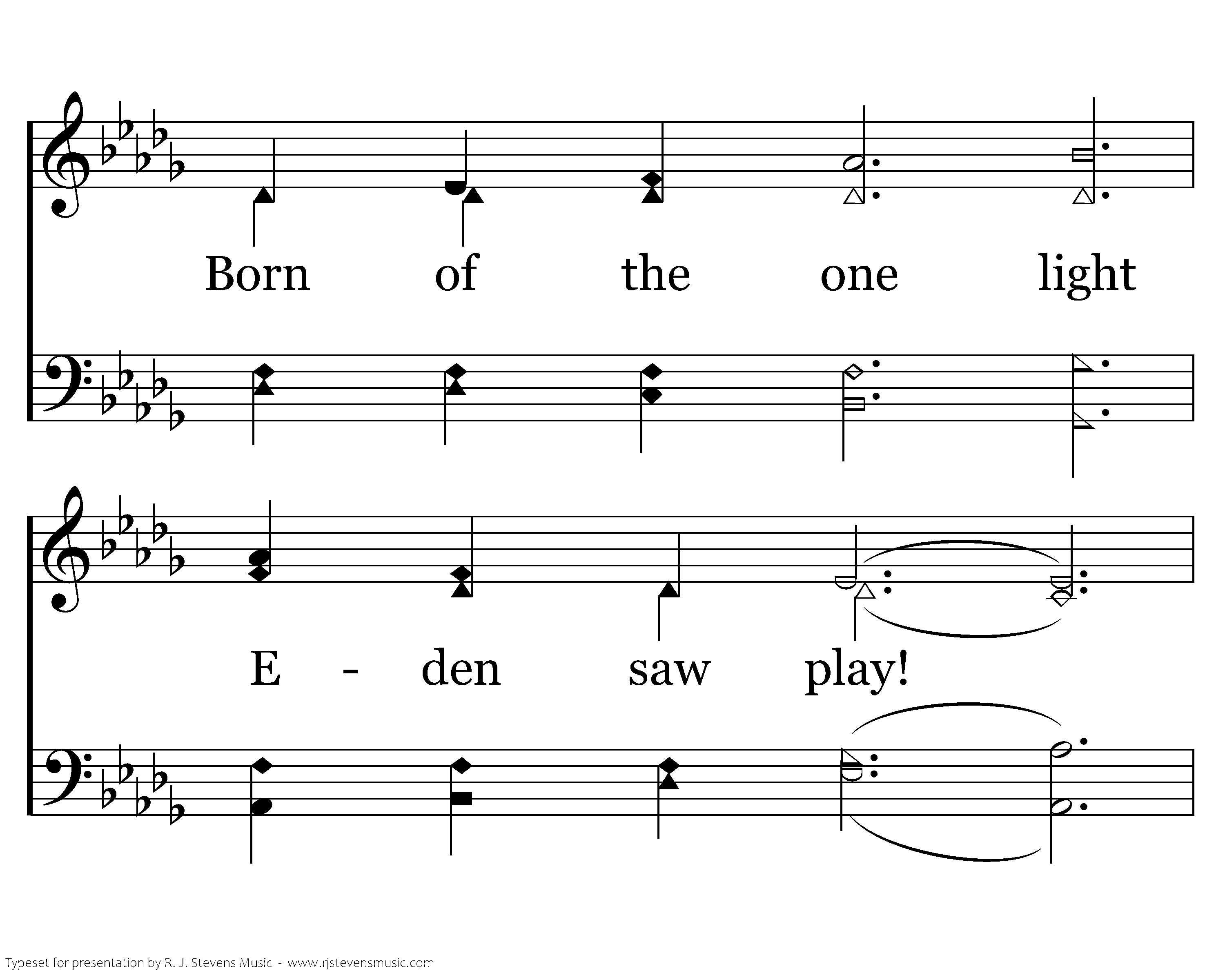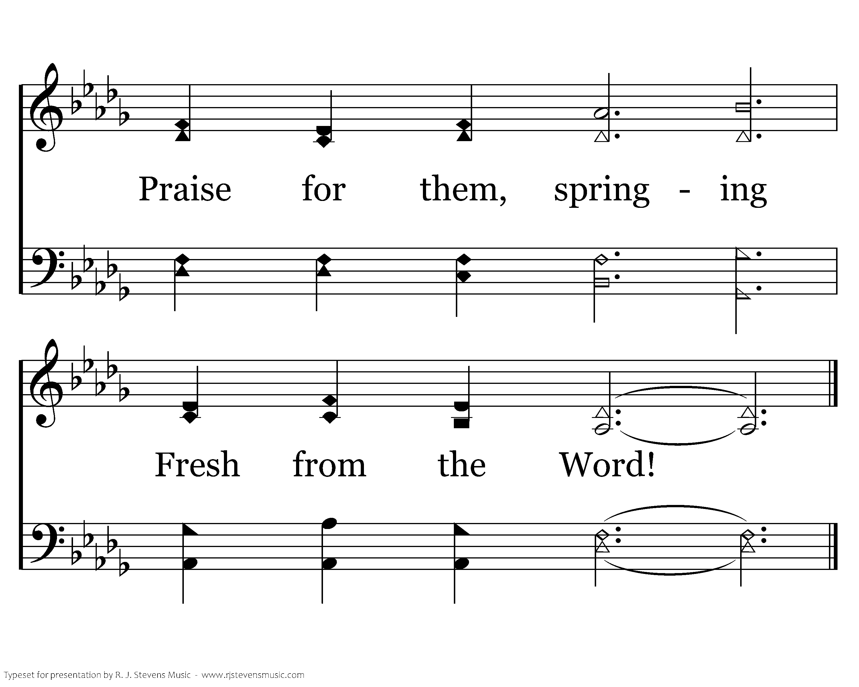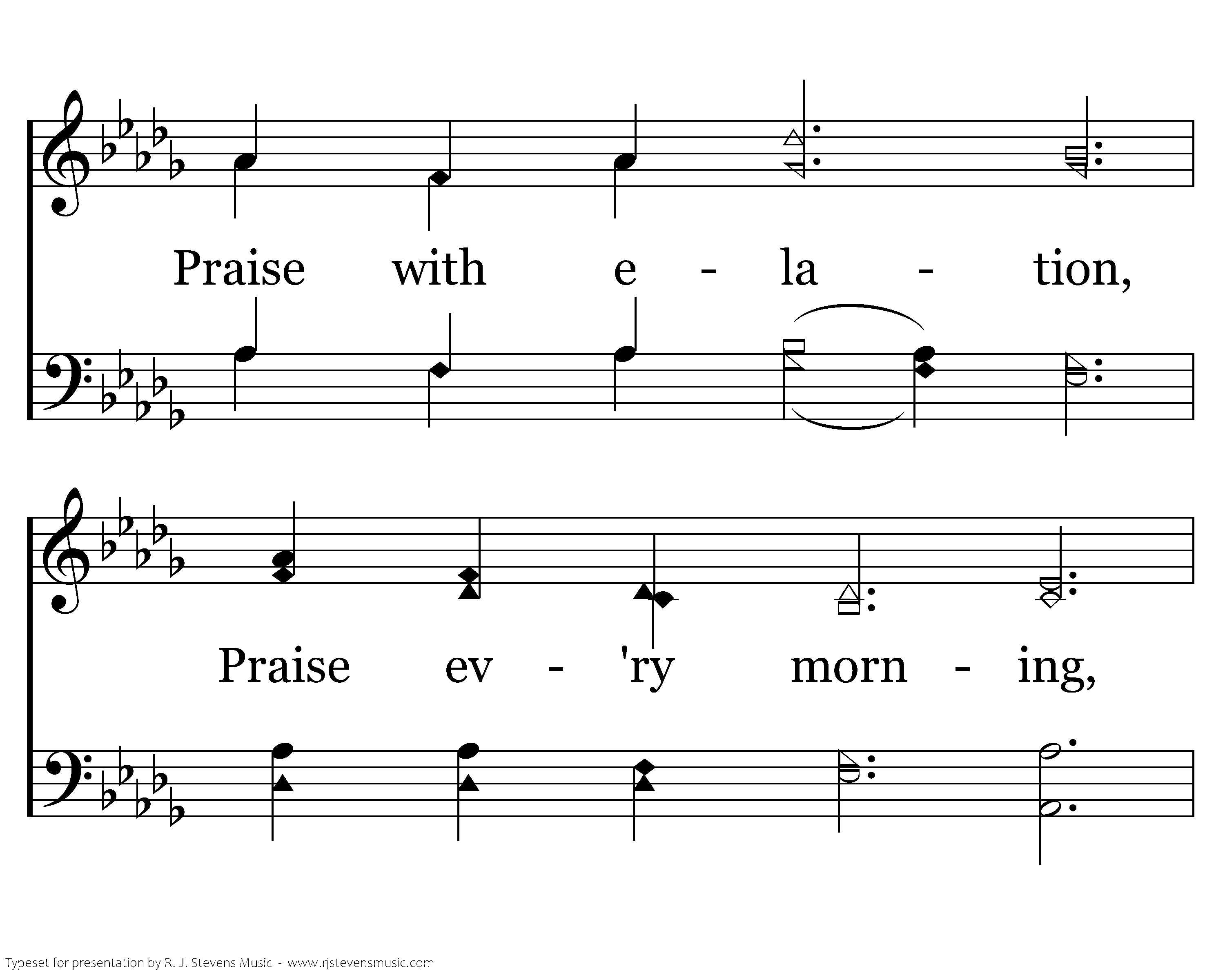 Mine is the sunlight! Mine is the morning Born of the one light Eden saw play! Praise with elation, Praise ev'ry morning, God's recreation Of the new day!