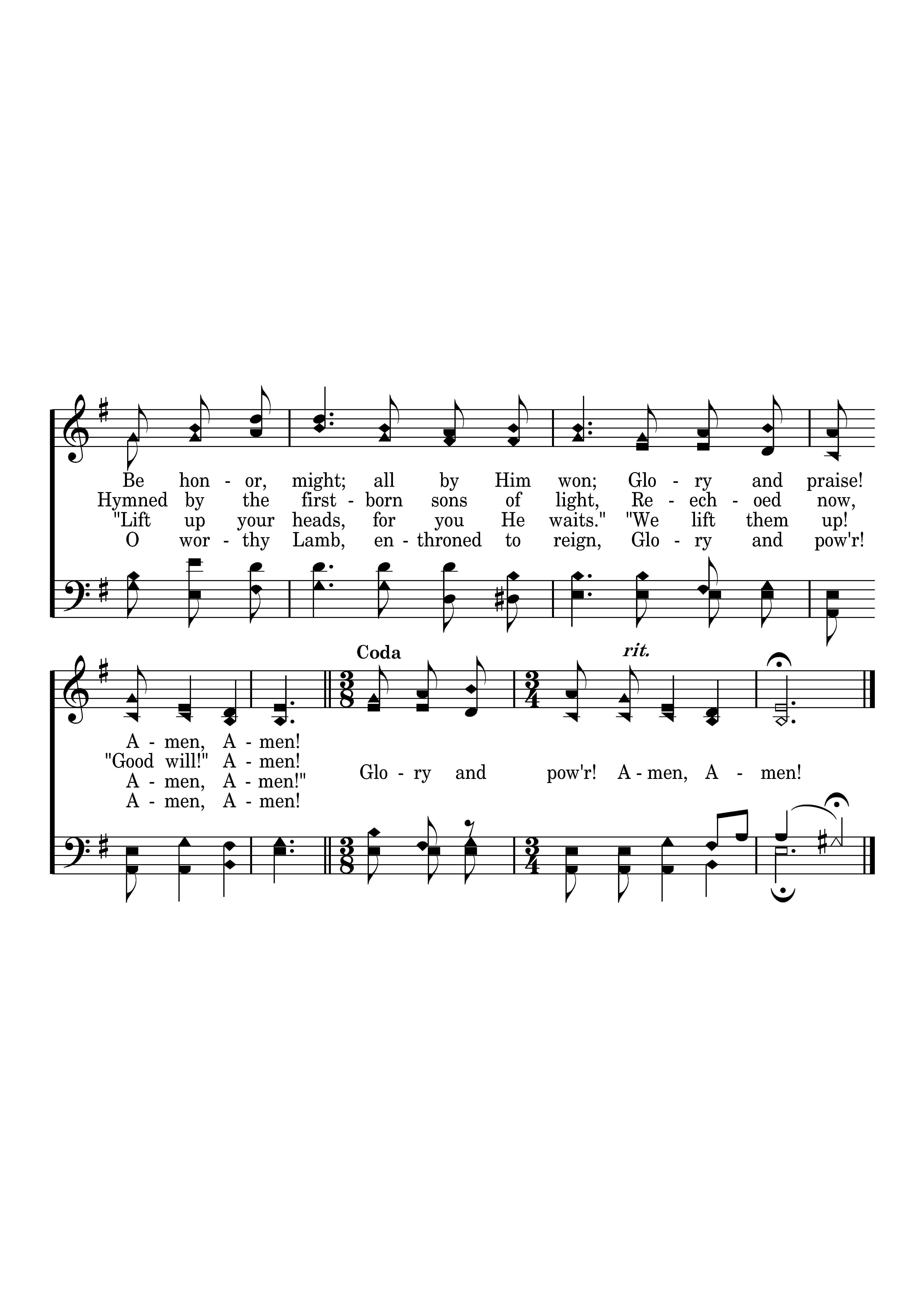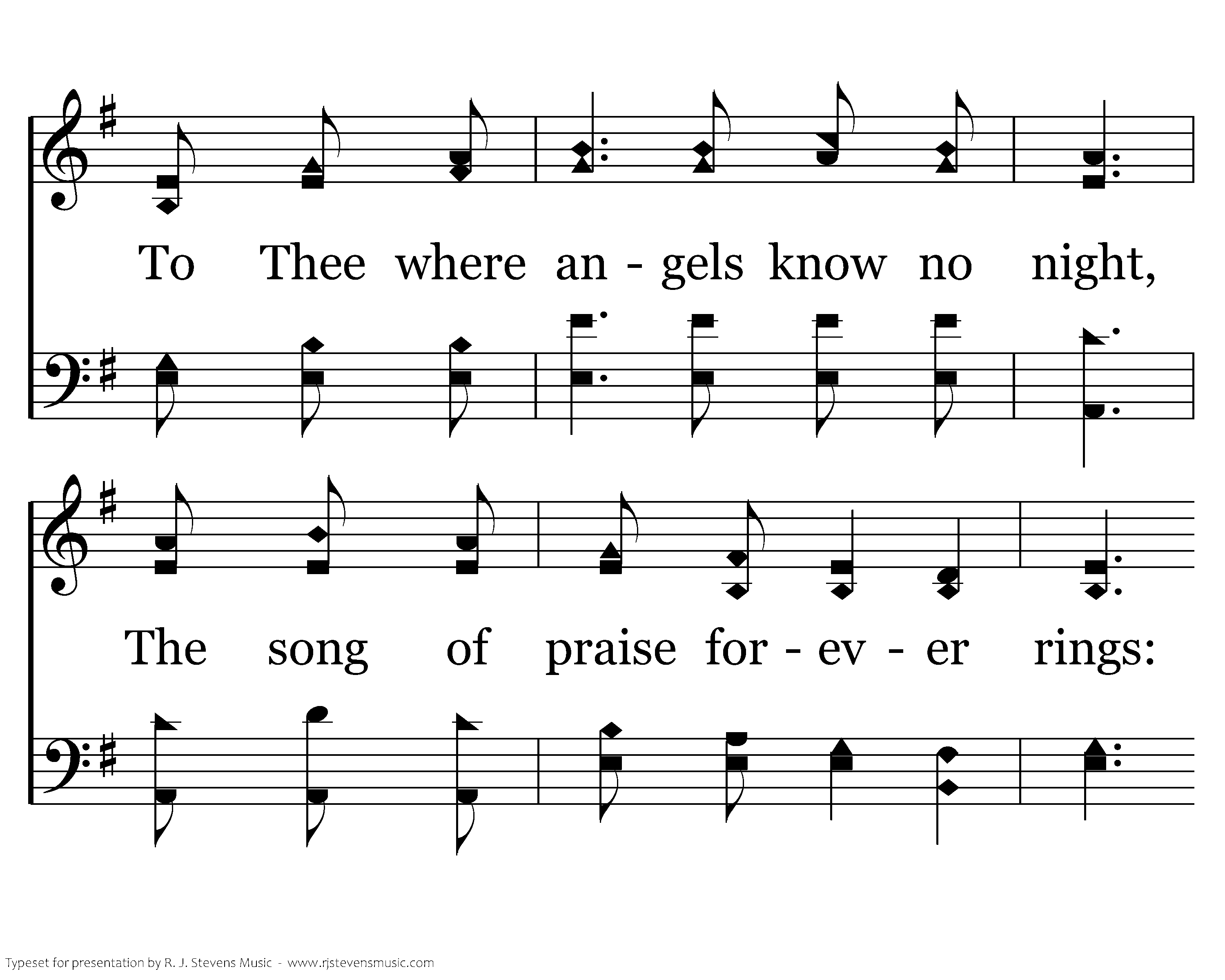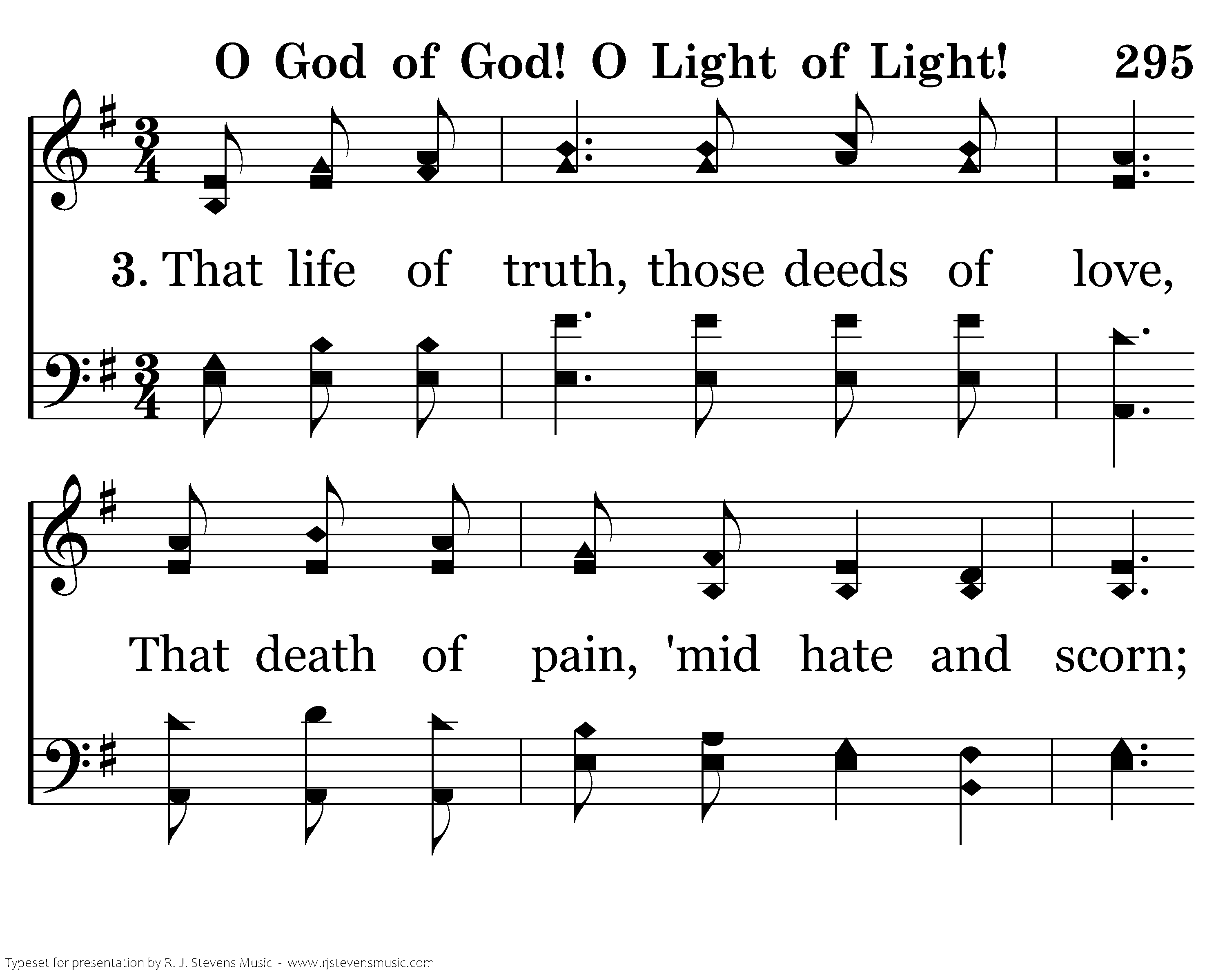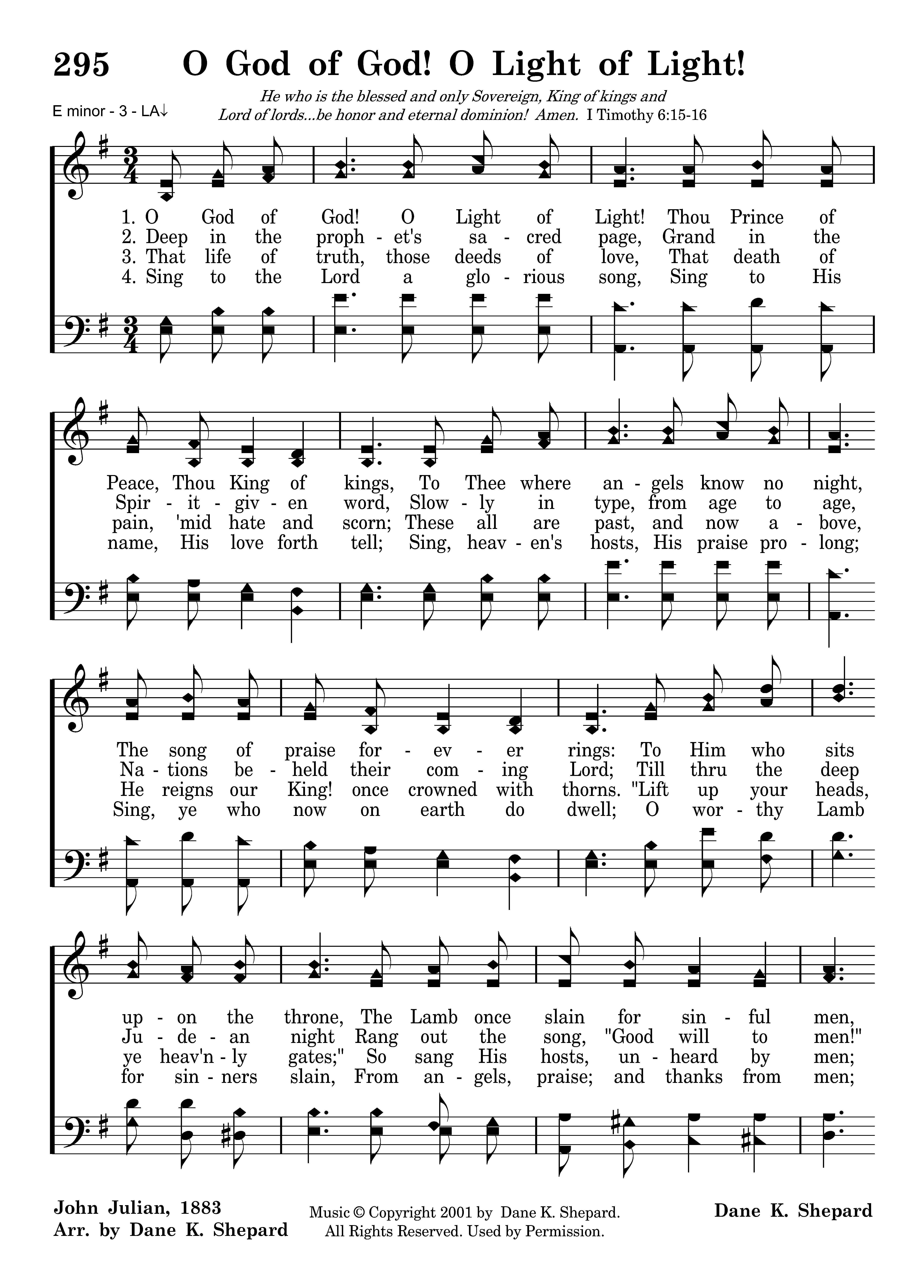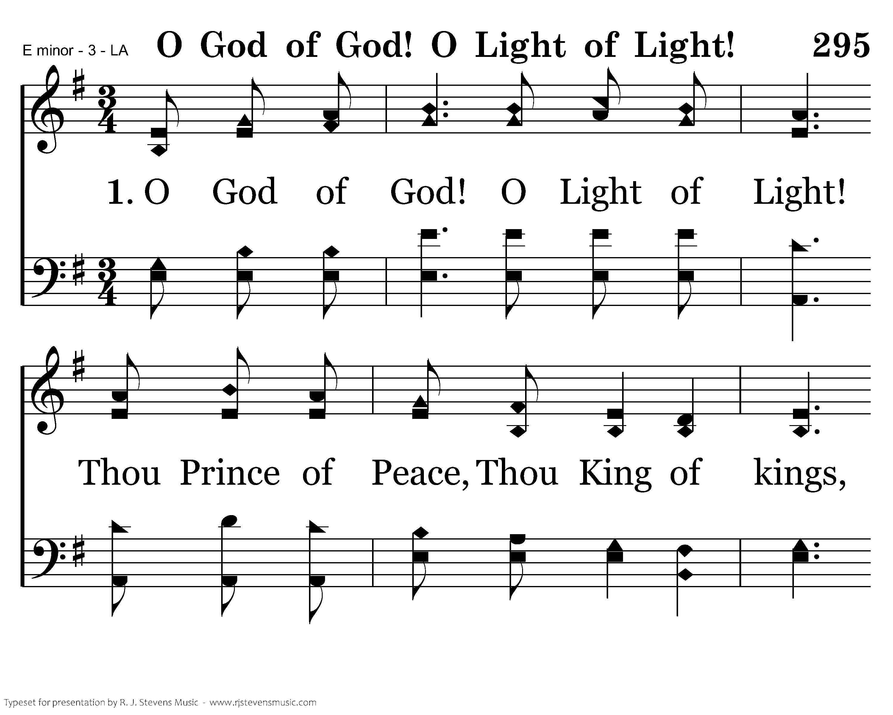 O God of God! O Light of Light! Thou Prince of Peace, Thou King of kings, To Thee where angels know no night, The song of praise forever rings: To Him who sits upon the throne, The Lamb once slain for sinful men, Be honor, might; all by Him won; Glory and praise! Amen, Amen!