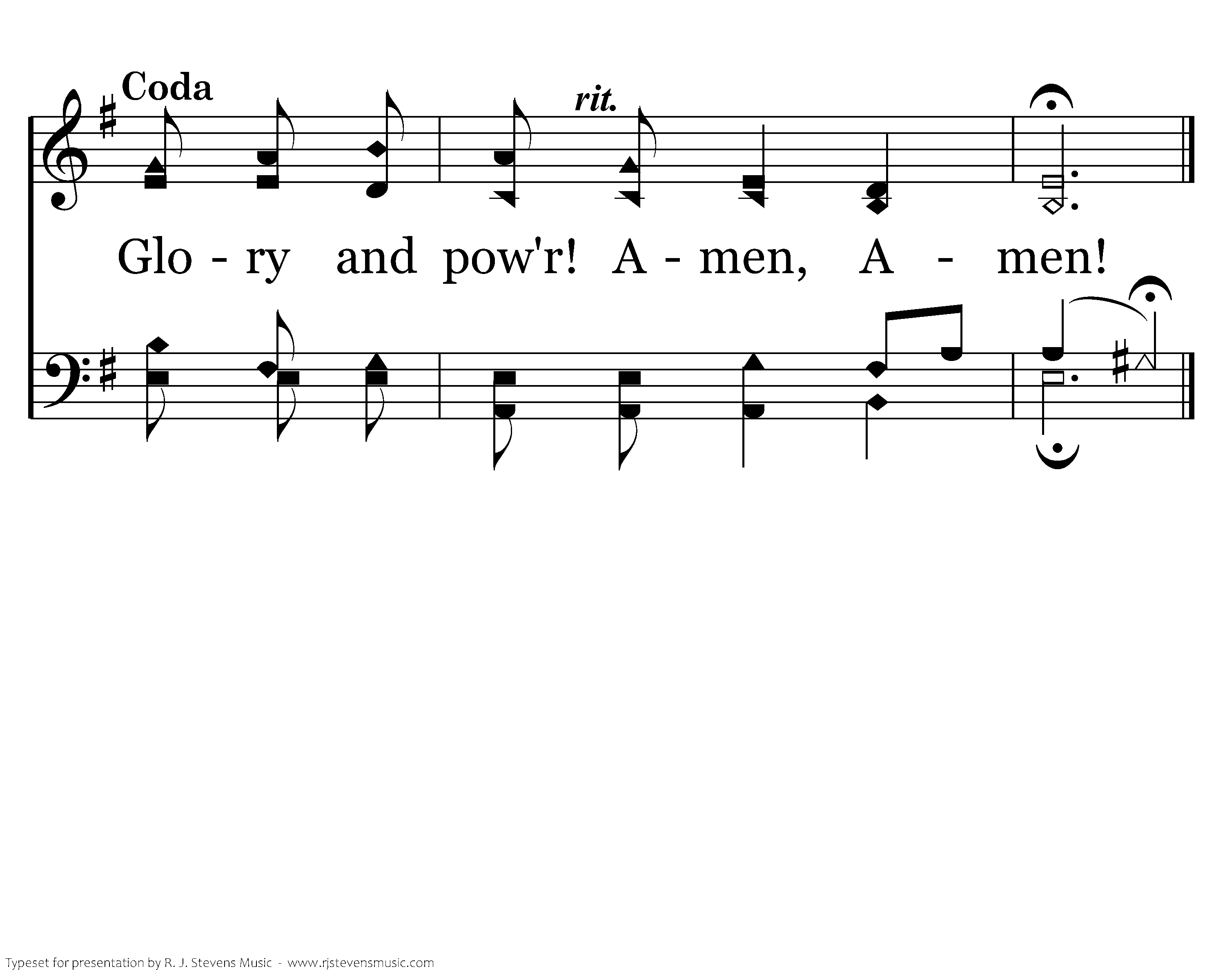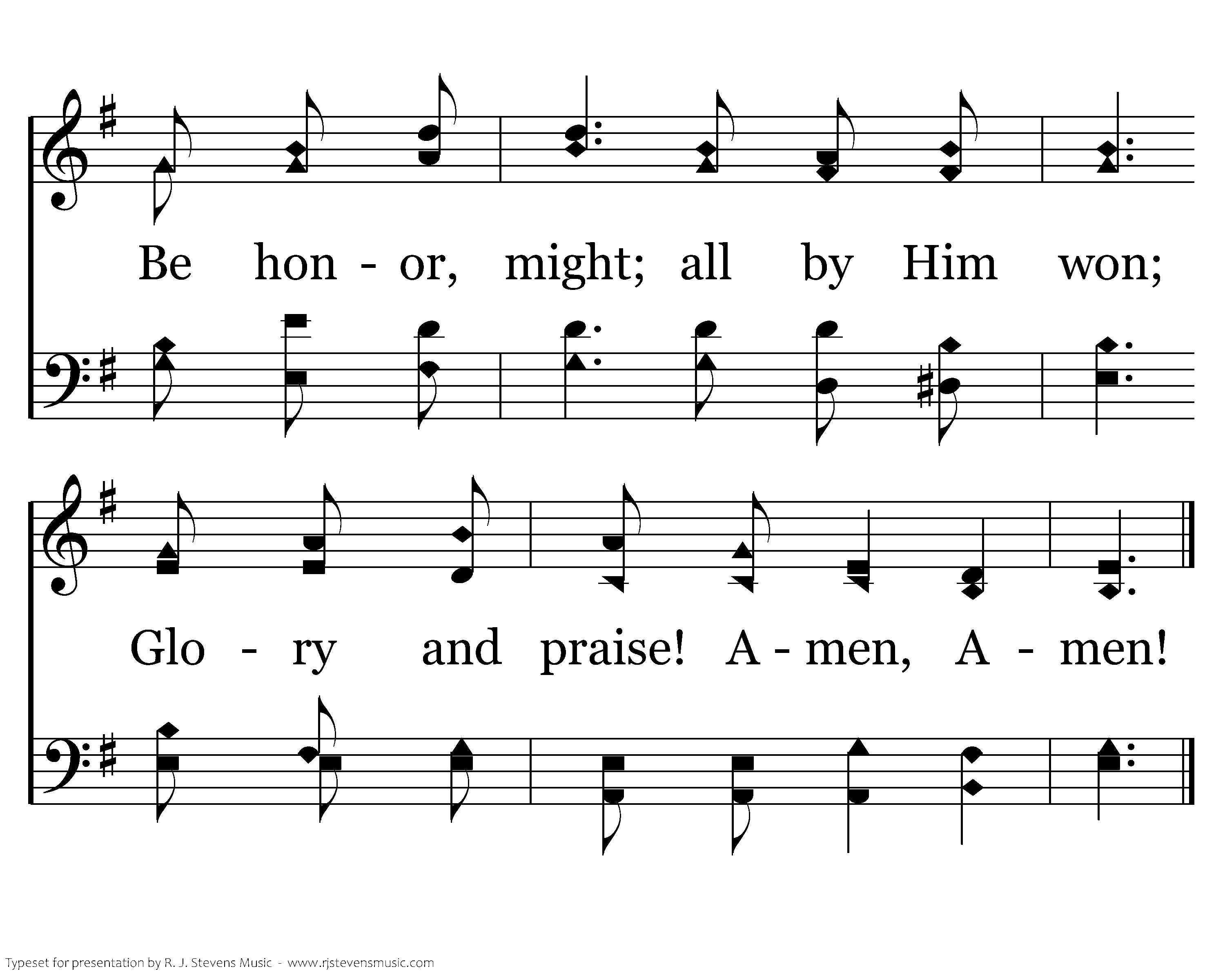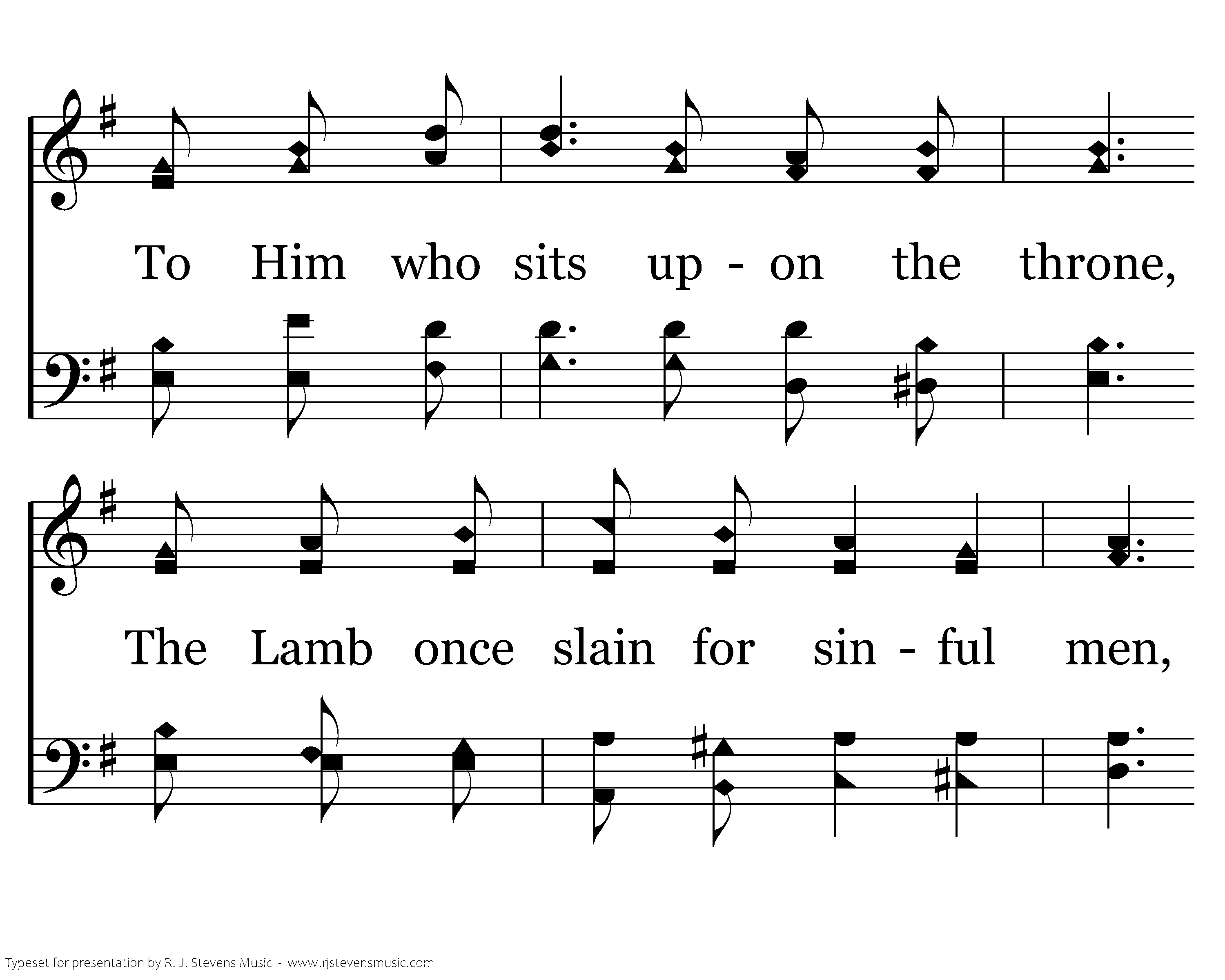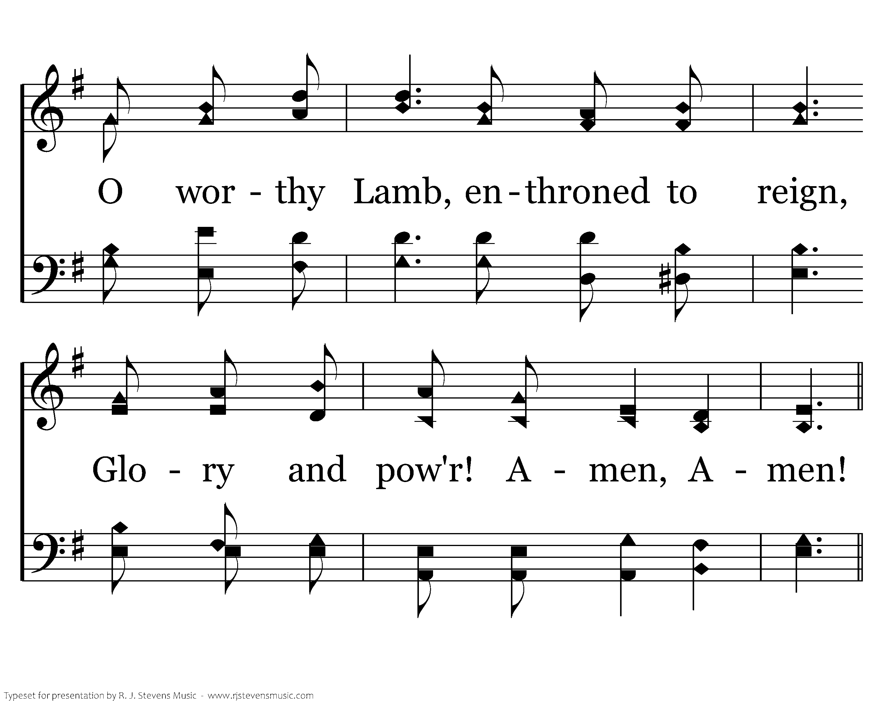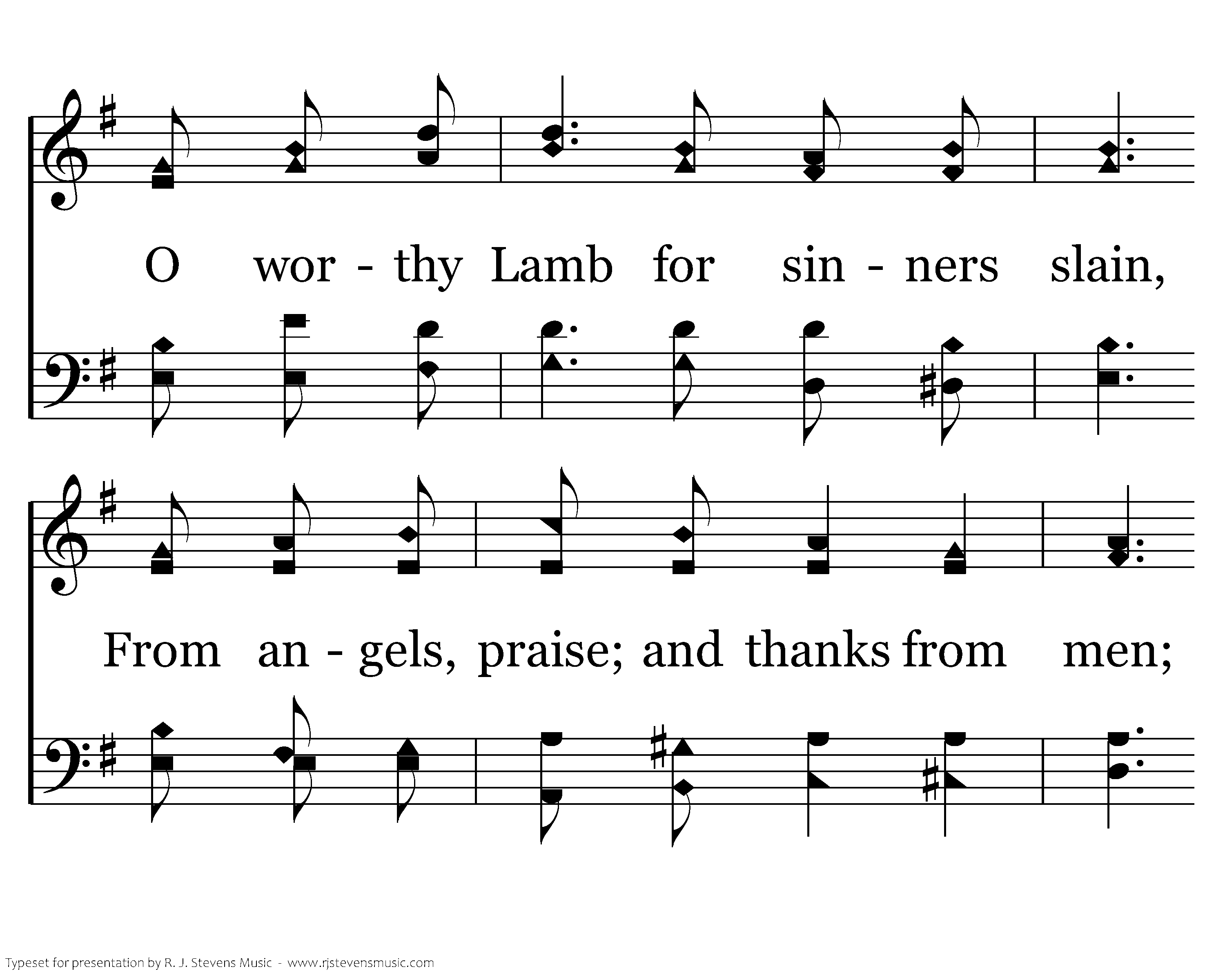 Sing to the Lord a glorious song, Sing to His name, His love forth tell; Sing, heaven's hosts, His praise prolong; Sing, ye who now on earth do dwell; O worthy Lamb for sinners slain, From angels, praise; and thanks from men; O worthy Lamb, enthroned to reign, Glory and pow'r! Amen, Amen!