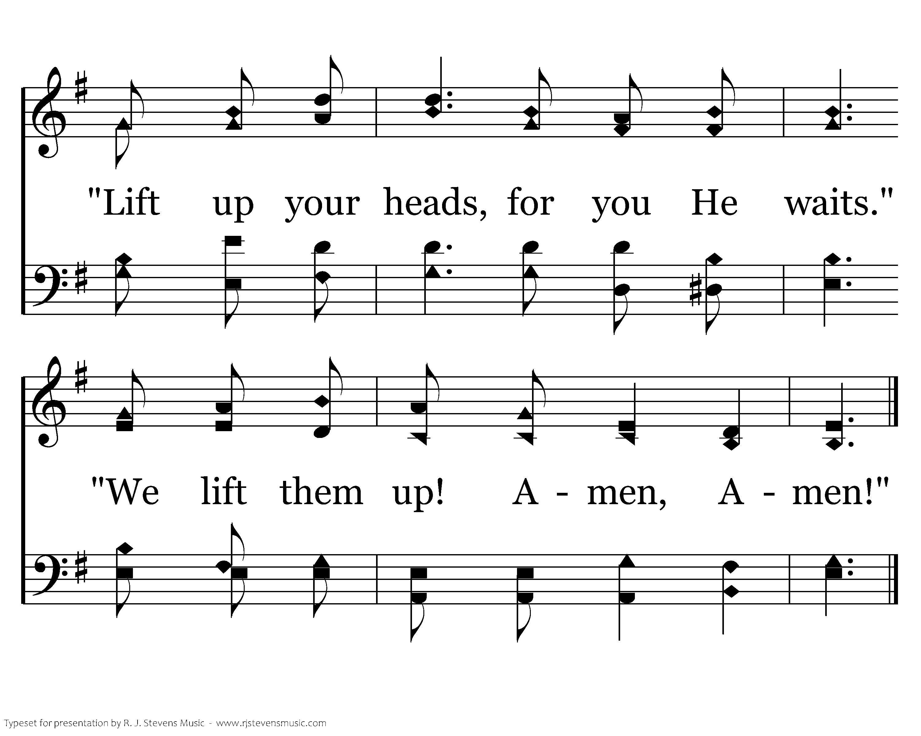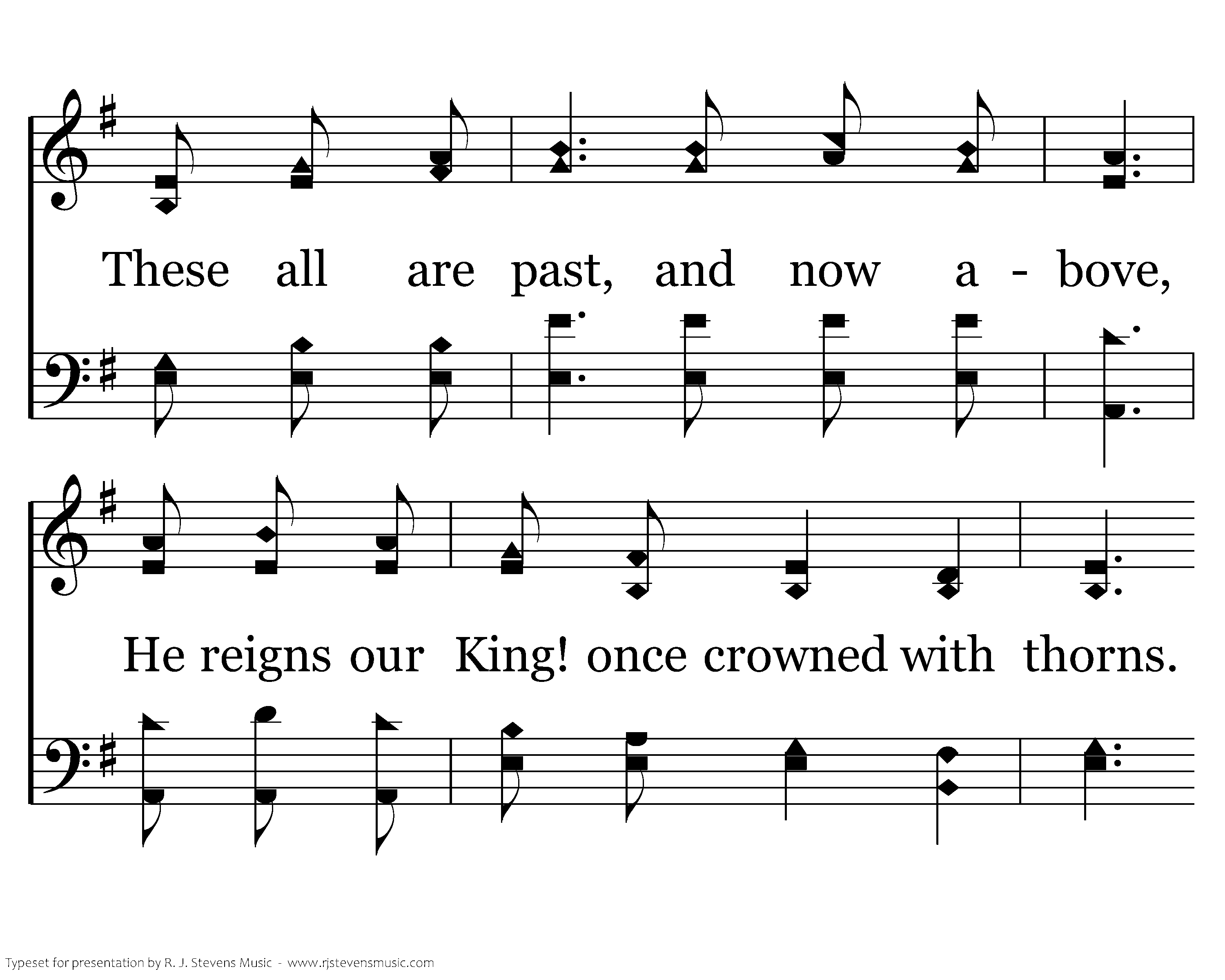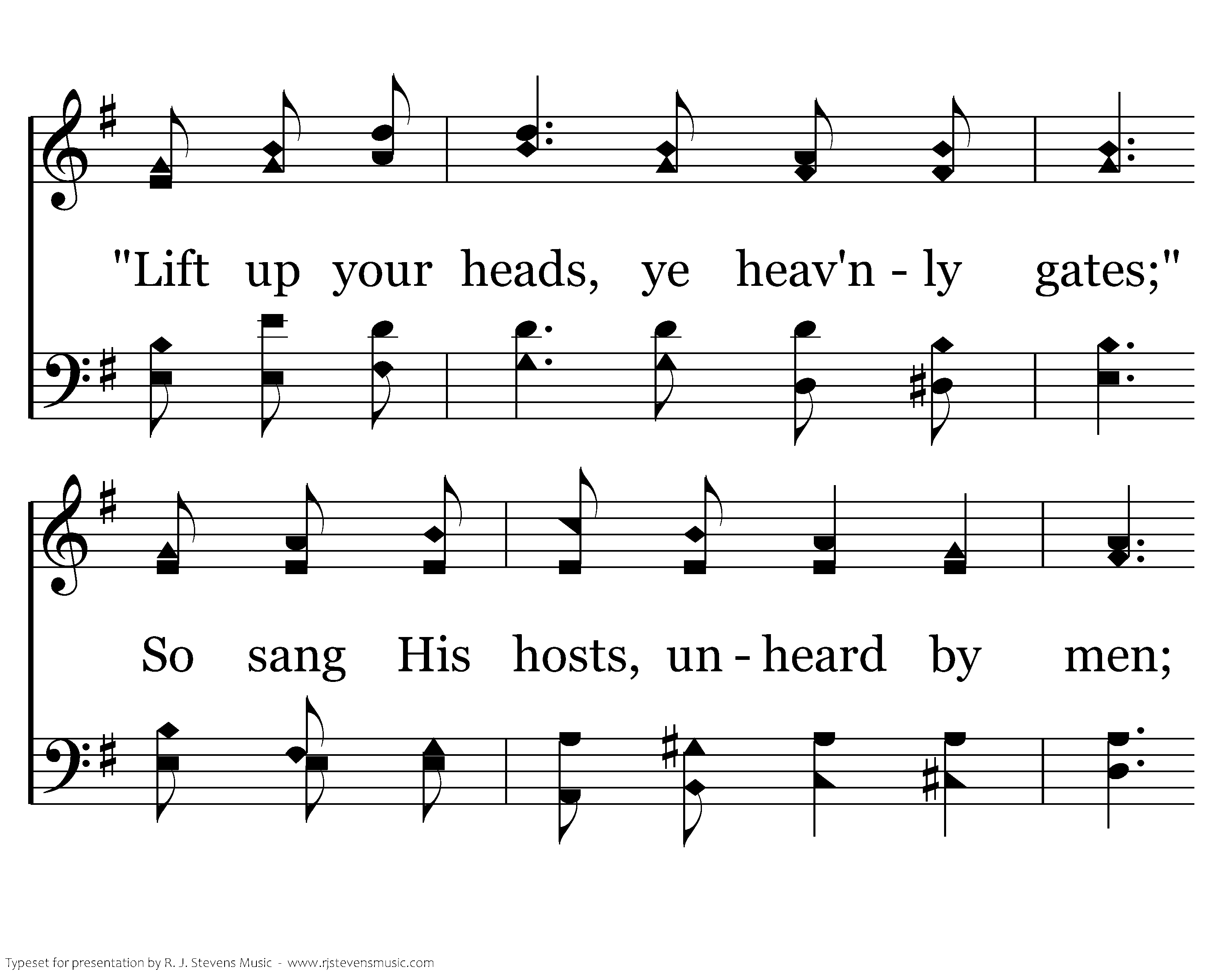 That life of truth, those deeds of love, That death of pain, 'mid hate and scorn; These all are past, and now above, He reigns our King! once crowned with thorns. "Lift up your heads, ye heav'nly gates;" So sang His hosts, unheard by men; "Lift up your heads, for you He waits." "We lift them up! Amen, Amen!"