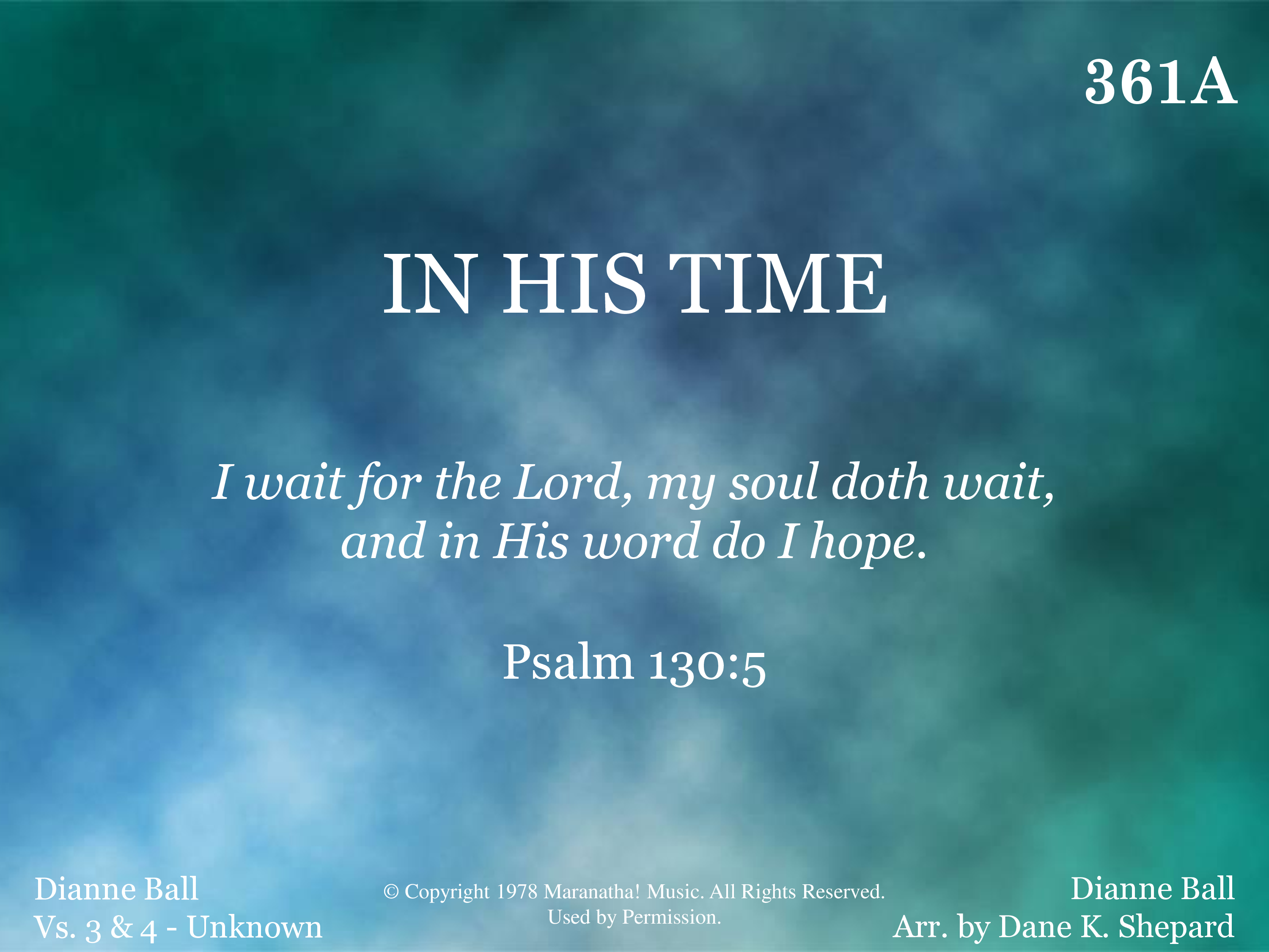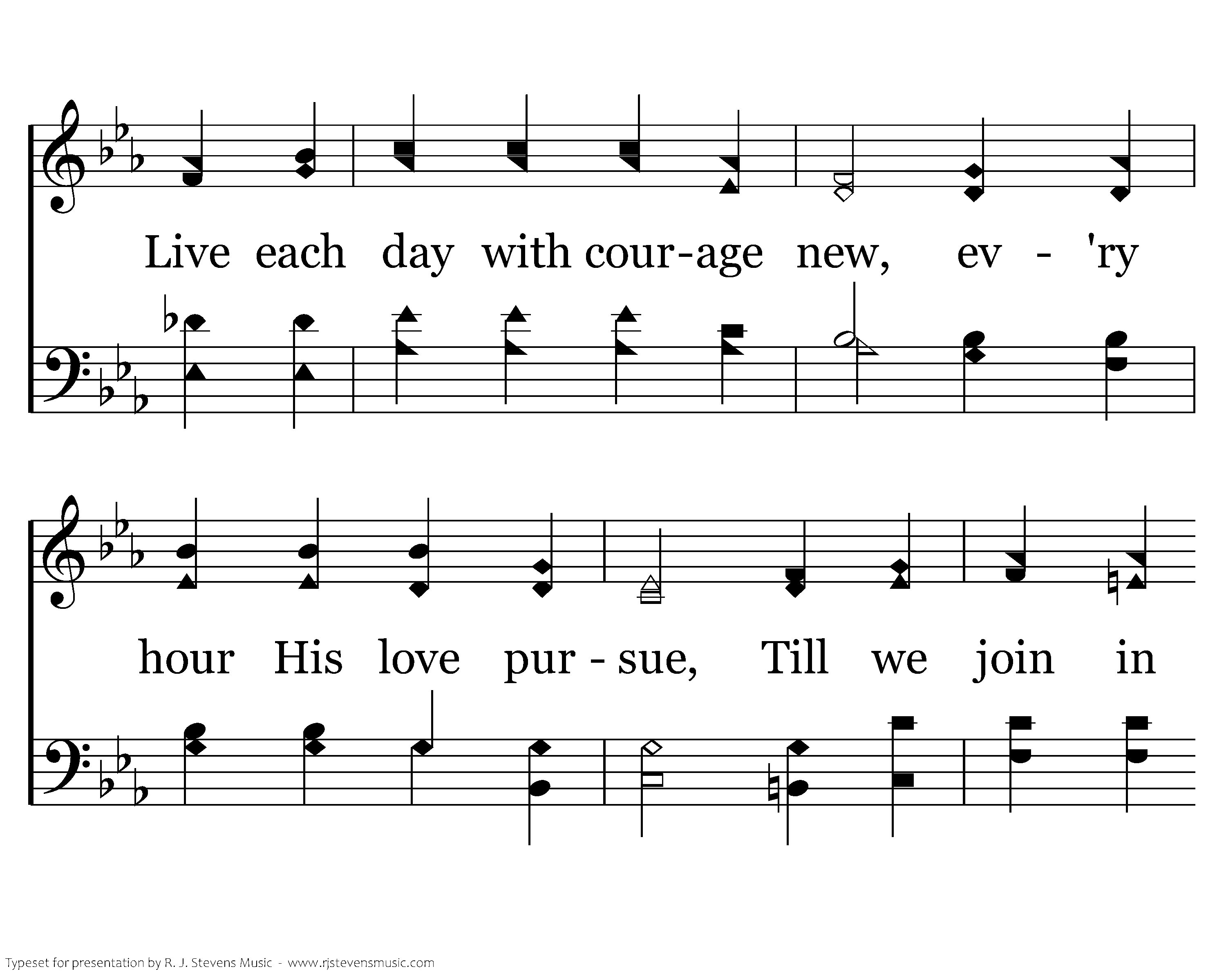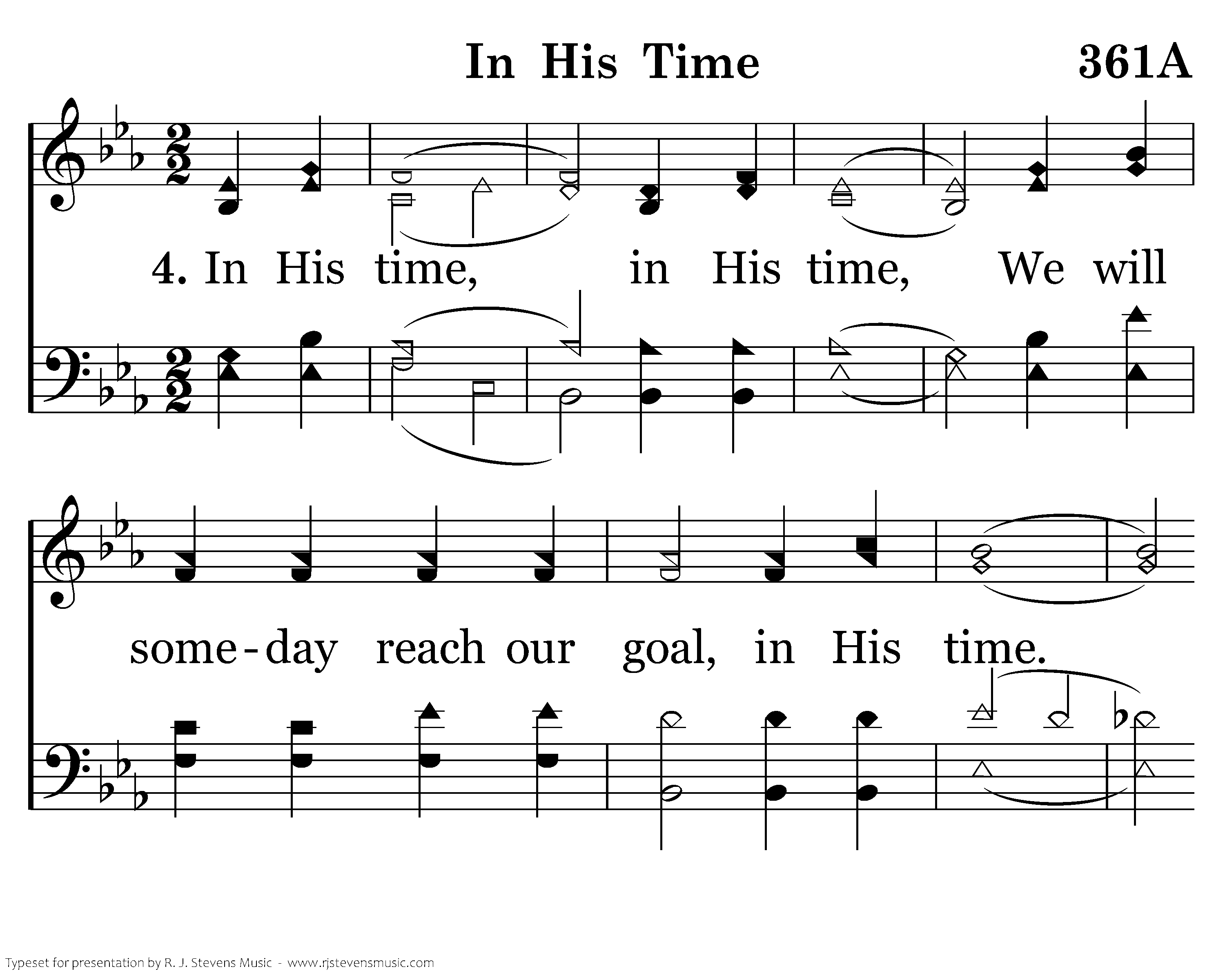 In His time, in His time, We will someday reach our goal, in His time. Live each day with courage new, ev'ry hour His love pursue, 'Till we join in heav'n anew, in His time.