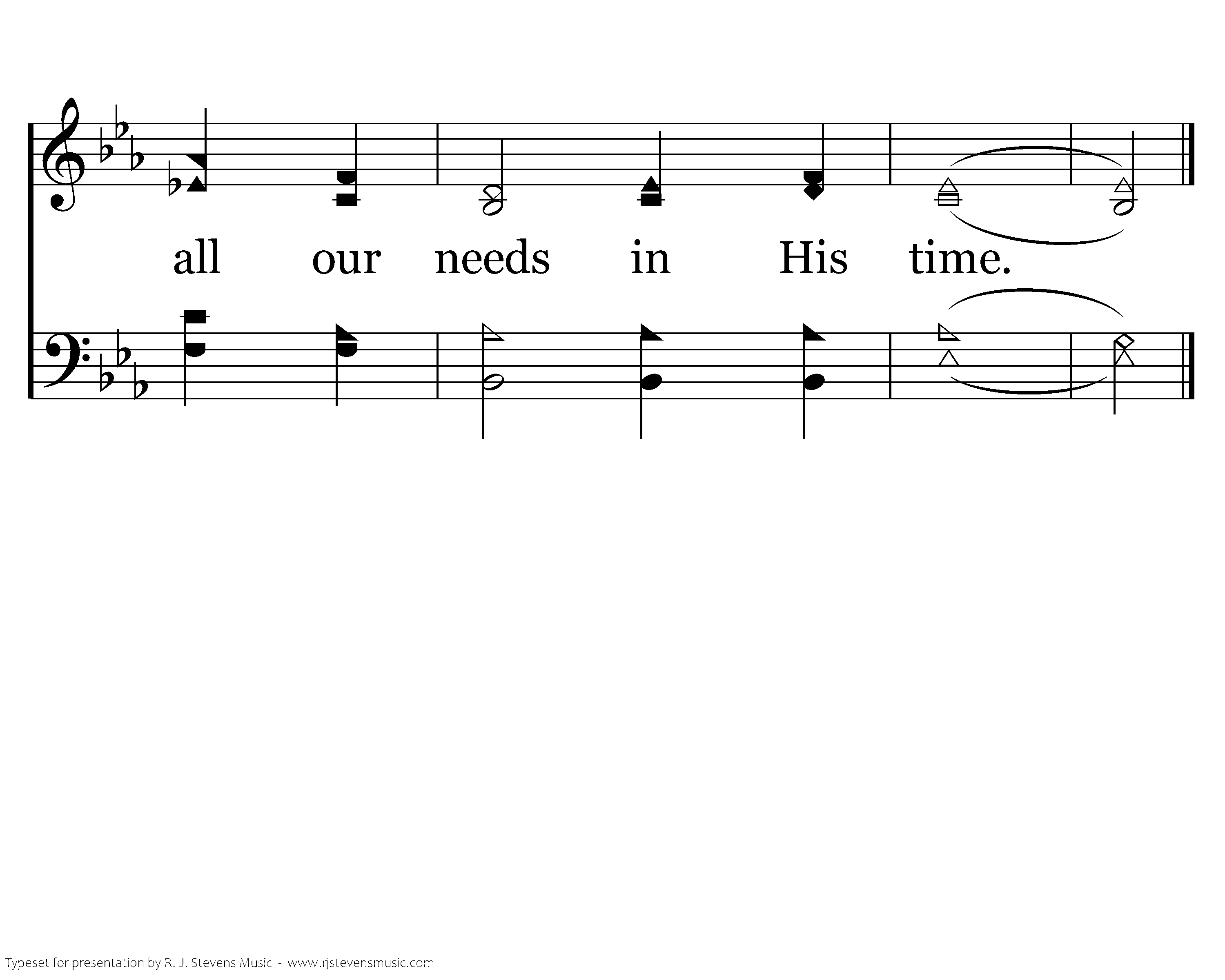 In His time, in His time, He will answer all our pray'rs, in His time. Tho' the answer may not be what you think that it should be; He will answer all our needs in His time.