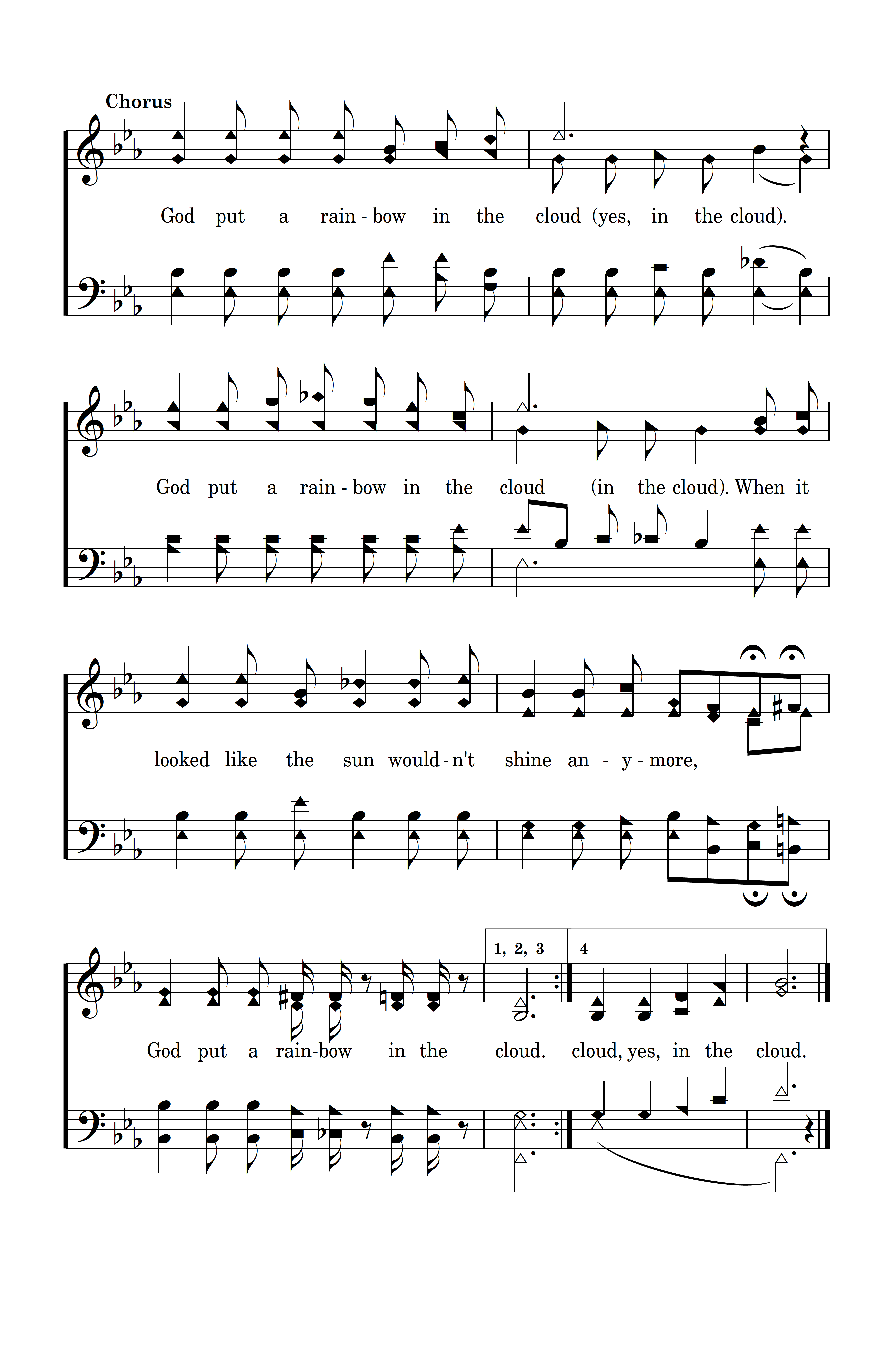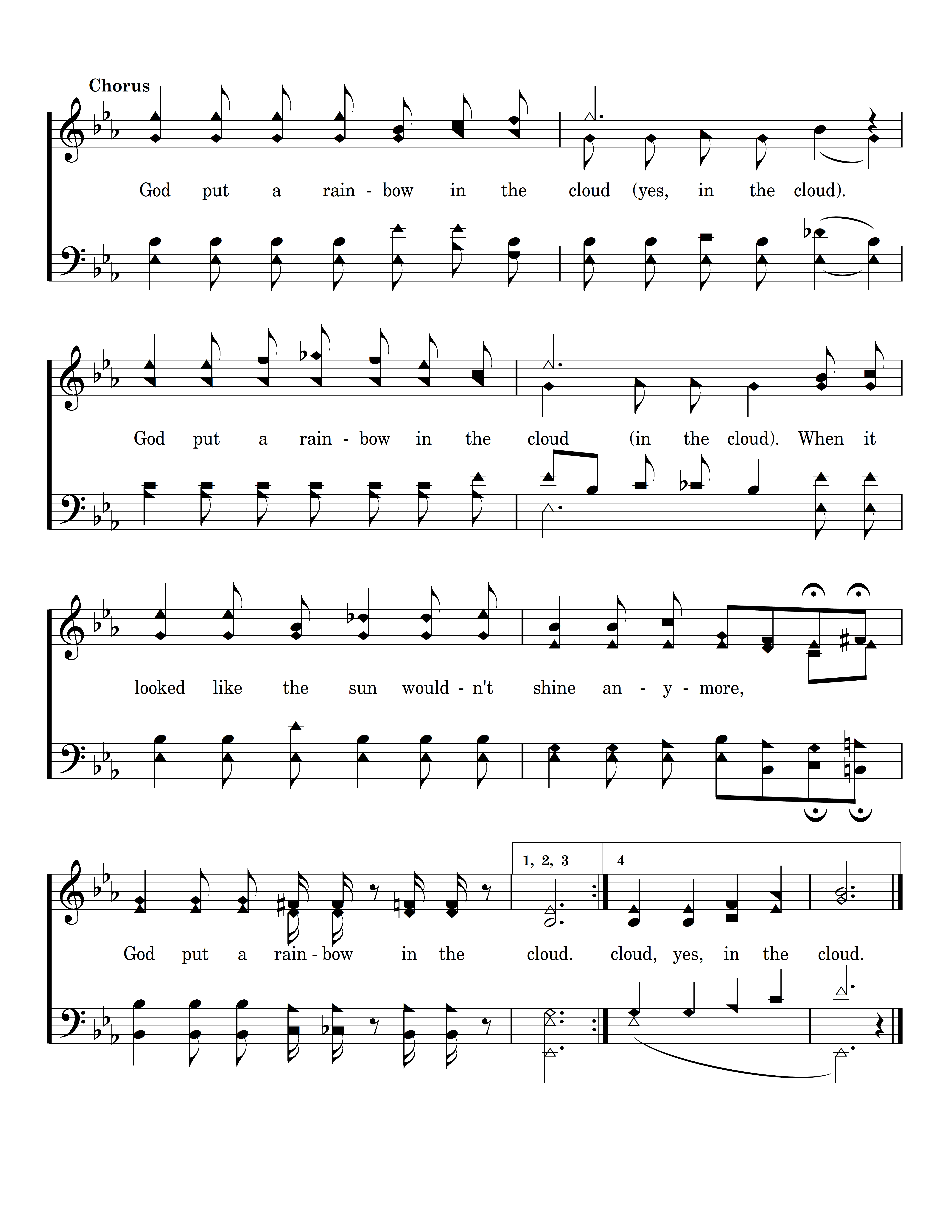 Away down yonder in Egypt's sand, God put a rainbow in the cloud. Just to lead His chldren to the promised land, God put a rainbow in the cloud. God put a rainbow in the cloud. God put a rainbow in the cloud. When it looked like the sun wouldn't shine anymore, God put a rainbow in the cloud.
