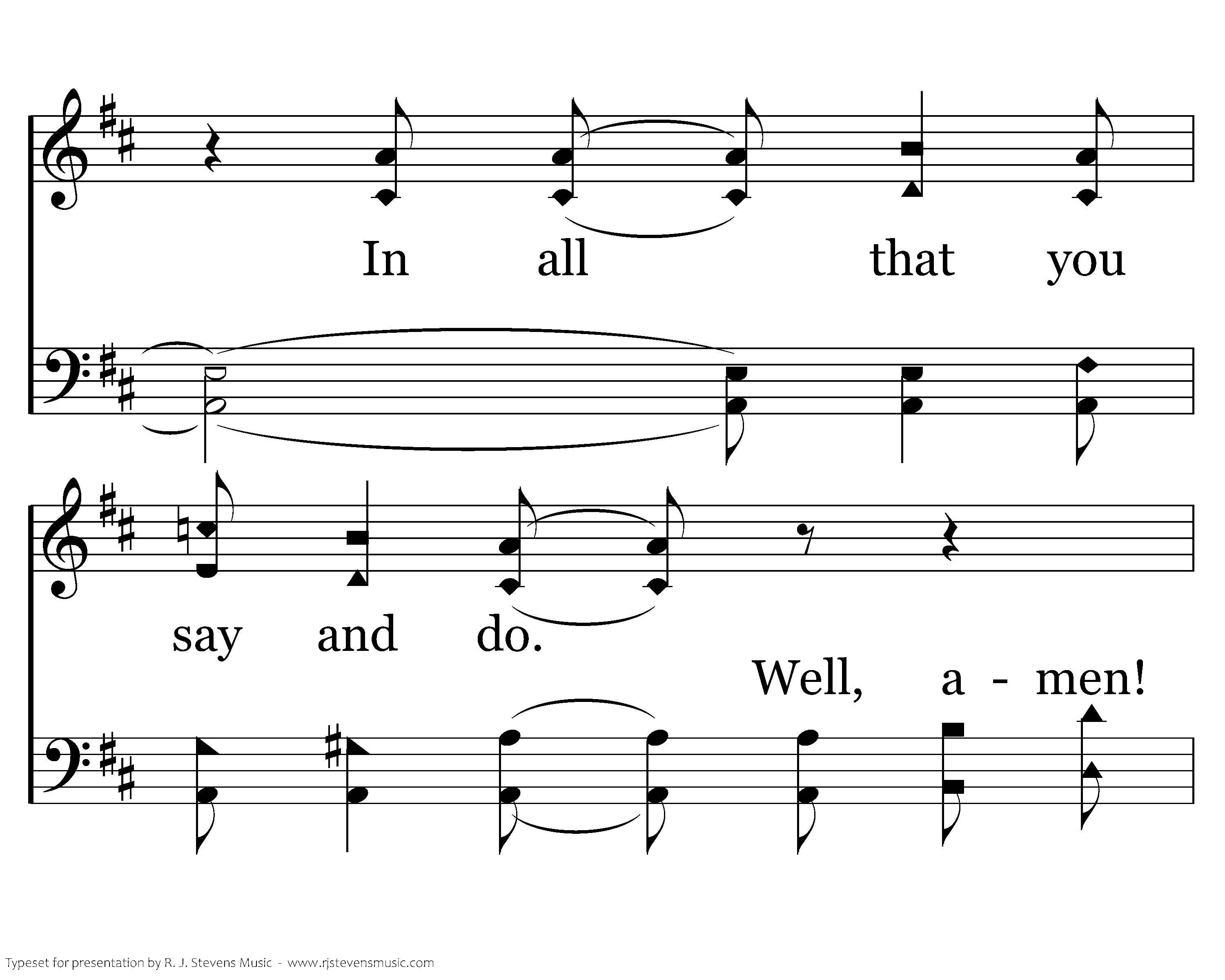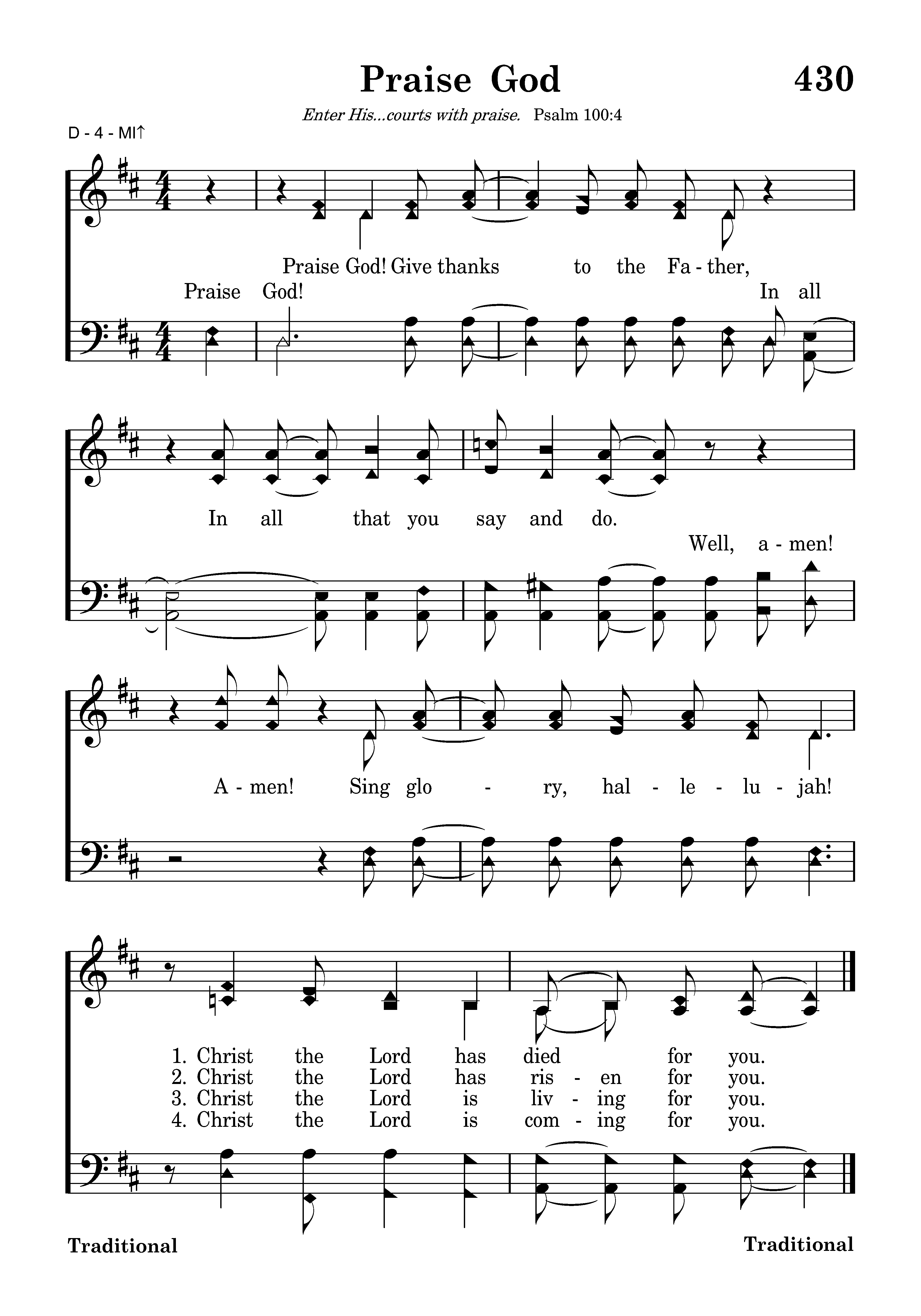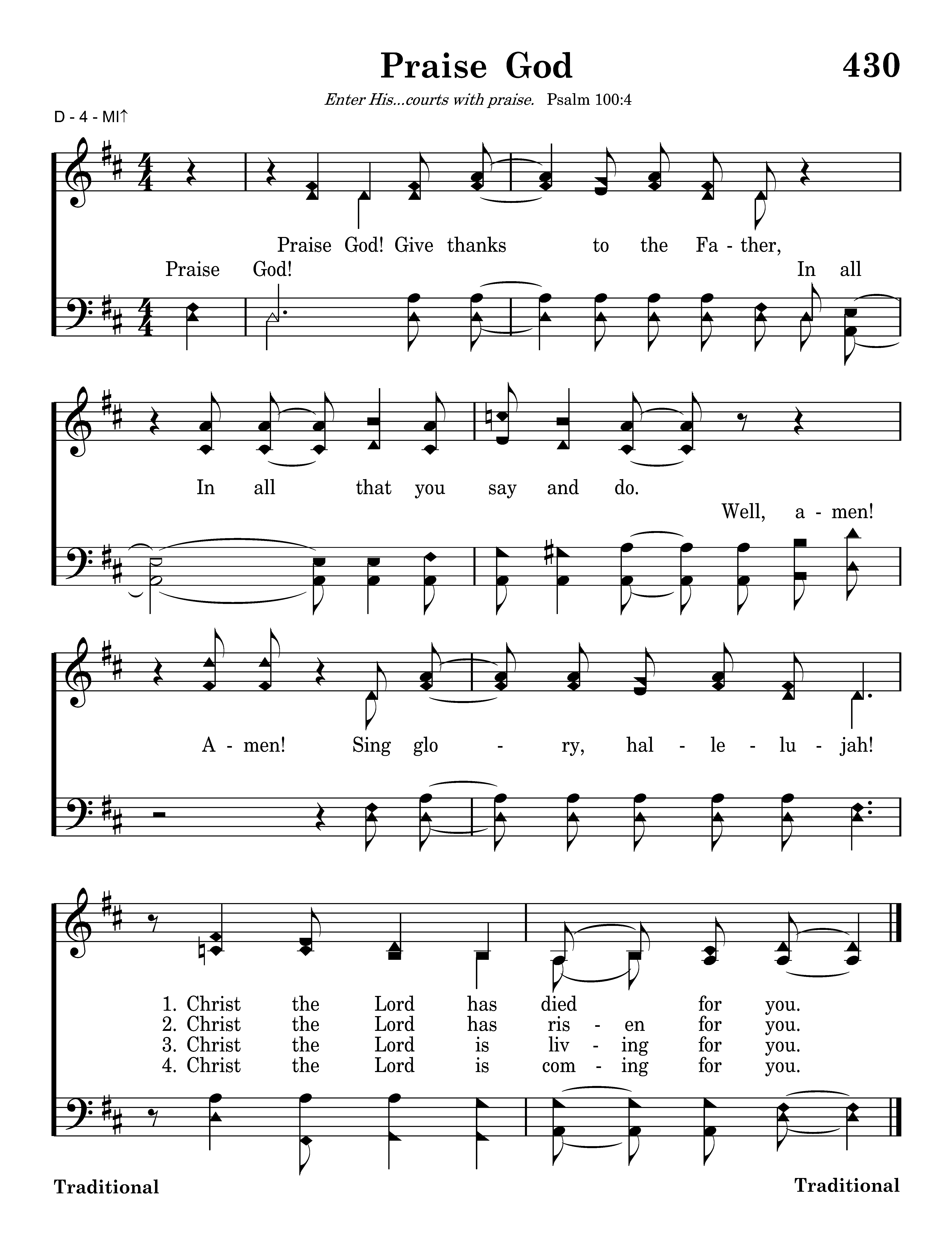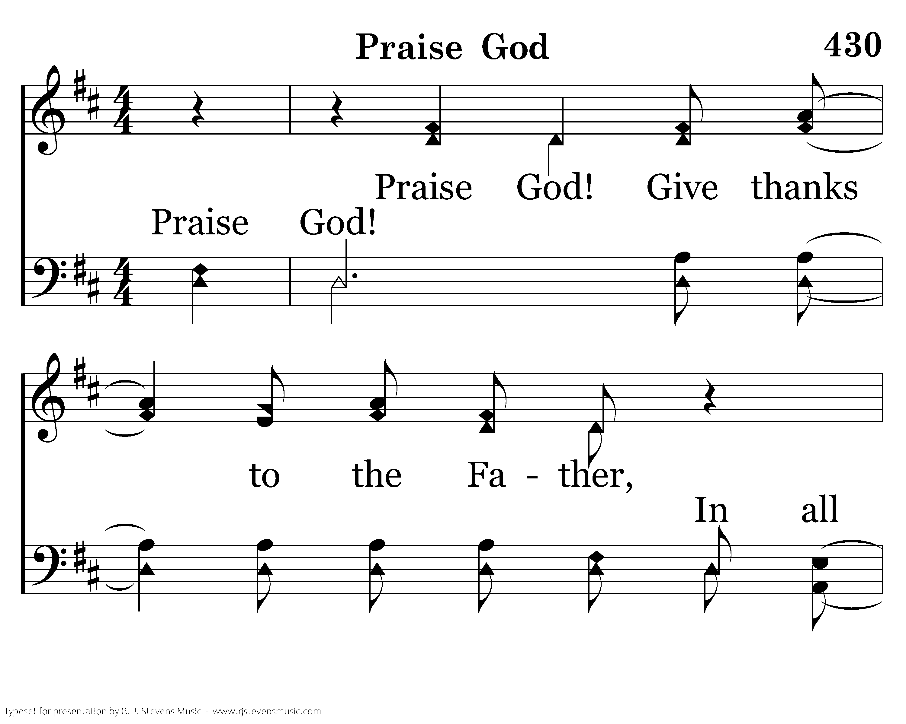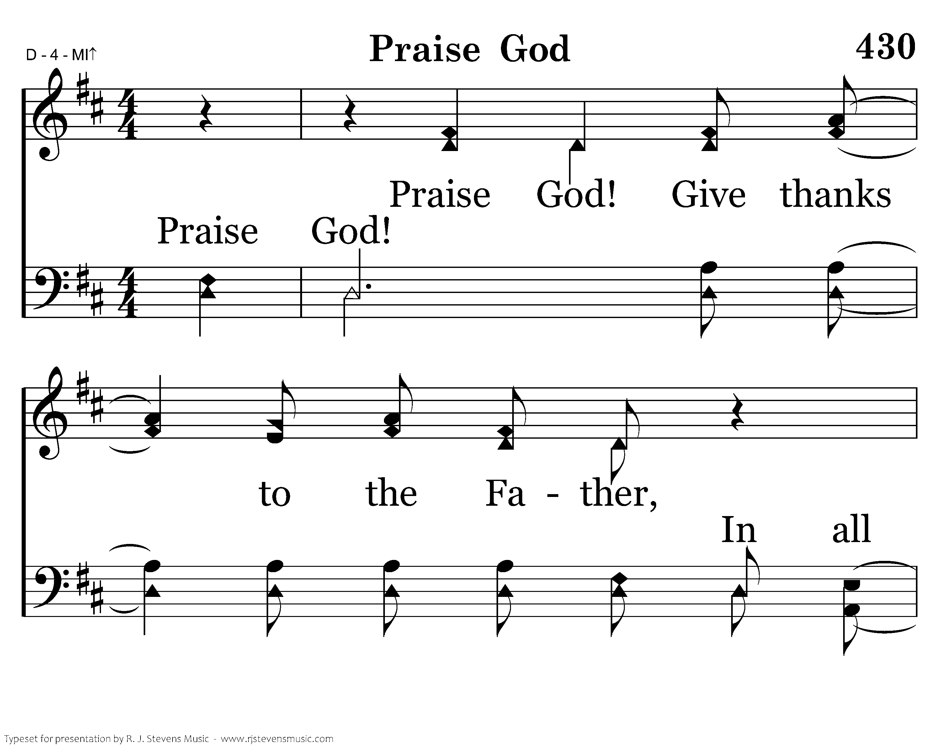 Praise God! Praise God! Give thanks to the Father In all, In all that you say and do. Well, amen! Amen! Sing glory, hallelujah! Christ the Lord has died for you.
