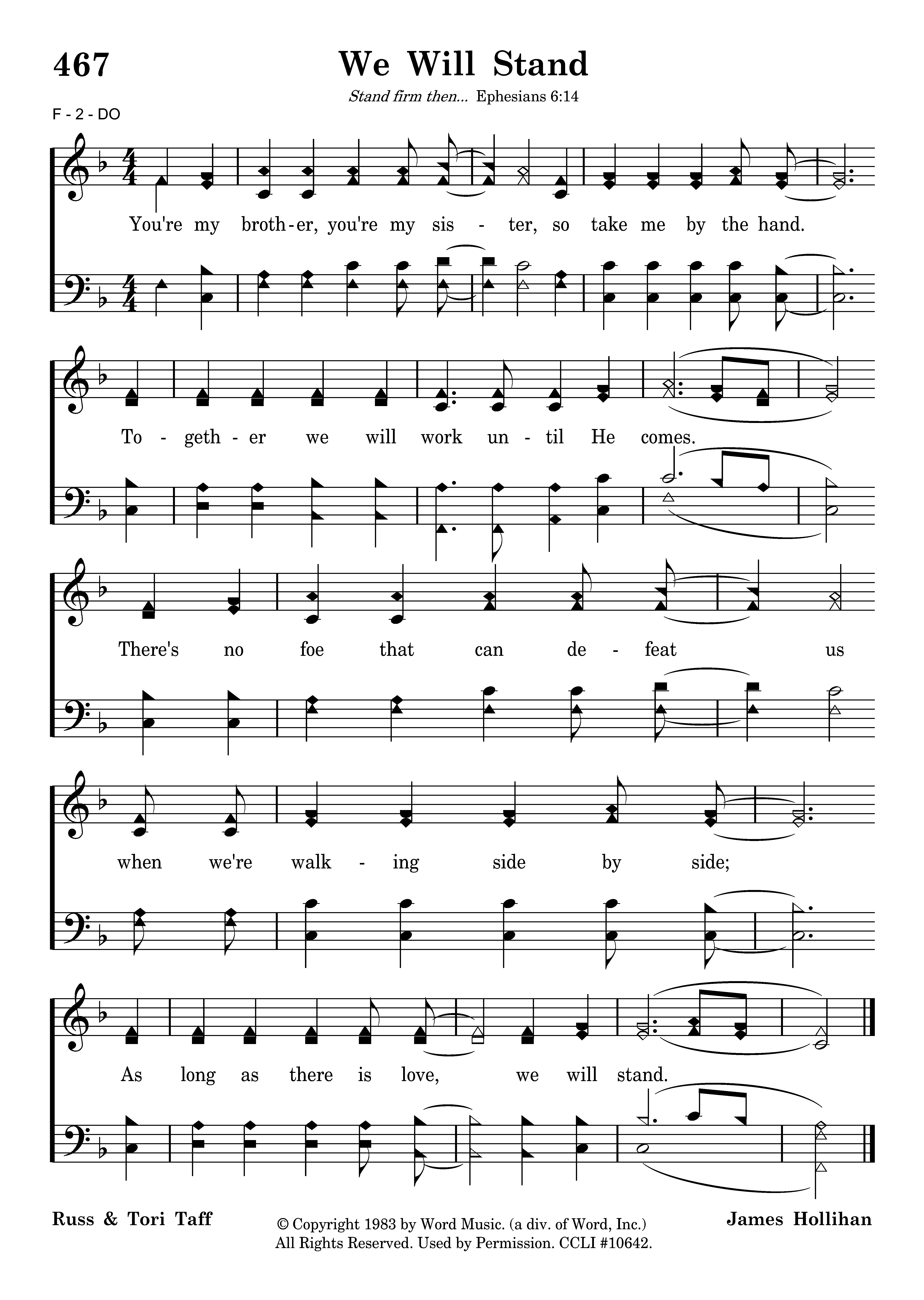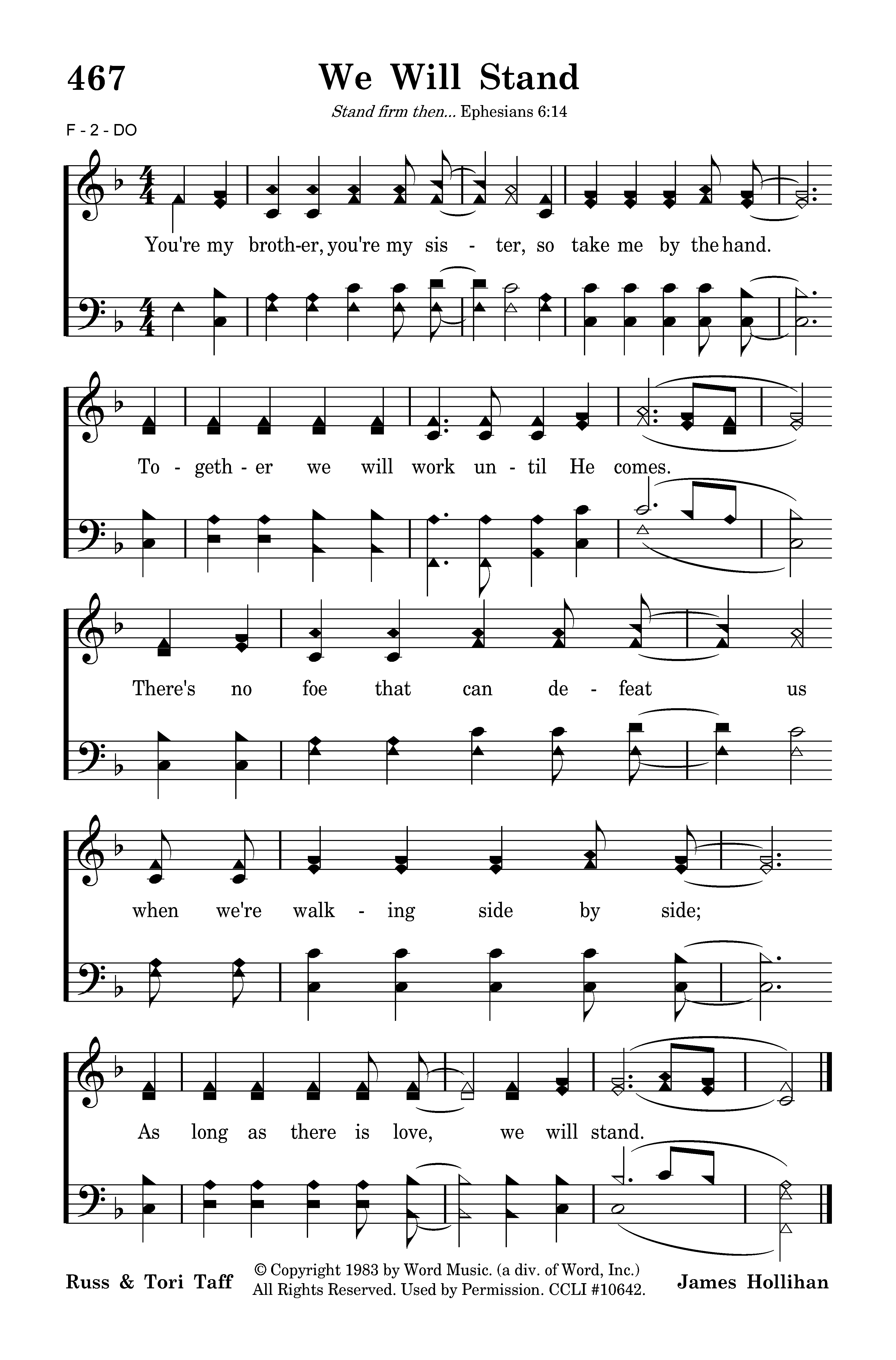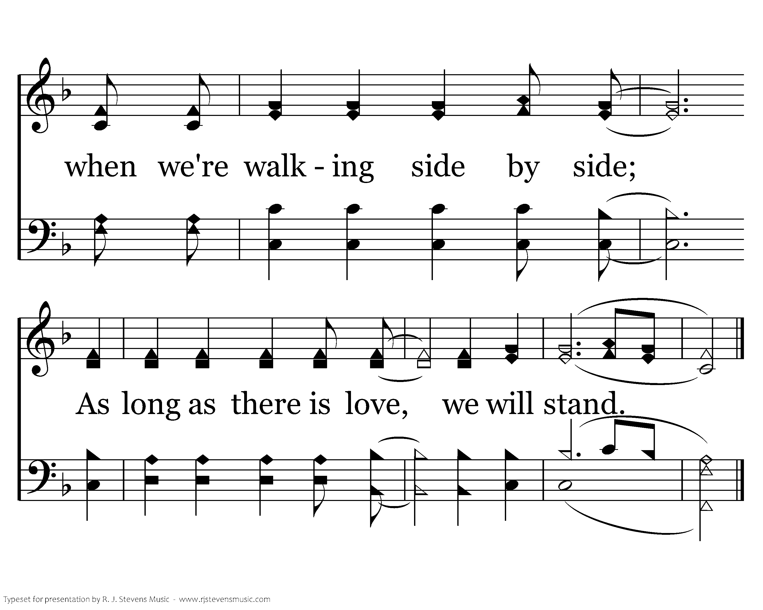 You're my brother, you're my sister, so take me by the hand. Together we will work until He comes. There's no foe that can defeat us when we're walking side by side; As long as there is love, we will stand.