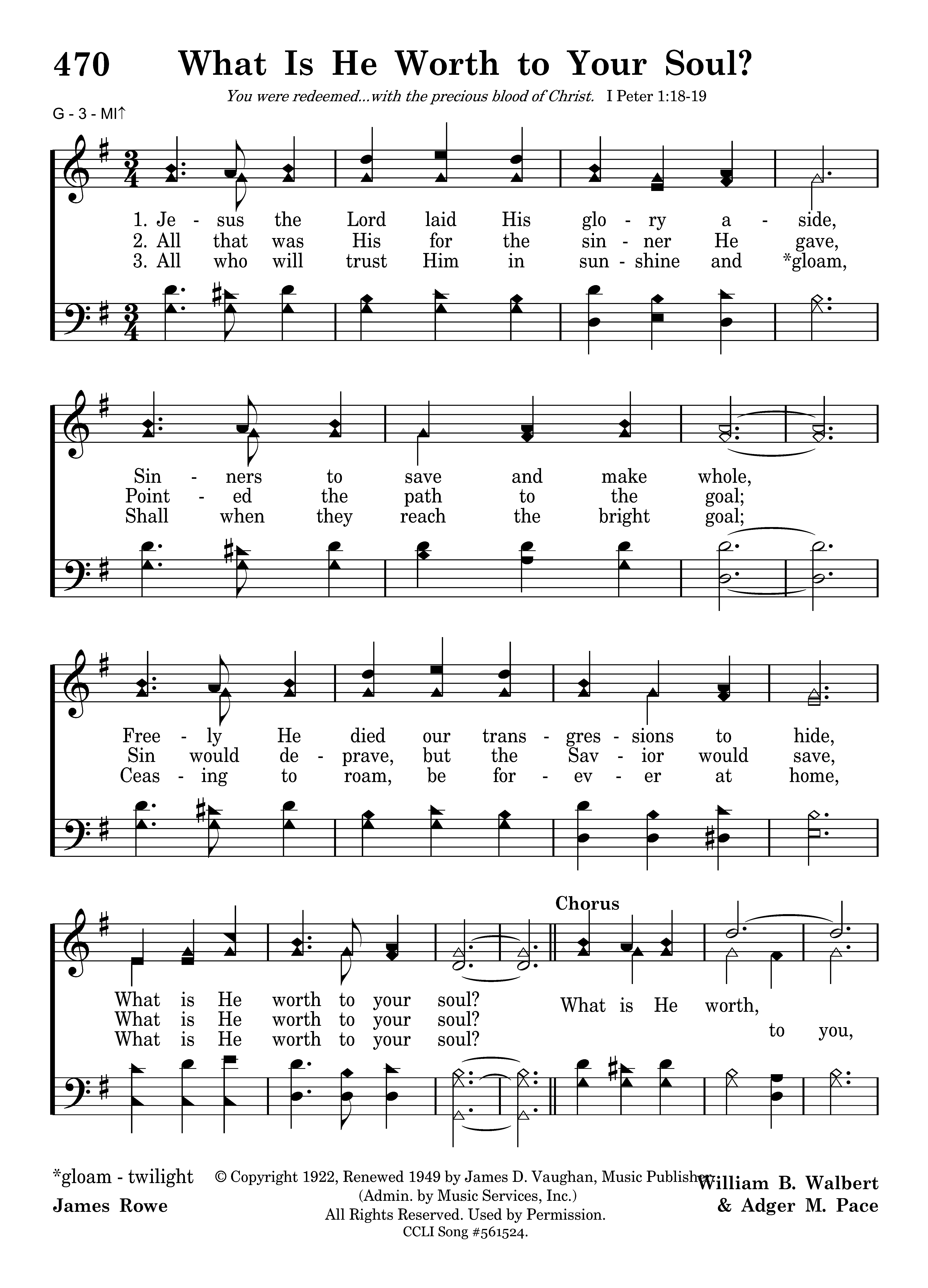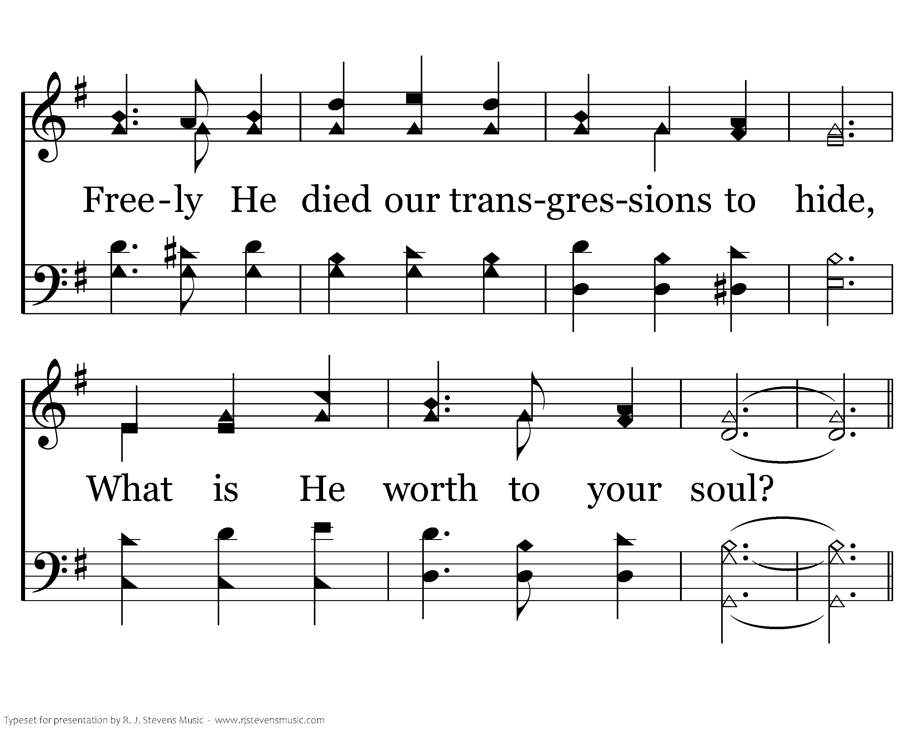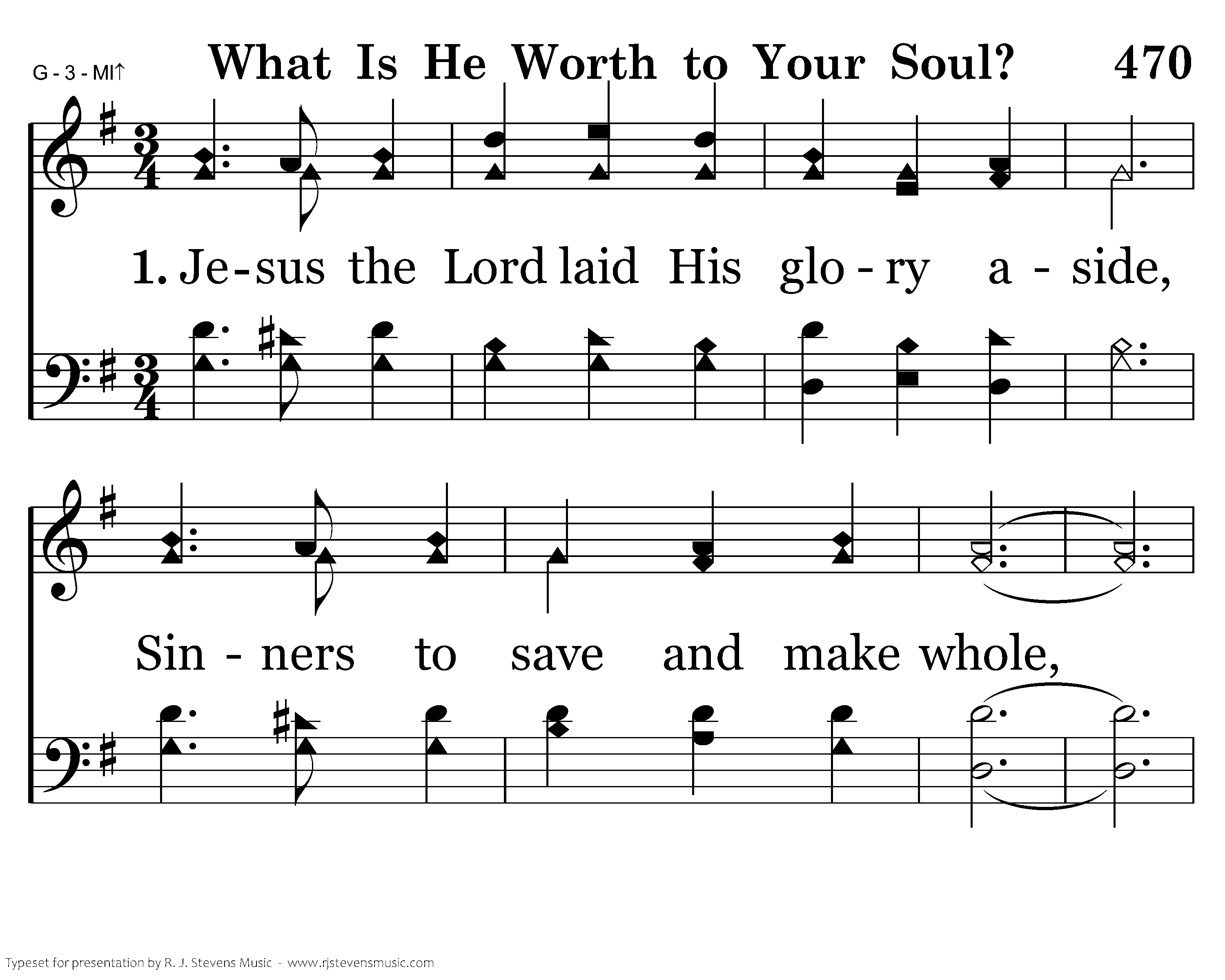 Jesus the Lord laid his glory aside, Sinners to save and make whole, Freely He died our transgressions to hide, what is He worth to your soul?