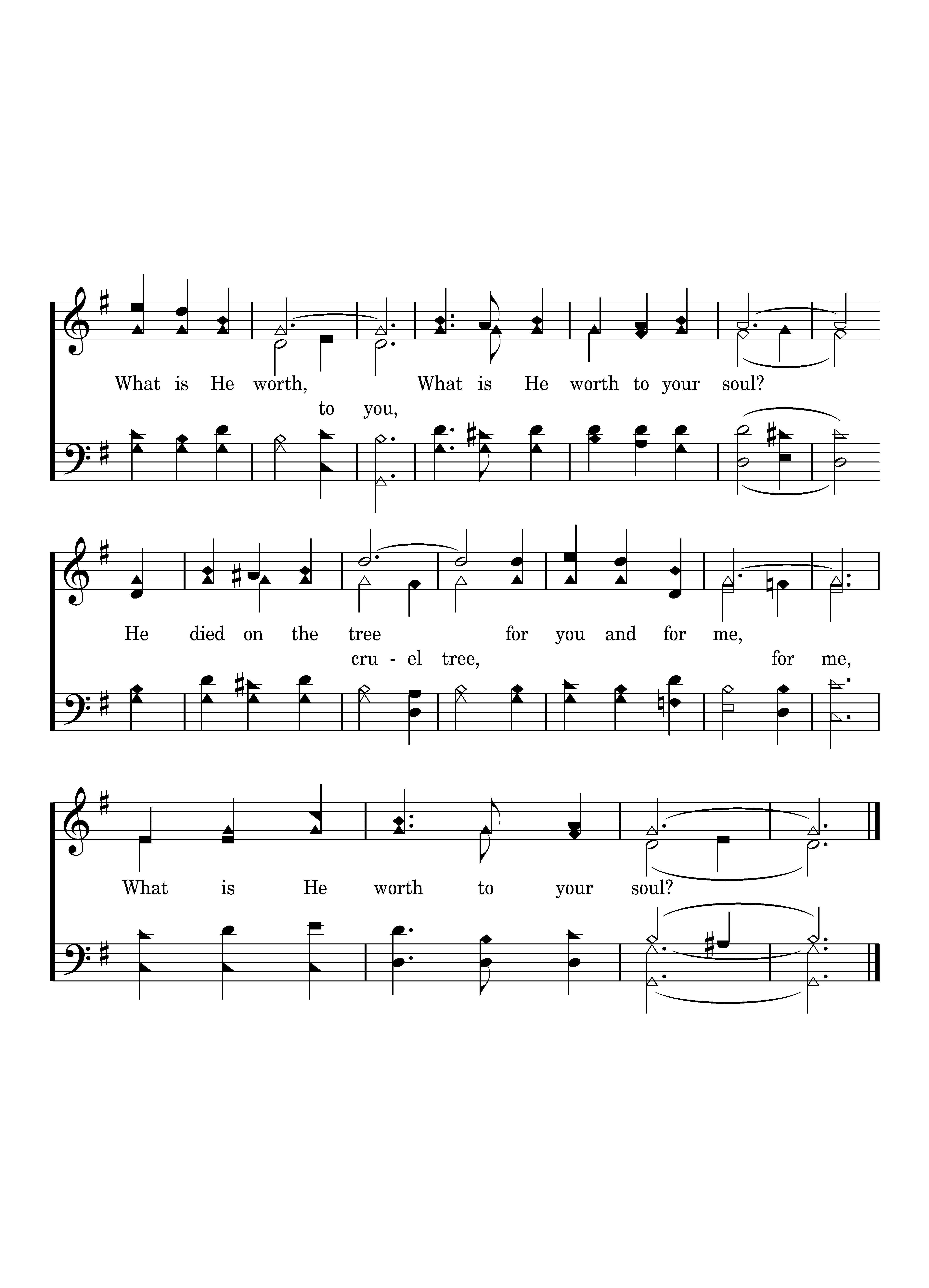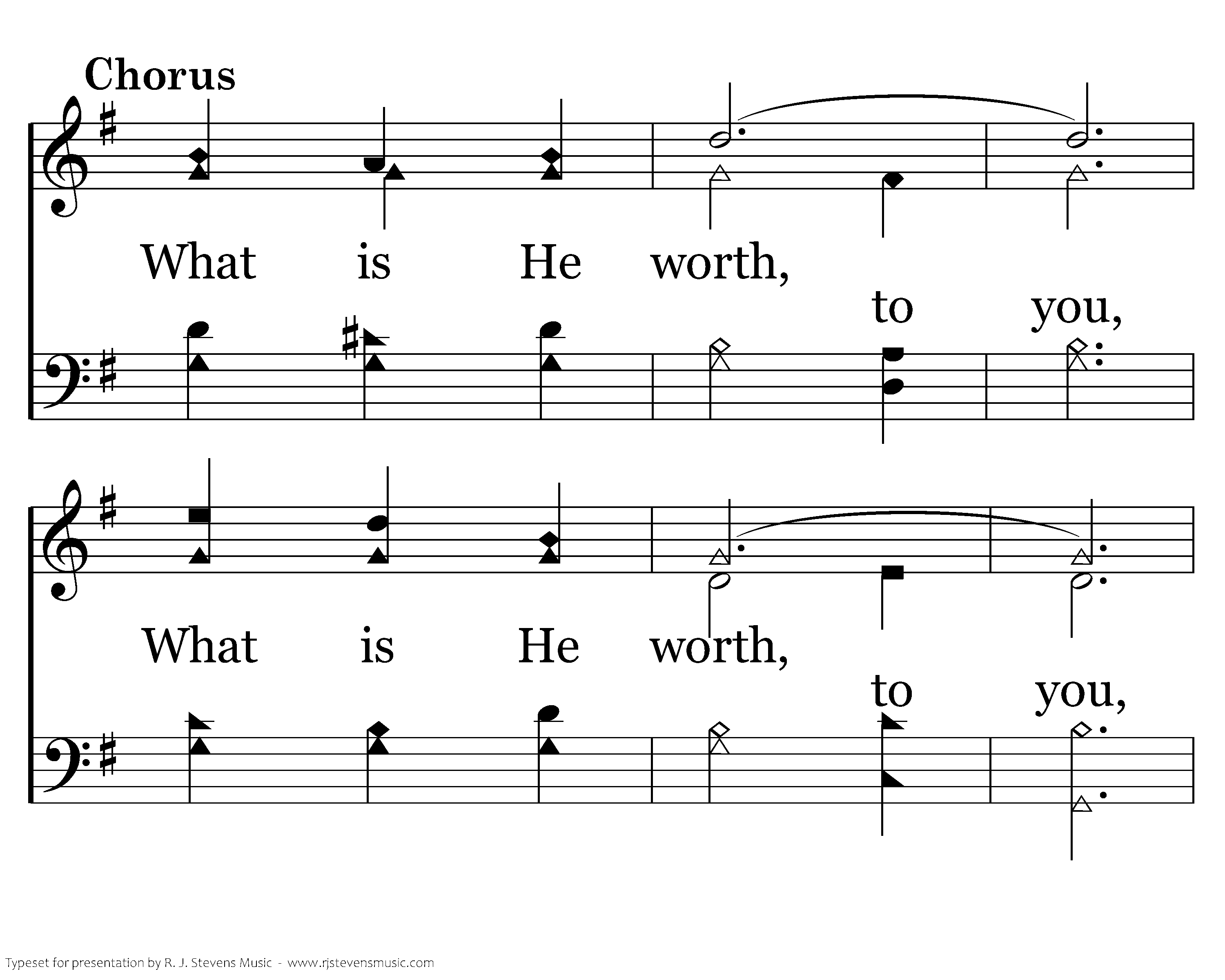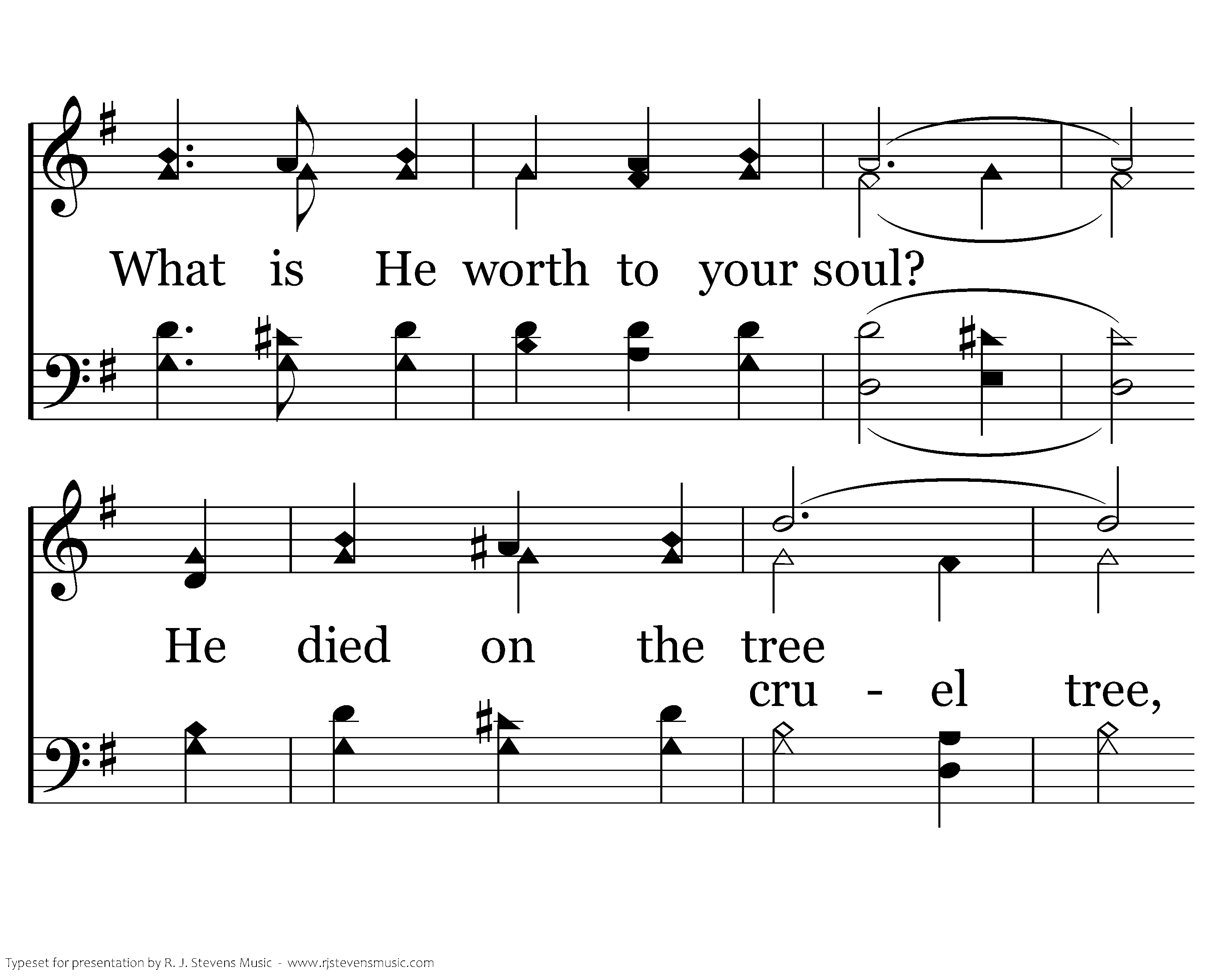 What is He worth, to you, What is He worth, to you, What is he worth to your soul? He died on the cruel tree, for you and for me, What is he worth to your soul?