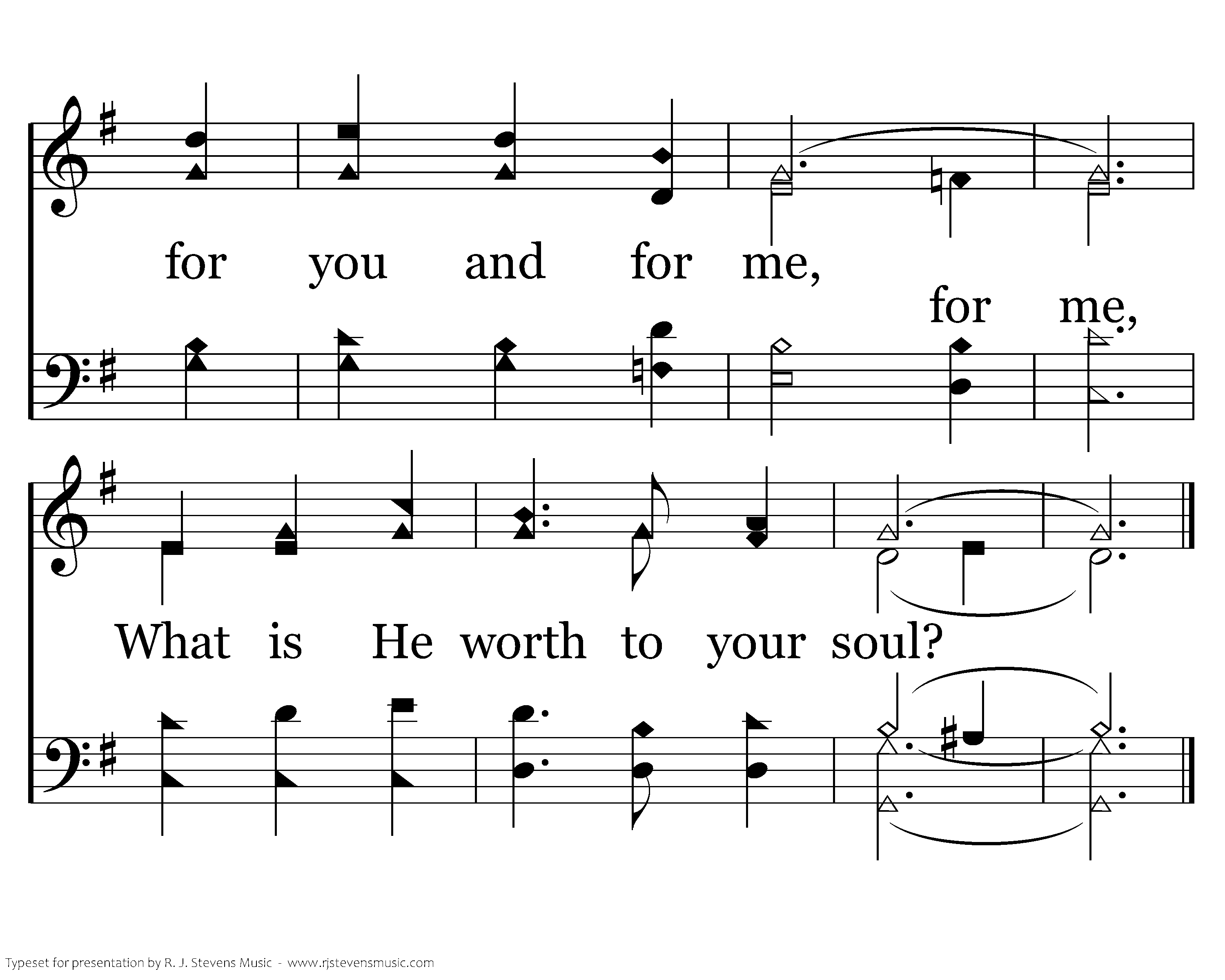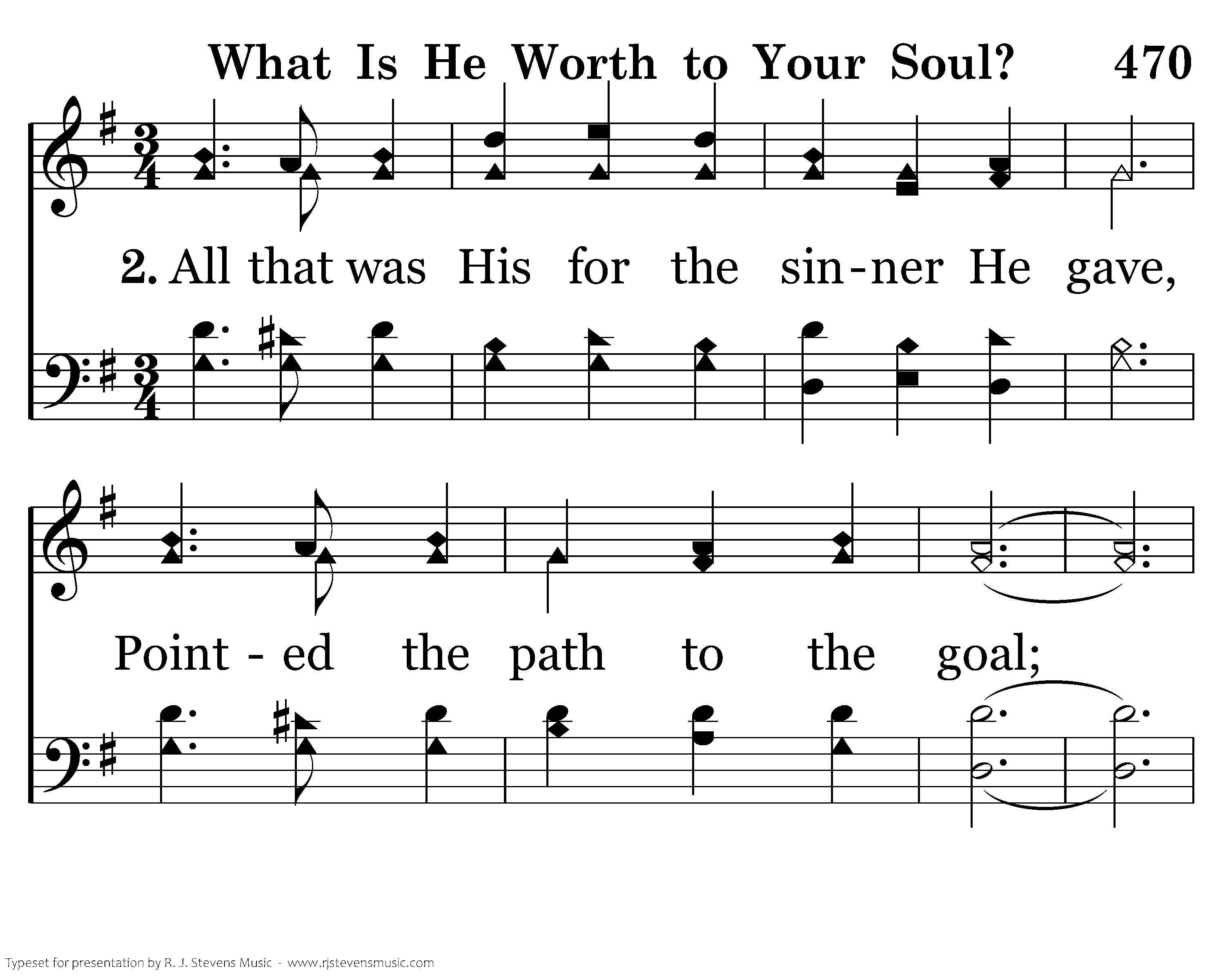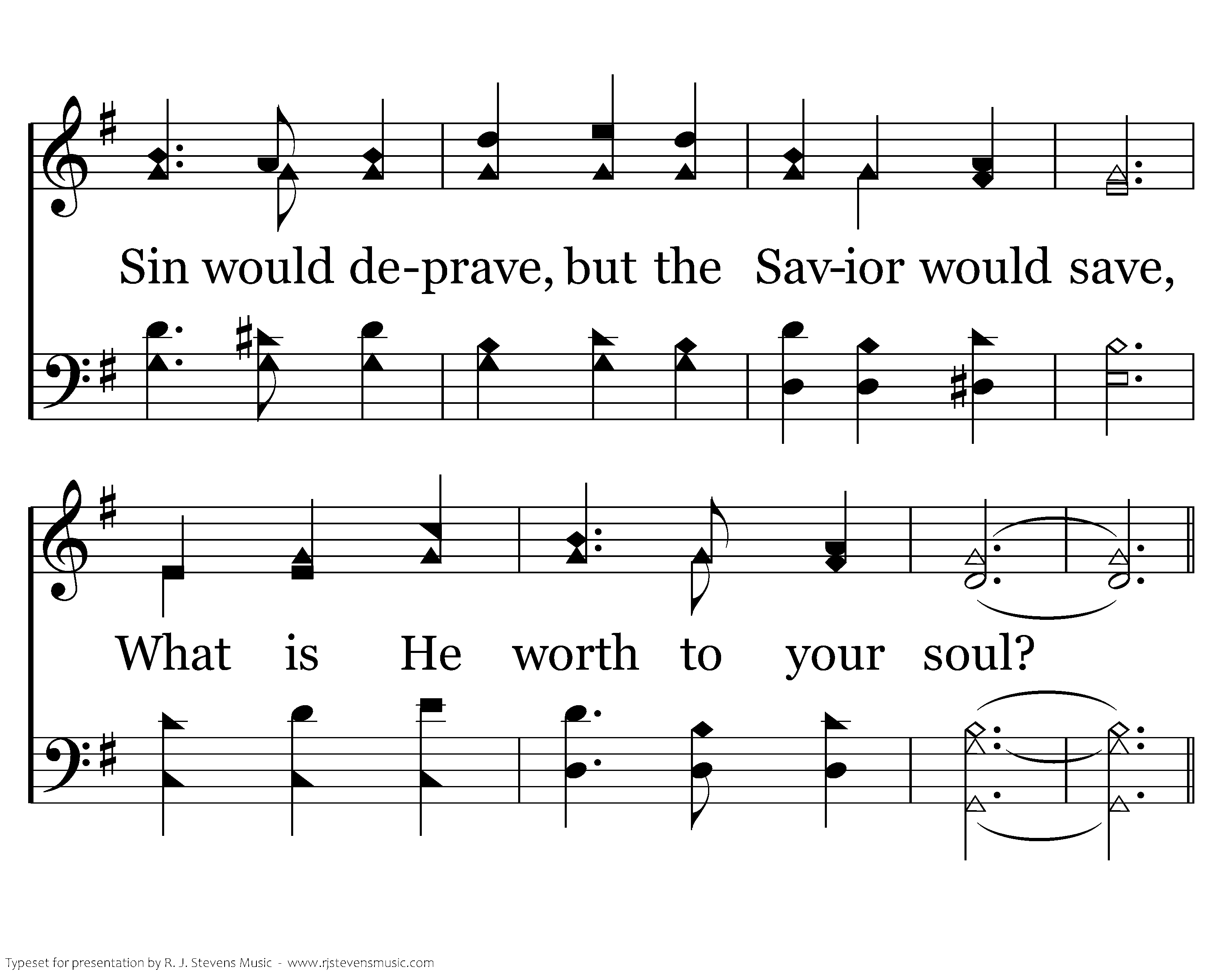 All that was His for the sinner he gave, Pointed the path to the goal; Sin would deprave, but the Savior would save, What is He worth to your soul?