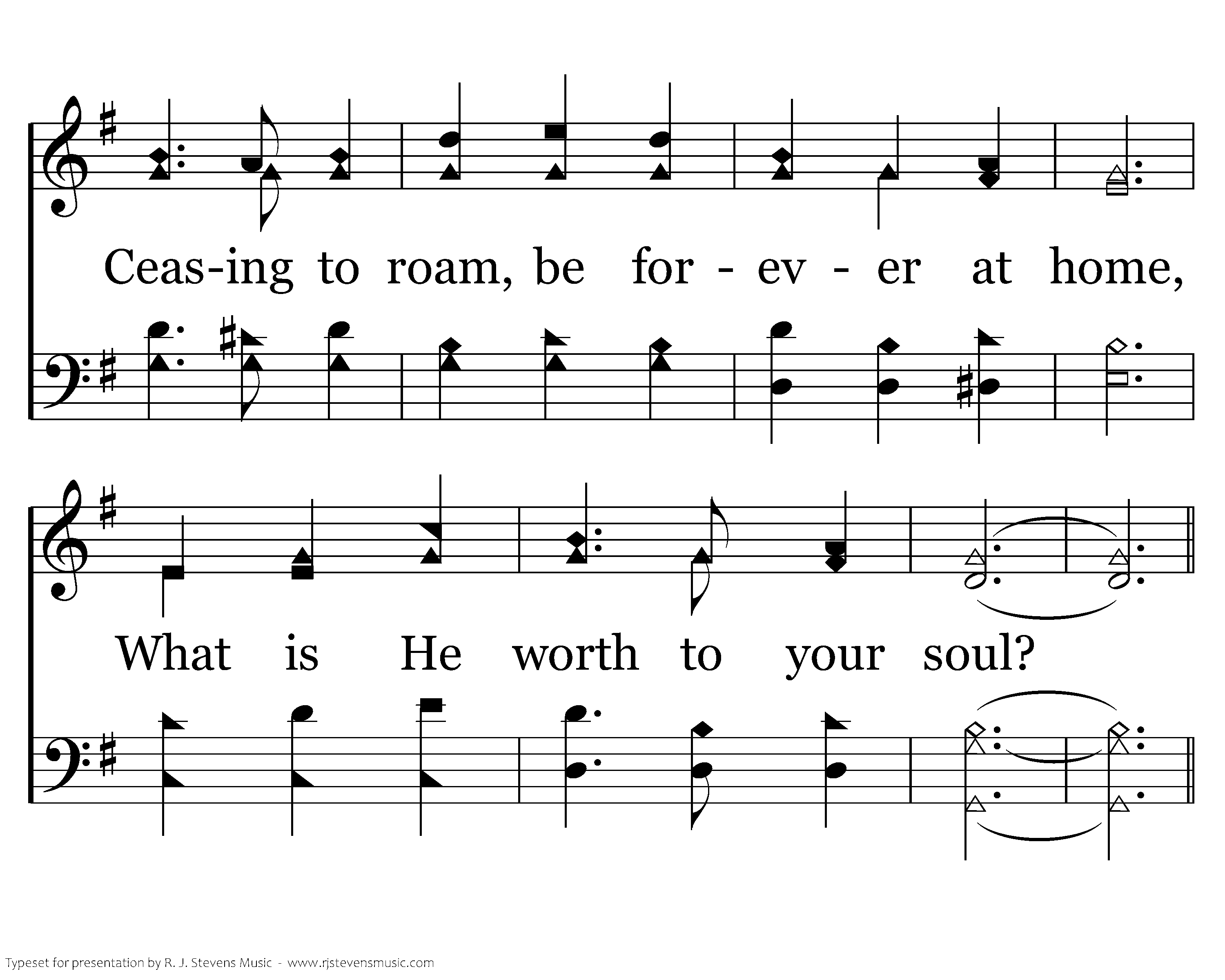 All who will trust Him in sunshine and *gloam, Shall when they reach the bright goal; Ceasing to roam, be forever at home, what is He worth to your soul?