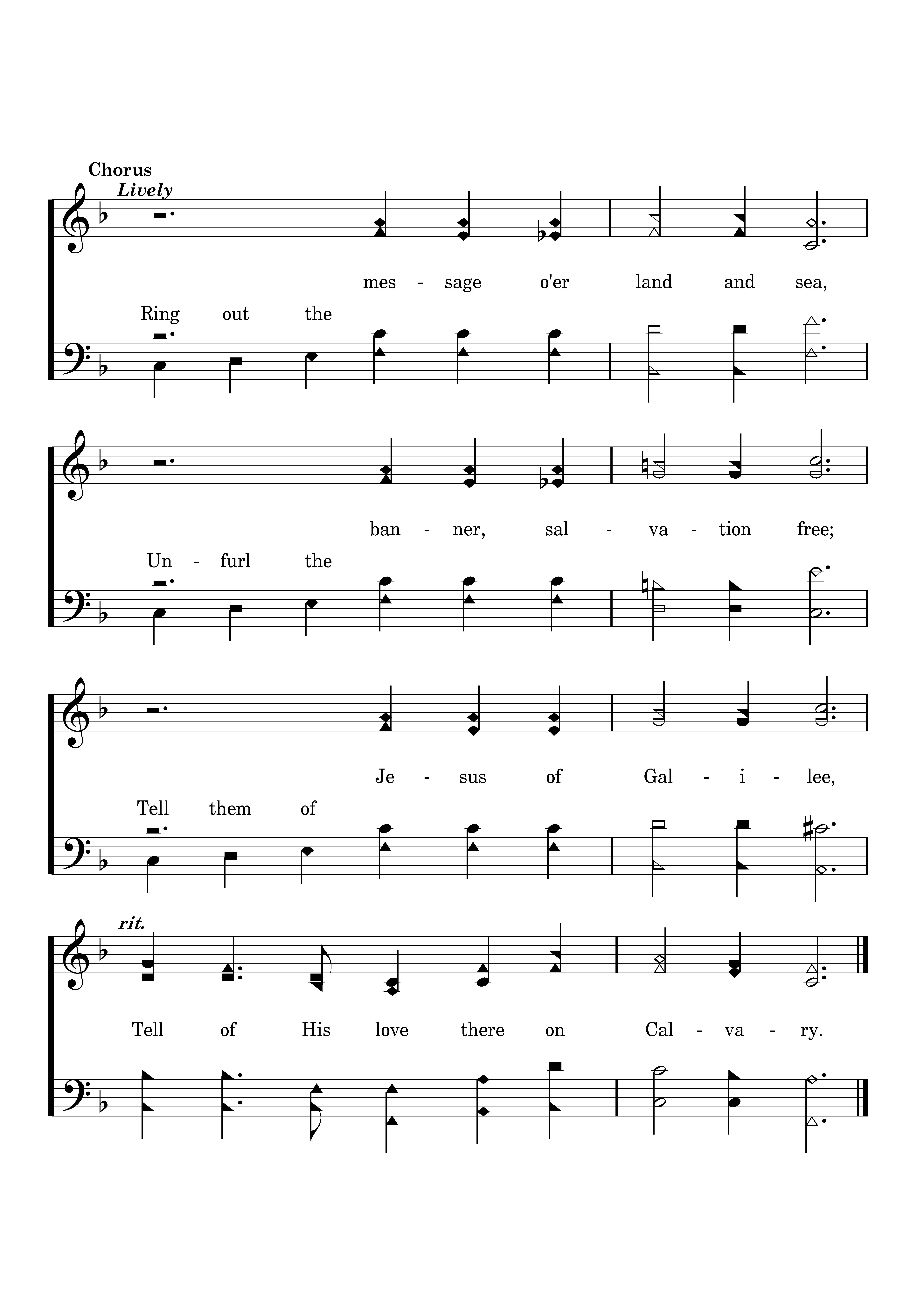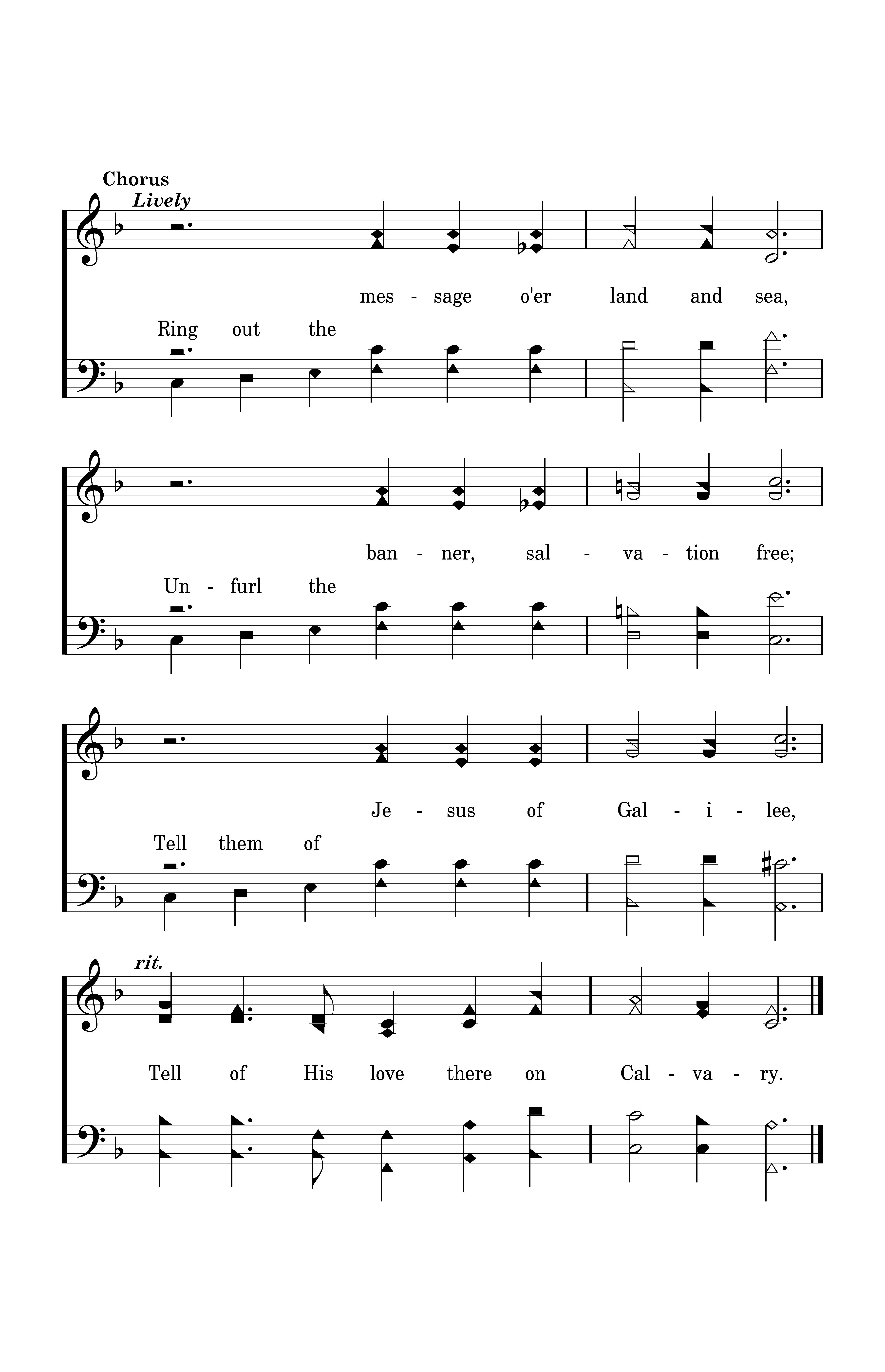 Ring out the message o'er land and sea, Unfurl the banner salvation free; Tell them of Jesus of Galilee, Tell of His love there on Calvary.