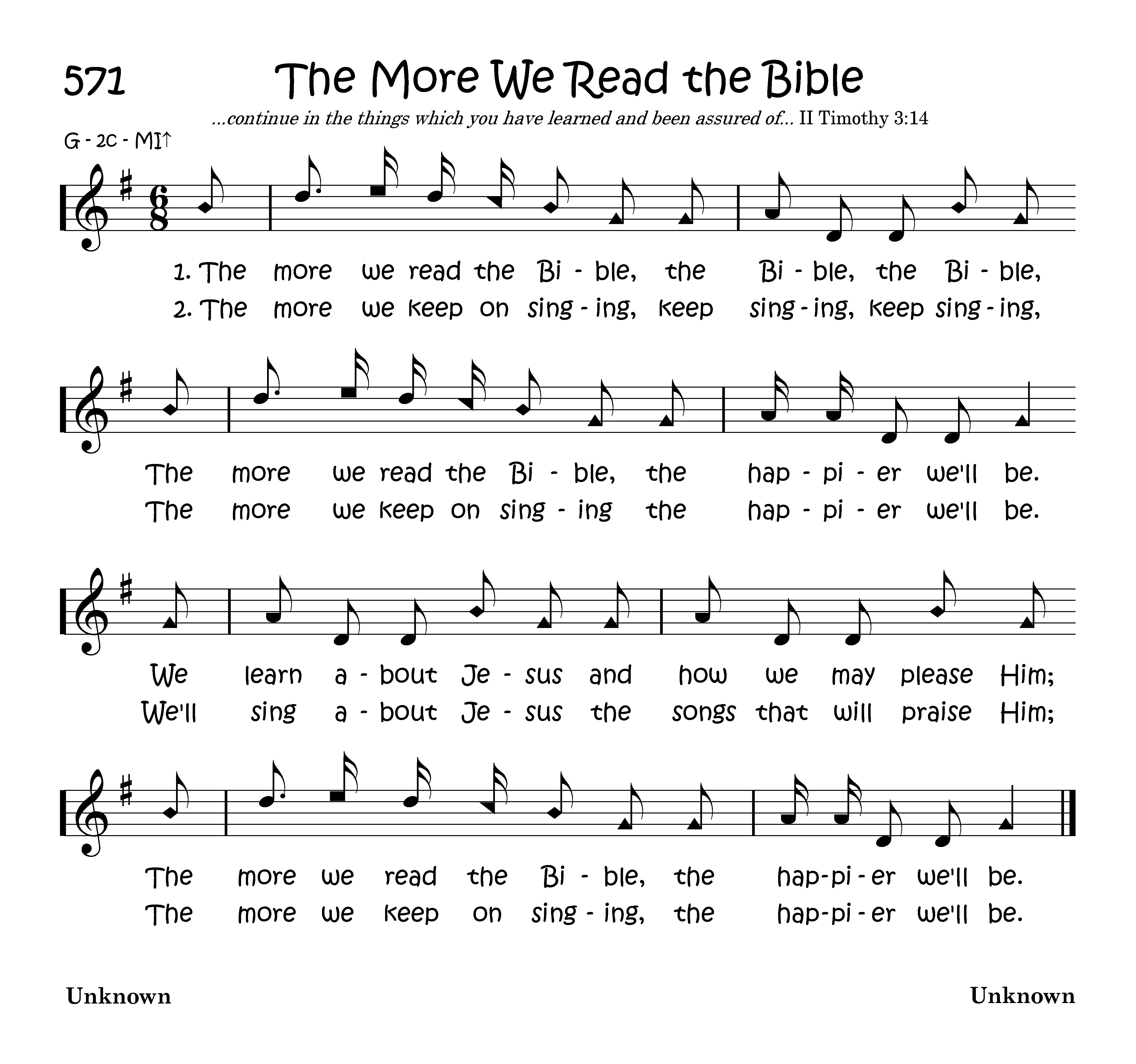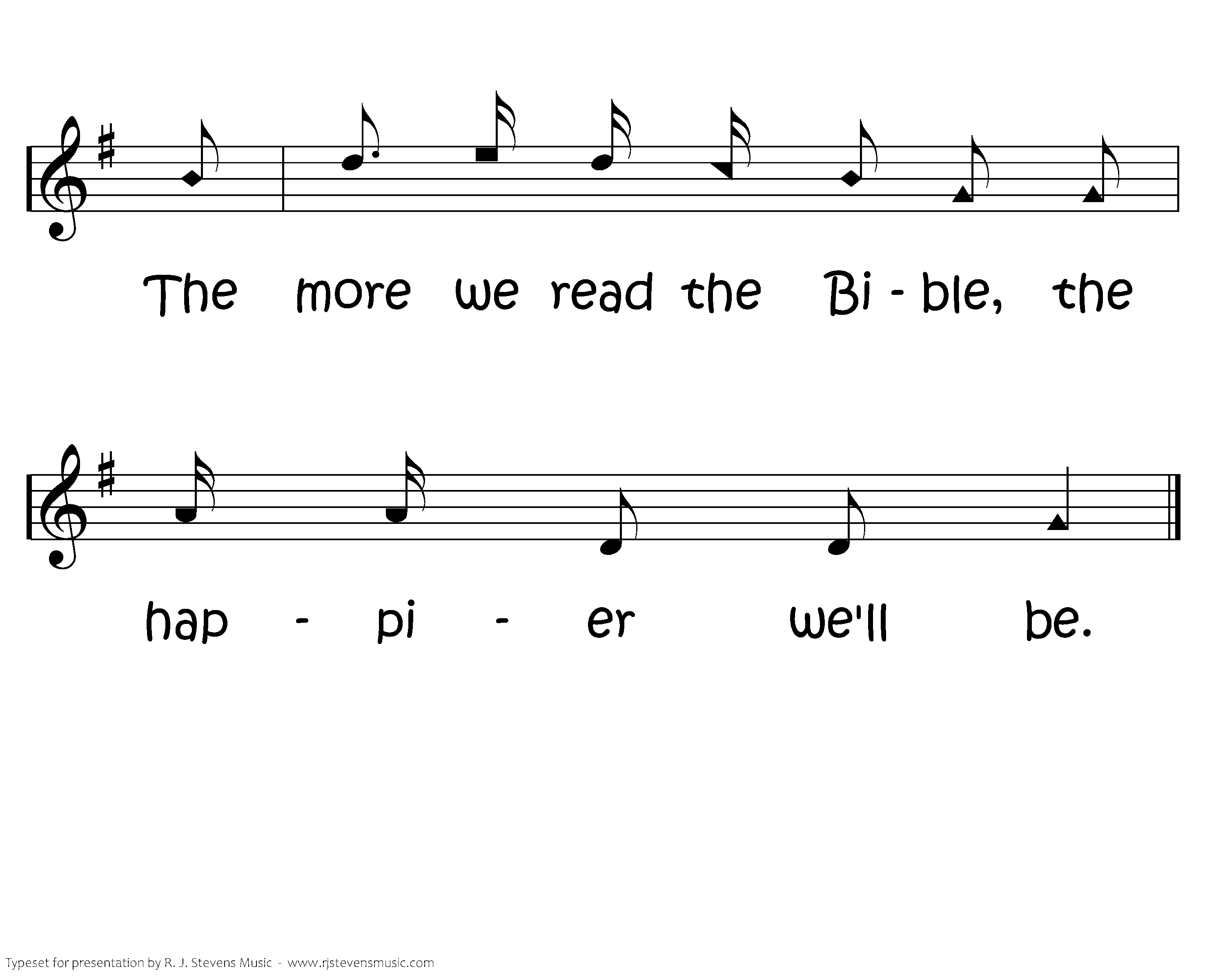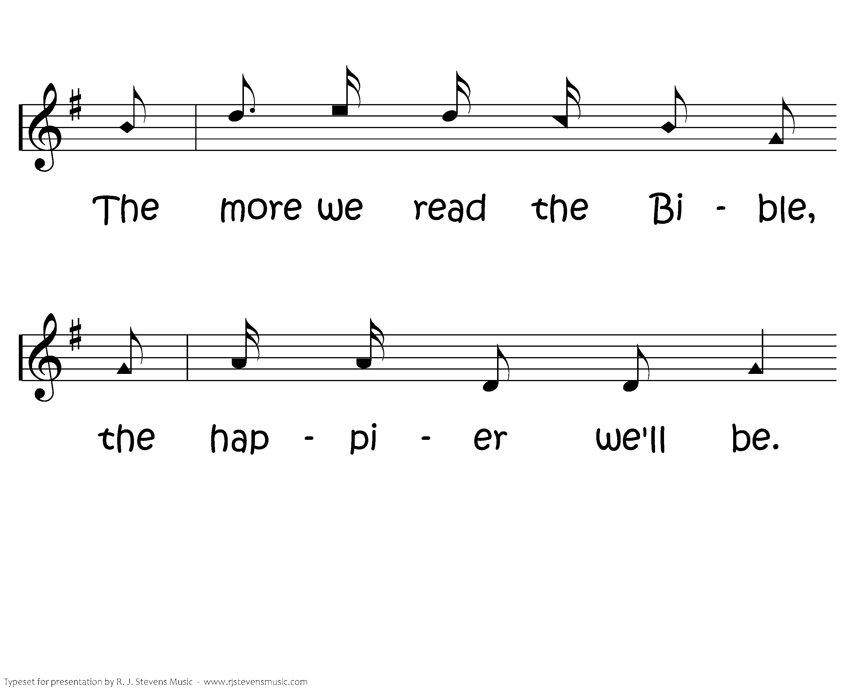 The more we read the Bible, the Bible, the Bible, The more we read the bible, the happier we'll be. We learn about Jesus and how we may please Him; The more we read the bible, the happier we'll be.