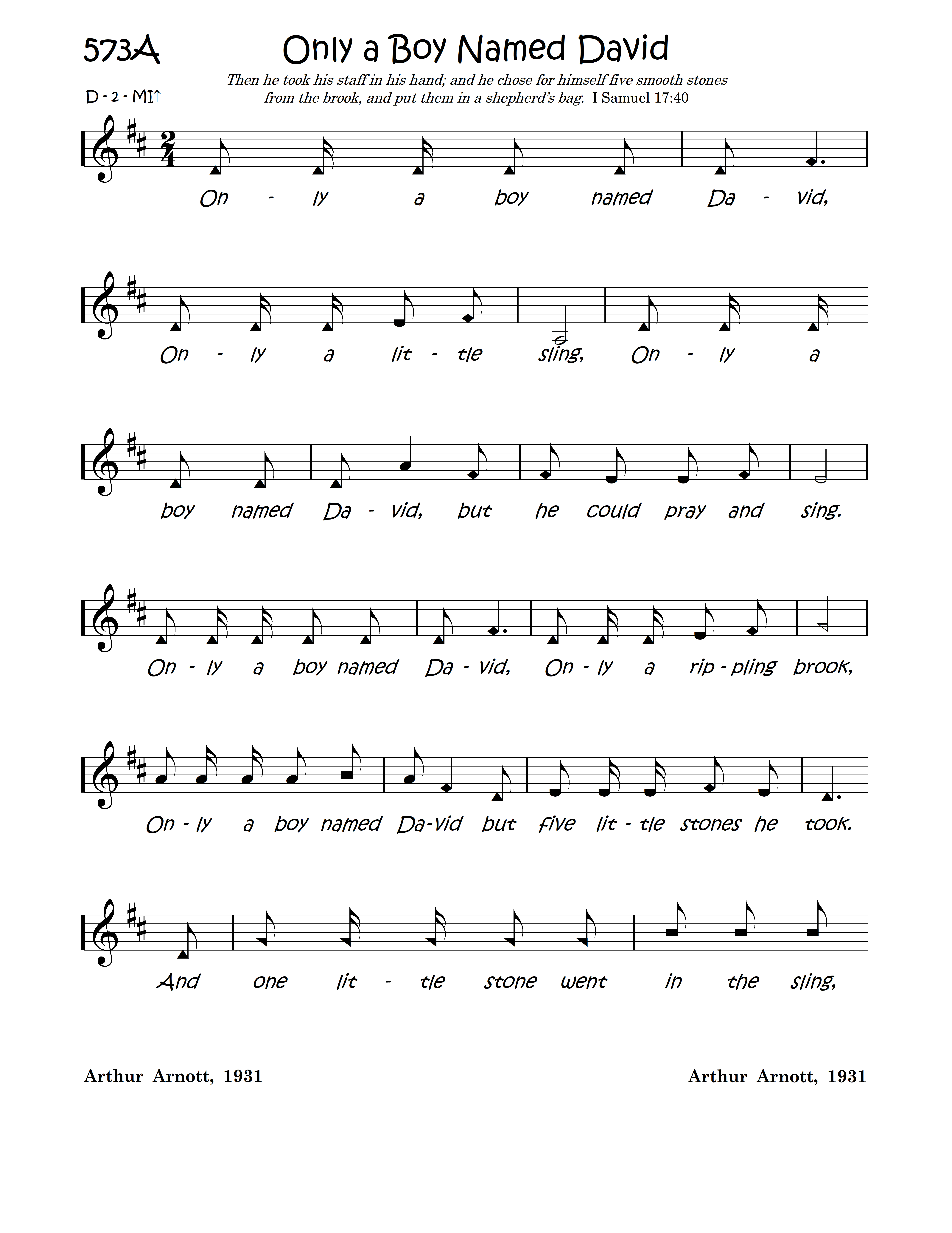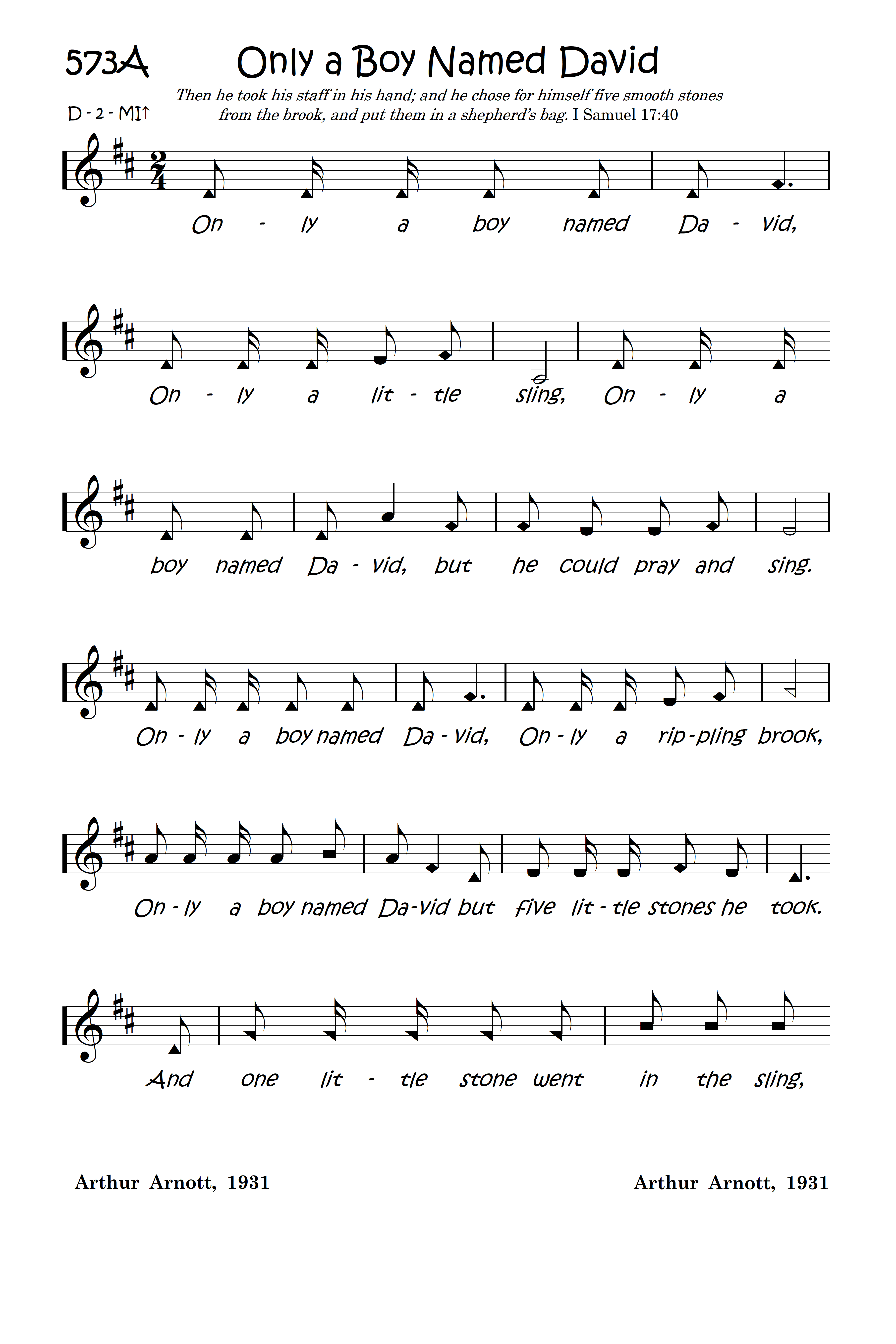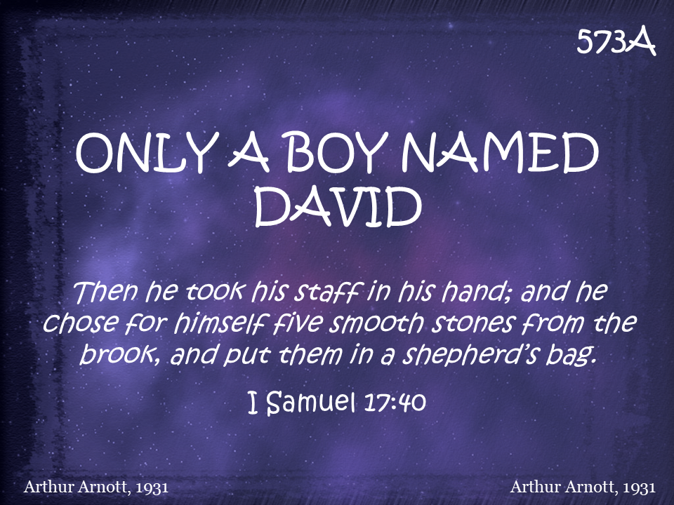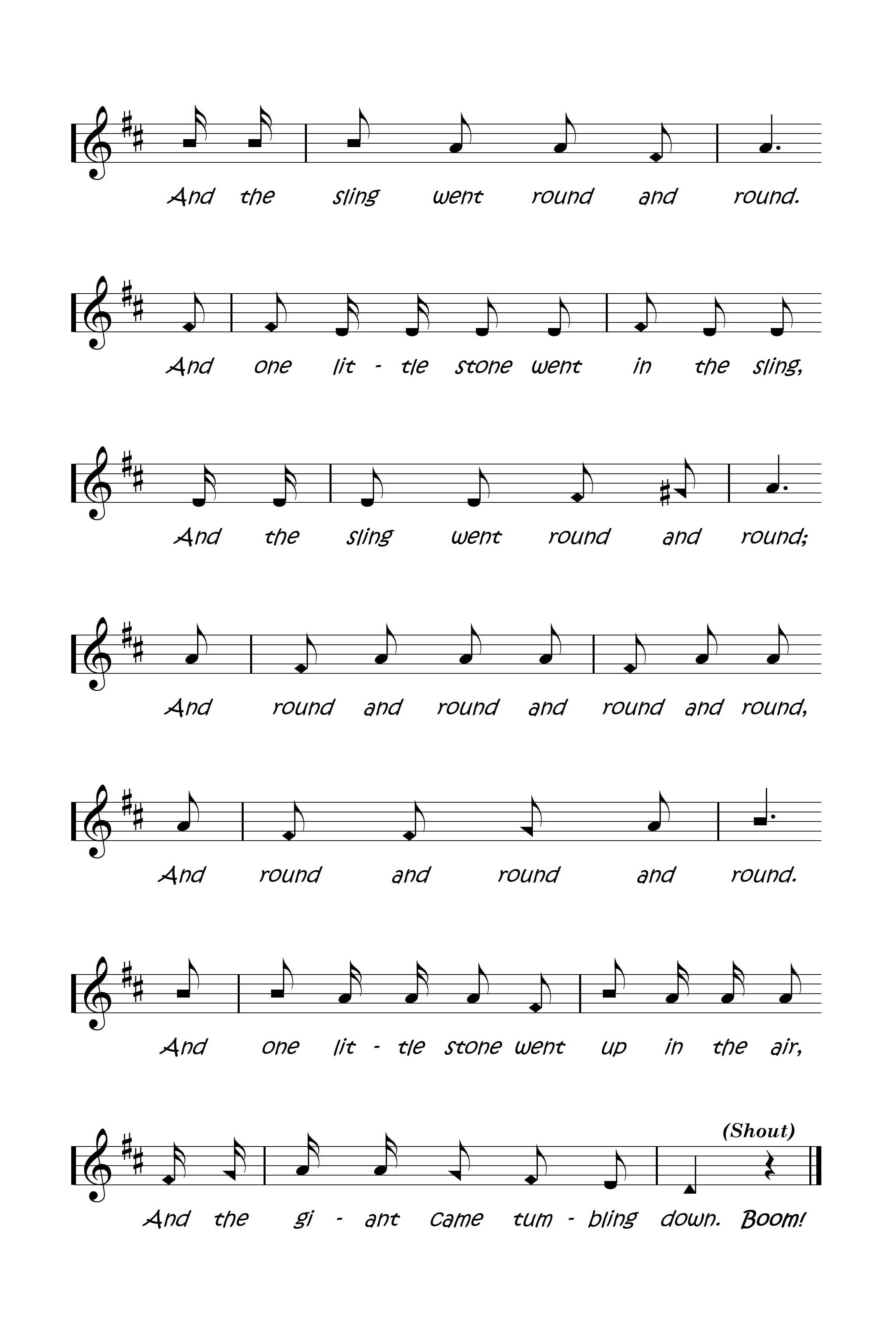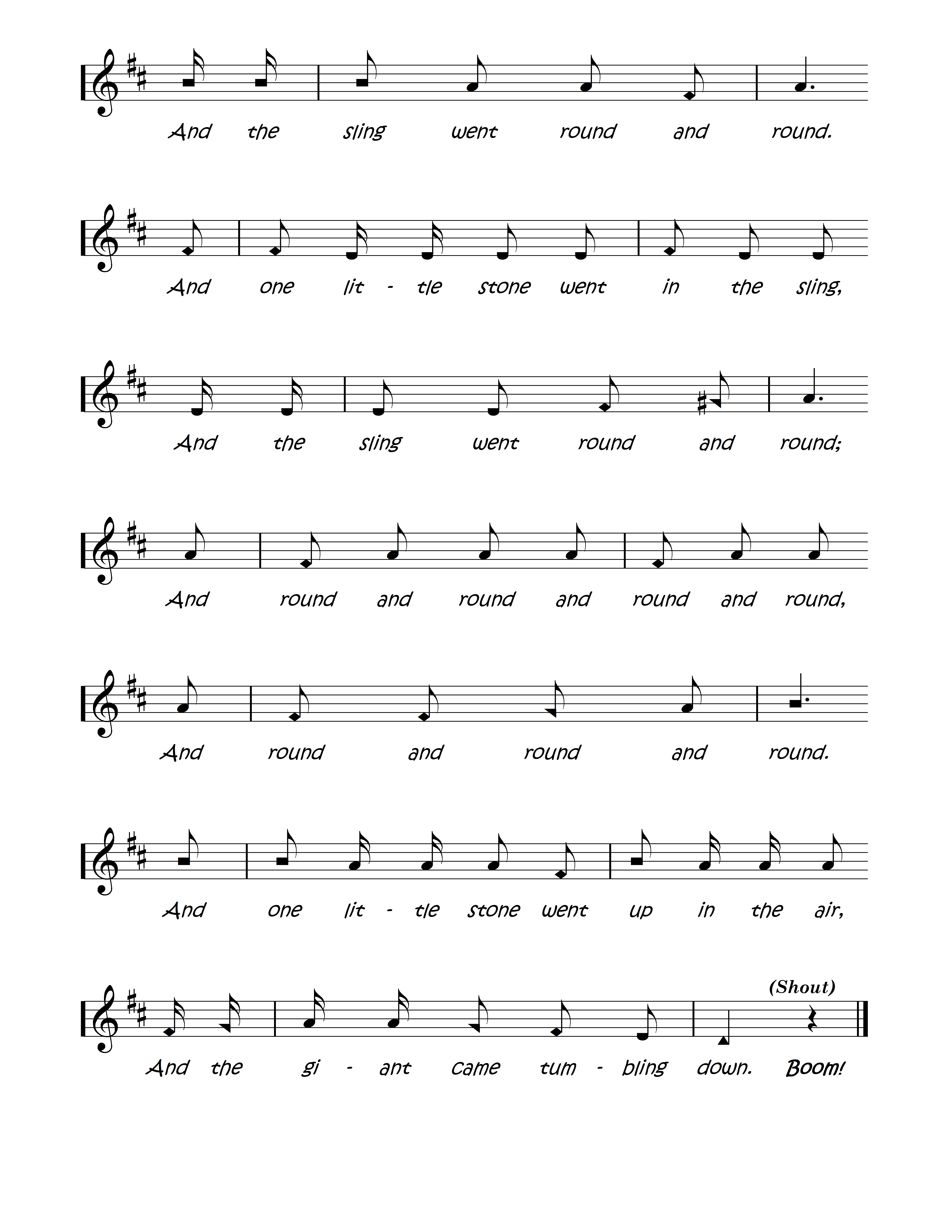 Only a boy named David, Only a little sling, Only a boy named David, but he could pray and sing. Only a boy named David, Only a rippling brook, Only a boy named David but five little stones he took. And one little sone went in the sling, And the sling went round and round. And one little stone went in the sling, And the sling went round and round; And round and round and round and round, And round and round and round. And one little stone went up in the air, And the giant came tumbling down. BOOM!