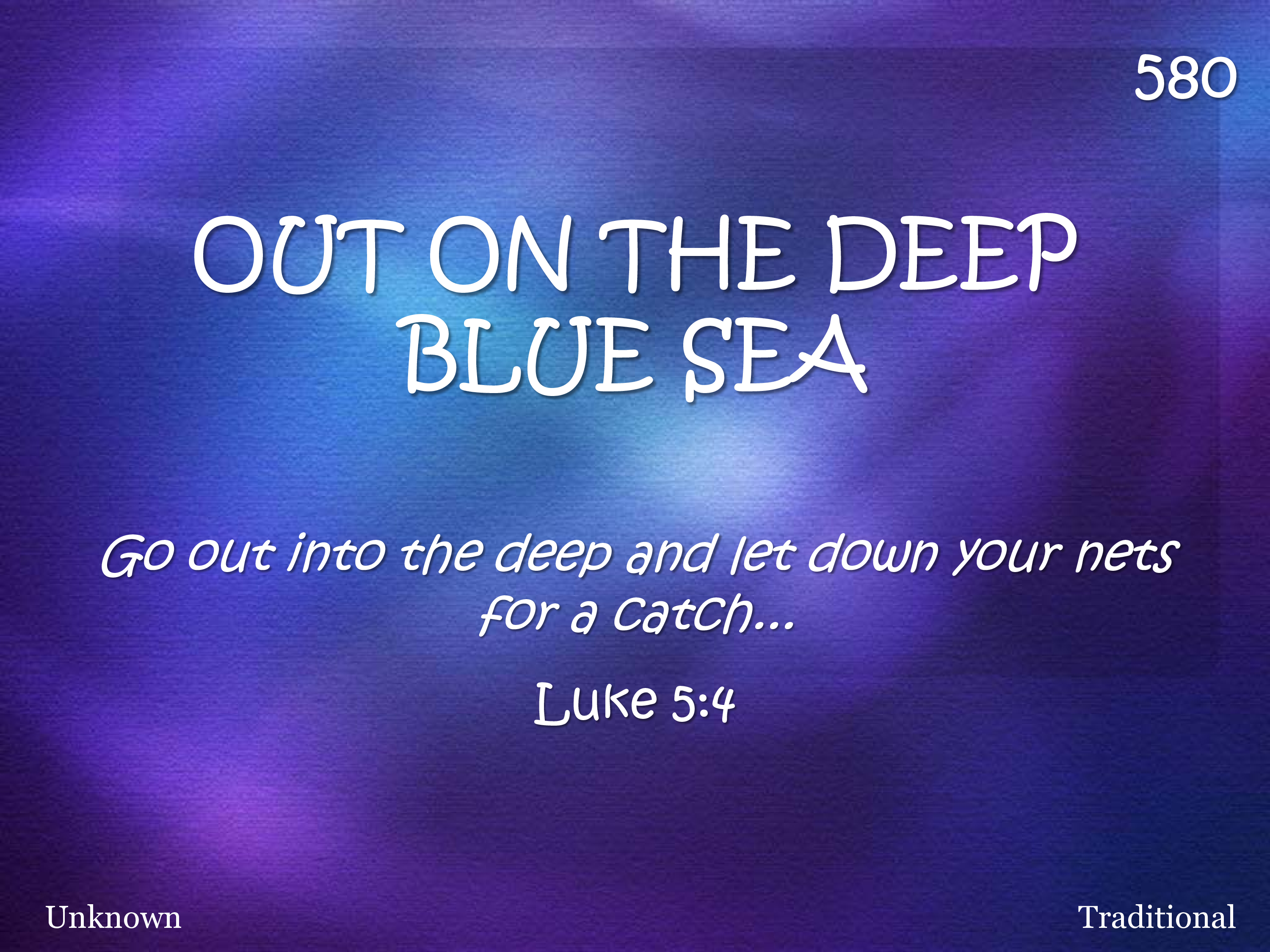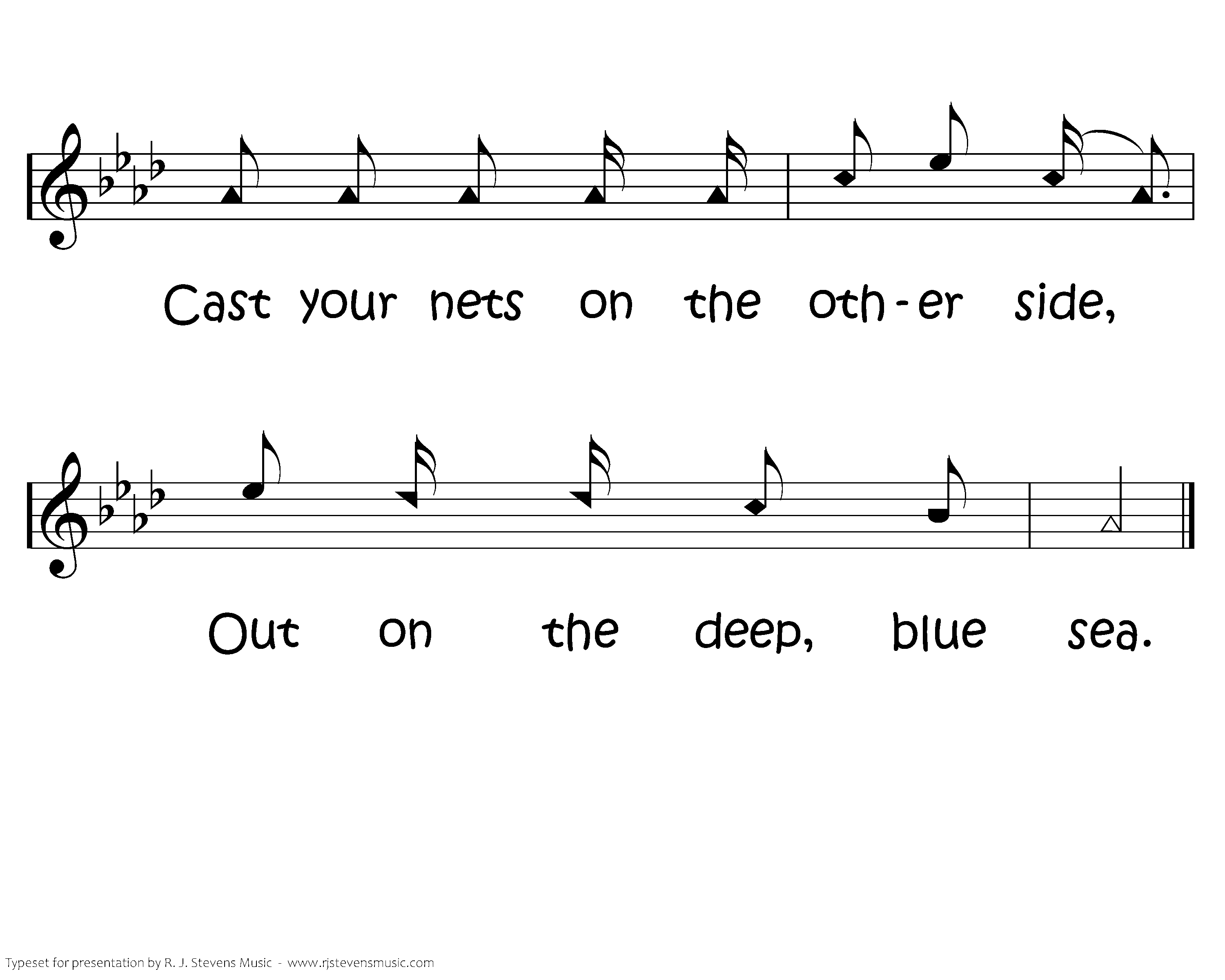 Cast your nets on the other side, Cast your nets on the other side, Cast your nets on the other side, Out on the deep, blue sea.