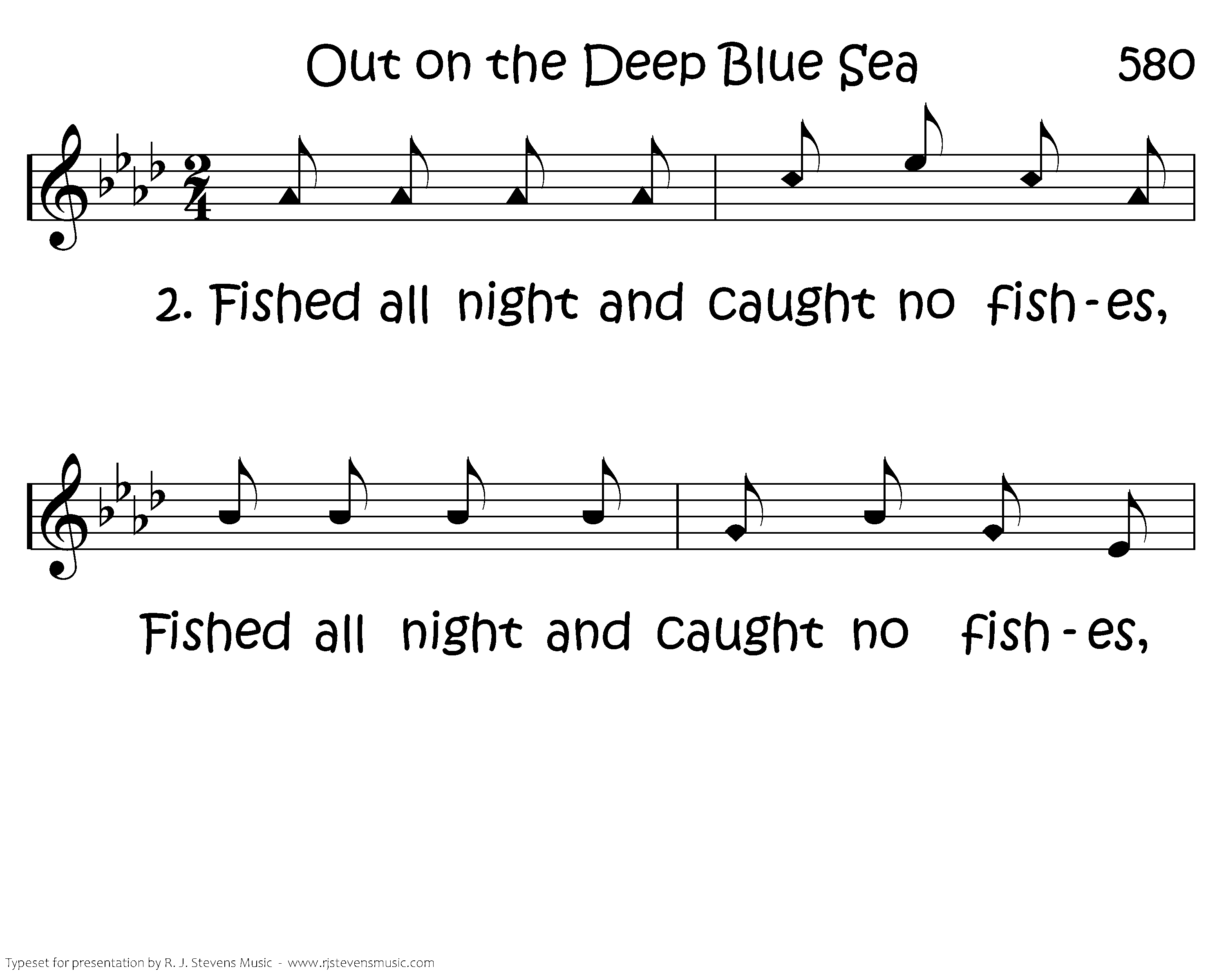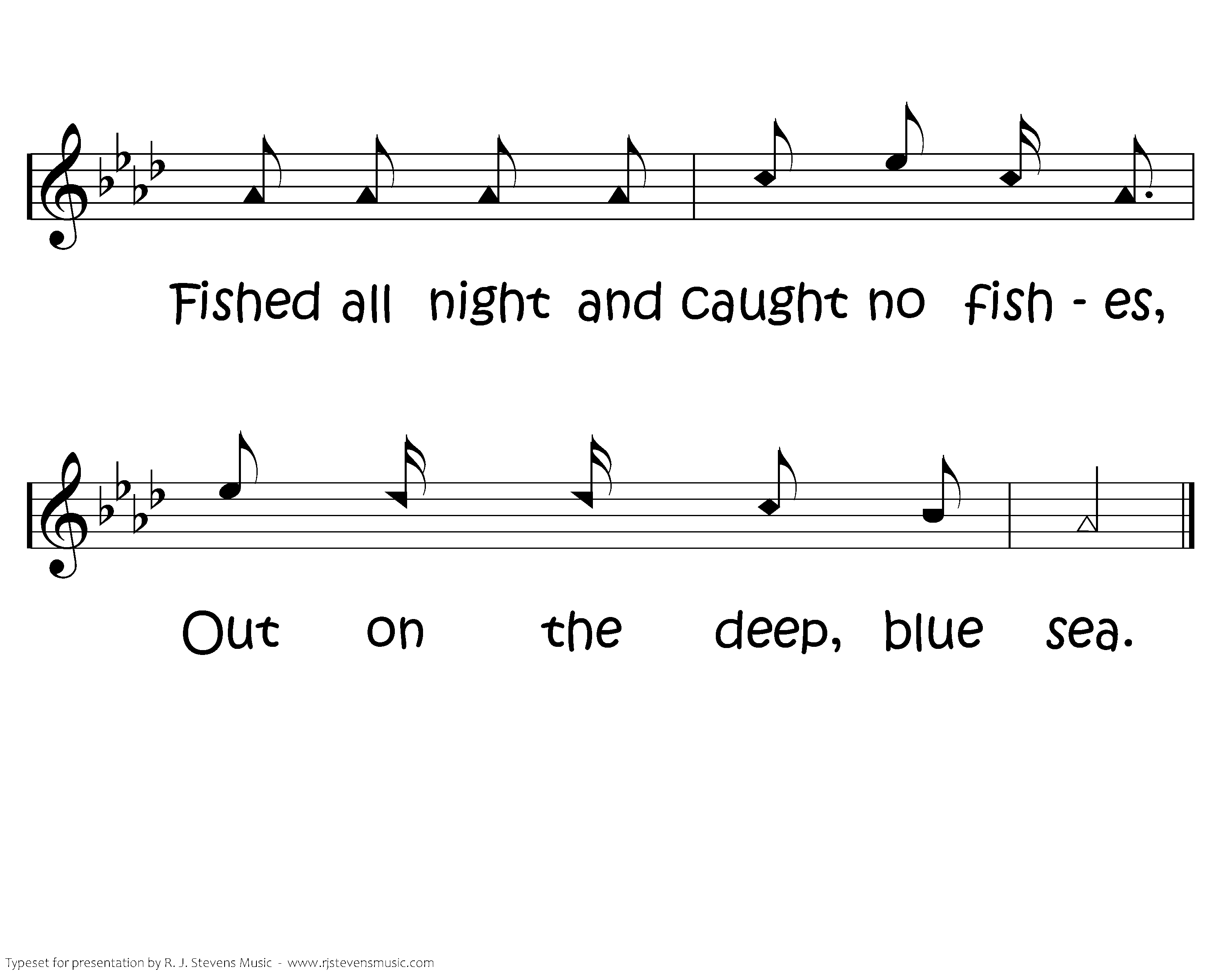 Fished all night and caught no fishes, Fished all night and caught no fishes, Fished all night and caught no fishes, Out on the deep blue sea.