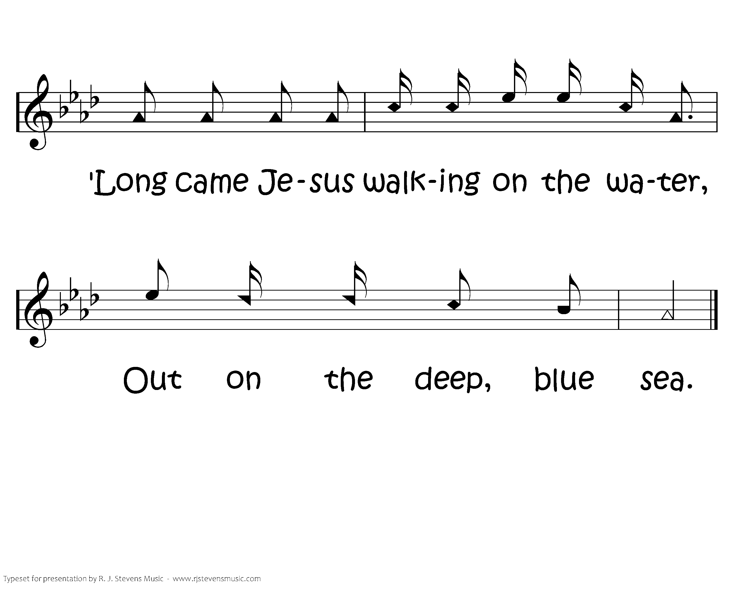 Long came Jesus walking on the water, 'Long came Jesus walking on the water, "Long came Jesus walking on the water, Out on the deep, blue sea.