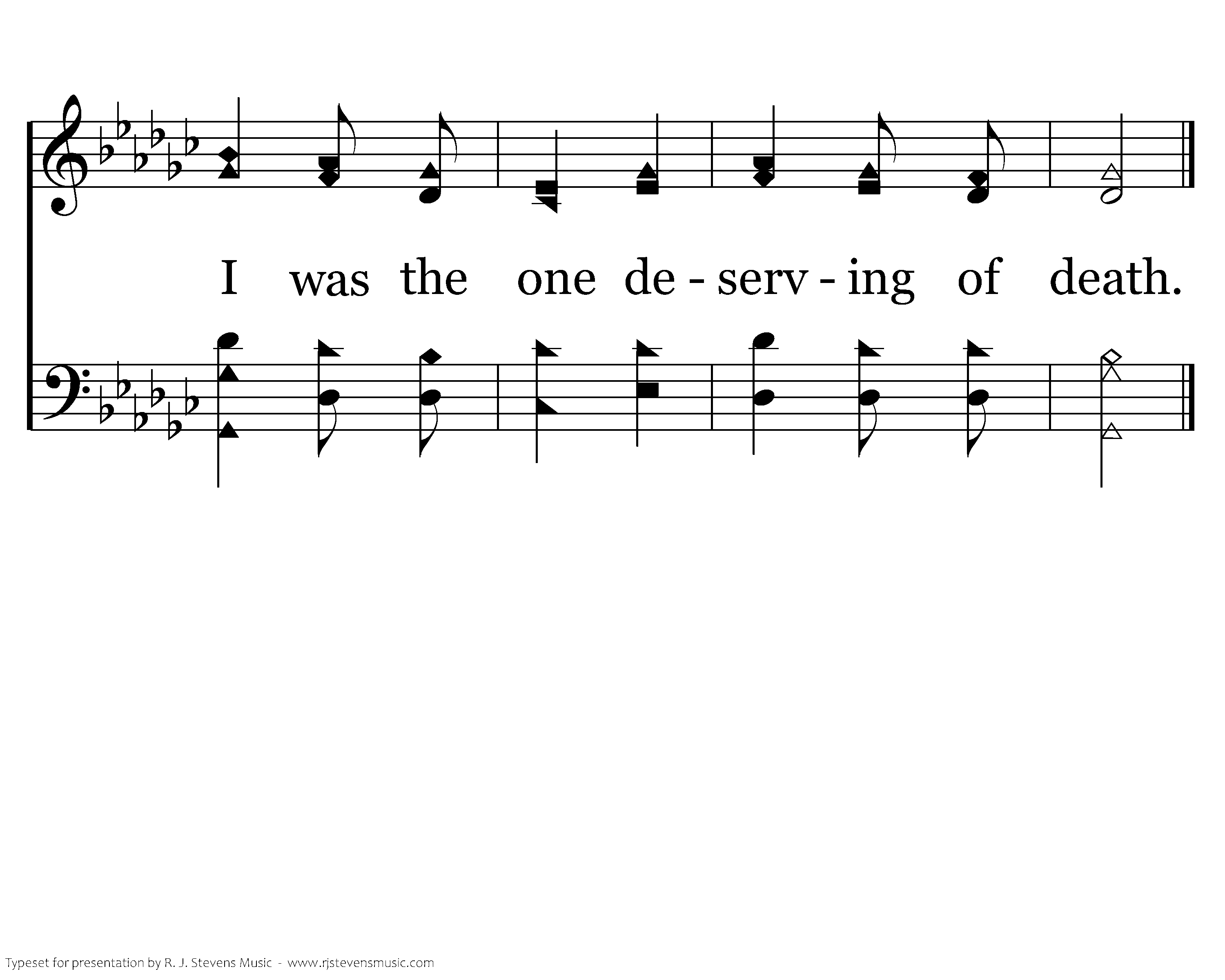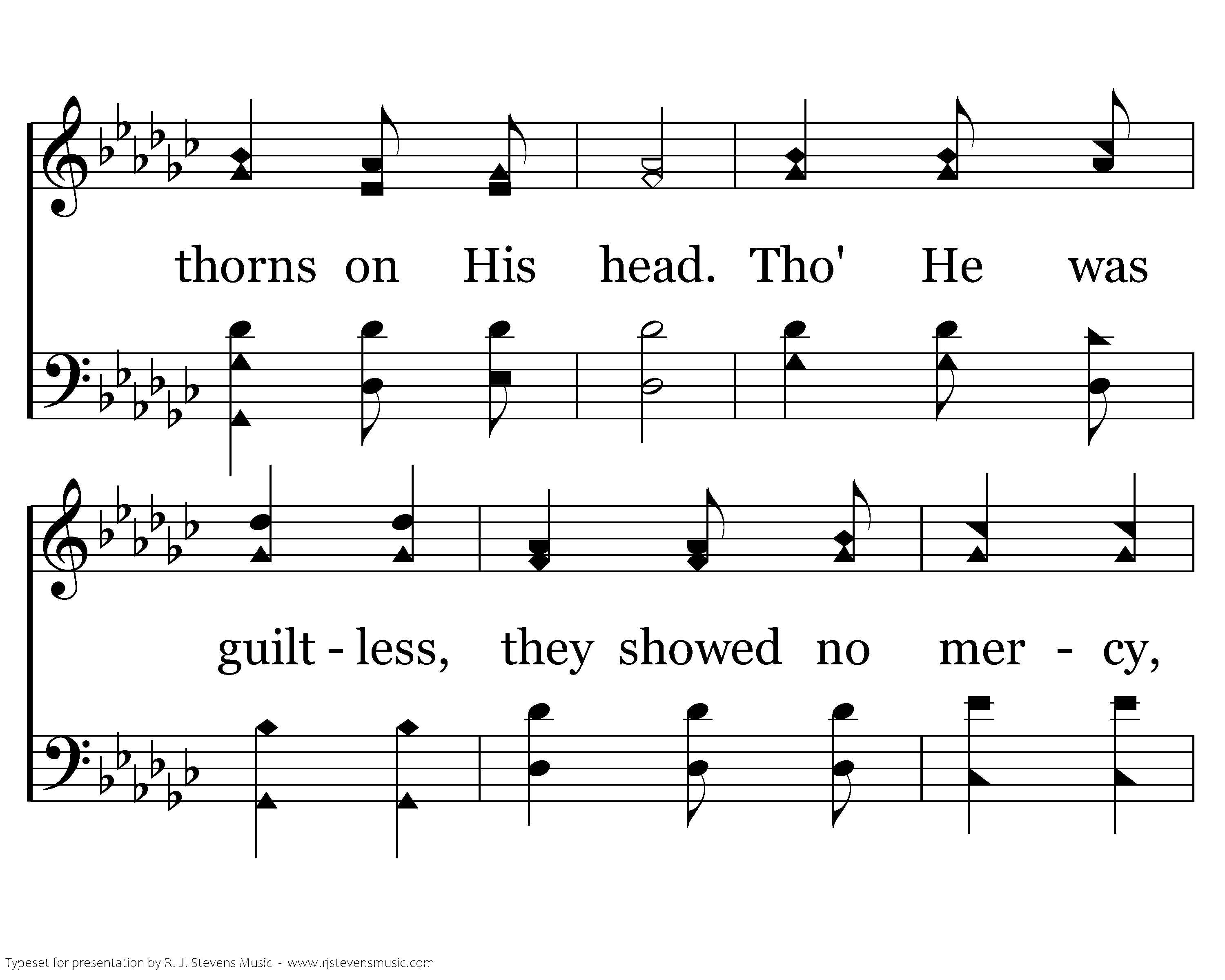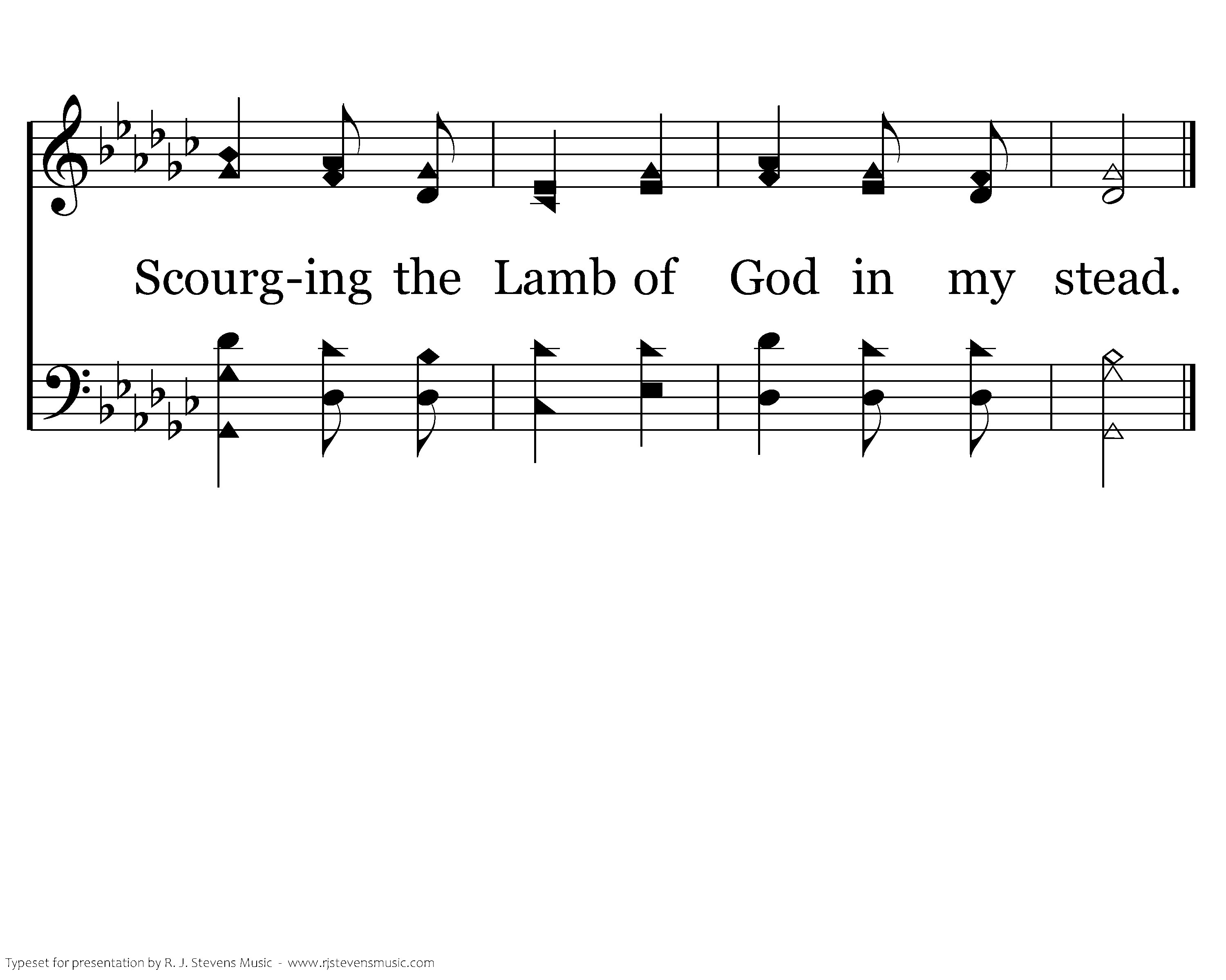 Curse after curse was shouted by mockers, Placing a crown of thorns on his head. Tho' He was guiltless, they showed no mercy, Scourging the Lamb of God in my stead.