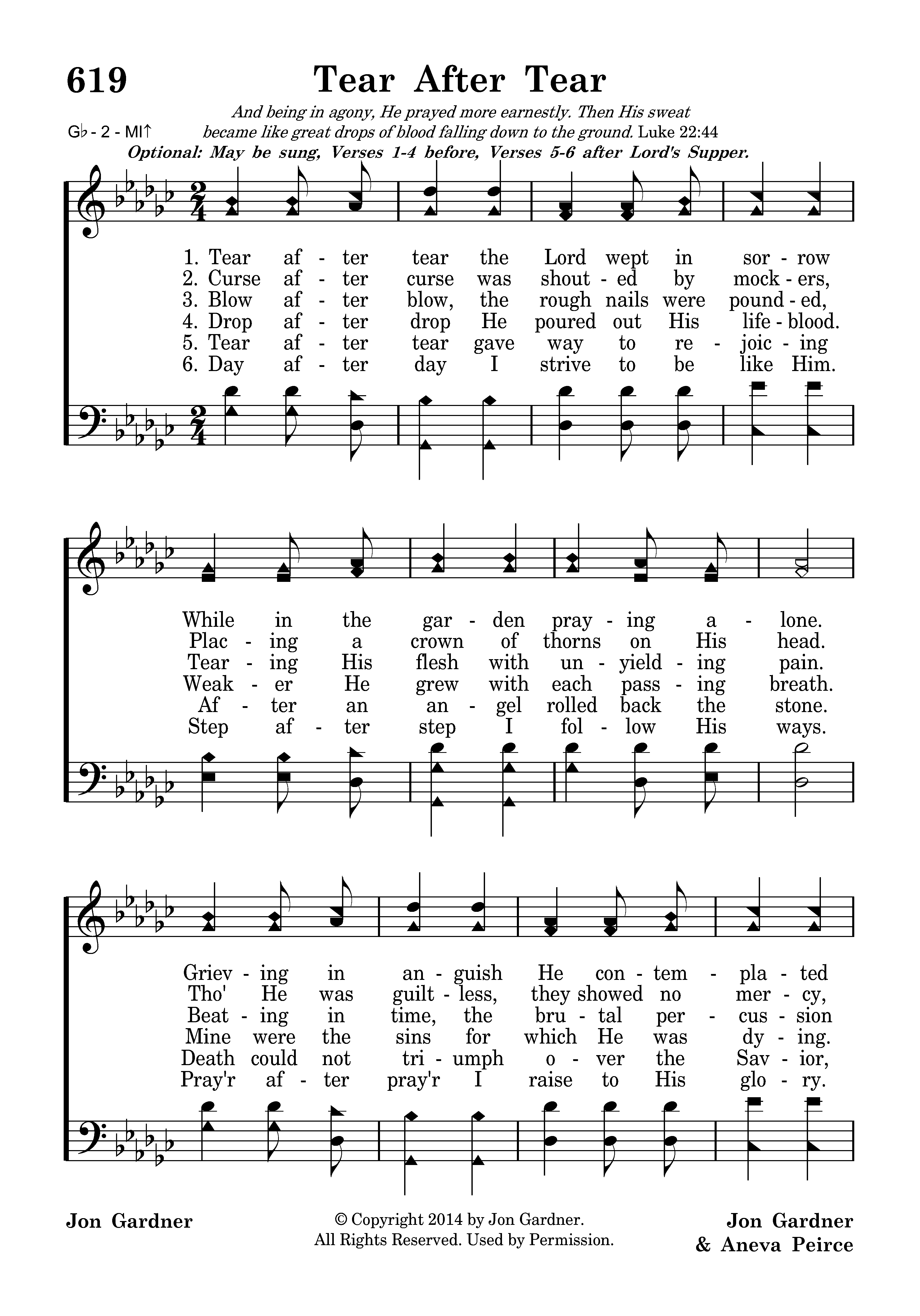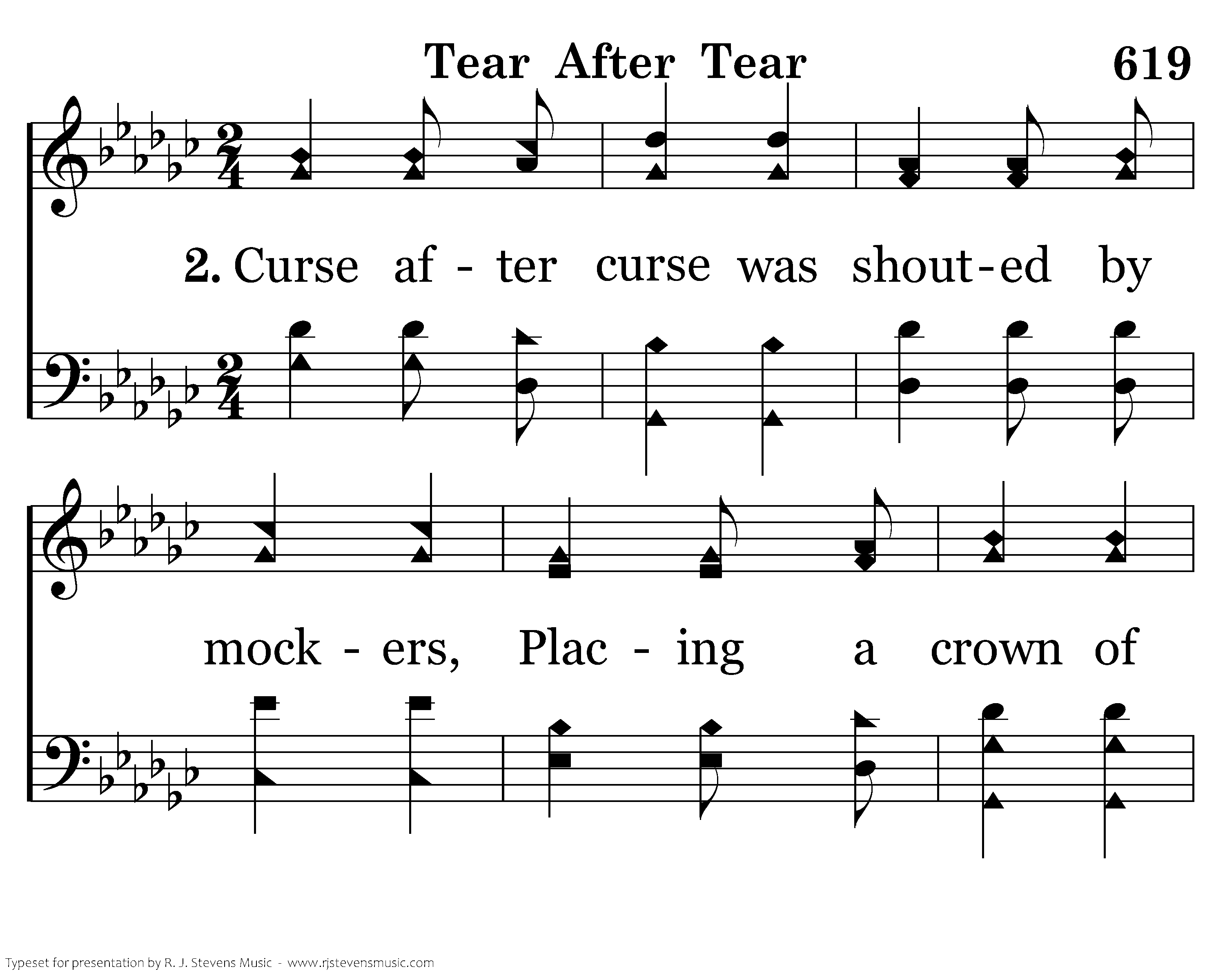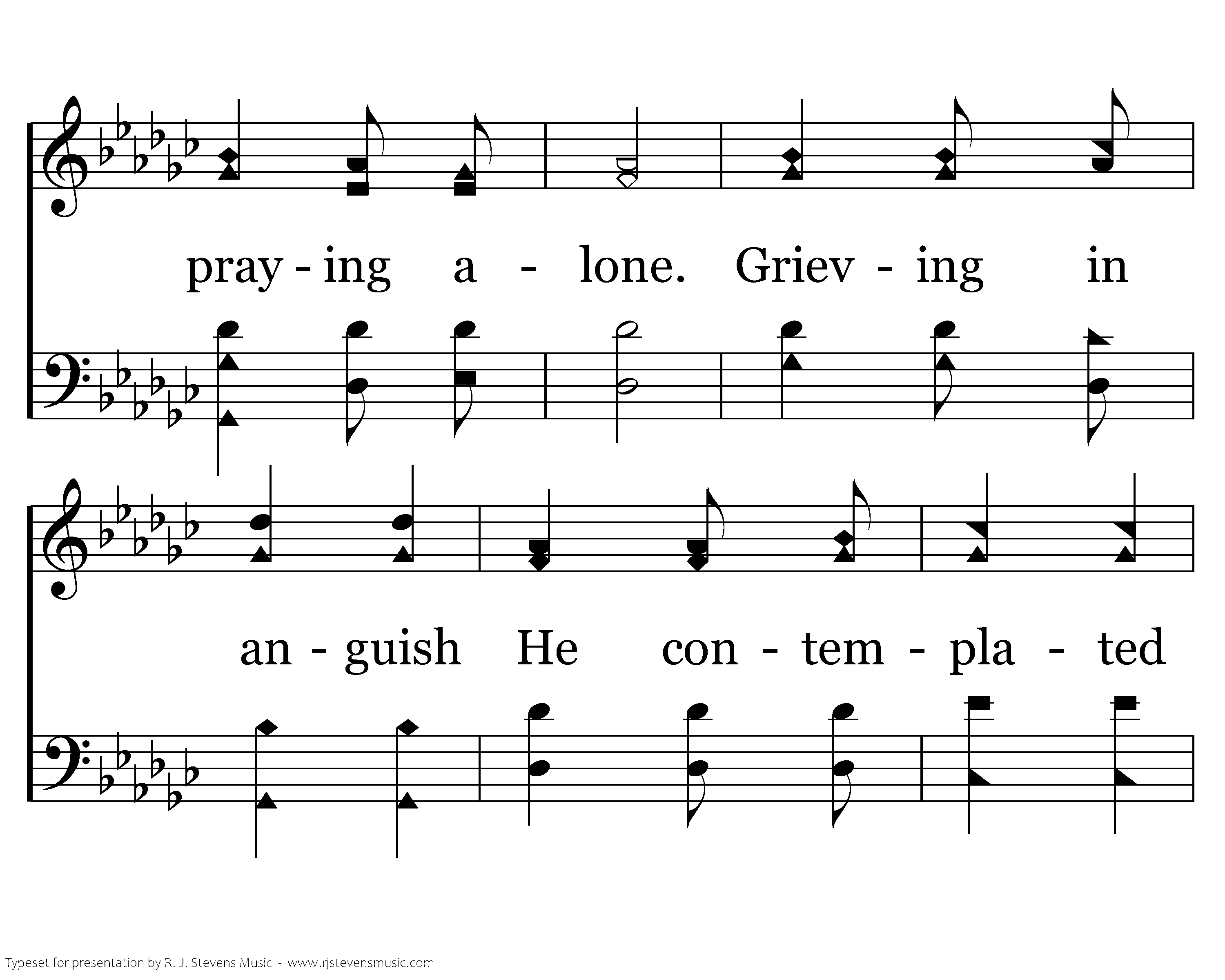 Tear after tear the Lord wept in sorrow While in the garden praying alone. Grieving in anguish He contemplated Death on the cross, my sin to atone.