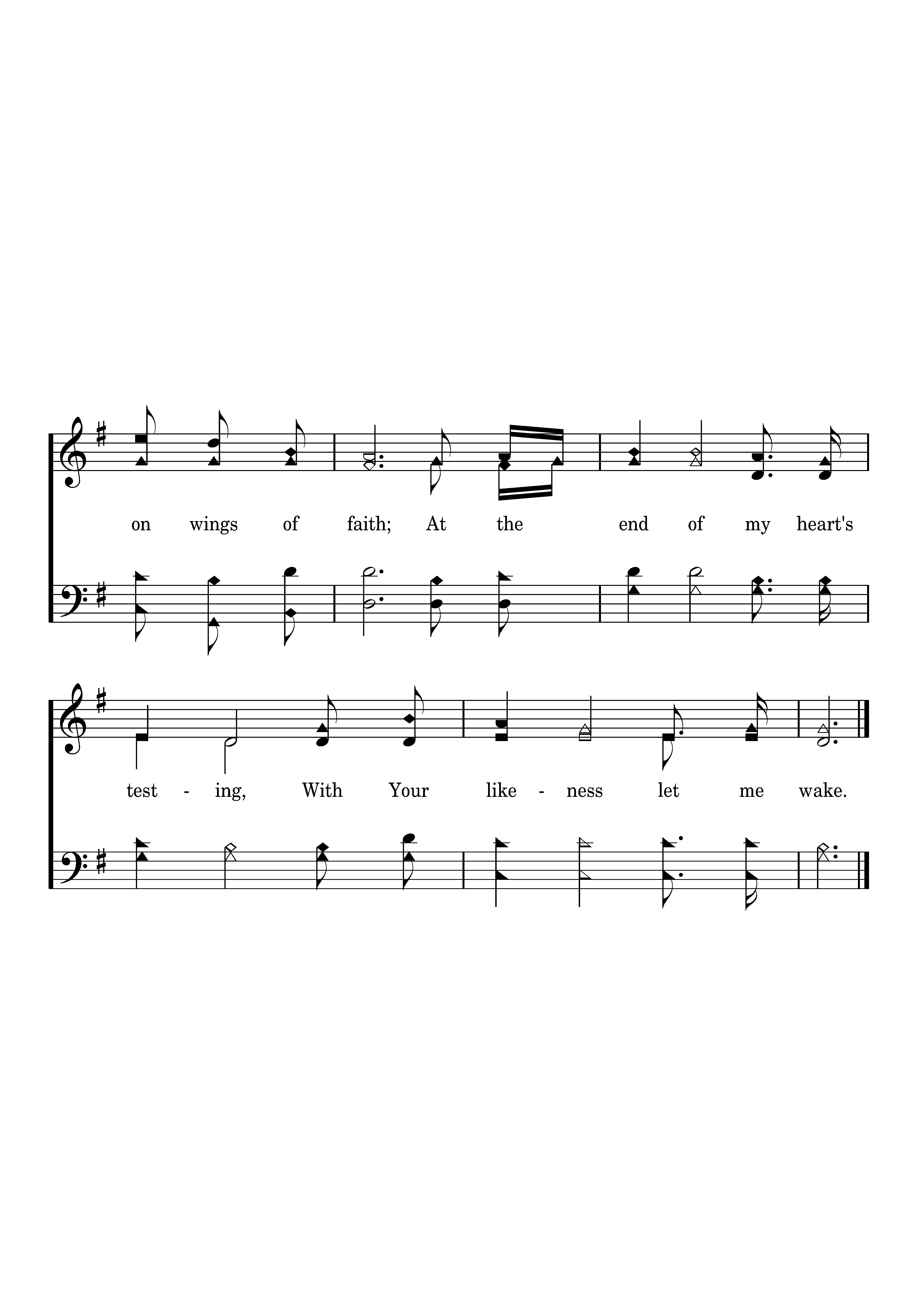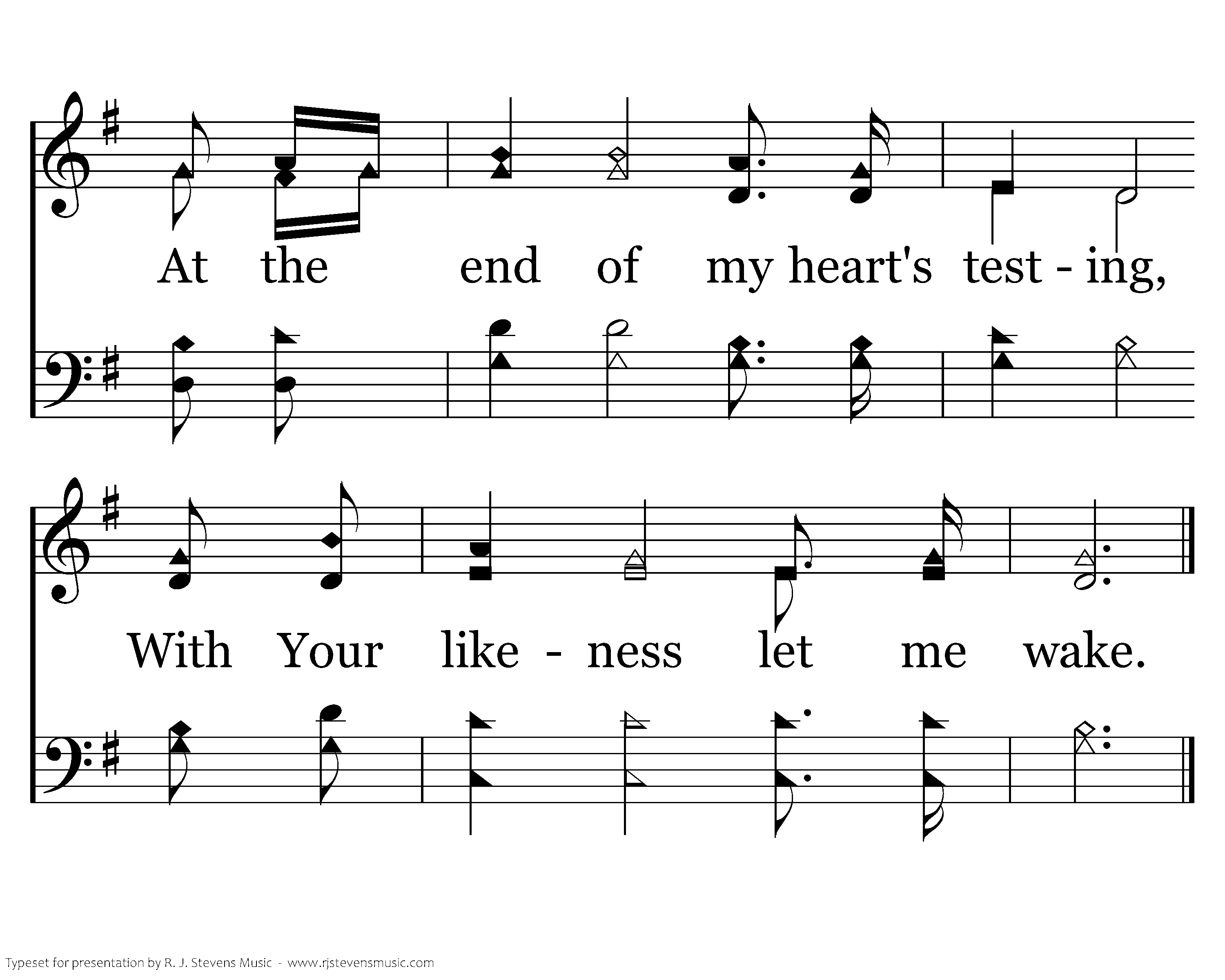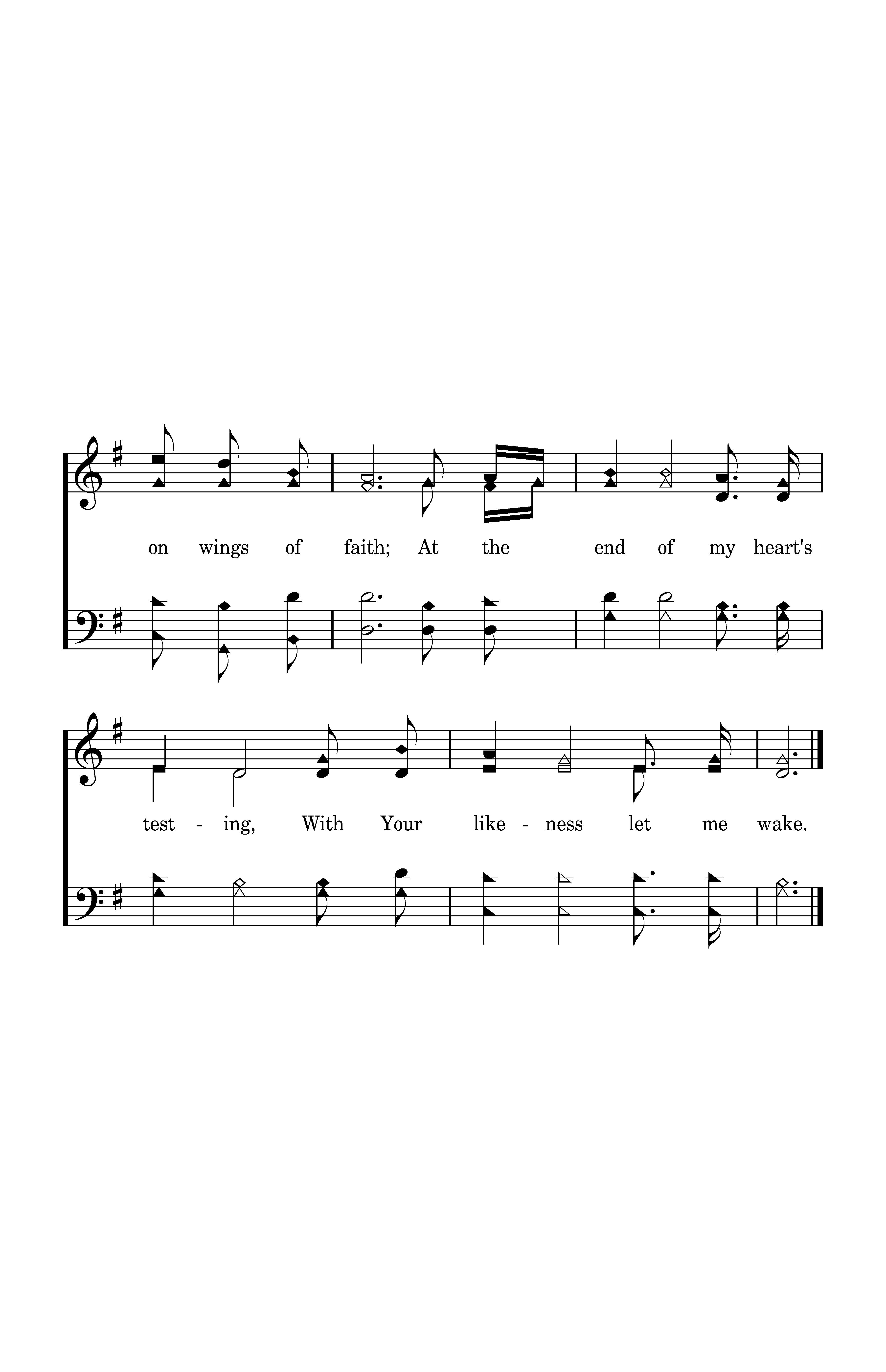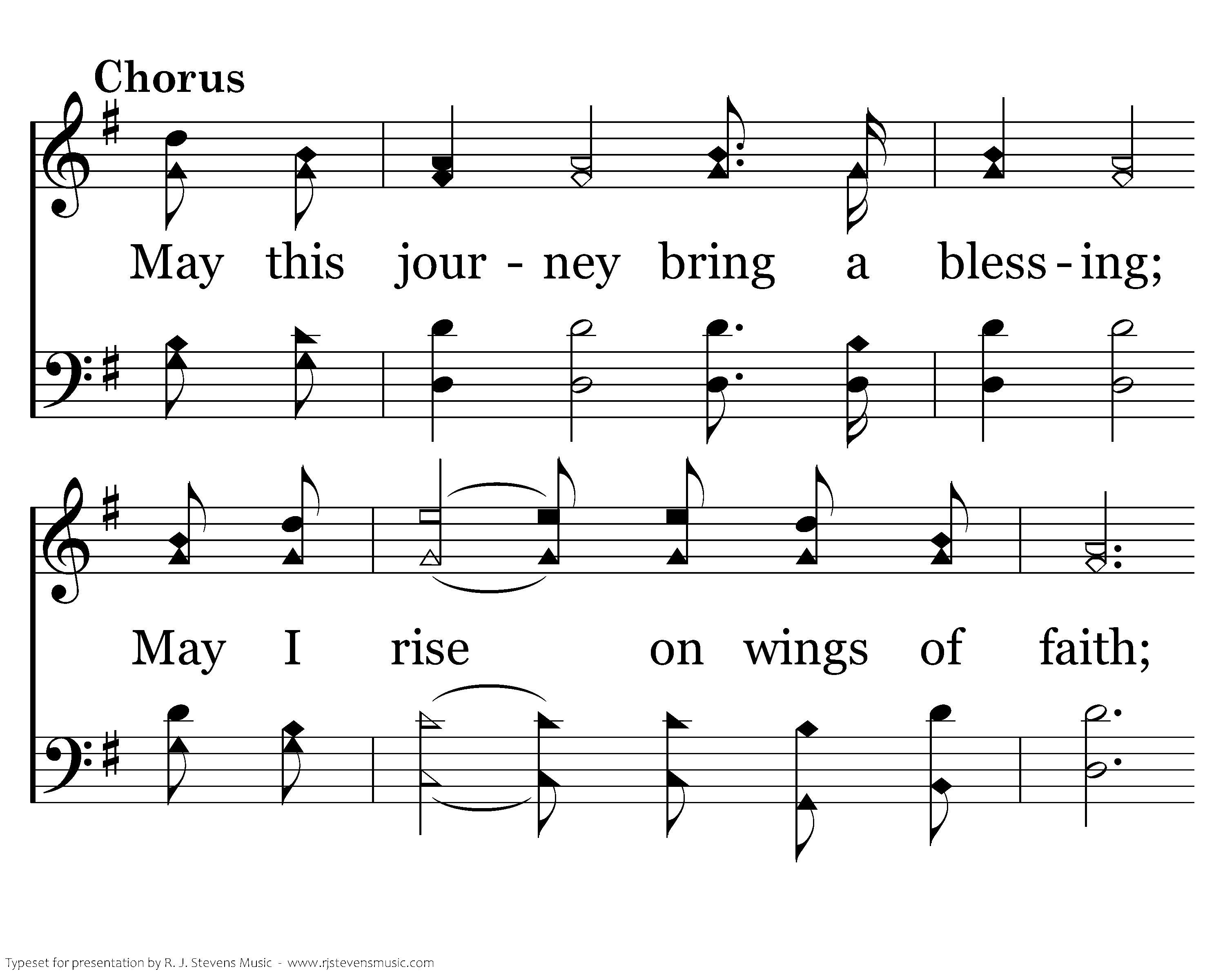 May this journey bring a blessing; May I rise on wings of faith; At the end of my heart's testing, With Your likeness let me wake.