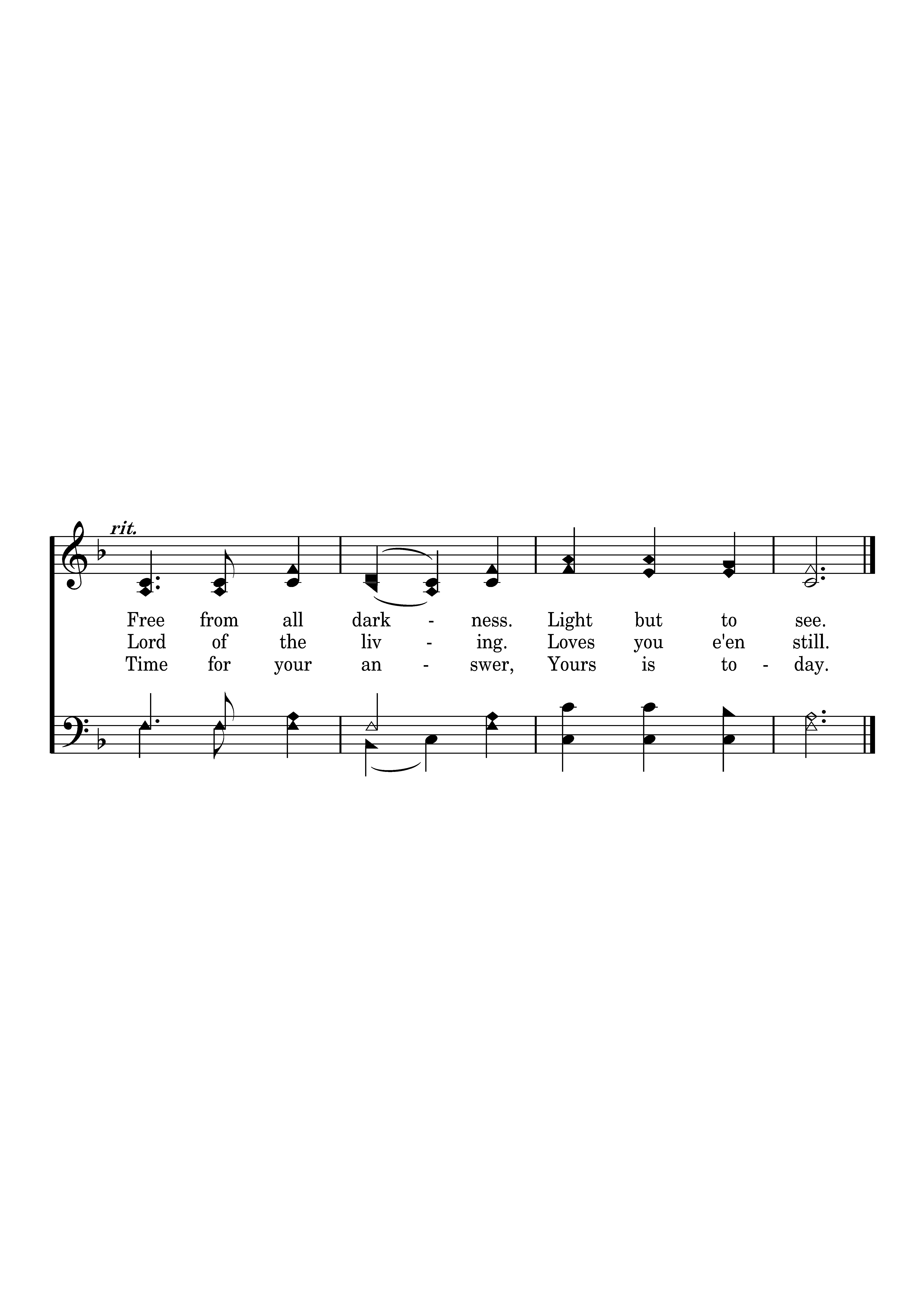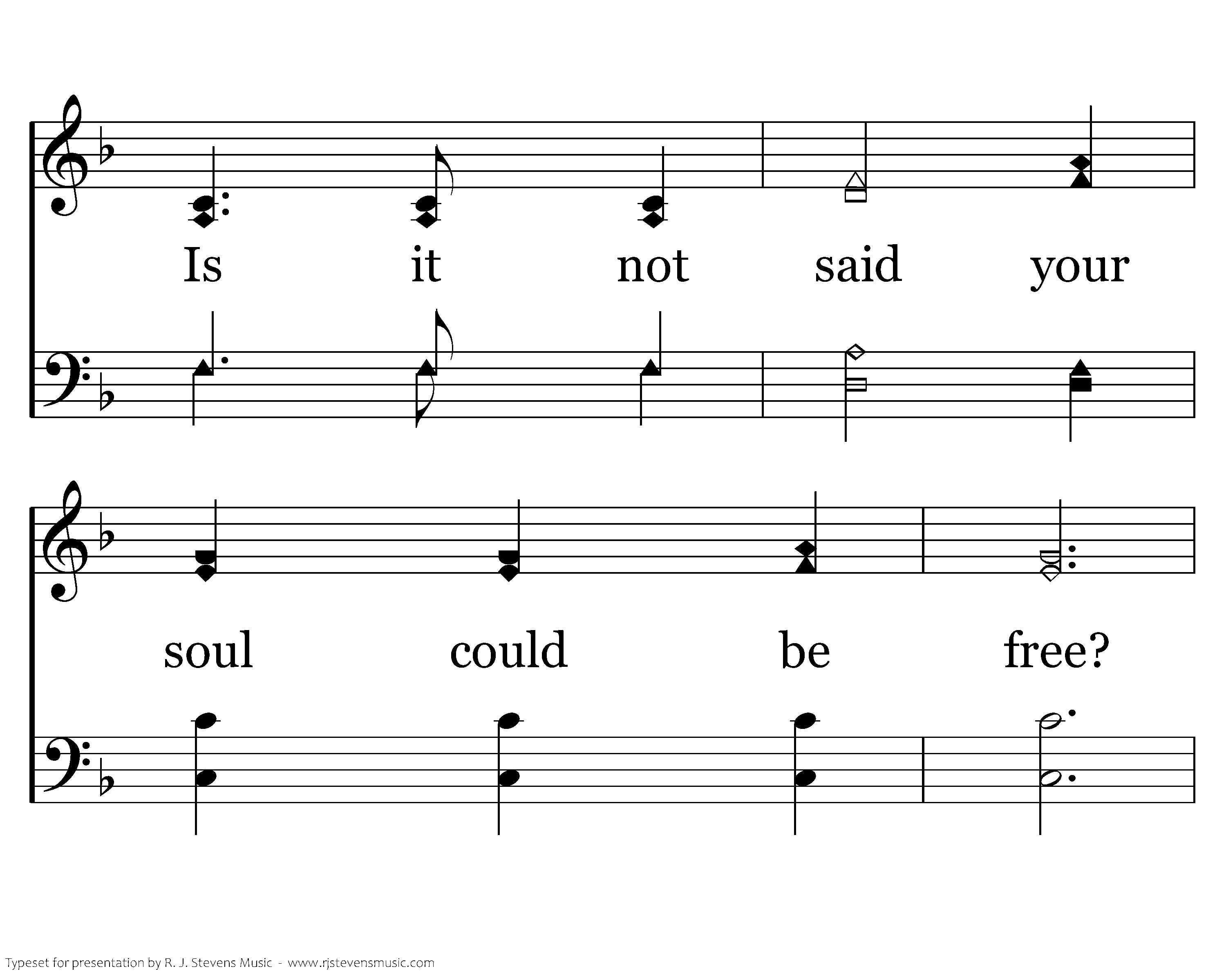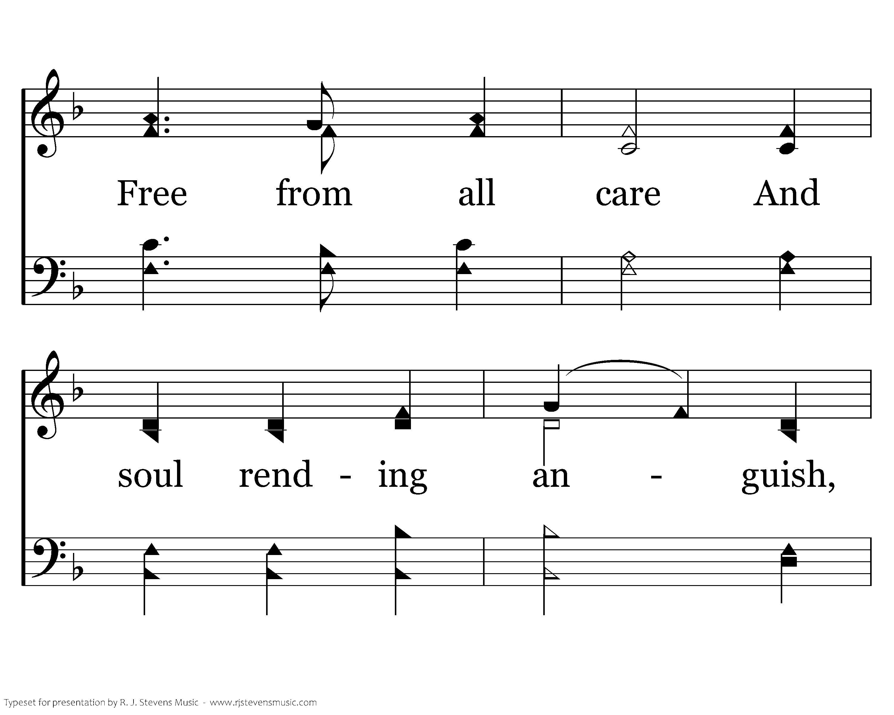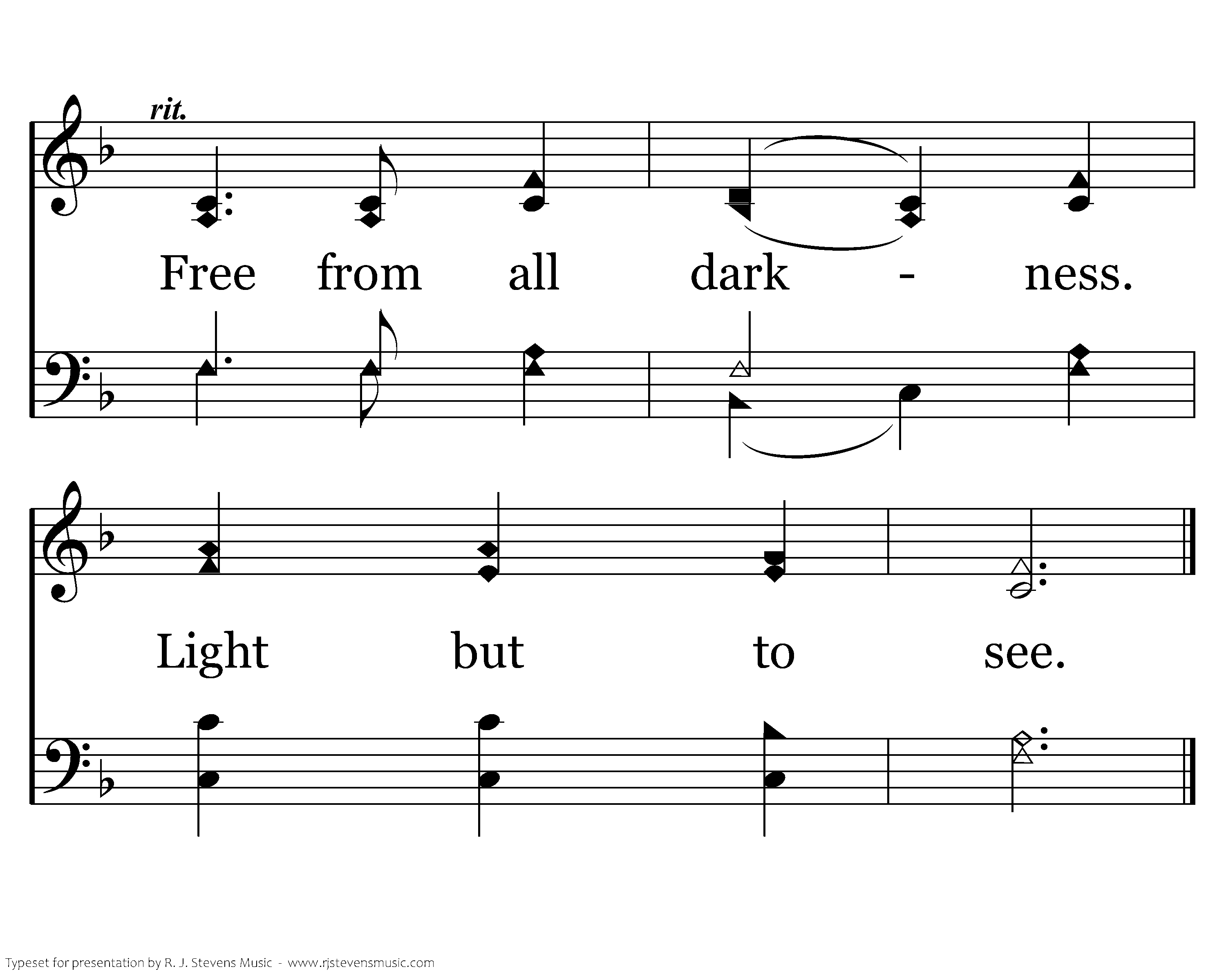 Have you not known of blood for your cleansing? Is it not said your soul oculd be free? Free from all care And soul rending anguish, Free from all darkness, Light but to see. Free from all darkness. Light but to see.