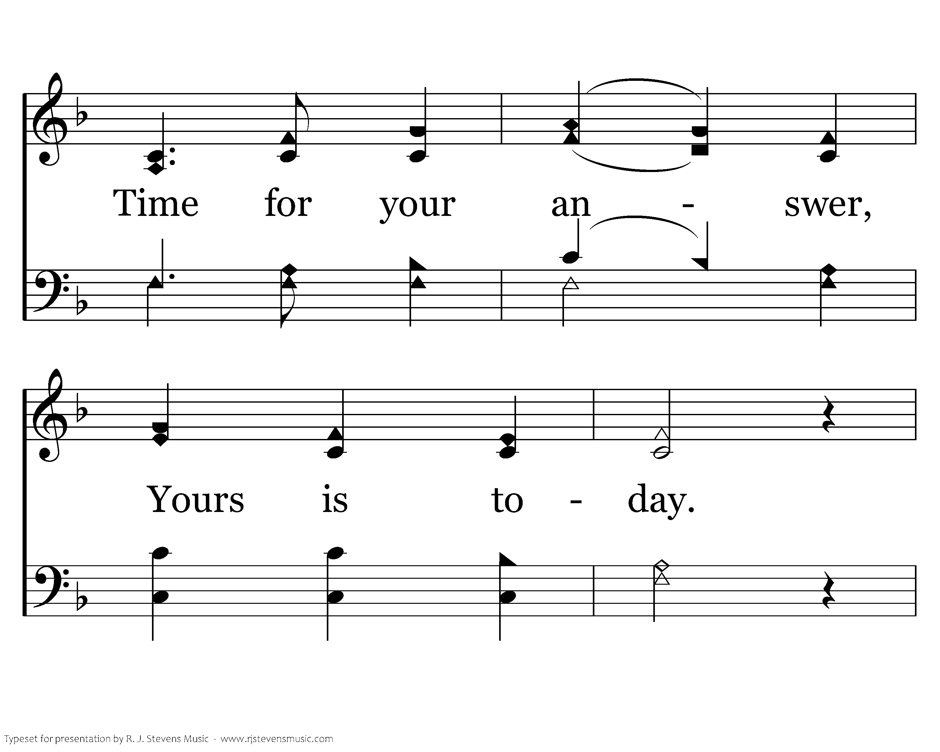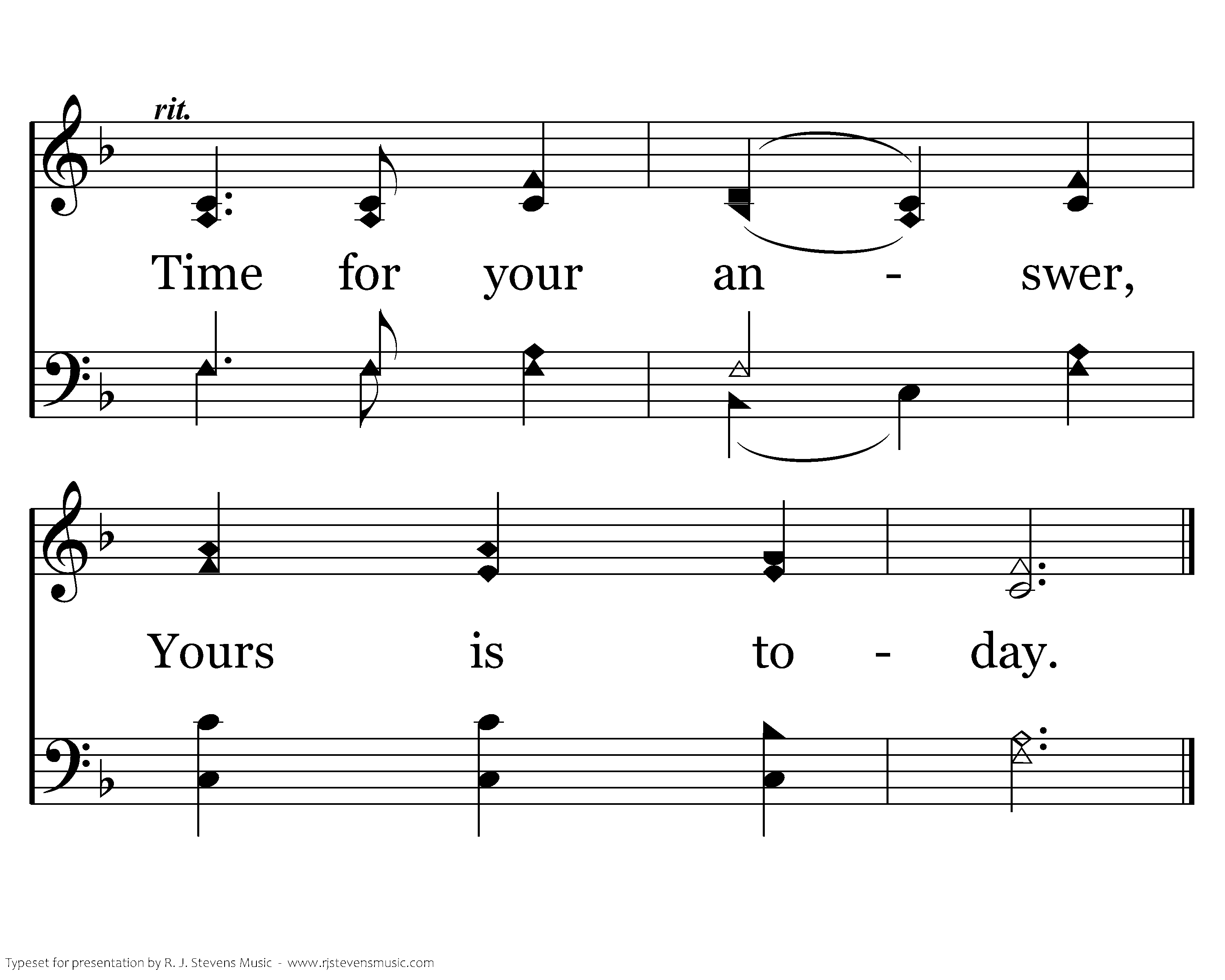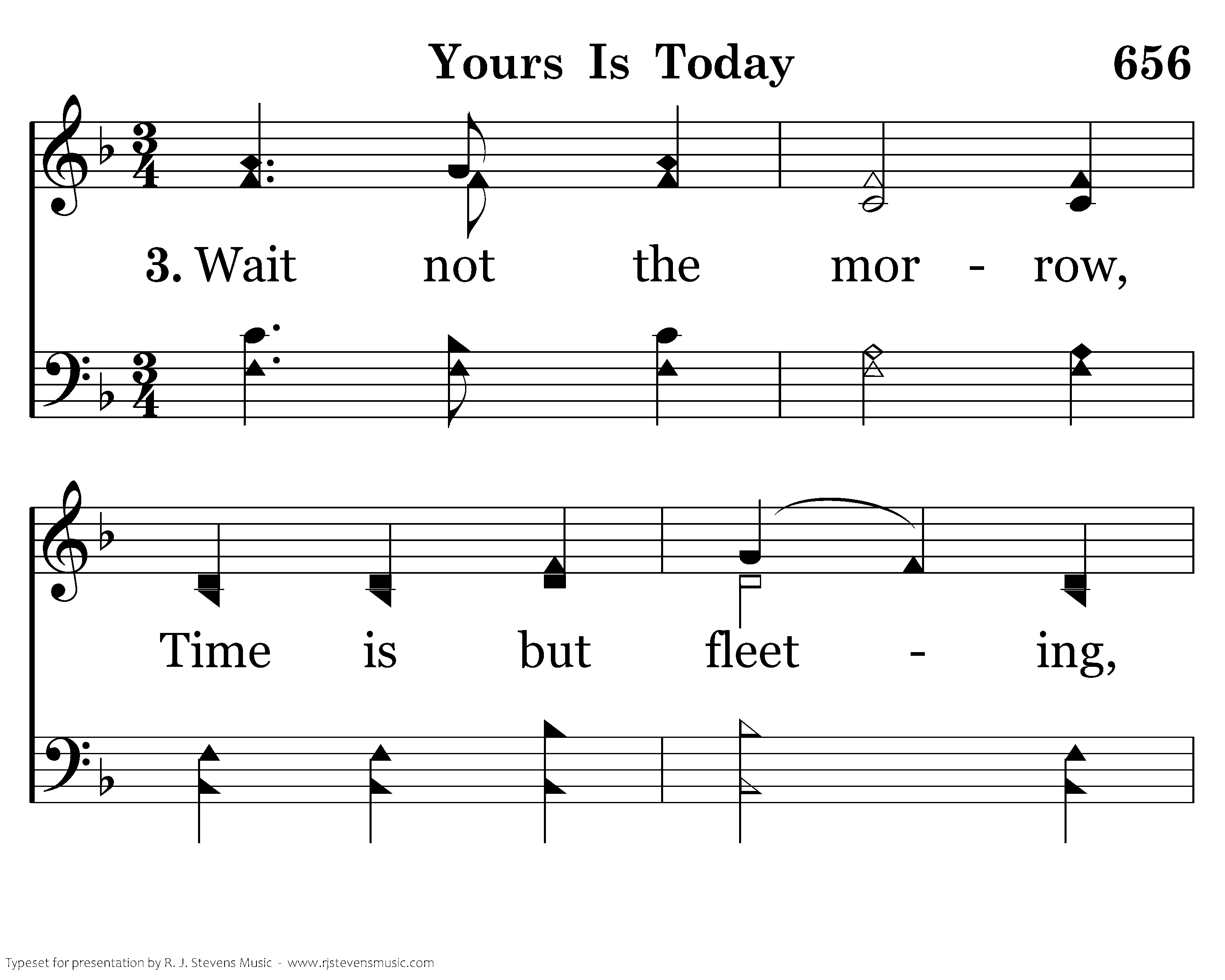 Wait not the morrow, Time is but fleeting, Fleeting as waters, Drifting away. Yours is today assured by the Master, Time for your answer, Yours is today. Time for your answer, Yours is today.