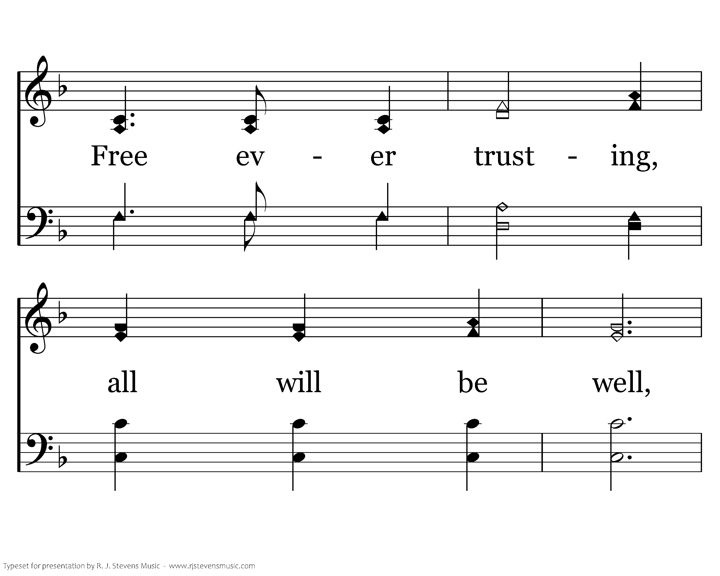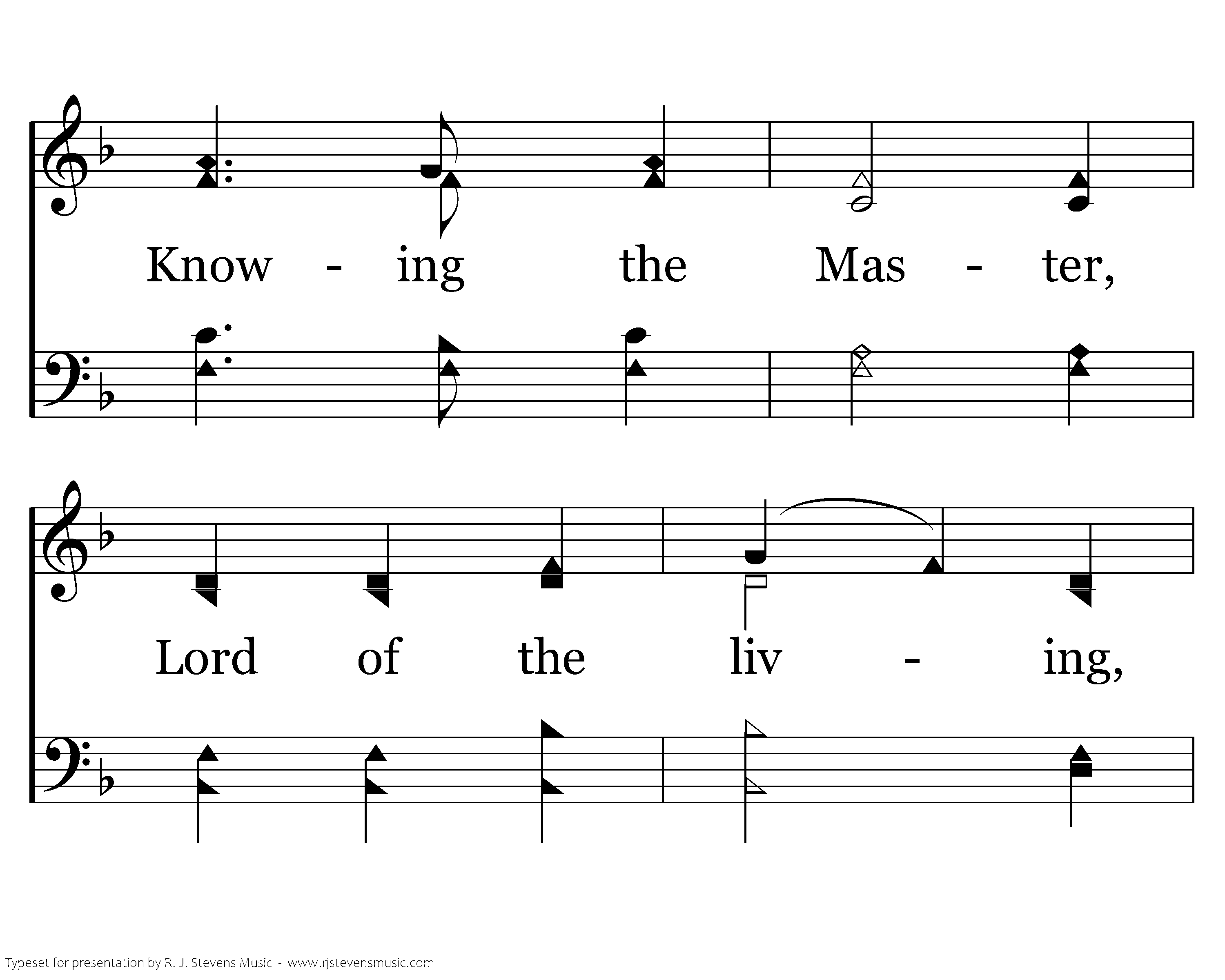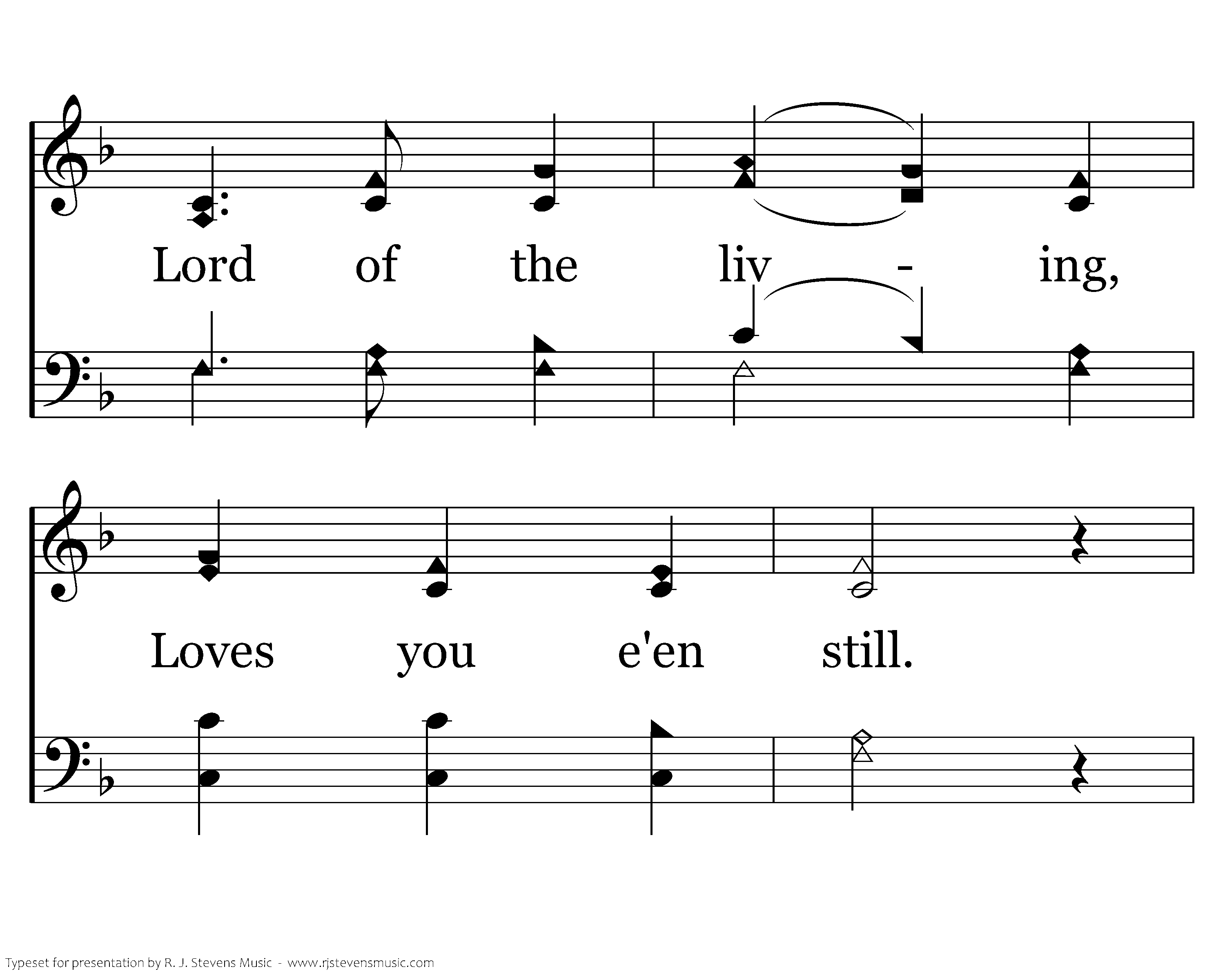 Free as a dove, In flight o'er the mountains, Free ever trusting, all will be well, Knowing the Master, Lord of the living, Lord of the living, Loves you e'en still. Lord of the living. Loves you e'en still.