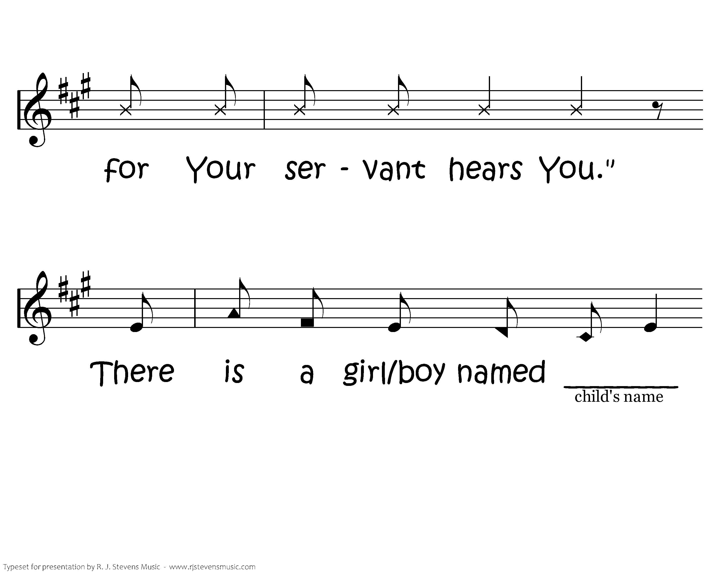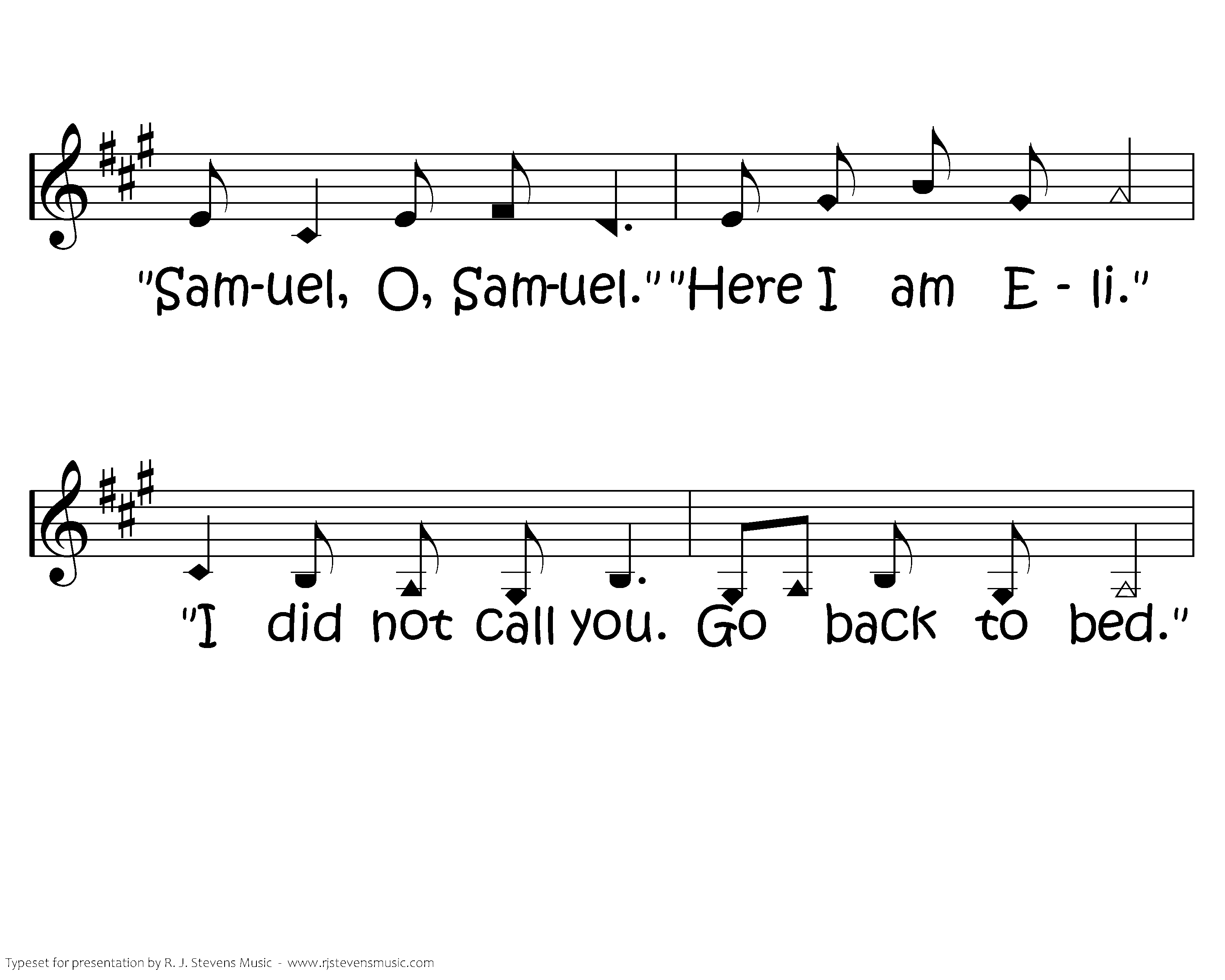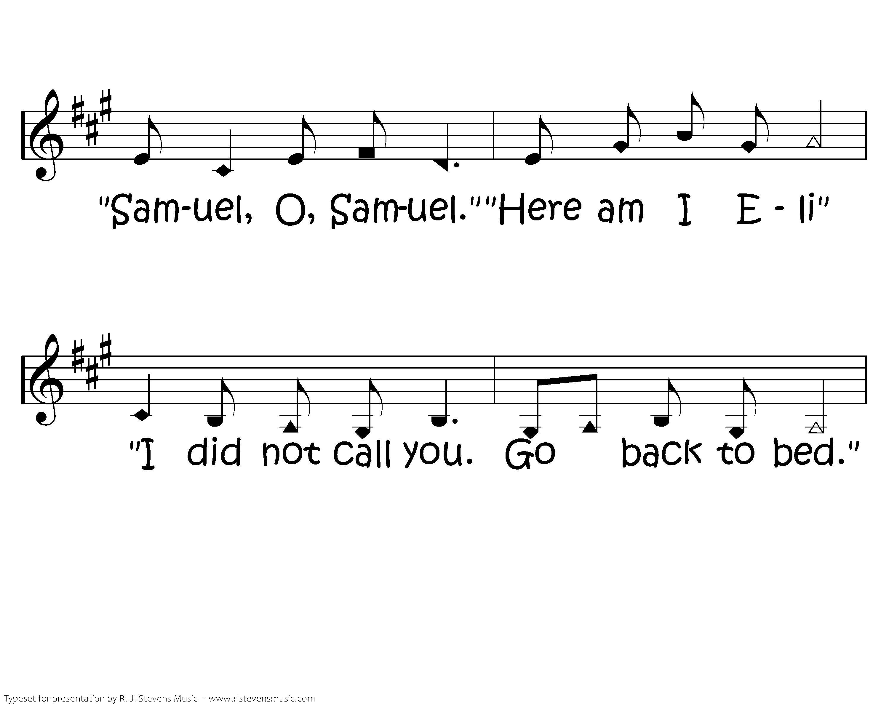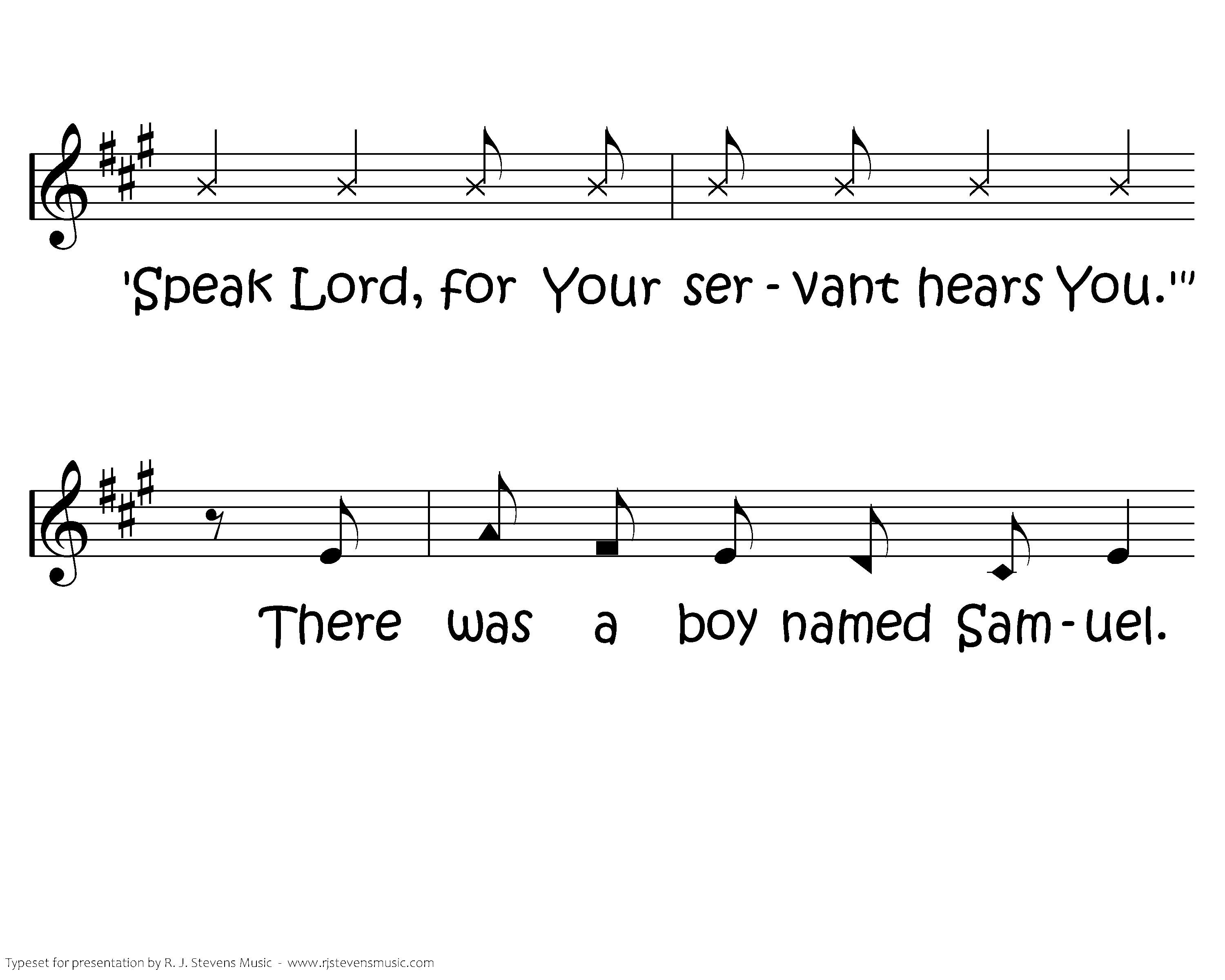 There was a boy named Samuel. He was asleep in bed. There was a boy named Samuel. He did what Eli said. "Samuel, O, Samuel." "here I am Eli." "I did not call you. Go back to bed." "It must be the Lord. If it happens once again, here's what you must say, 'Speak Lord, for Your servant hears You." There was a girl/boy _______. She/He listens to God's Word. For in the Holy Bible Is where God's voice is heard. "______, O, ______ Speak, Lord, for Your servant hears You."