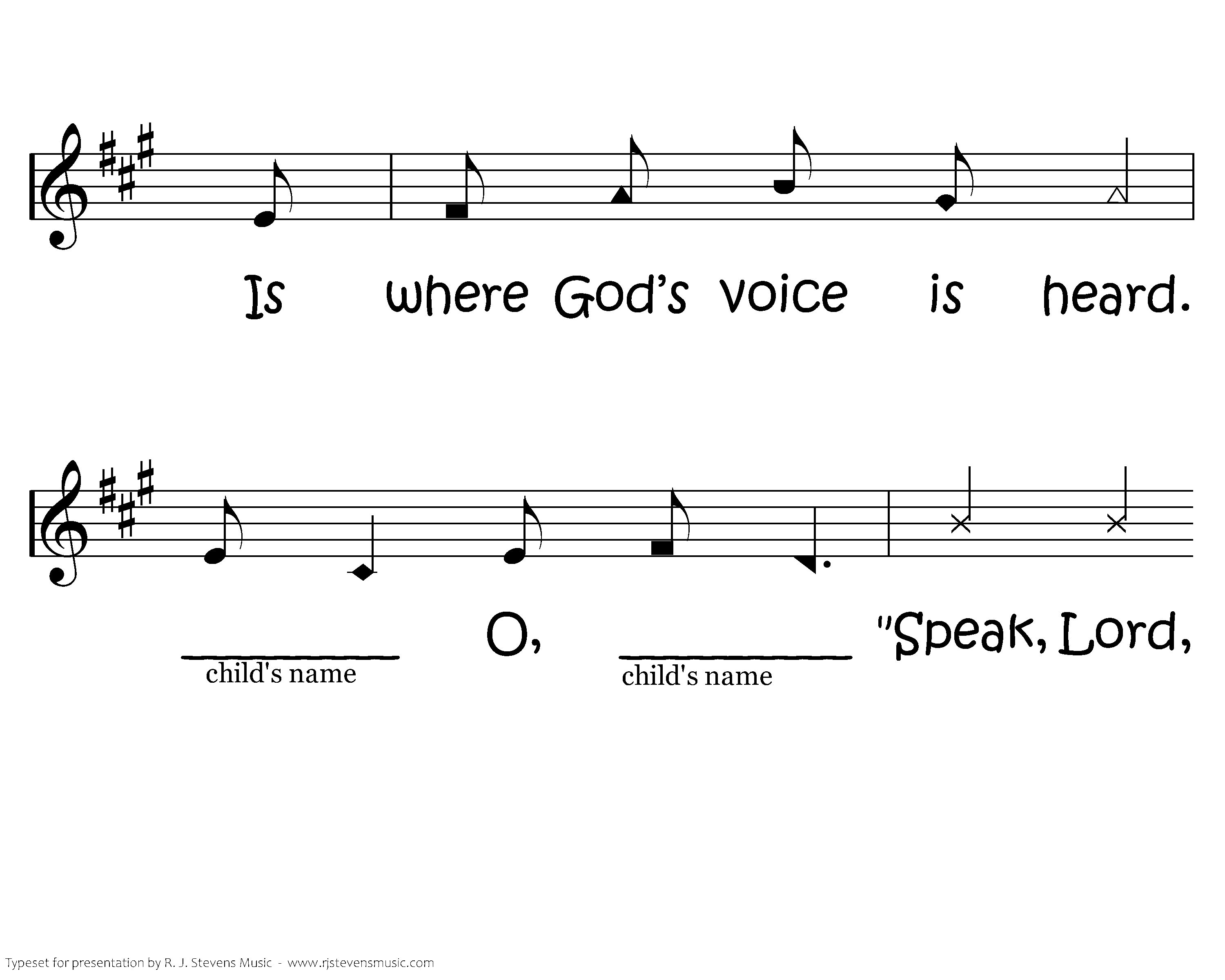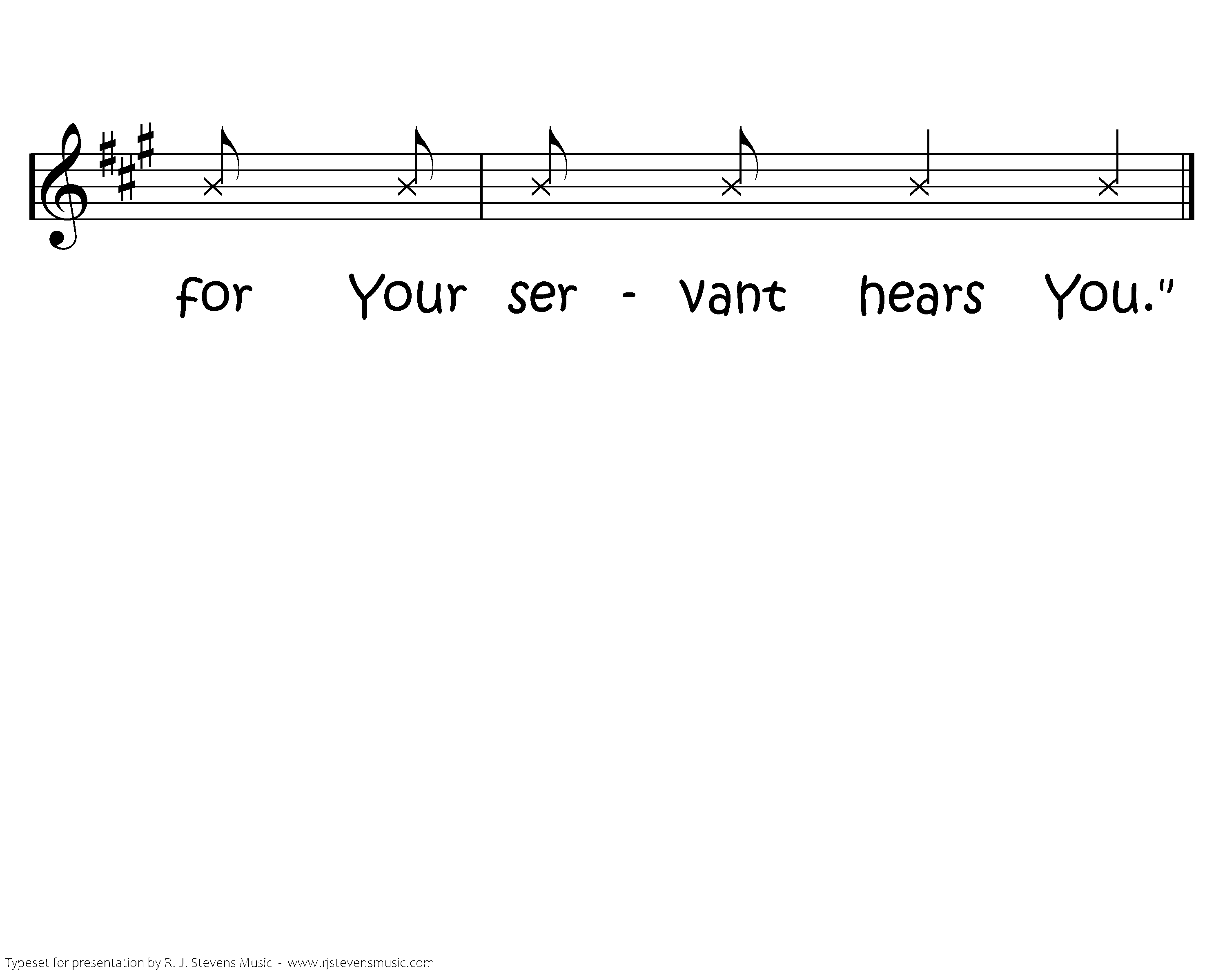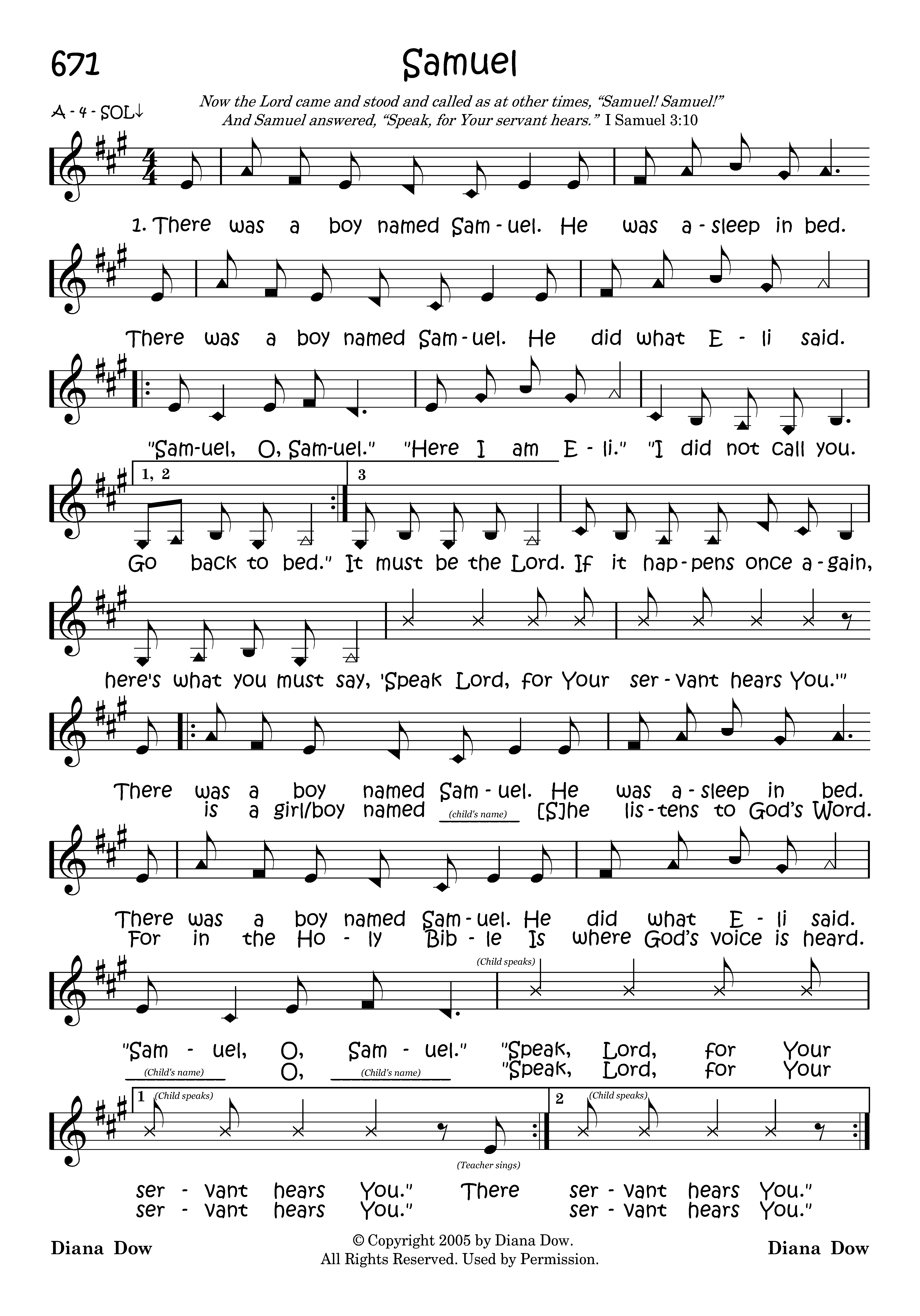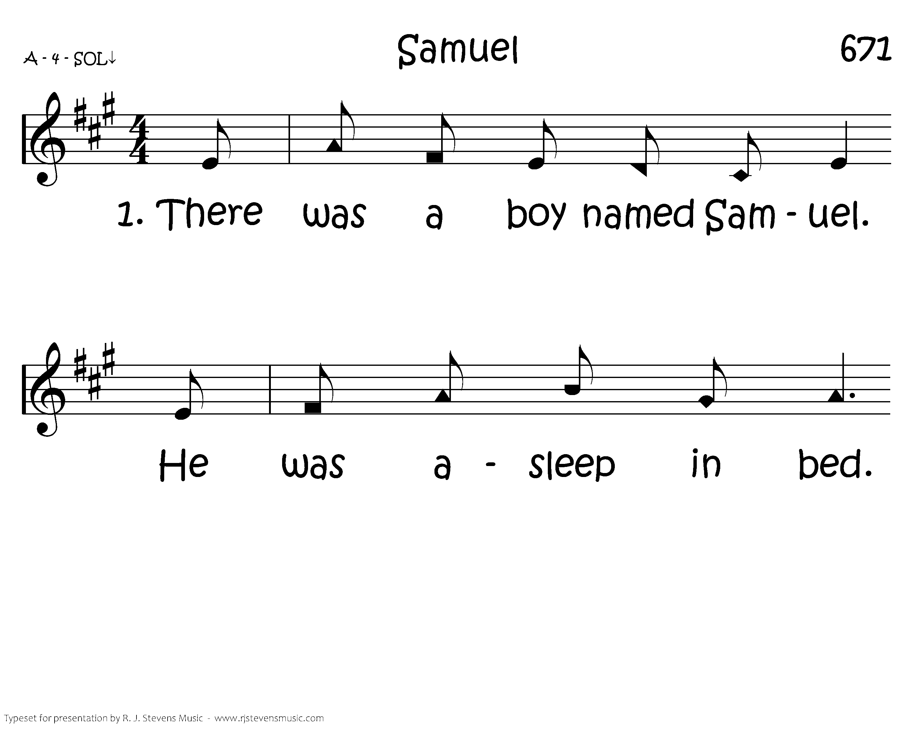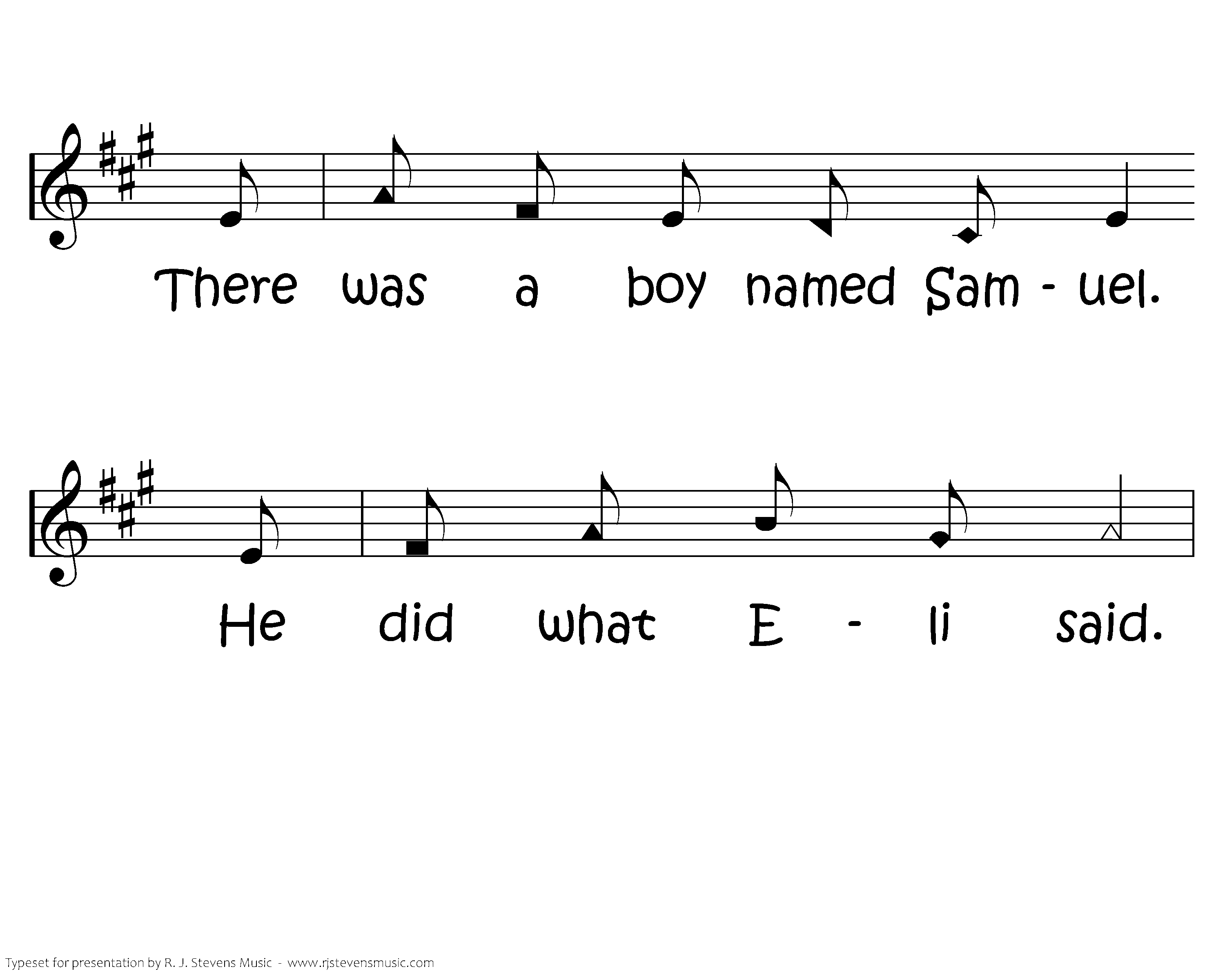 There was a boy named Samuel. He was asleep in bed. There was a boy named Samuel. He did what Eli said. "Samuel, O, Samuel." "here I am Eli." "I did not call you. Go back to bed." "It must be the Lord. If it happens once again, here's what you must say, 'Speak Lord, for Your servant hears You." There was a girl/boy _______. She/He listens to God's Word. For in the Holy Bible Is where God's voice is heard. "______, O, ______ Speak, Lord, for Your servant hears You."
