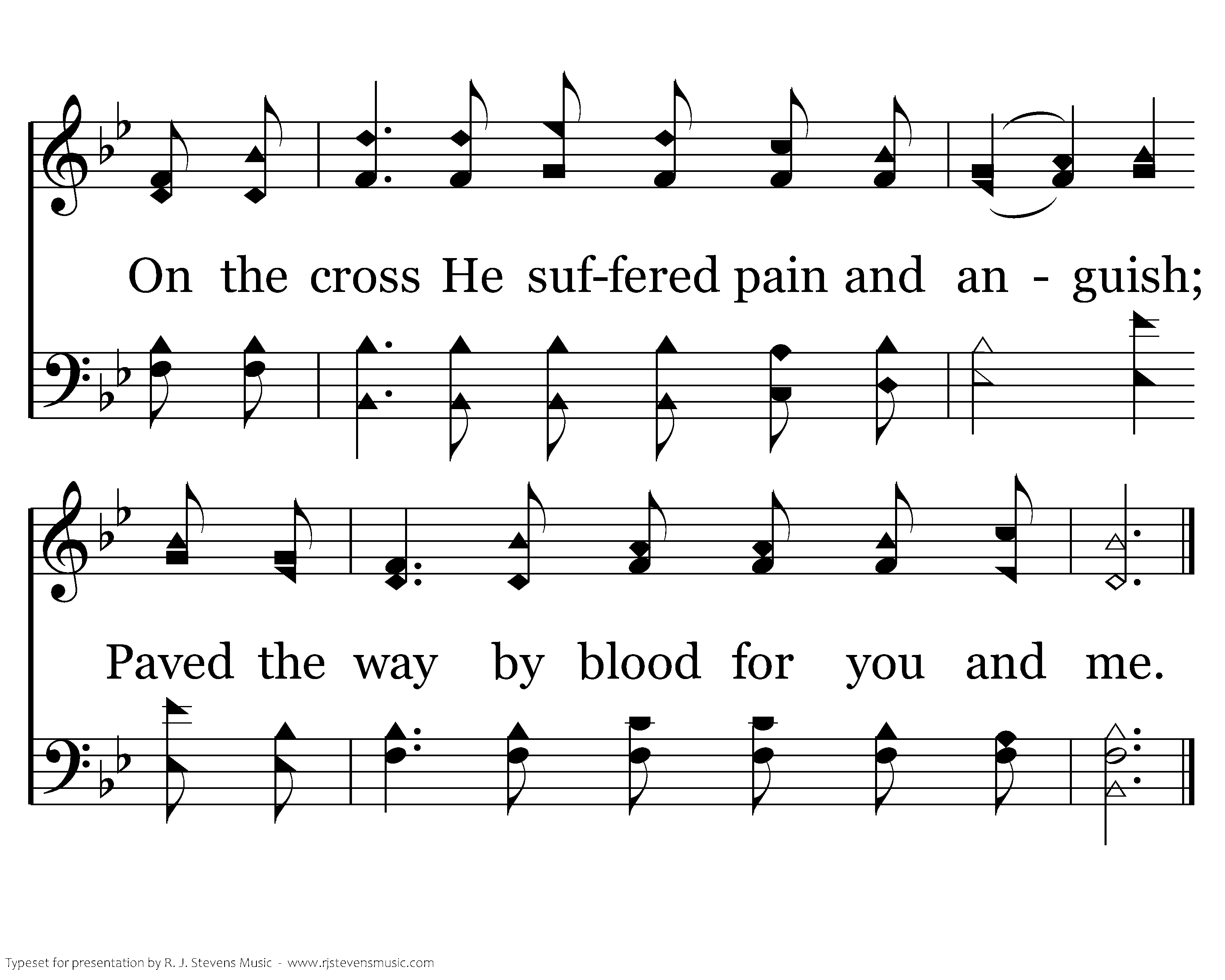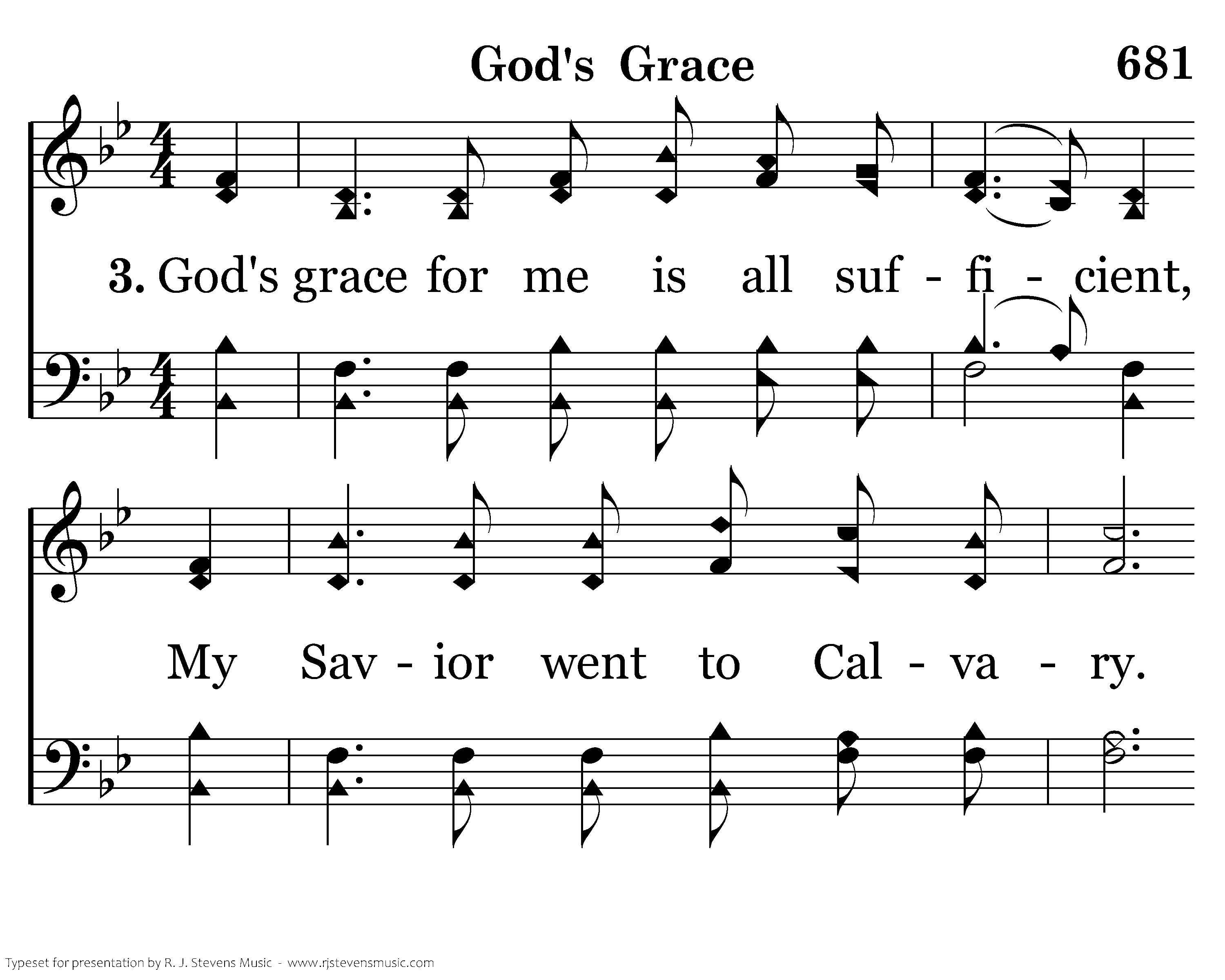 God's grace for me is all sufficient, My Savior went to Calvary. On the cross He suffered pain and anguish; Paved the way by blood for you and me.