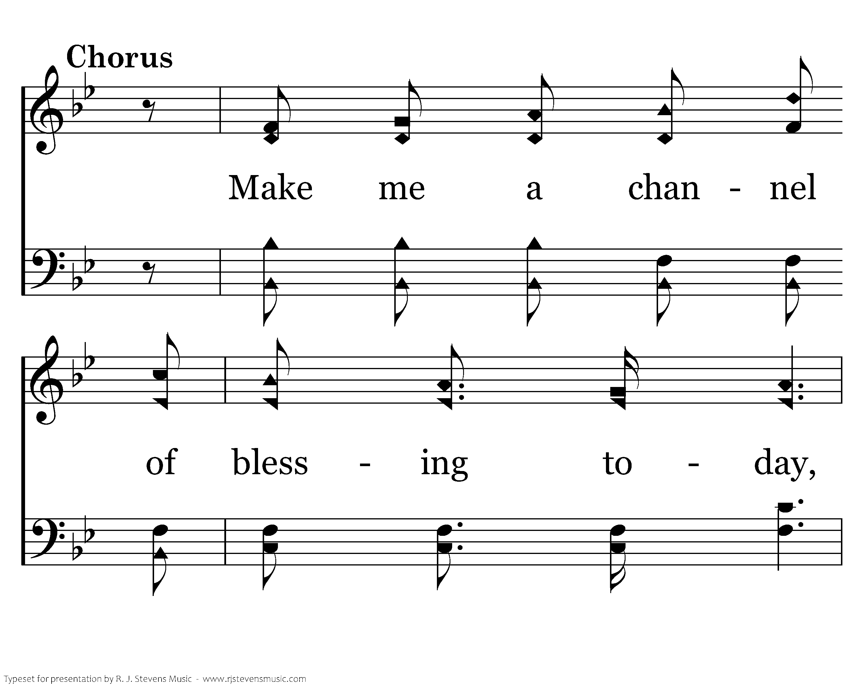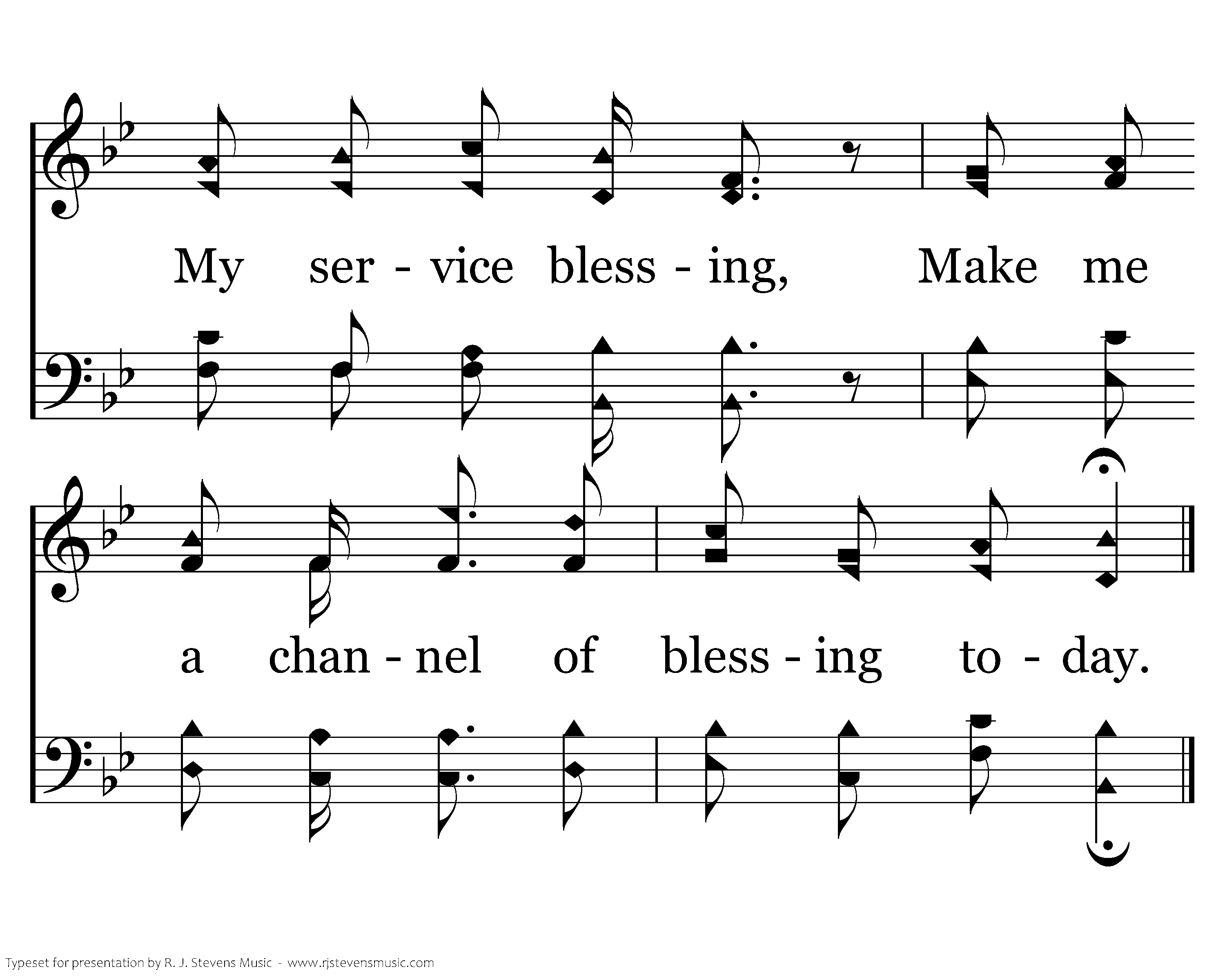 Make me a channel of blessing today, Make me a channel of blessing, I pray; My life possessing, my service blessing, Make me a channel of blessing today.