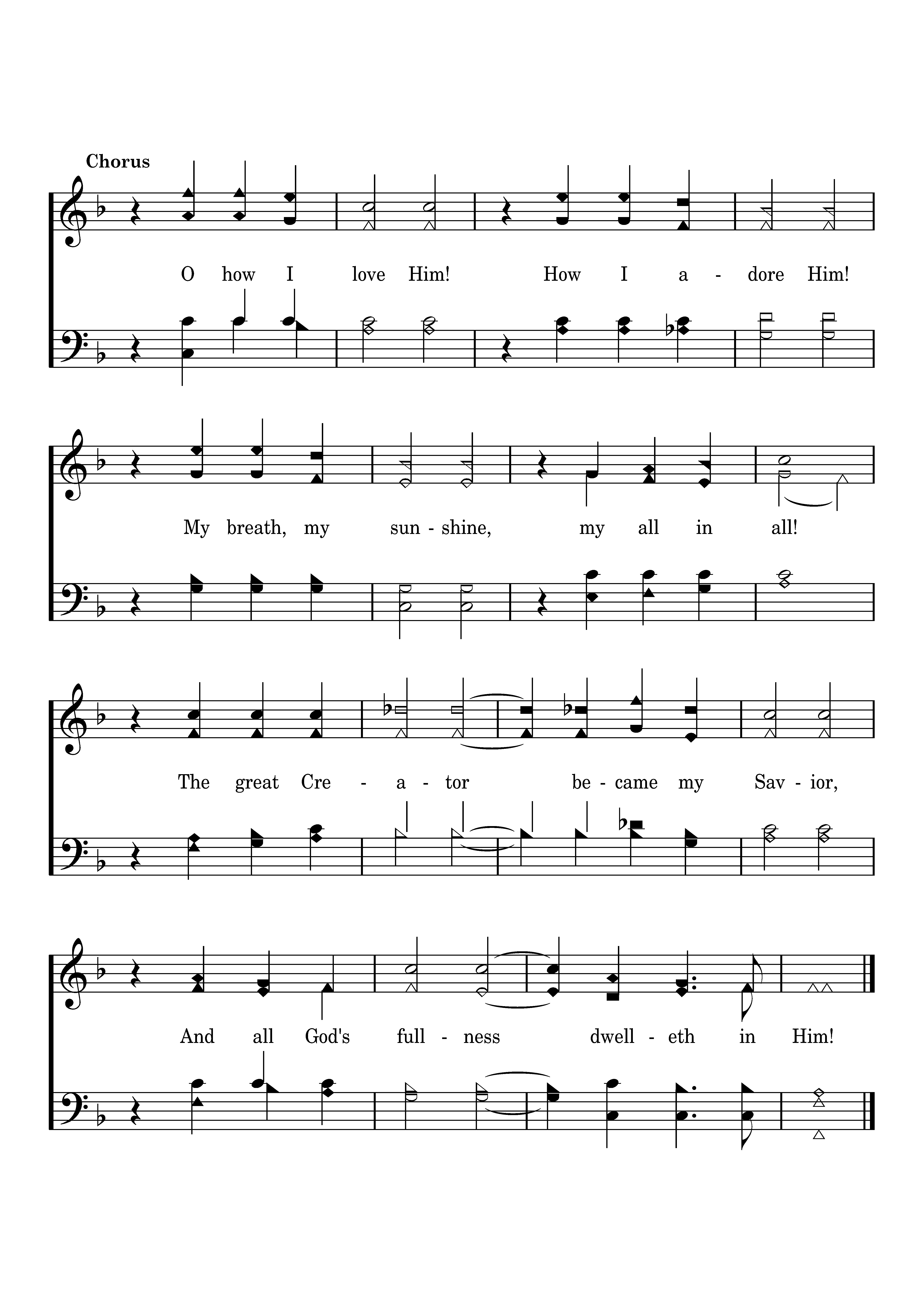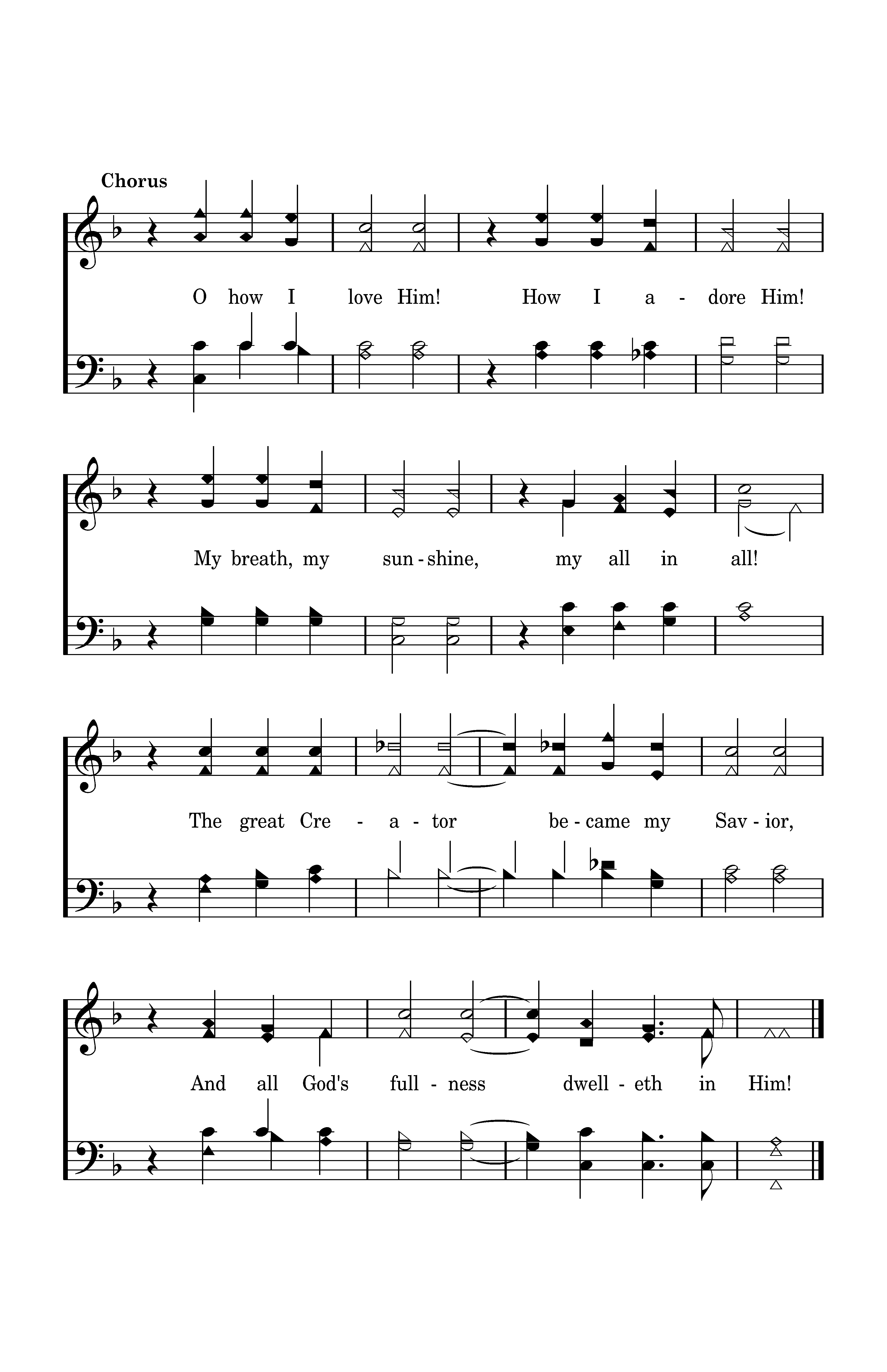 O how I love Him! How I adore Him! My breath, my sunshine, my all in all! The great Creator became my Savior, And all God's fullness dwelleth in Him!