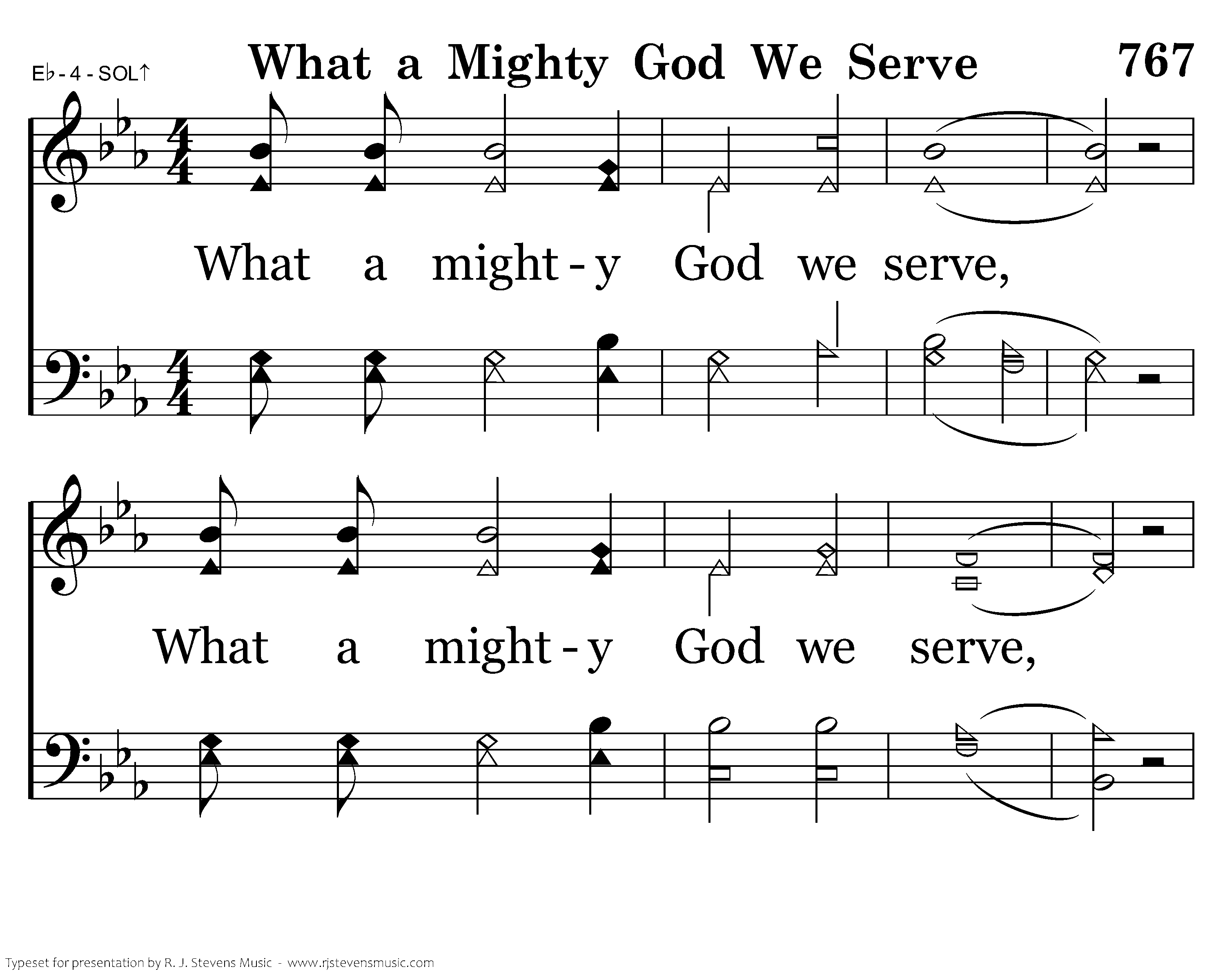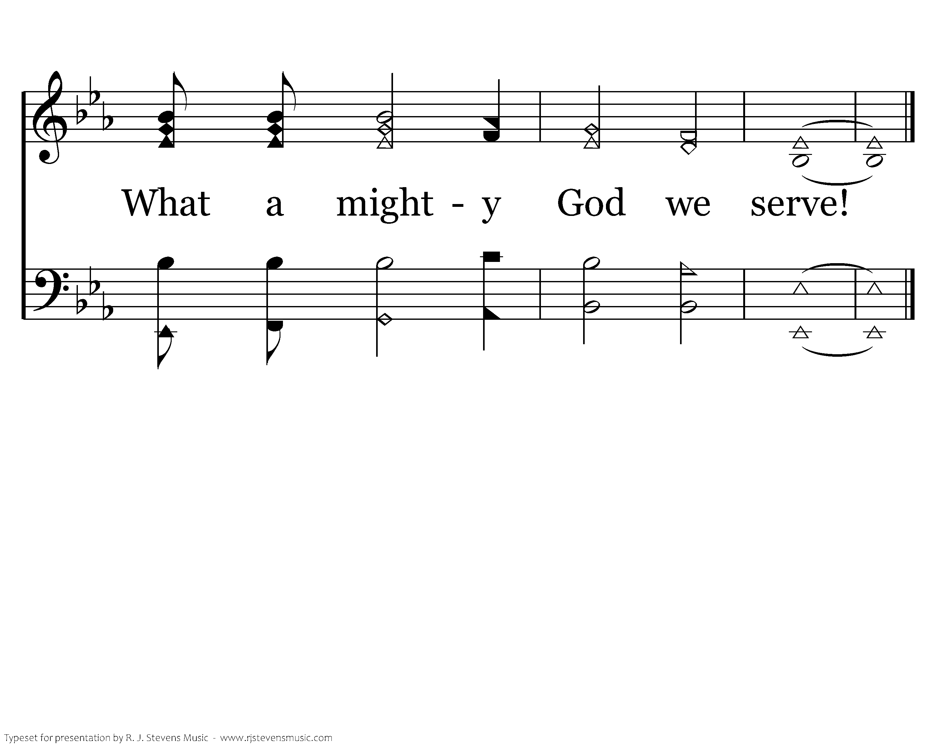 What a mighty God we serve, What a mighty God we serve, Angels bow before Him, Heaven and earth adore Him; What a mighty God we serve!