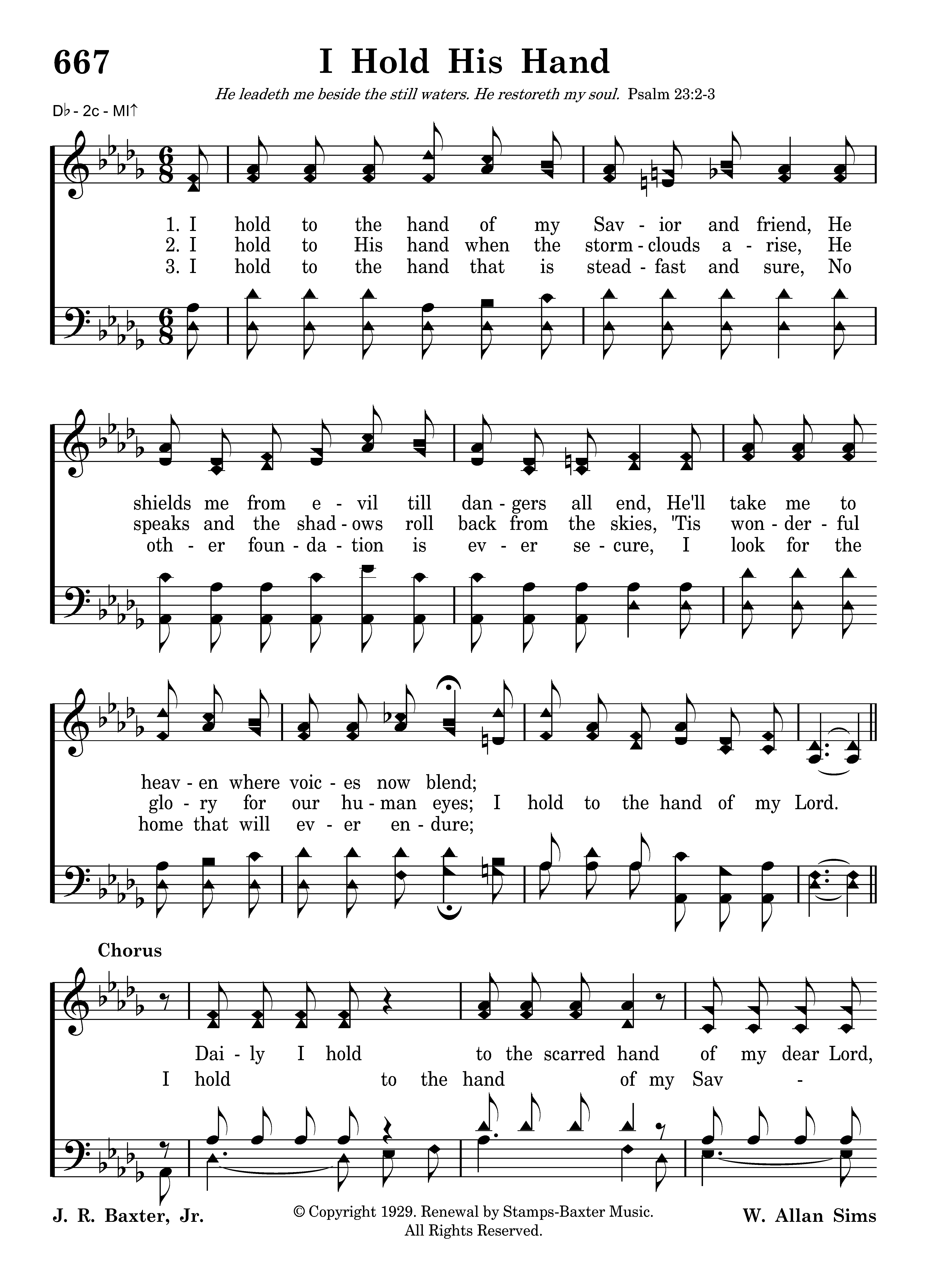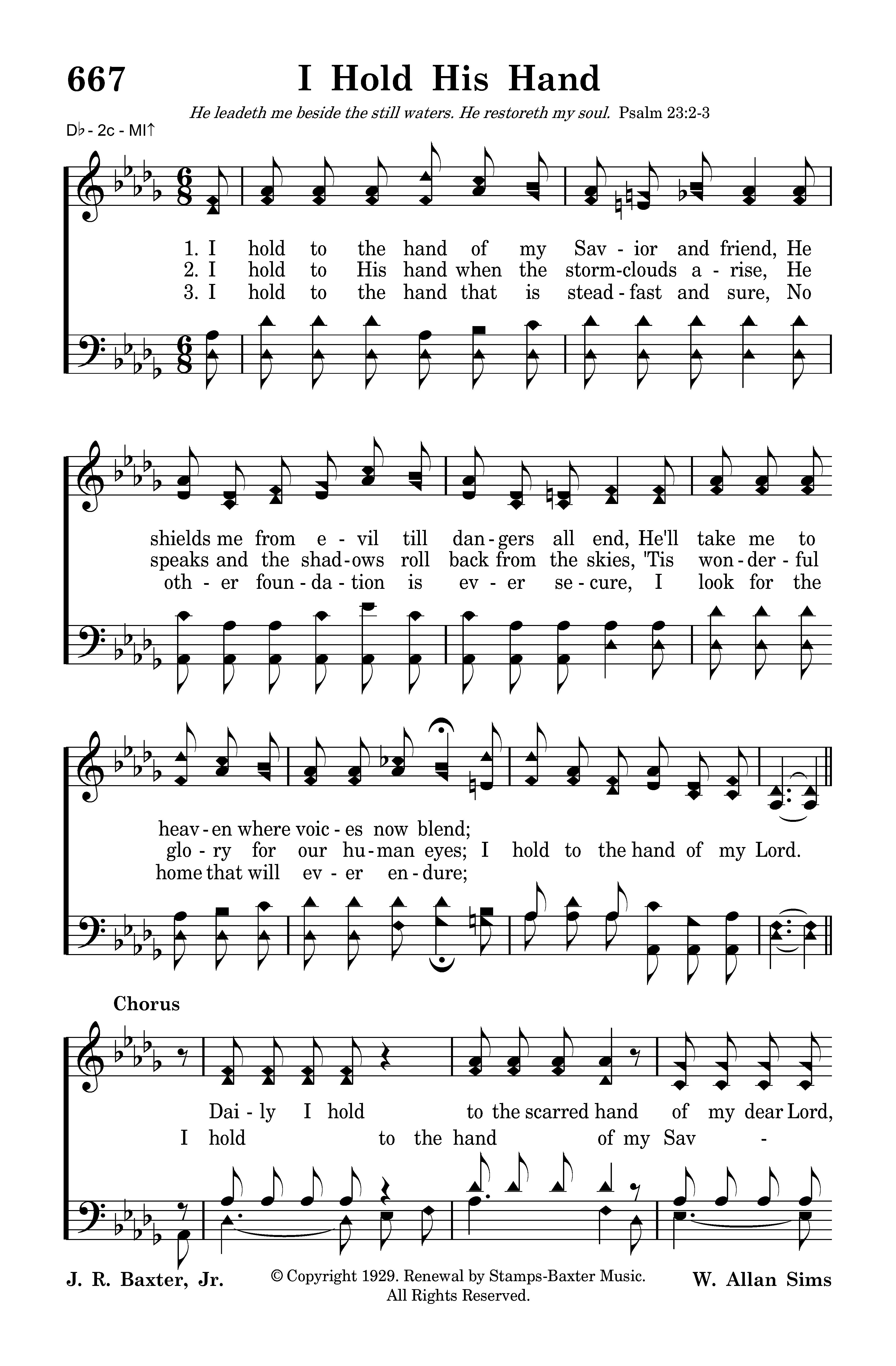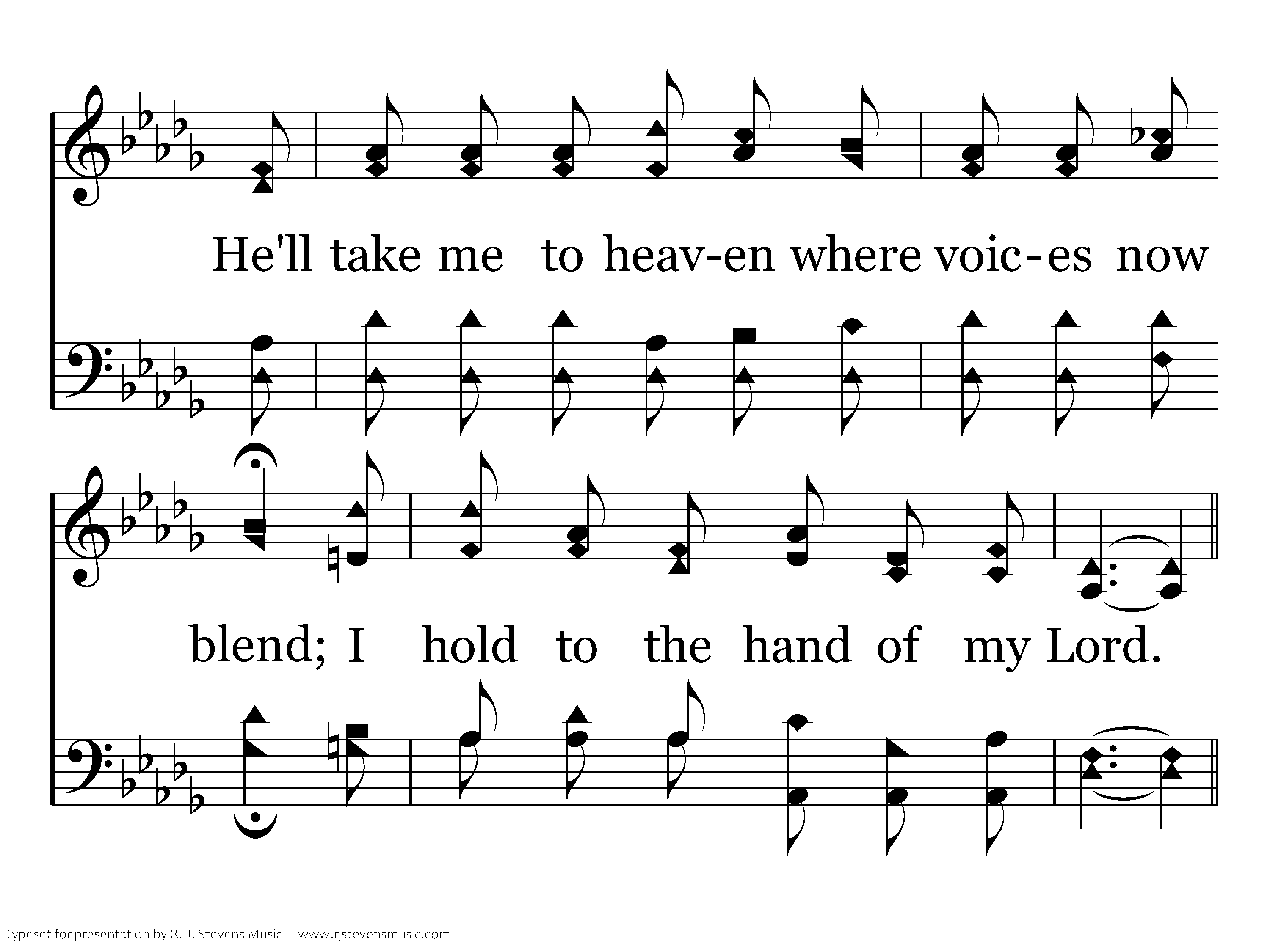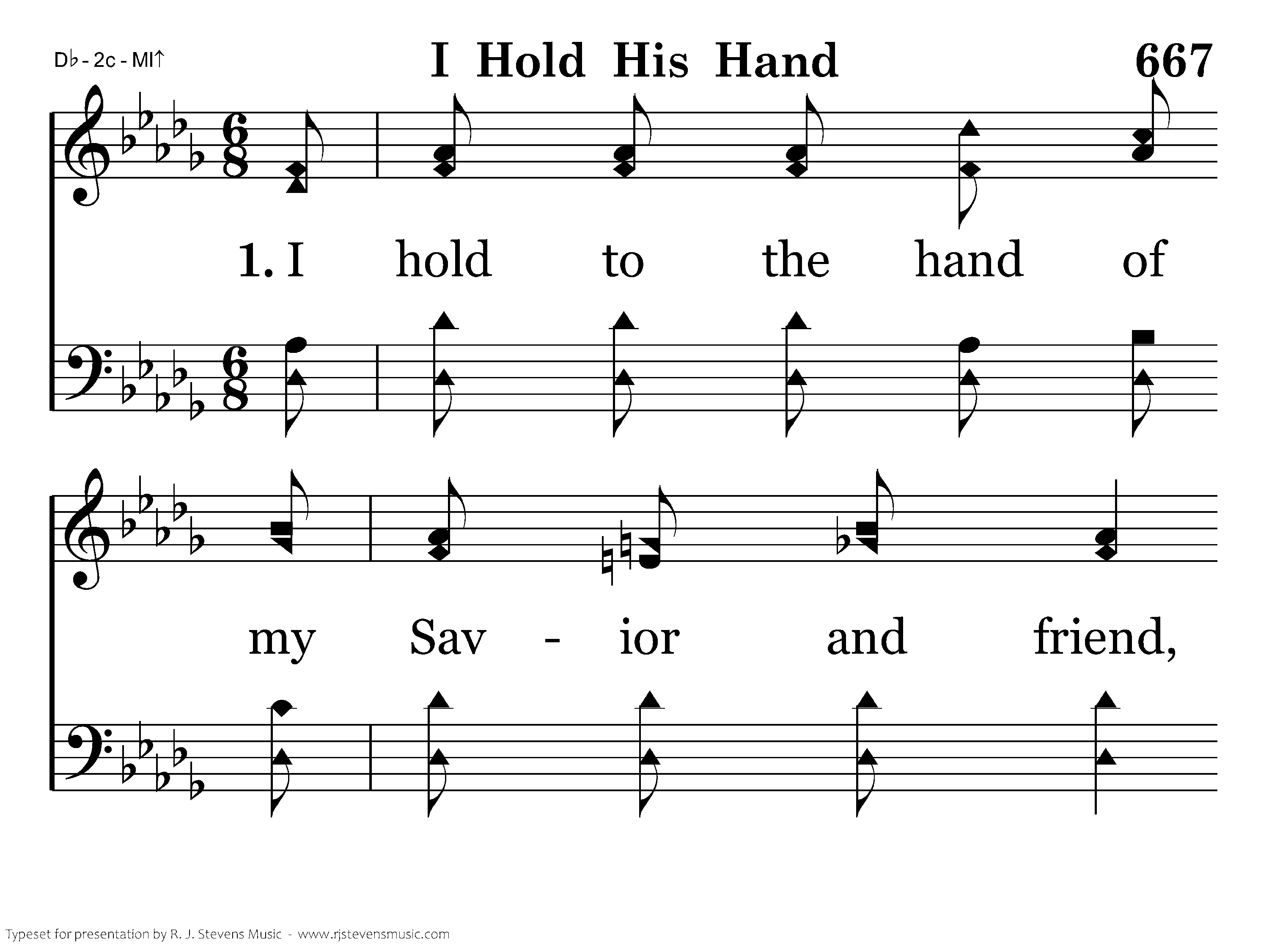 I hold to the hand of my Savior and friend, He shields me from evil till dangers all end, He'll take me to heaven where voices now blend; I hold to the hand of my Lord.